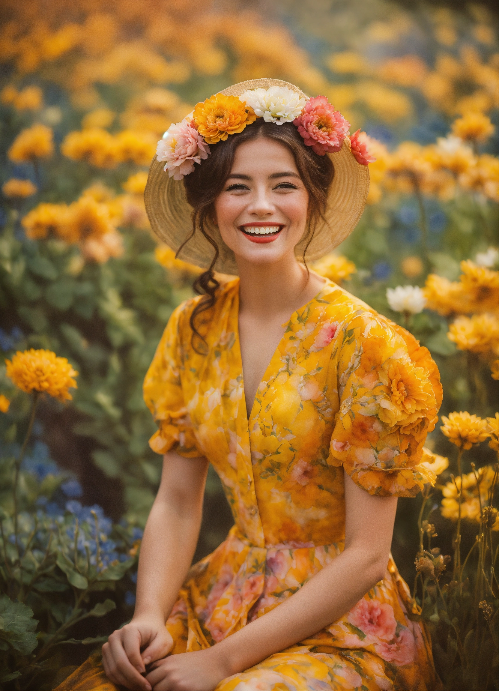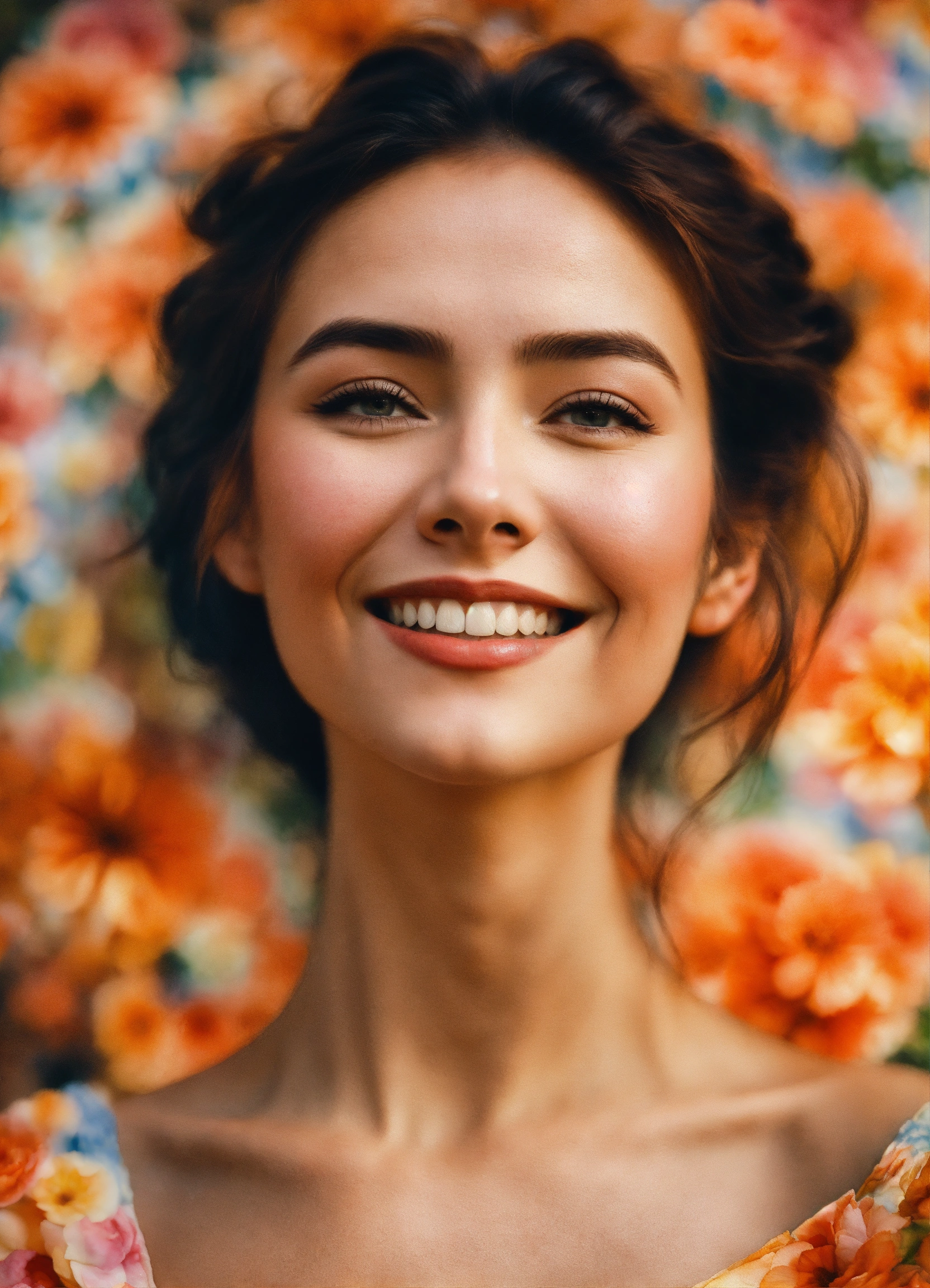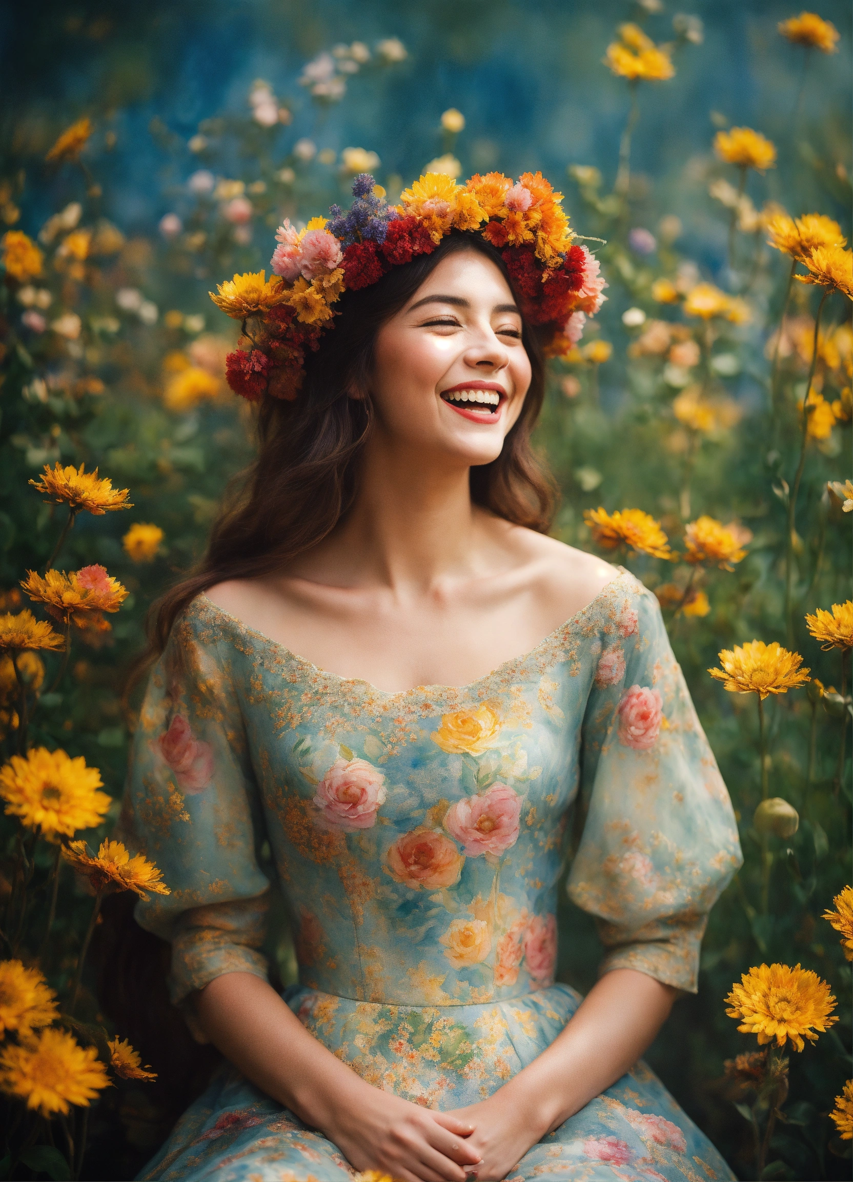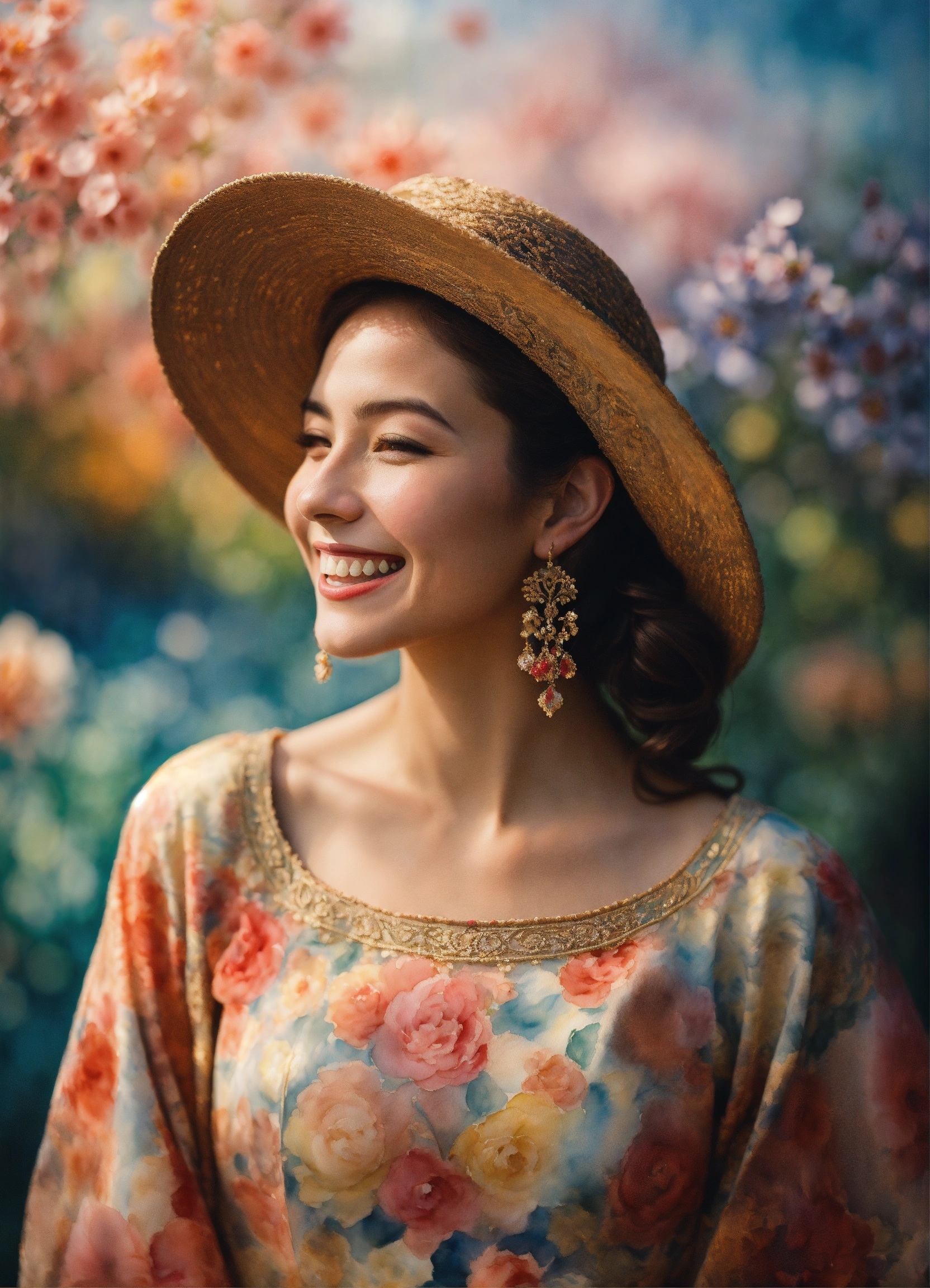 Pure happiness, laughing, on a woman’s face, beautiful, intricate, in perfect symmetry, contrast, watercolor, and photography by claude monet, backdrops perfectly paired a cinematic photograph.