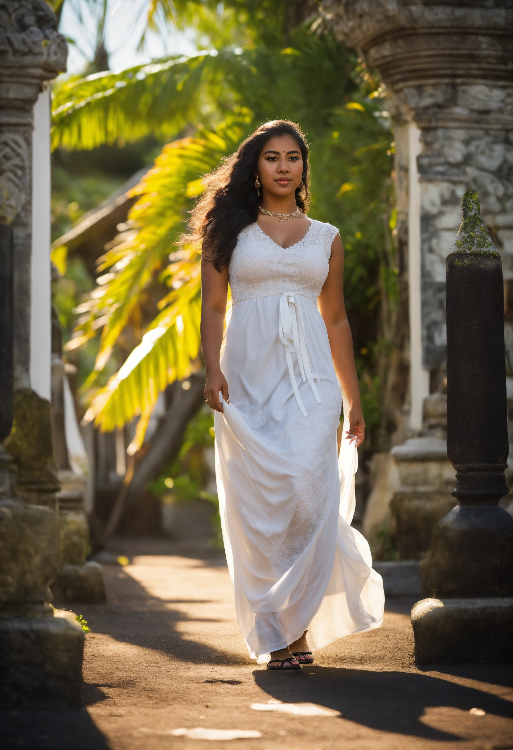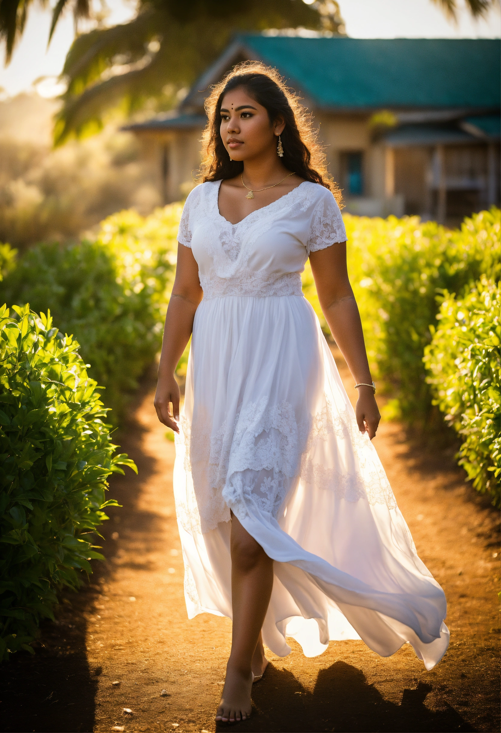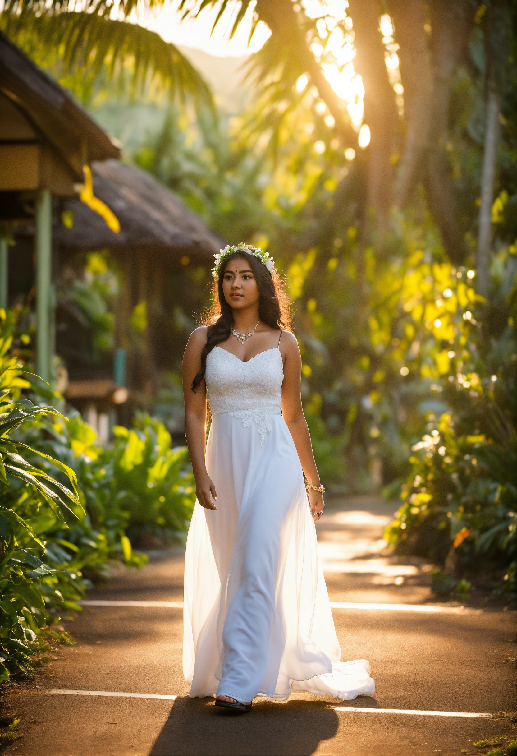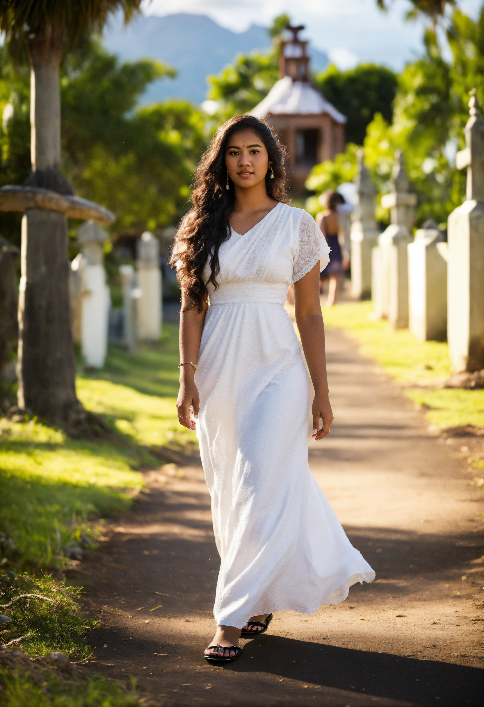 Create realistic, different, full body images of kalaini, a beautiful, young polynesian woman, she is wearing a pretty white dress and walking to church on a beautiful, sunday morning