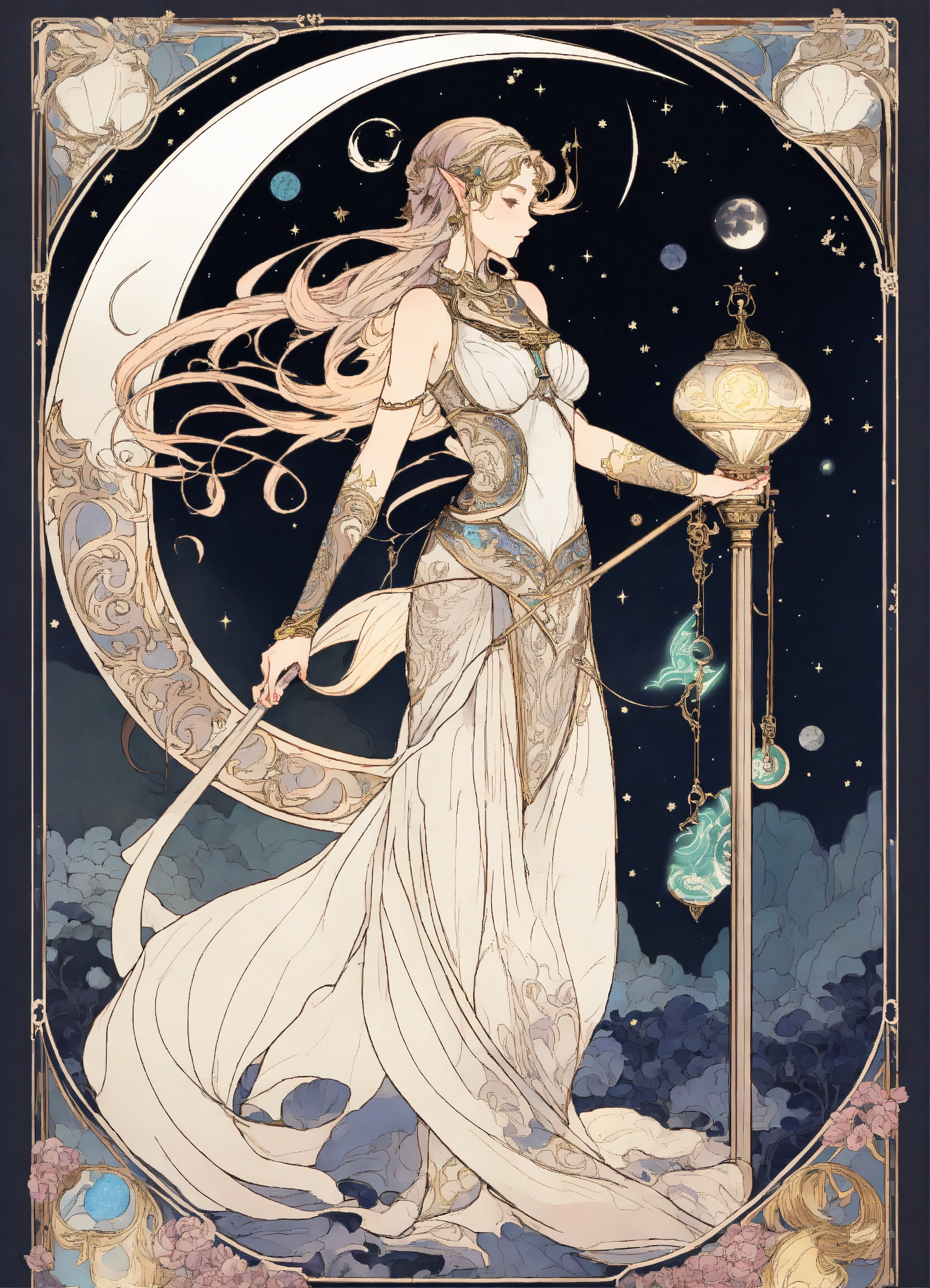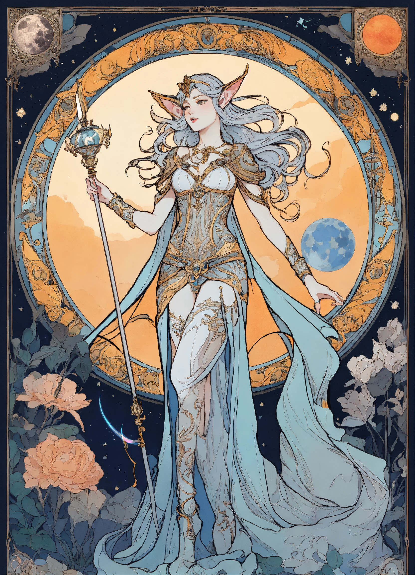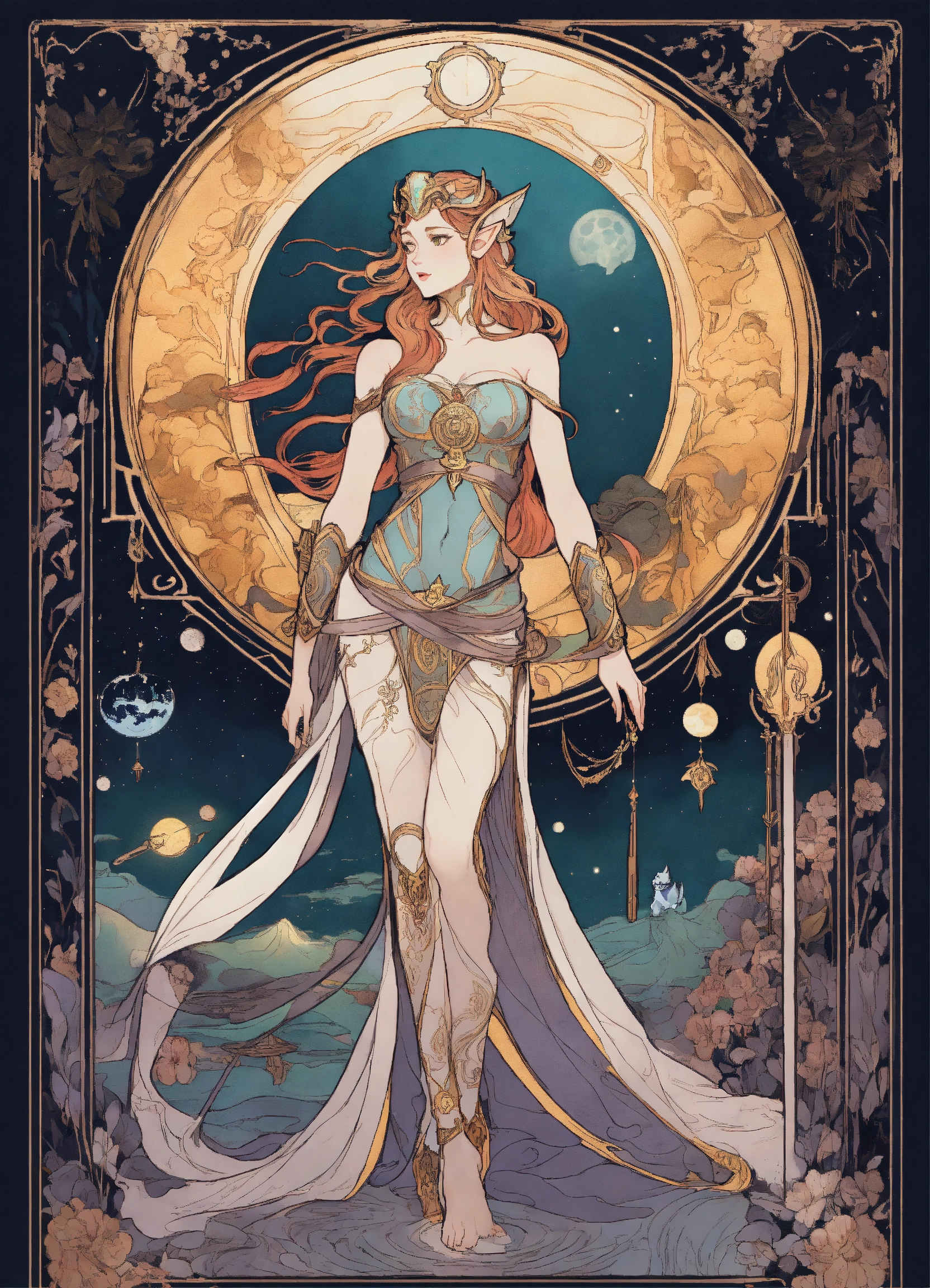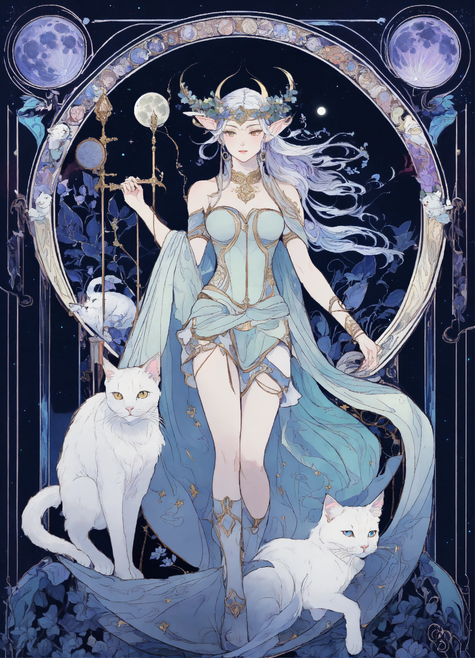Fantasy elf woman full body, astrology libra, tarot card, line drawing, clean clear lines, tattoo style, matte, intricate details. fluid movement, elf warrior, action shot. alphonse mucha. moon night time, mystical. white cat. vibrant color