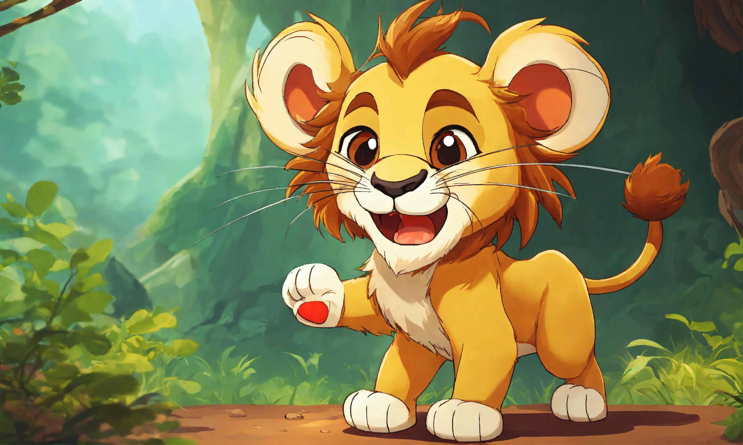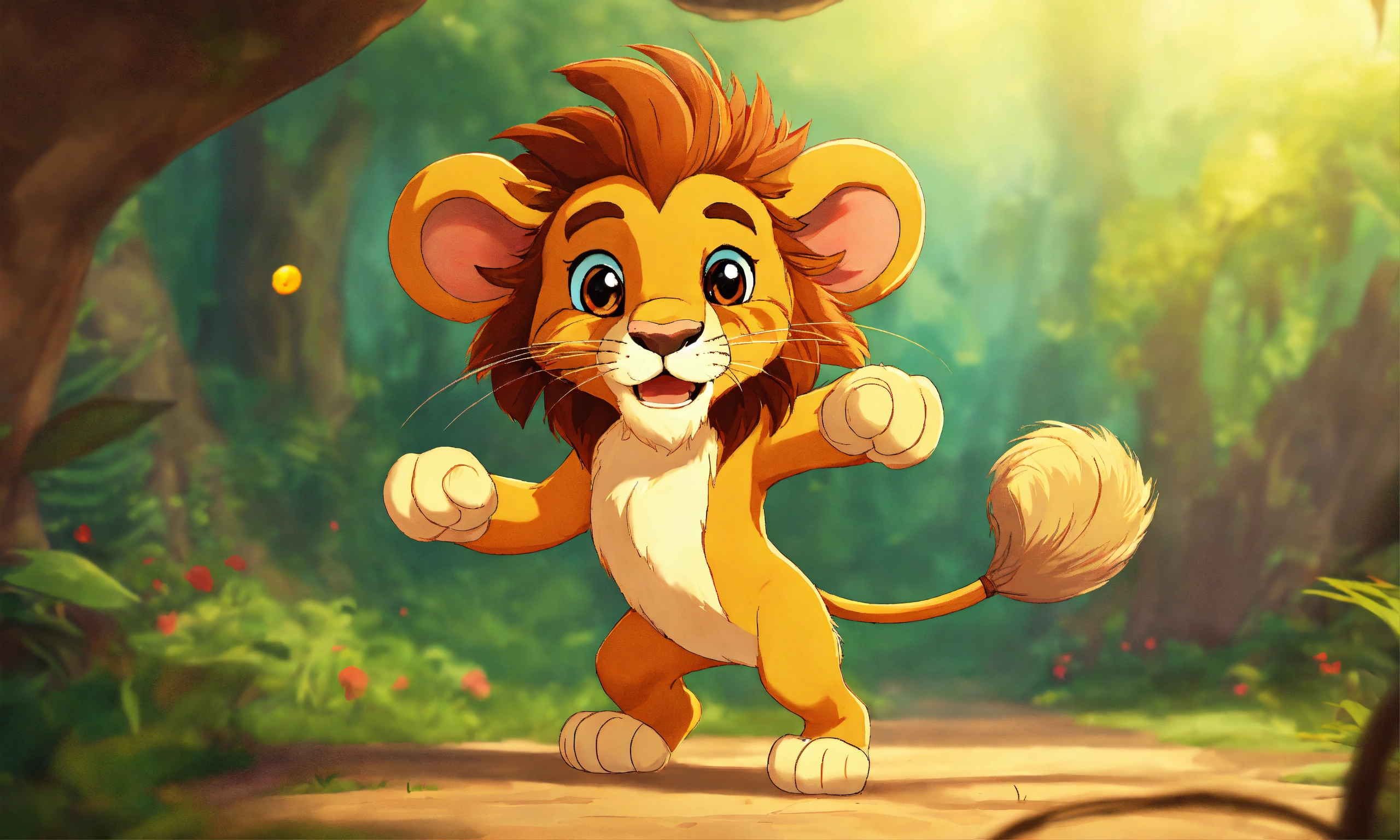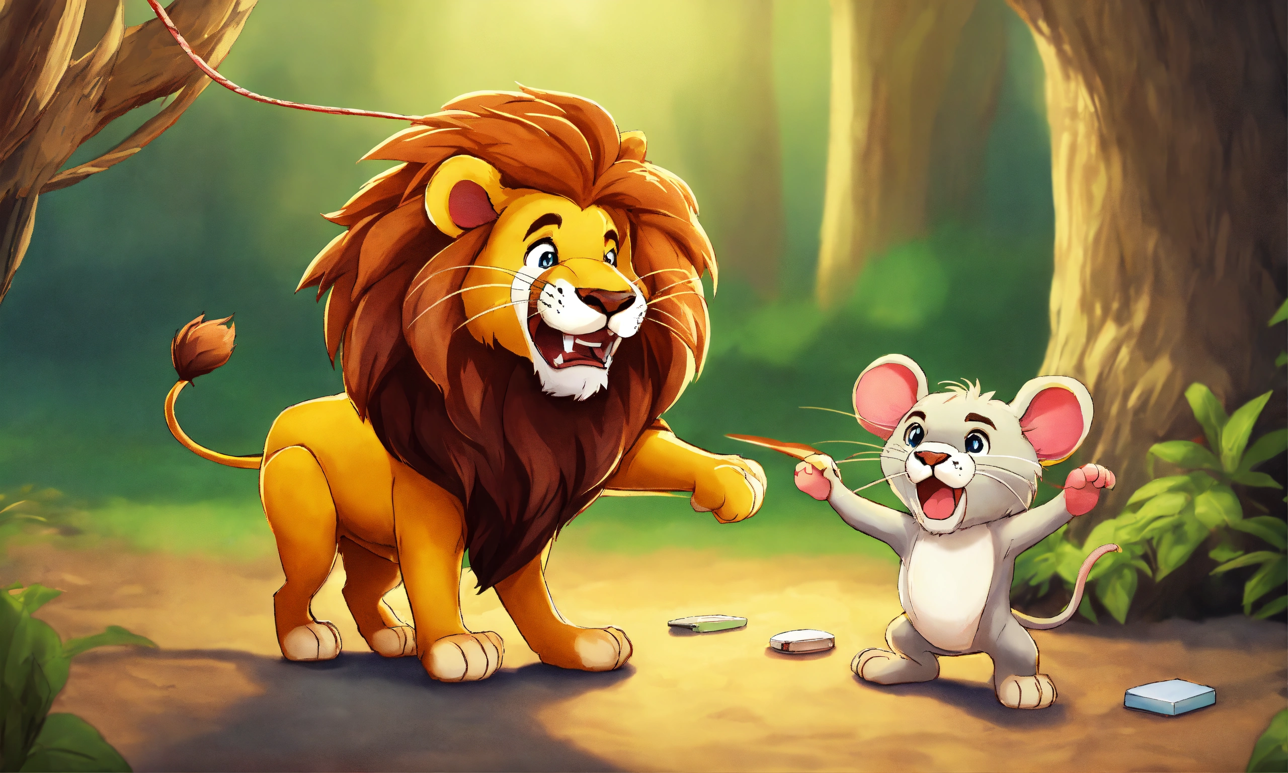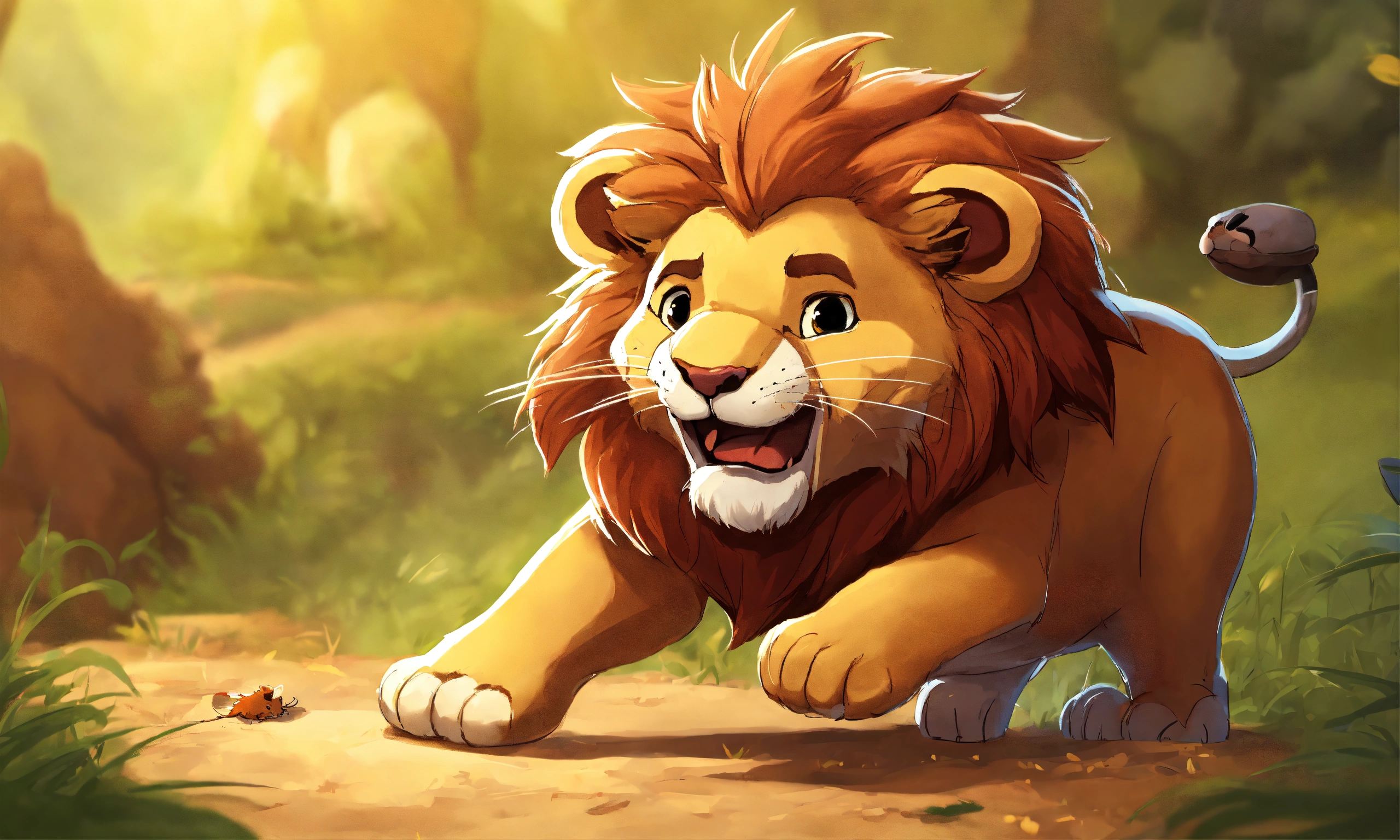 Cartoon cute lion caught the mouse with force through both hand