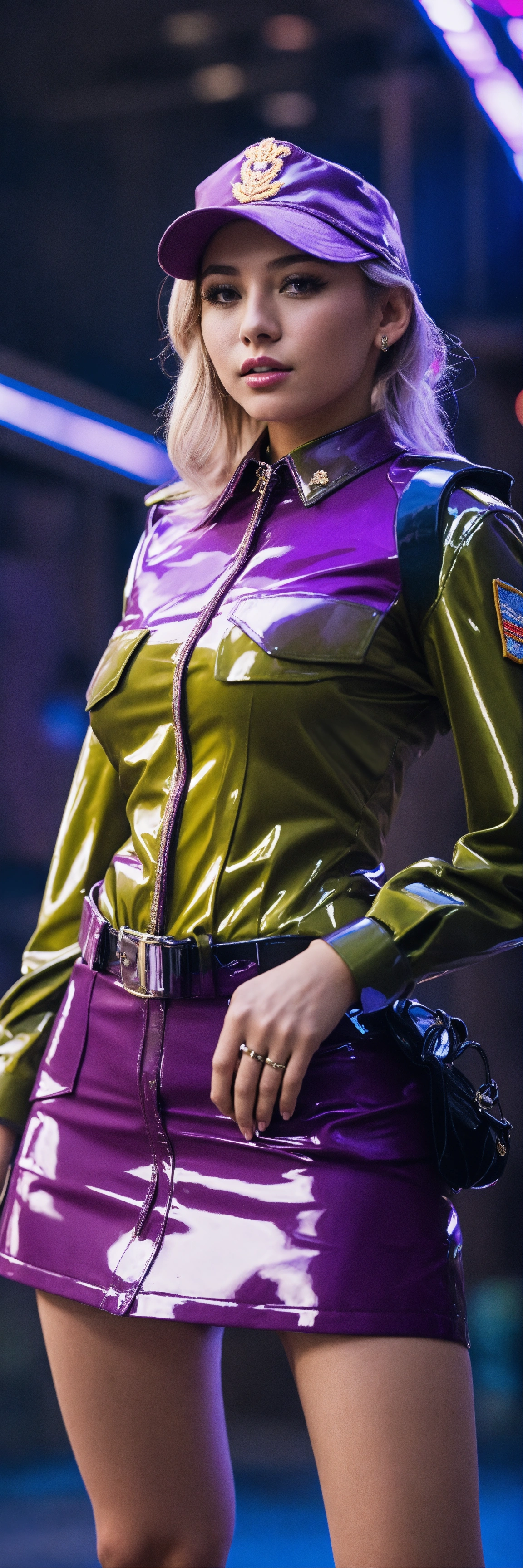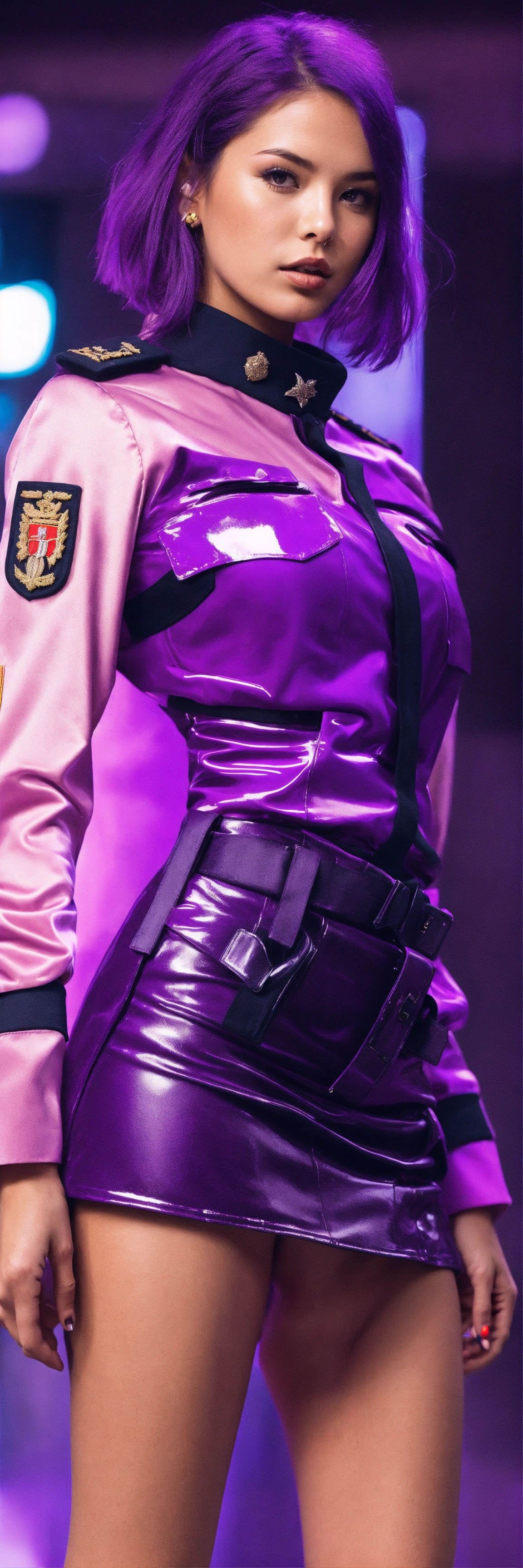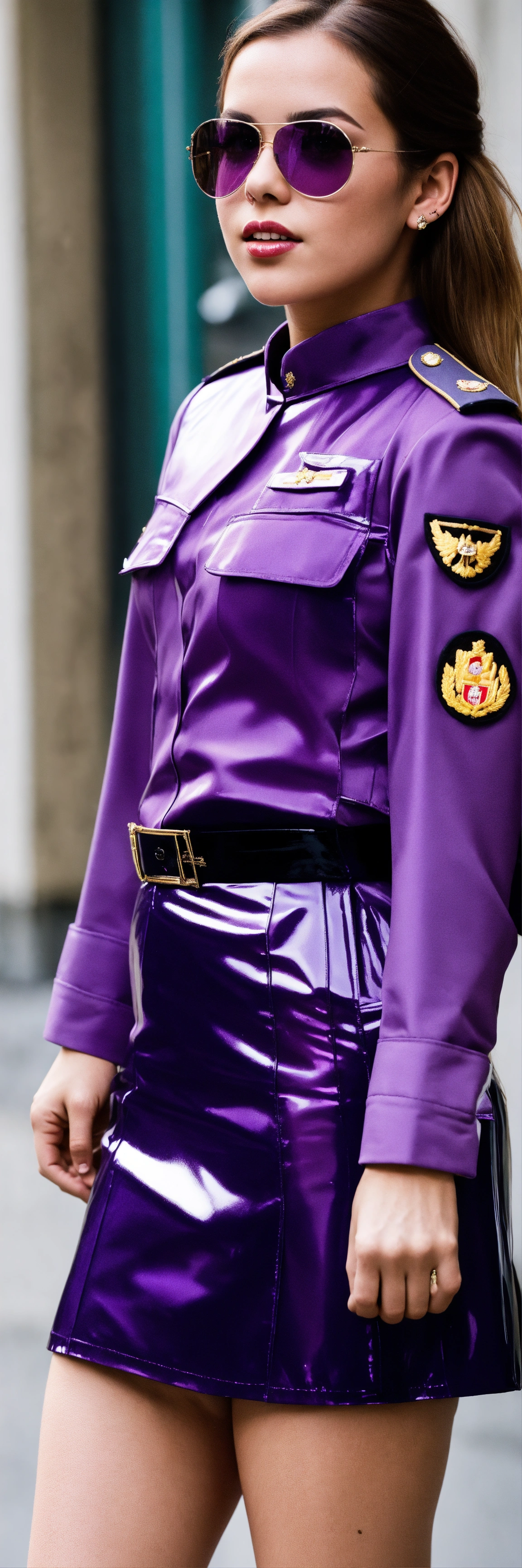 Girl in glossy purple army uniform miniskirt