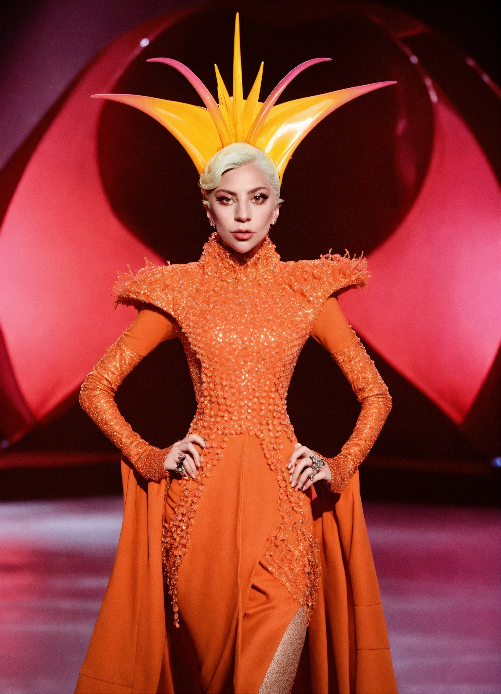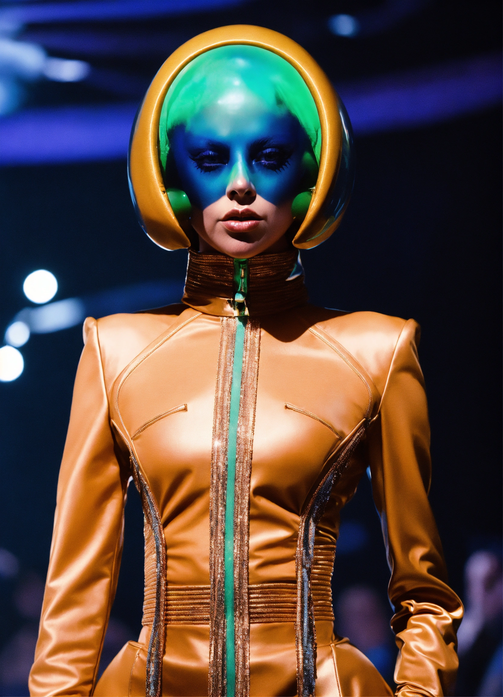 Lady gaga’s alien fashion line” design an image showcasing lady gaga as a fashion designer for extraterrestrial beings, modeling her otherworldly clothing collection.