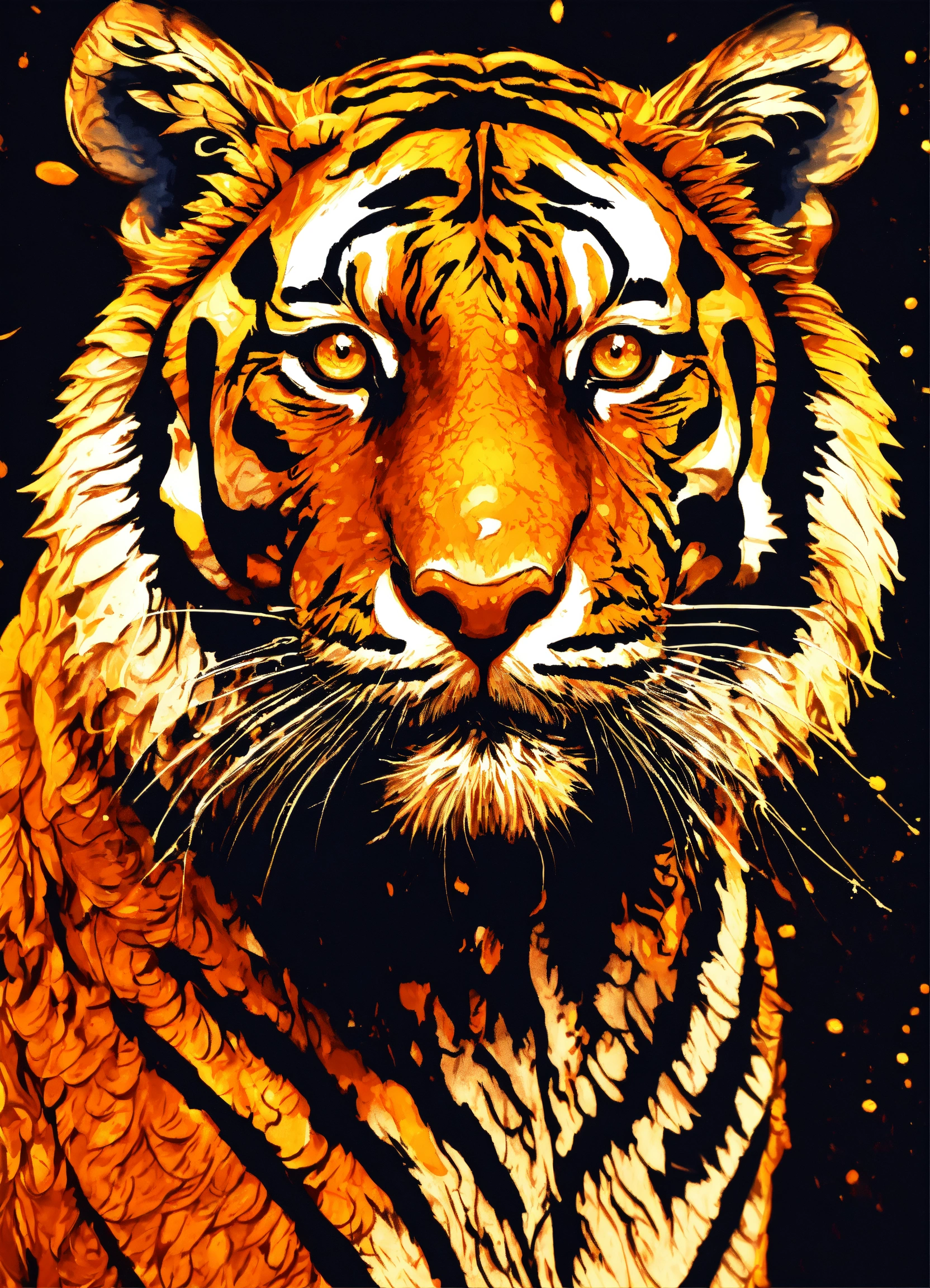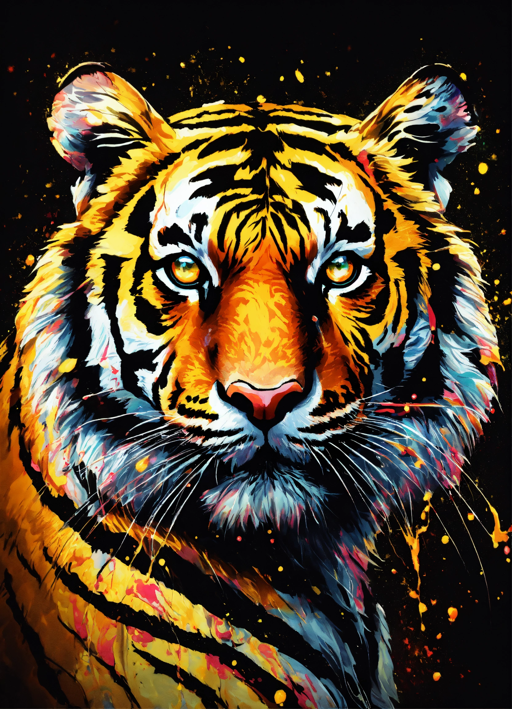 (a cute tiger), hyperdetailed eyes, tee-shirt design, line art, black background, ultra detailed artistic, detailed gorgeous face, natural skin, water splash, colour splash art, fire and ice, splatter, black ink, liquid melting, dreamy, glowing, glamour, glimmer, shadows, oil on canvas, brush strokes, smooth, ultra high definition, 8k, unreal engine 5, ultra sharp focus, intricate artwork masterpiece, ominous, golden ratio, highly detailed, vibrant, production cinematic character render, ultra high quality model