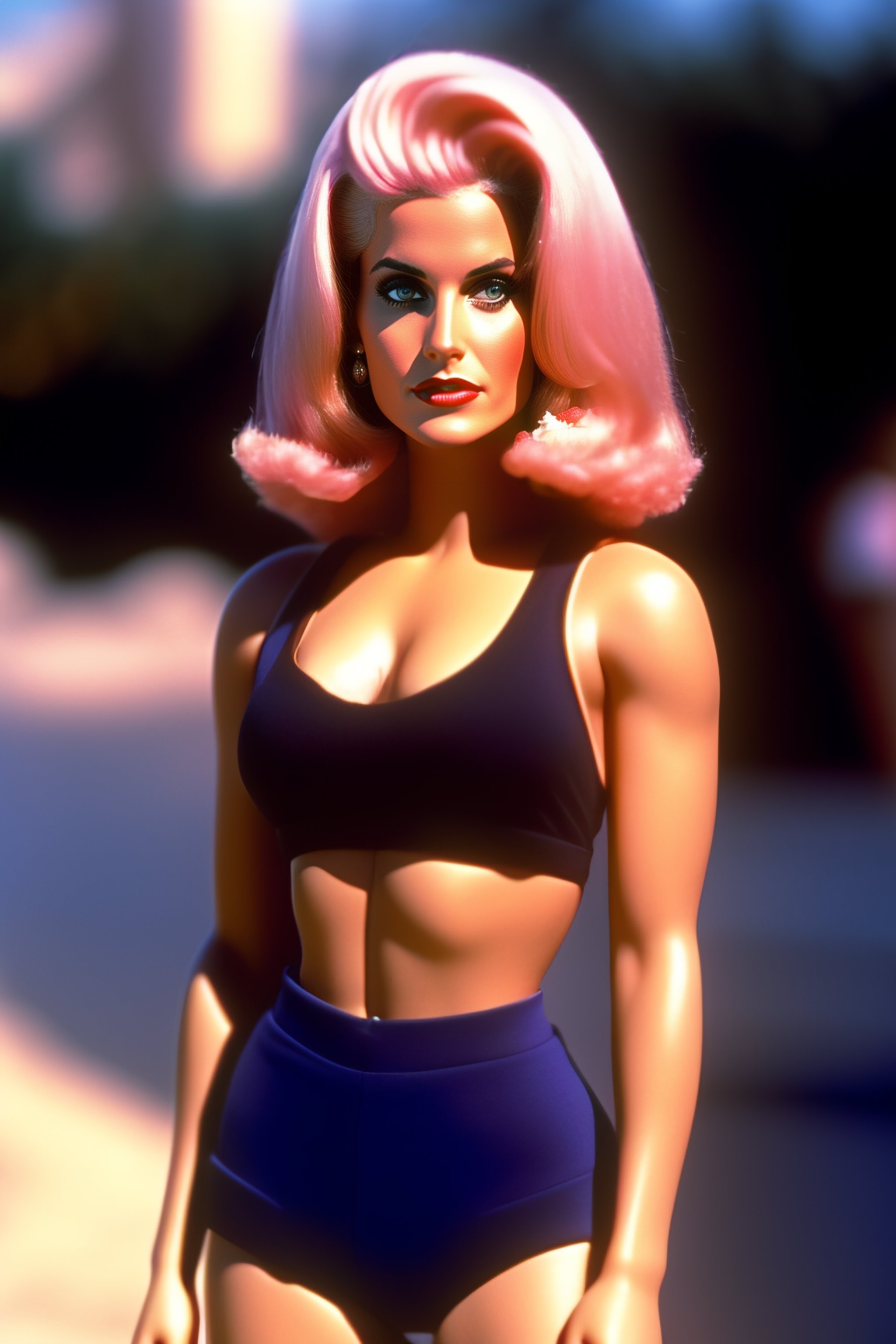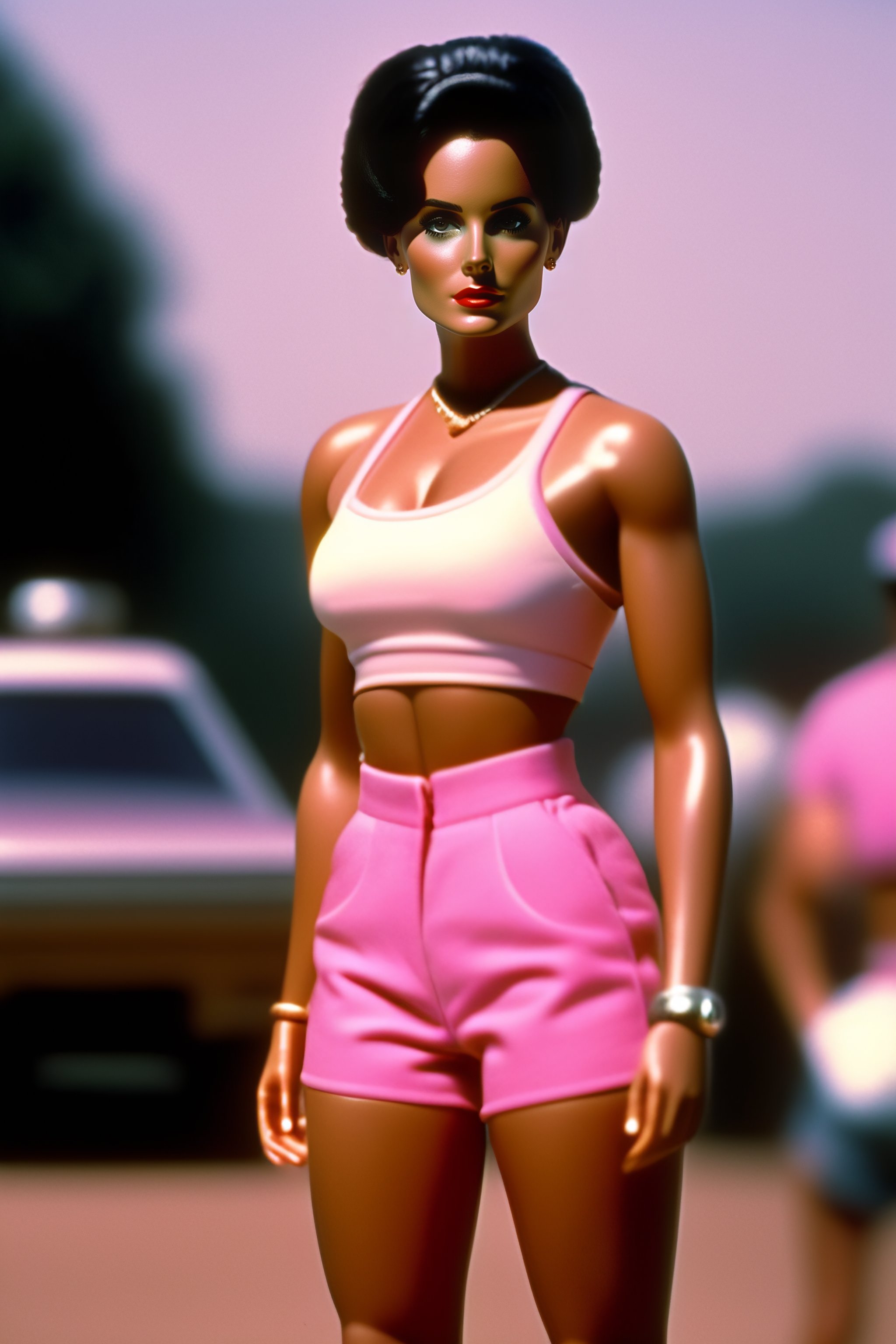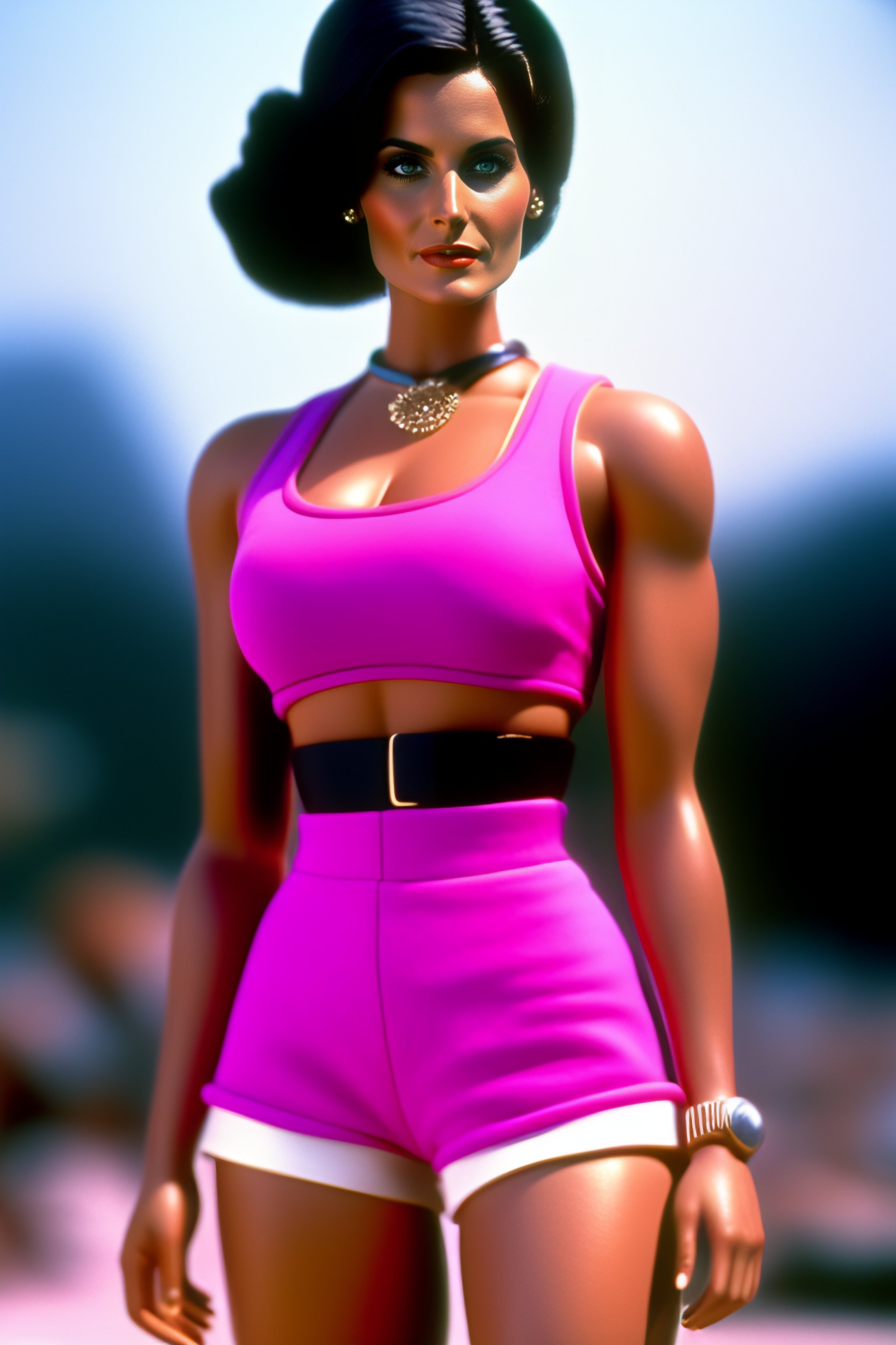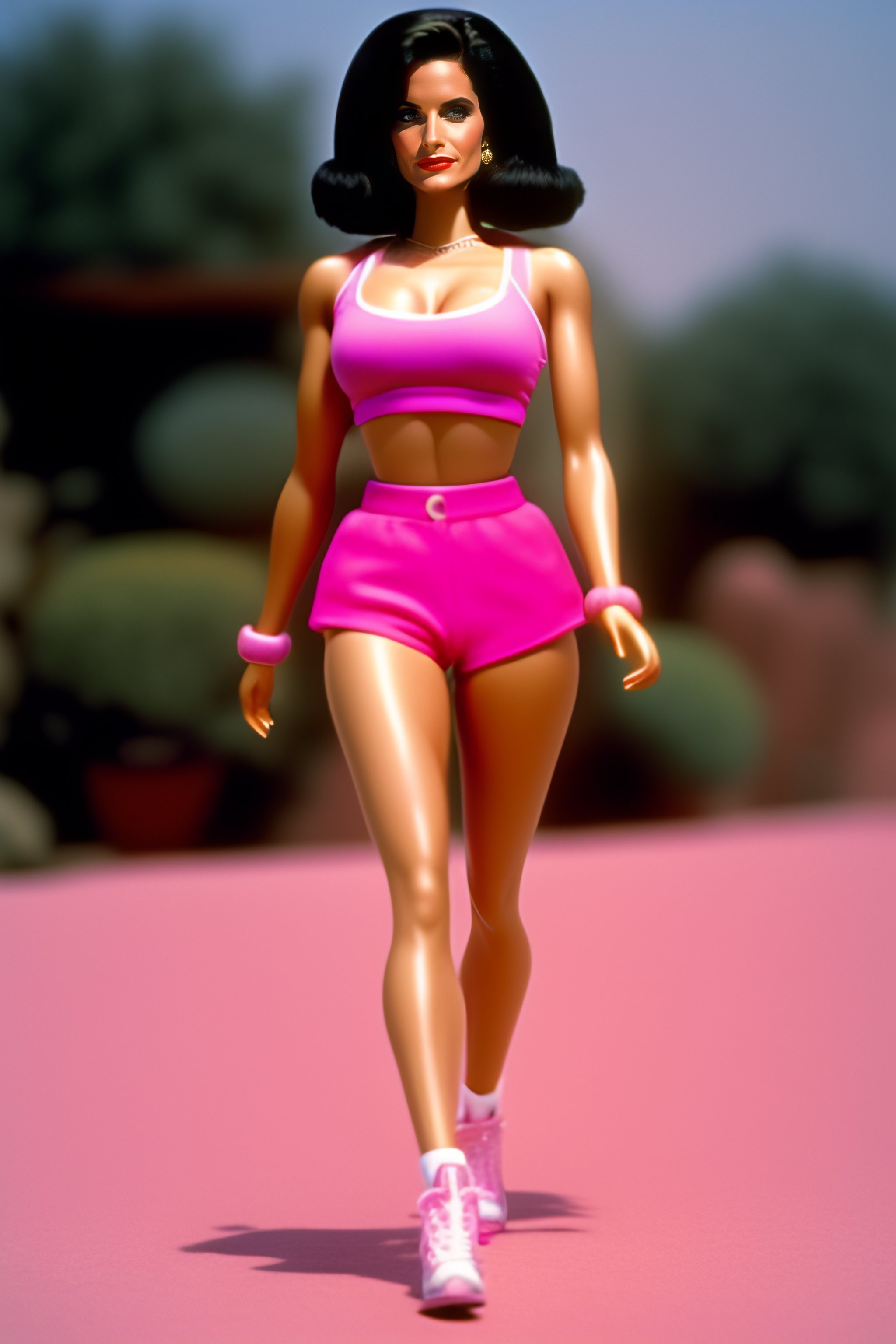 Monica geller, barbie doll, perfect hourglass body, shorts and pink tank top, 1990, realism, futuristic sharp focus, movie still