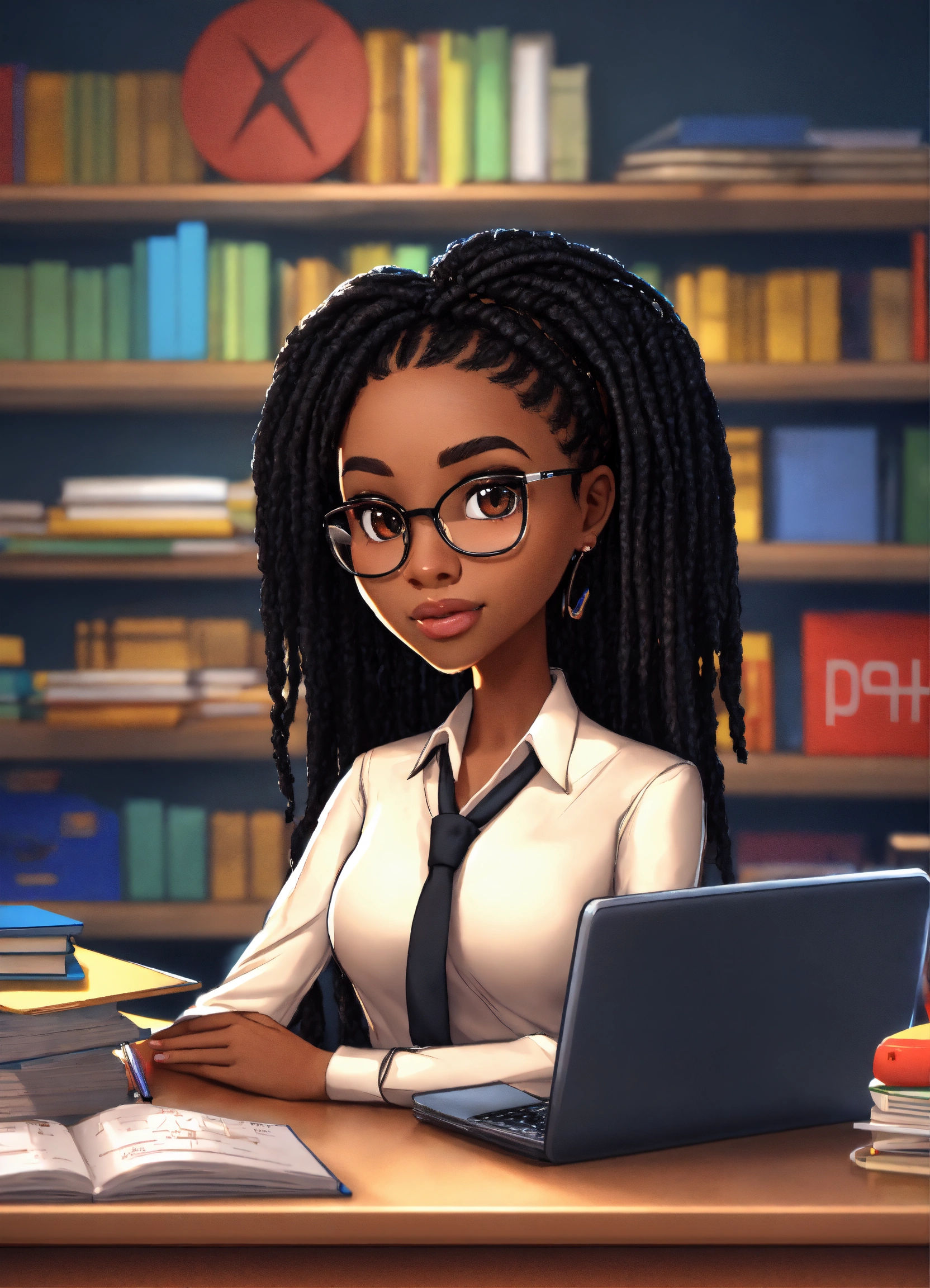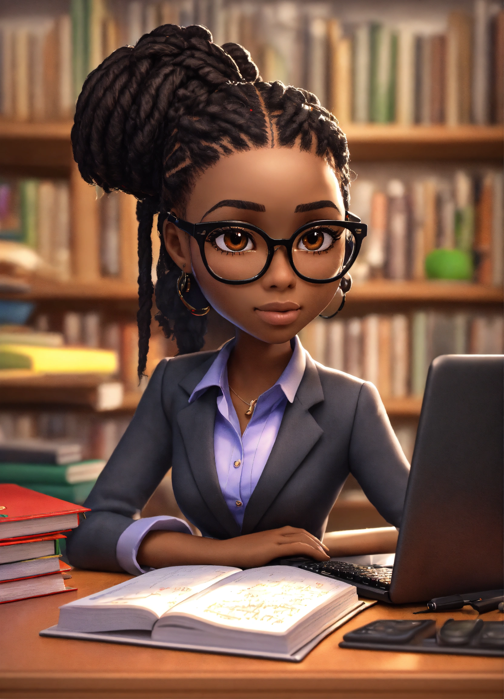 Chibi big eyed african american teacher with all black locs pulled back in a bun on top of head, leaning up against teacher desk, mathematics books, calculator, pencils, laptop, desk, professional, ultra-realistic, pixar style, 3d render, photo, anime, illustration, closeup, portrait
