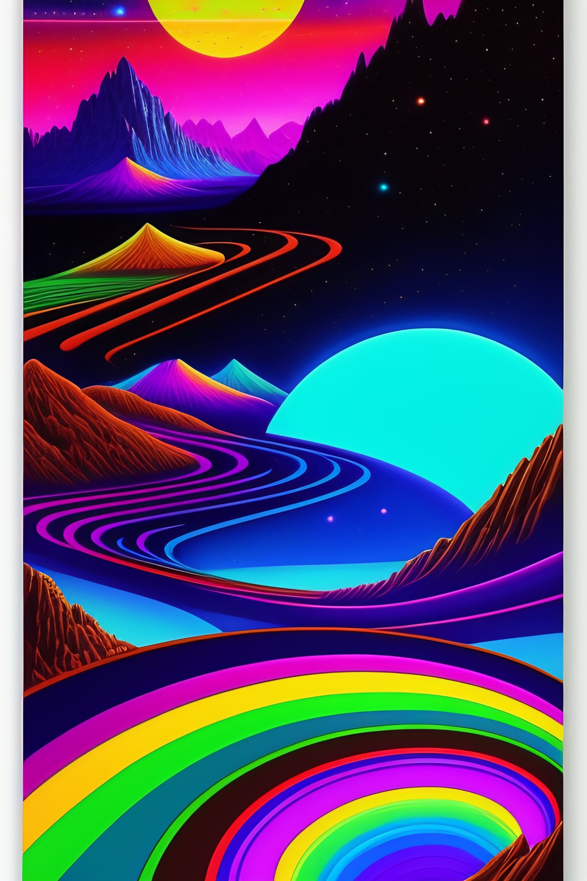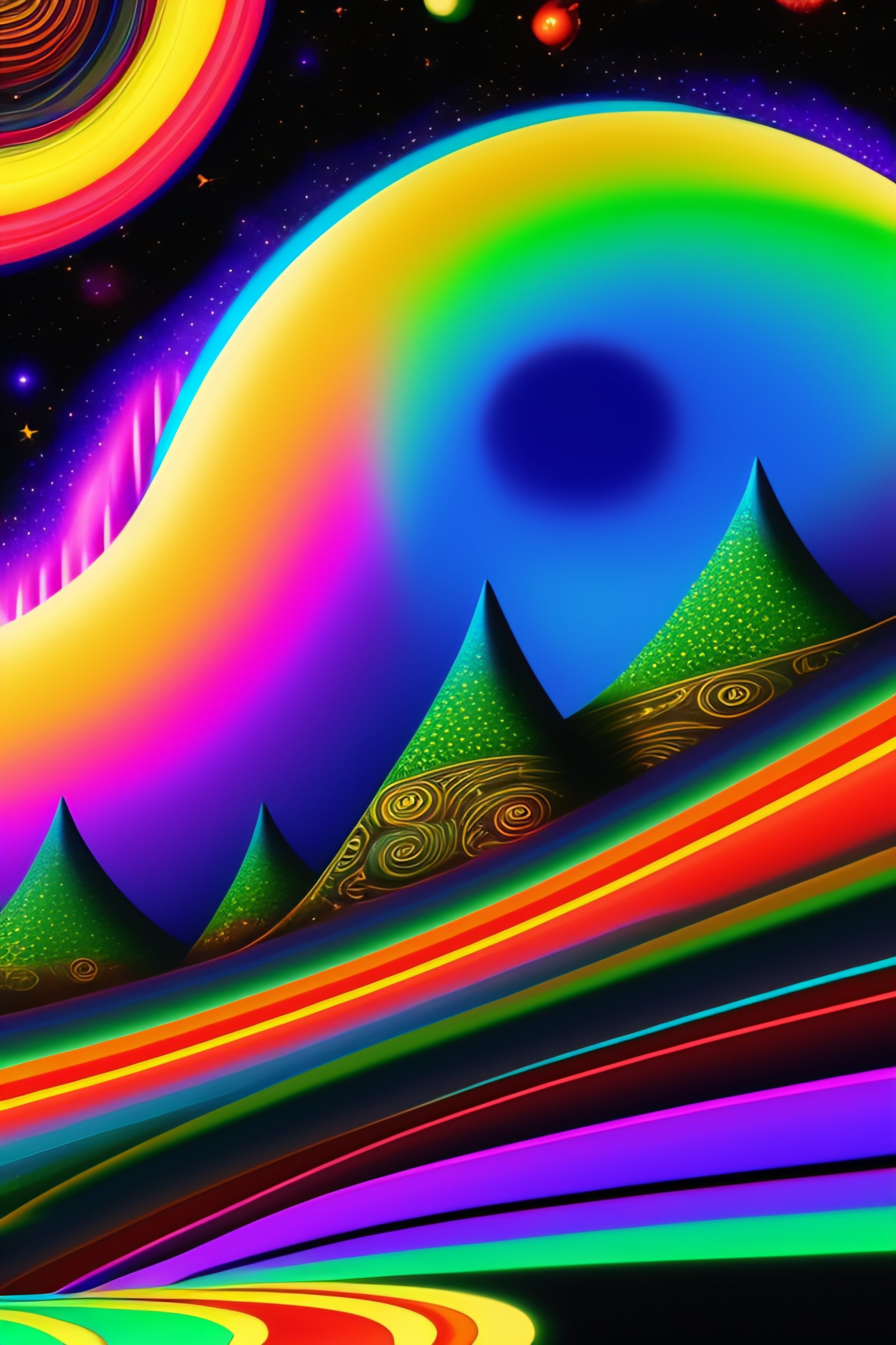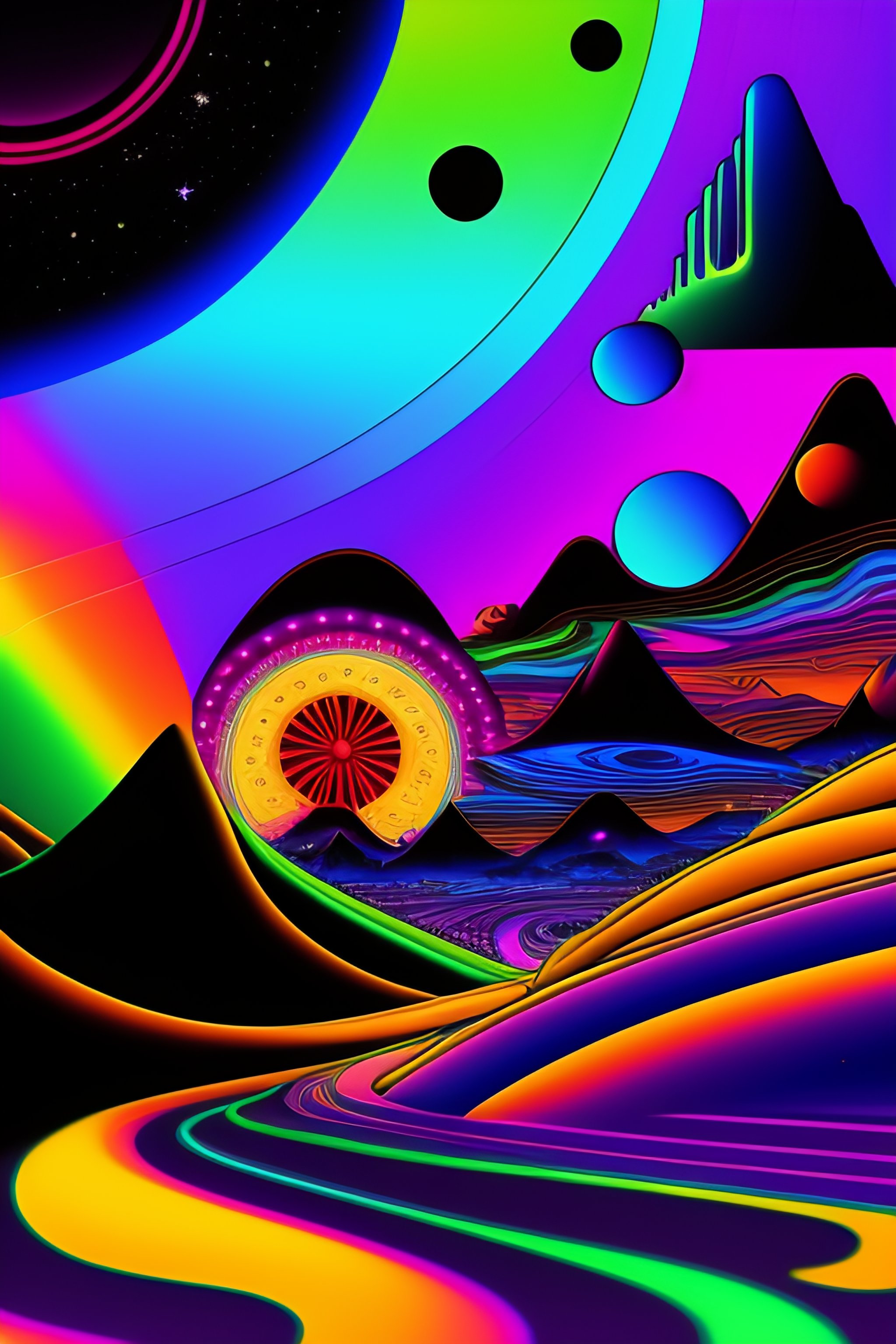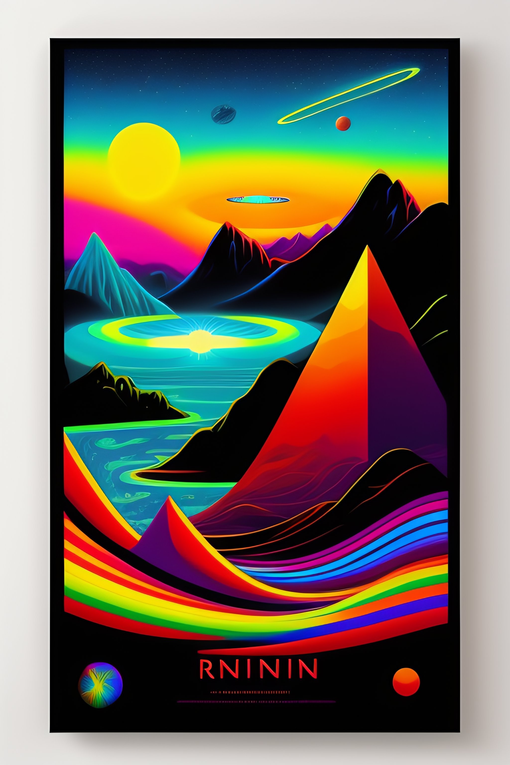 Psychedelic vintage full shot 1960's cartoon poster with hippy superhero, ovni, tron, psychedelic alien hippies smoking marijuana, black in color, with a psychedelic steampunk space background, mountains, waterfall, planets, galaxy, futuristic rainbow lighting, cinematic lighting, cozy lighting, 8k, cinematic poster vintage 1960's, realistic