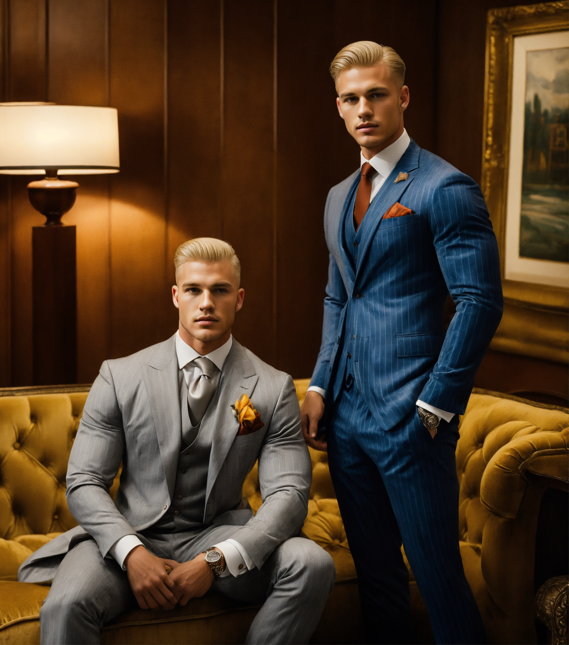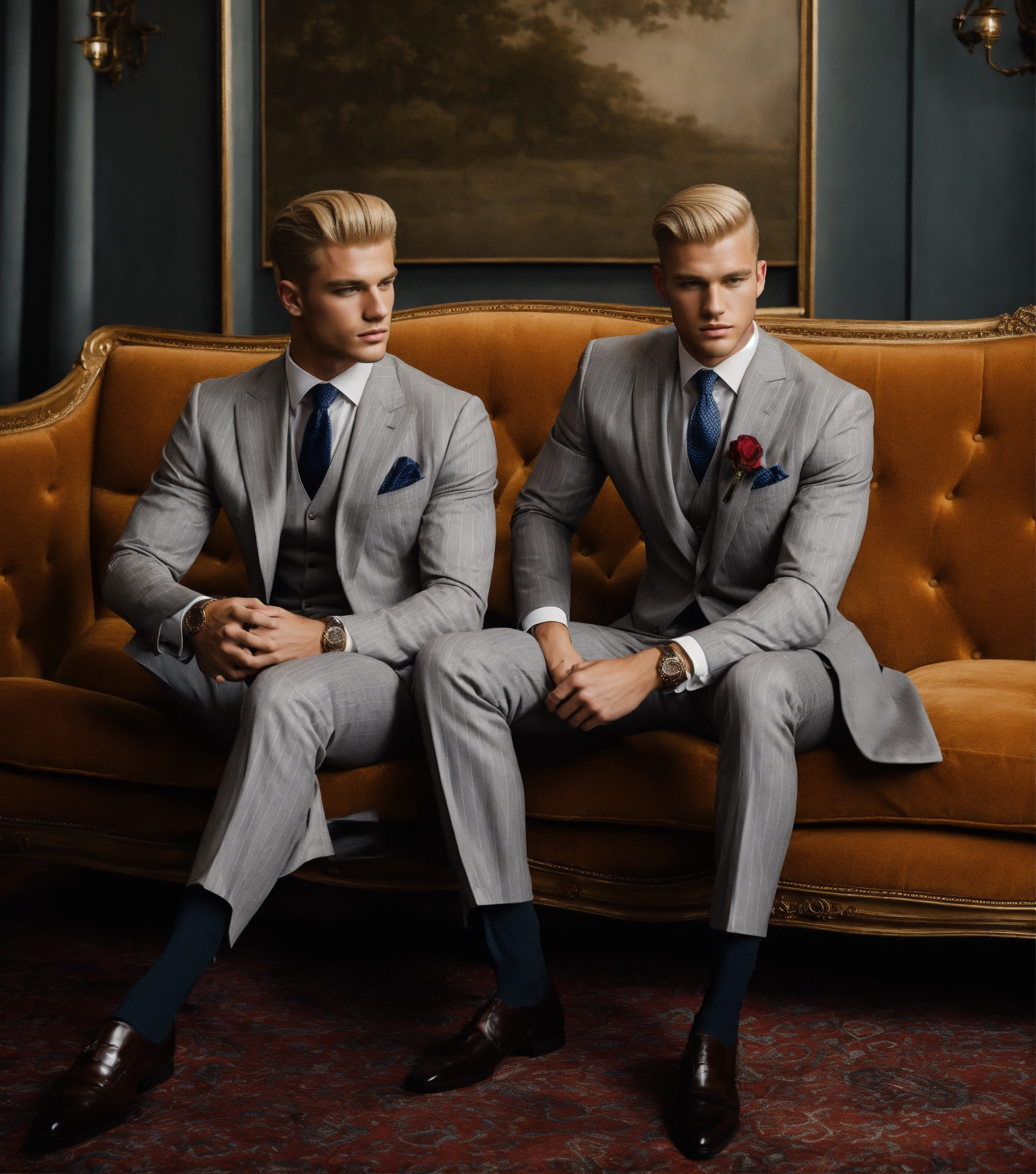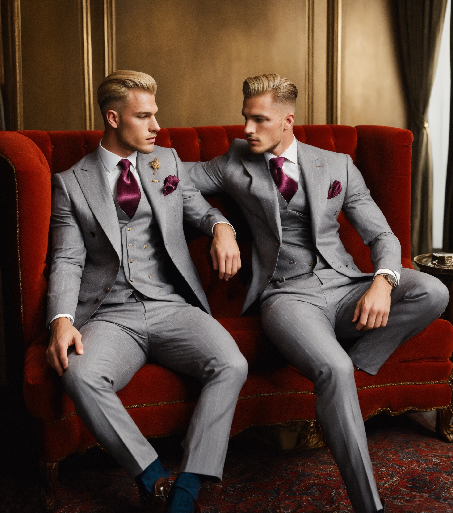 Two blonde muscled gentlemen, in light grey pinstripe vested suit, club tie, pompadour haircut, seating on a velvet sofa, embracing