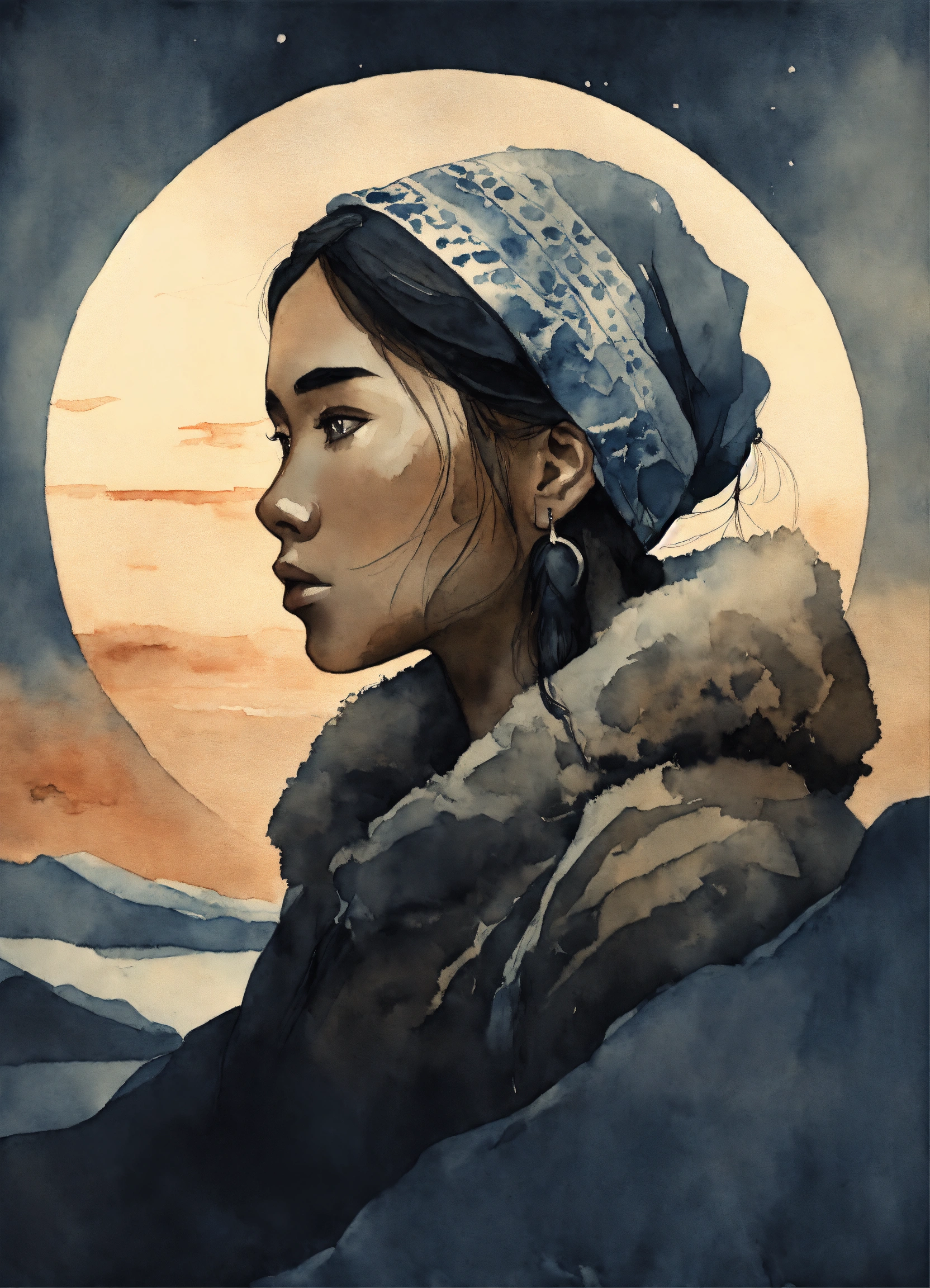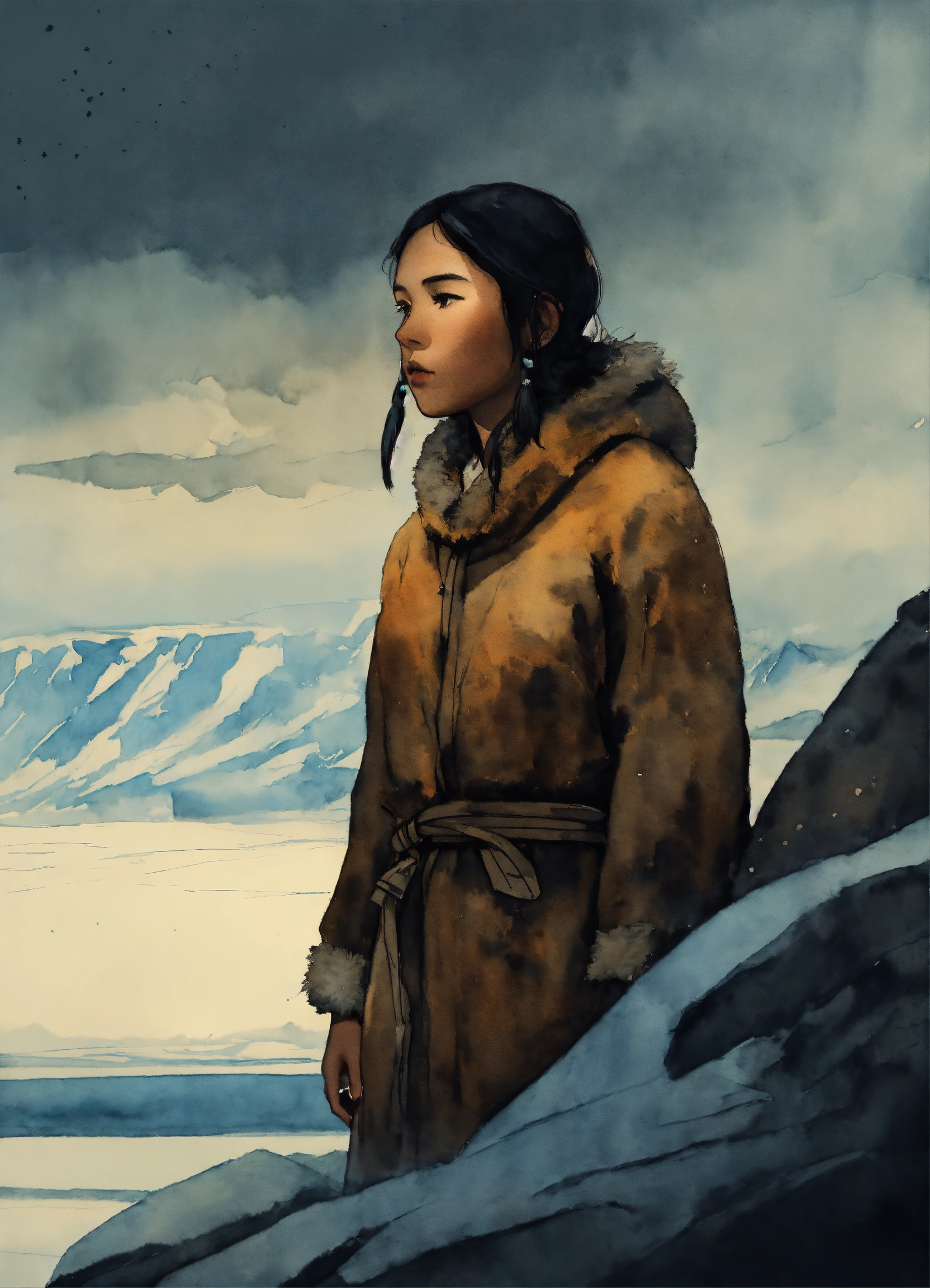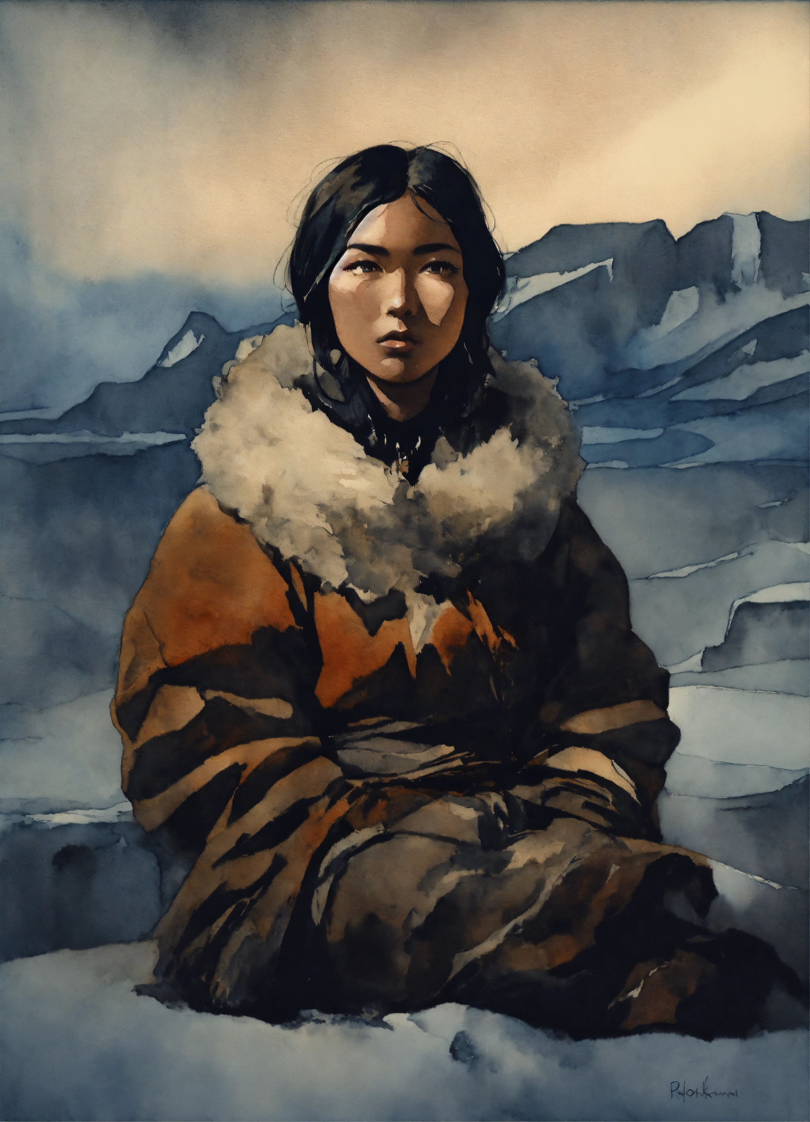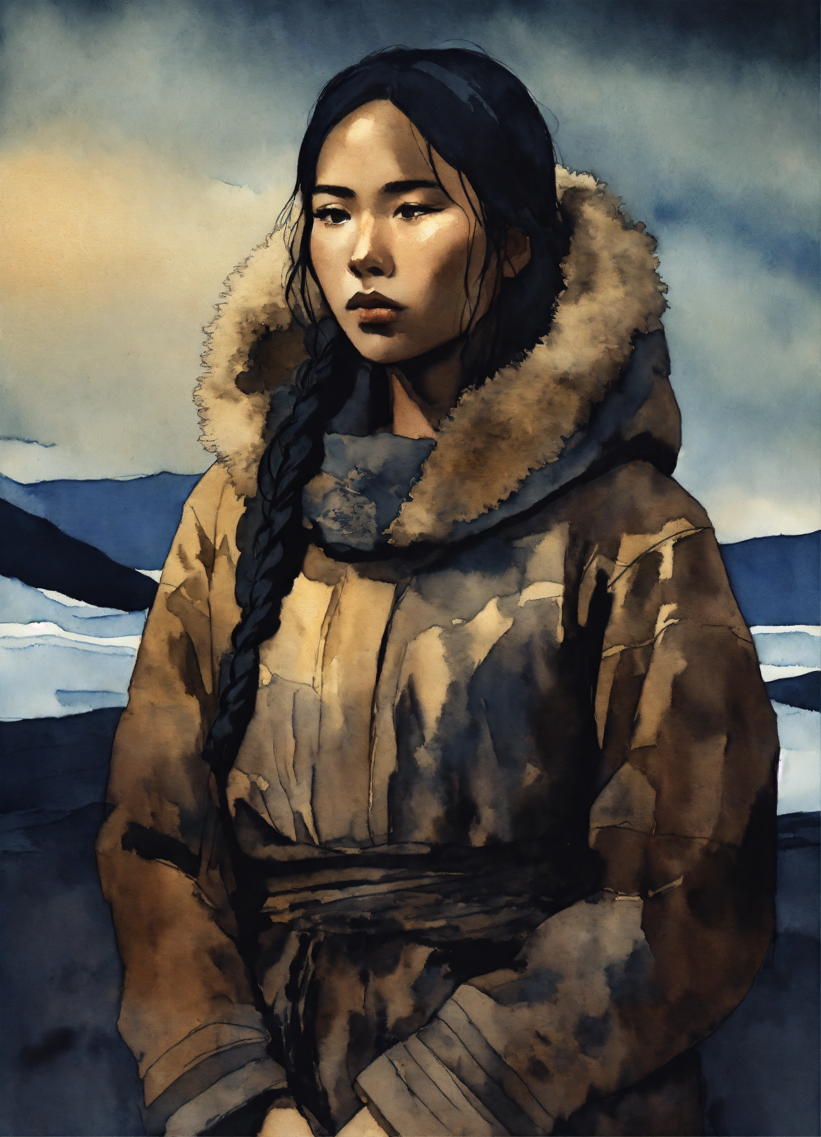 Illustration of a young inuit woman, 18 years old, paleolithic arctic clothing, outlined silhouettes, dark hues, watercolor painting, gloomy and depressing ambient, in the style of tom björklund