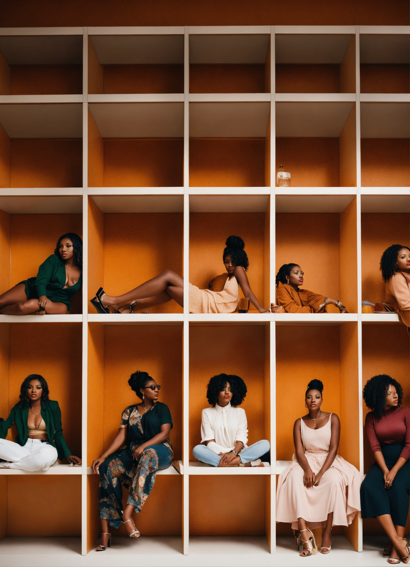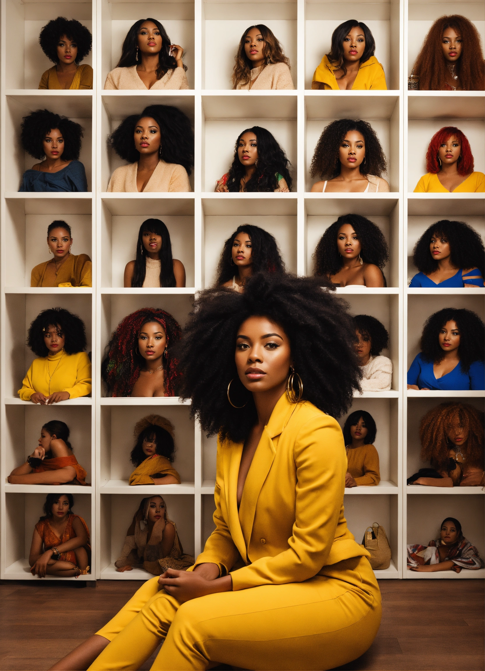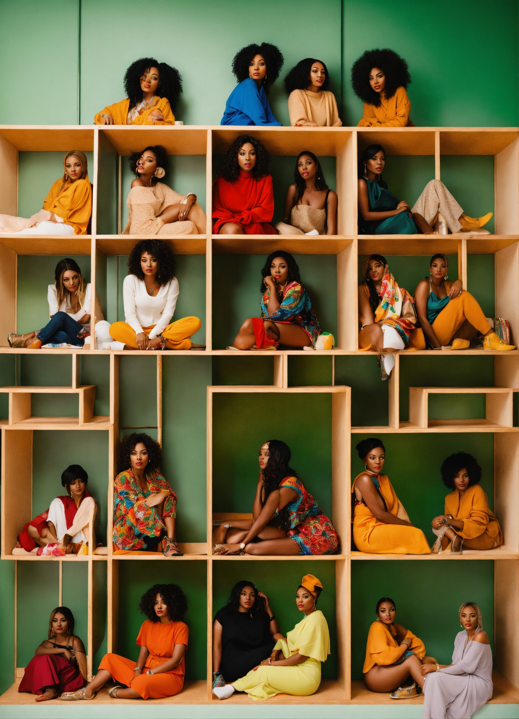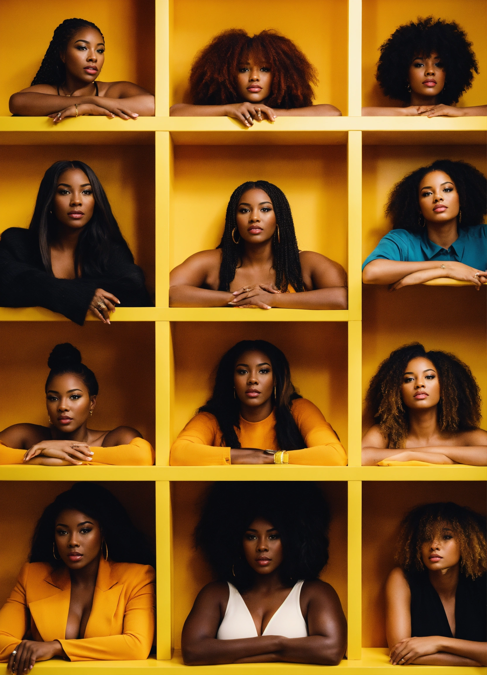 9 different black women sitting inside a white shelf