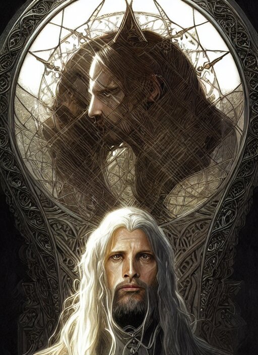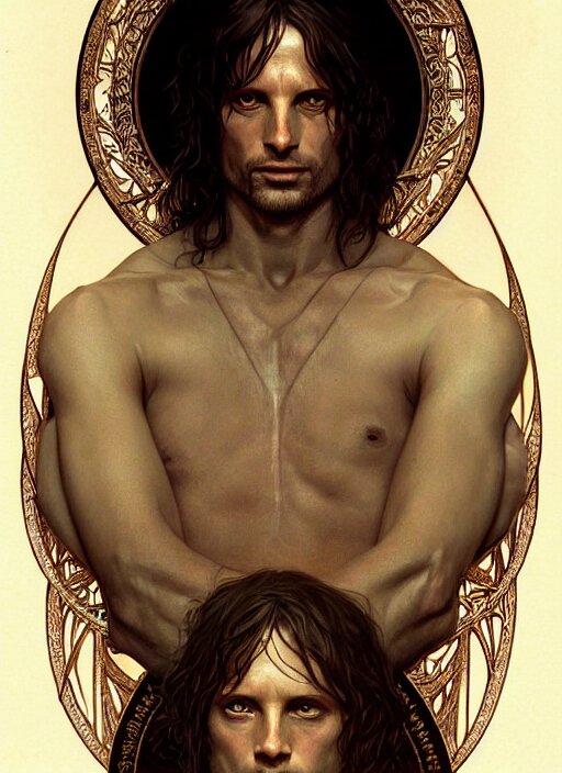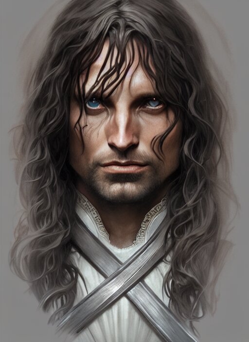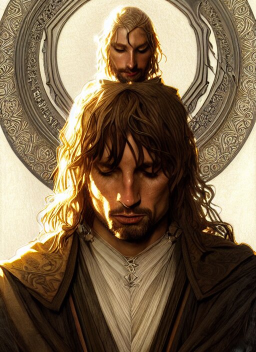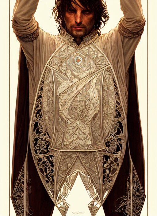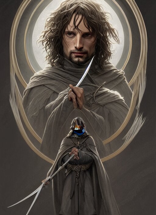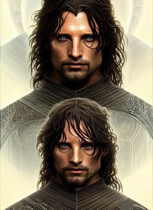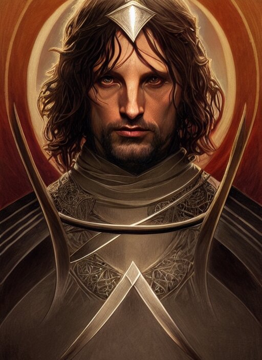 Symmetry!! concept art for lord of the rings character aragorn, dnd, intricate, elegant, highly detailed, digital painting, artstation, concept art, smooth, sharp focus, illustration, art by artgerm and greg rutkowski and alphonse mucha
