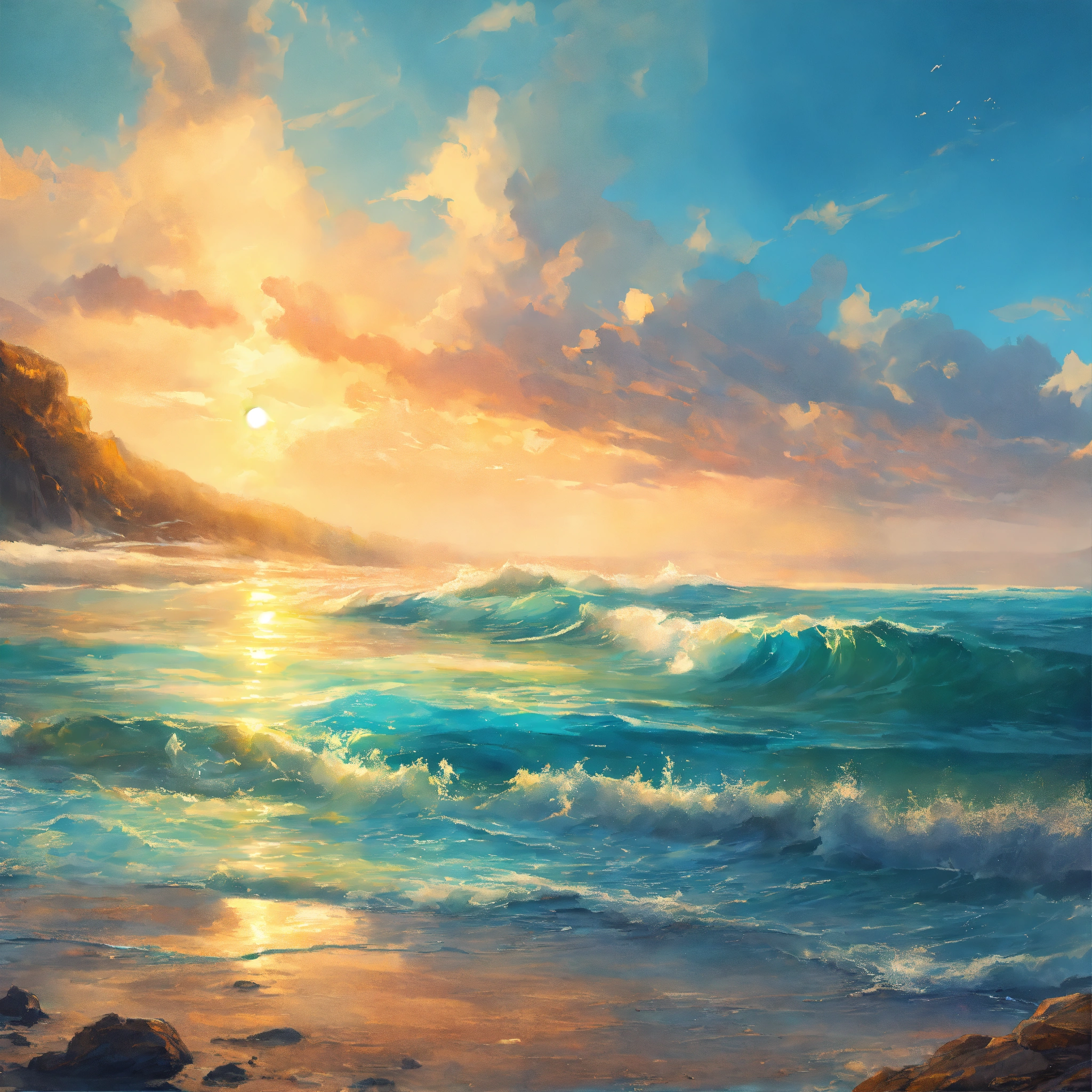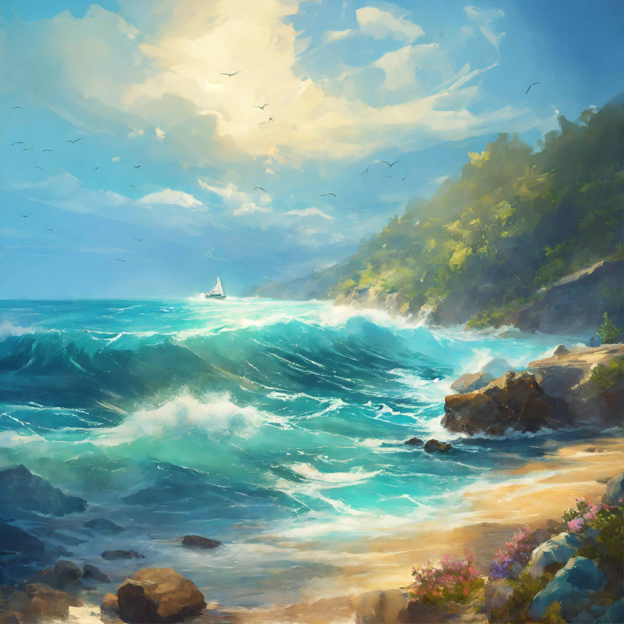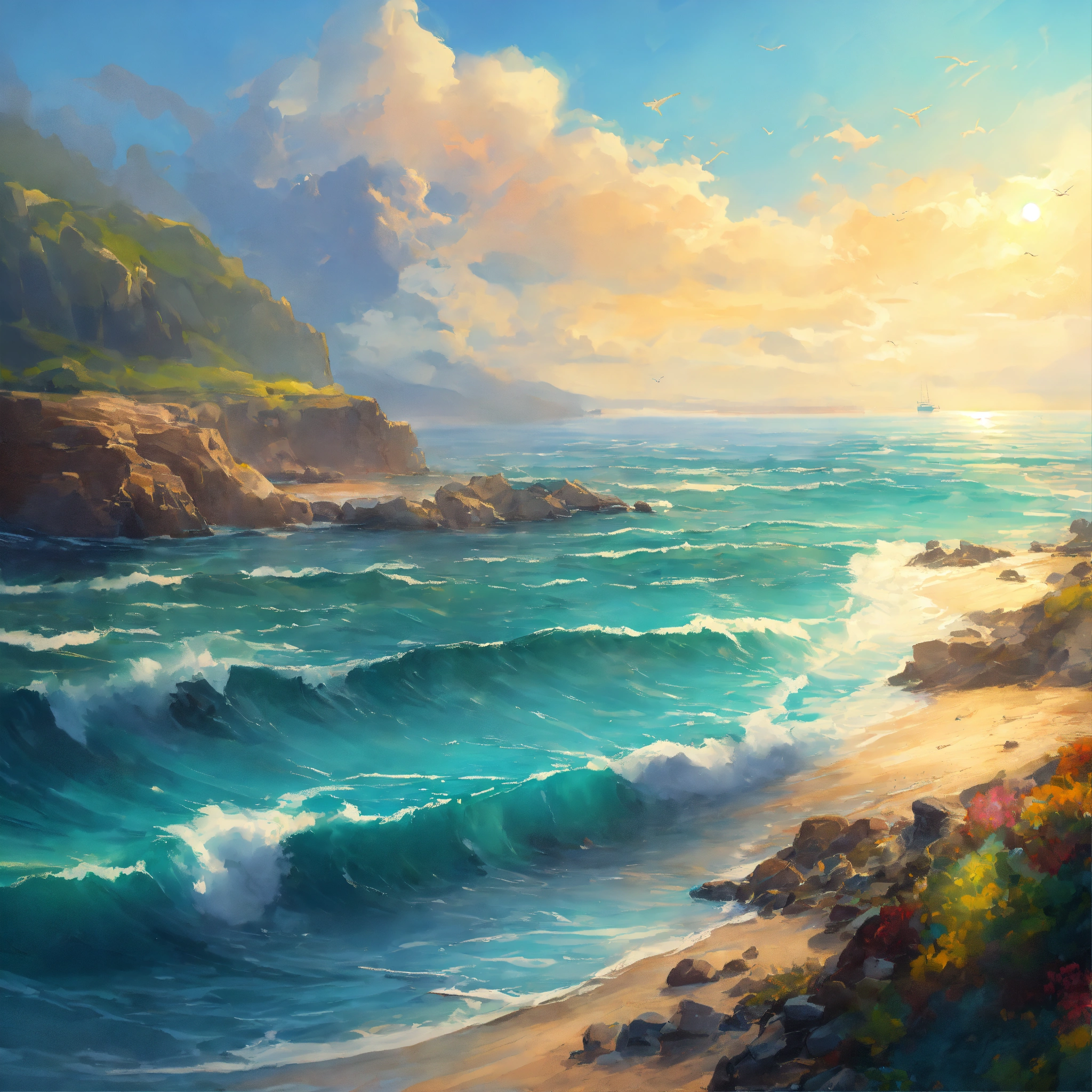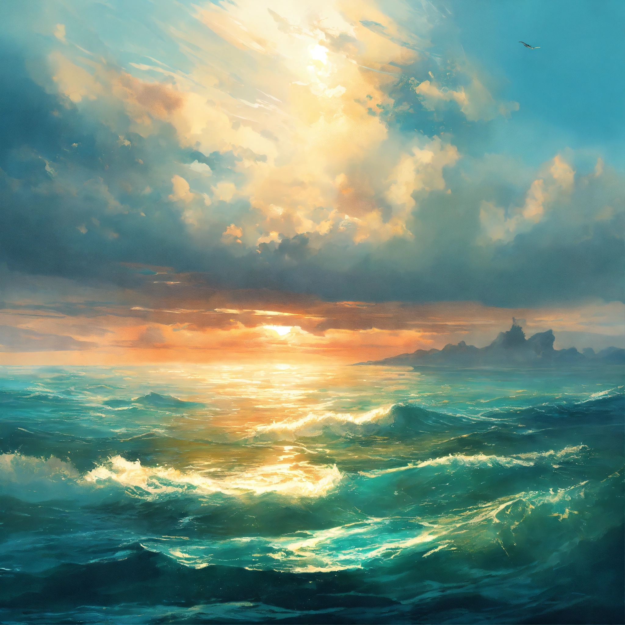Concept art of an endless ocean during a bright day, painting style, highly detailed, brush strokes, 8k