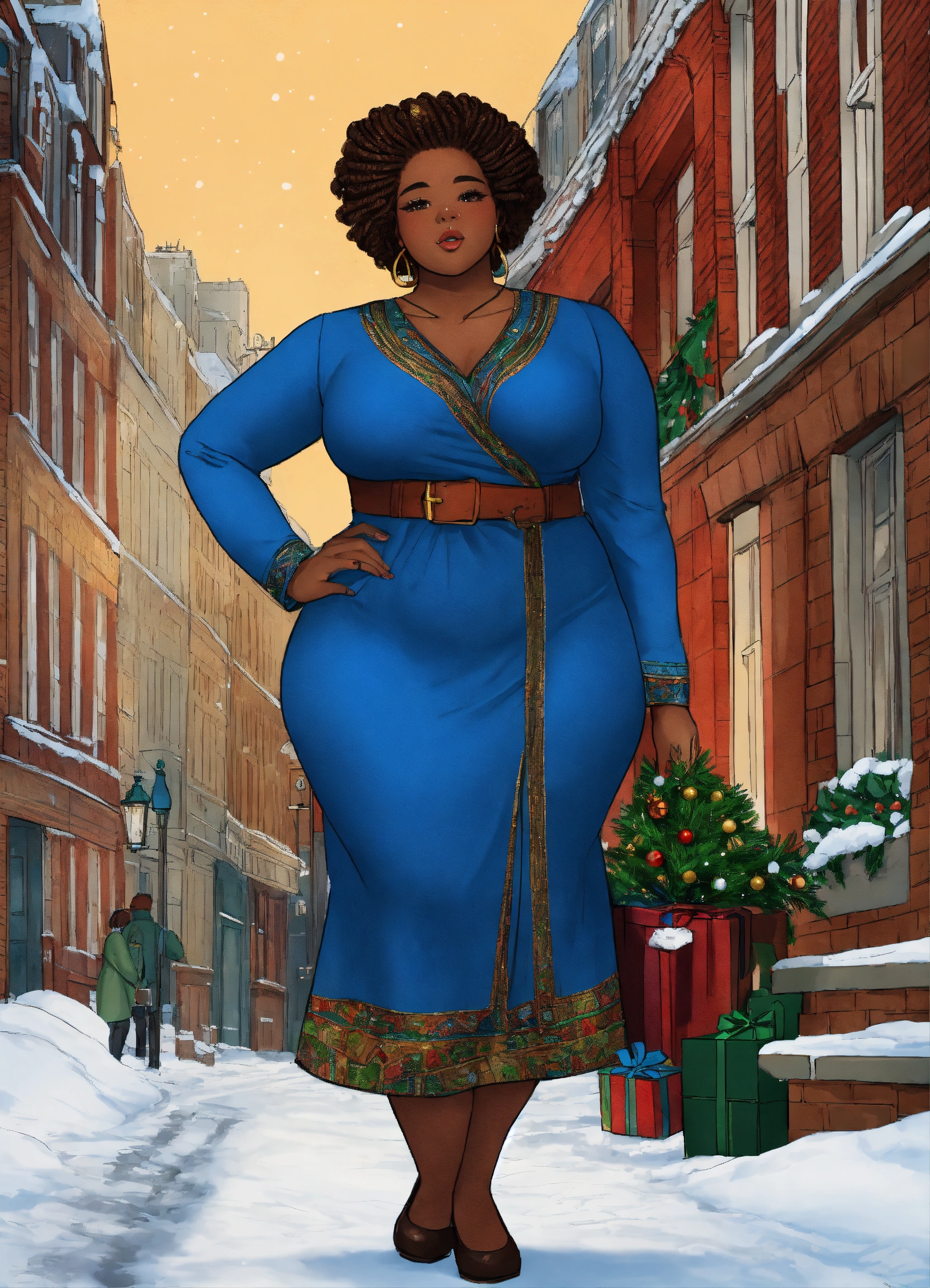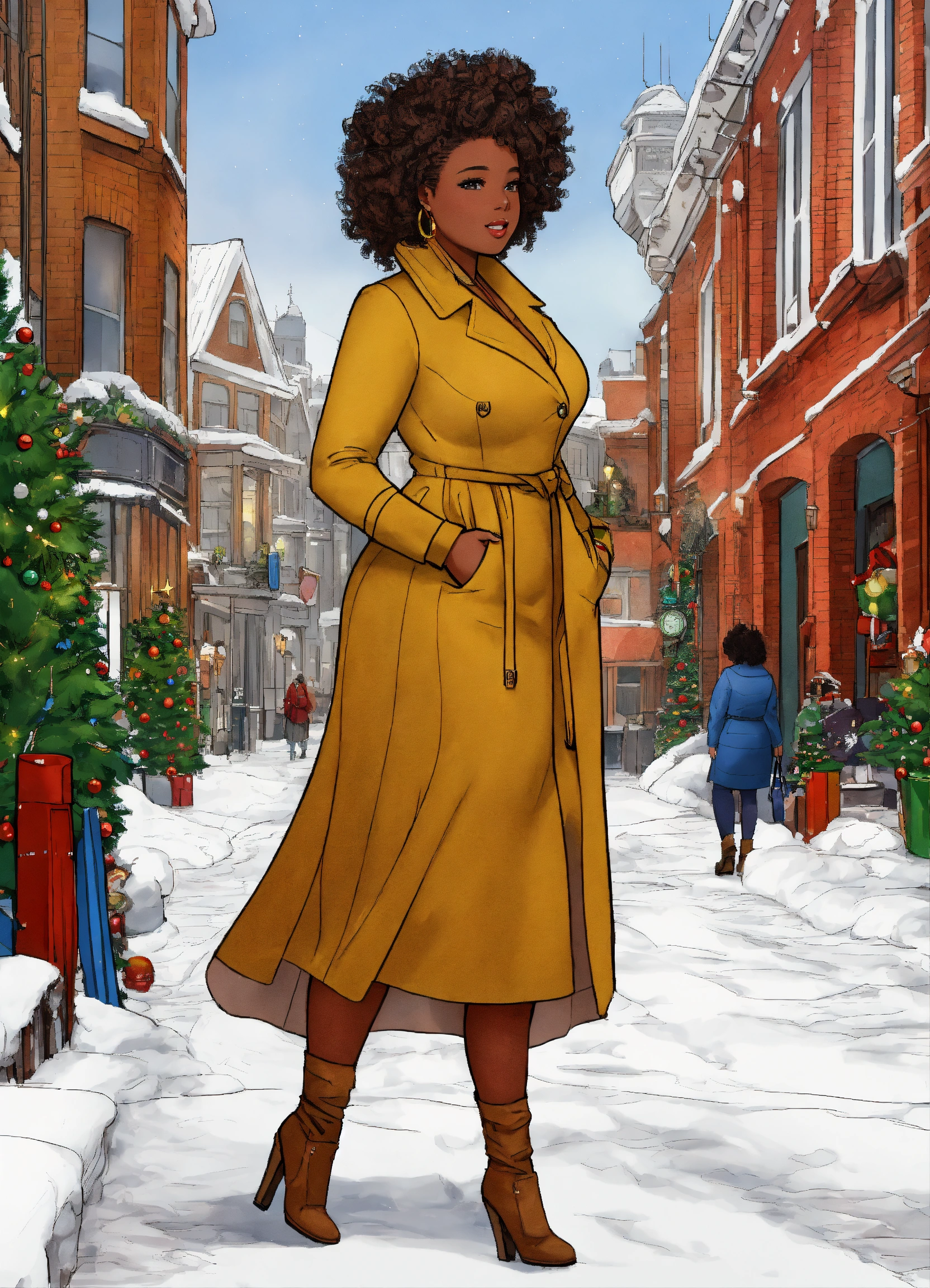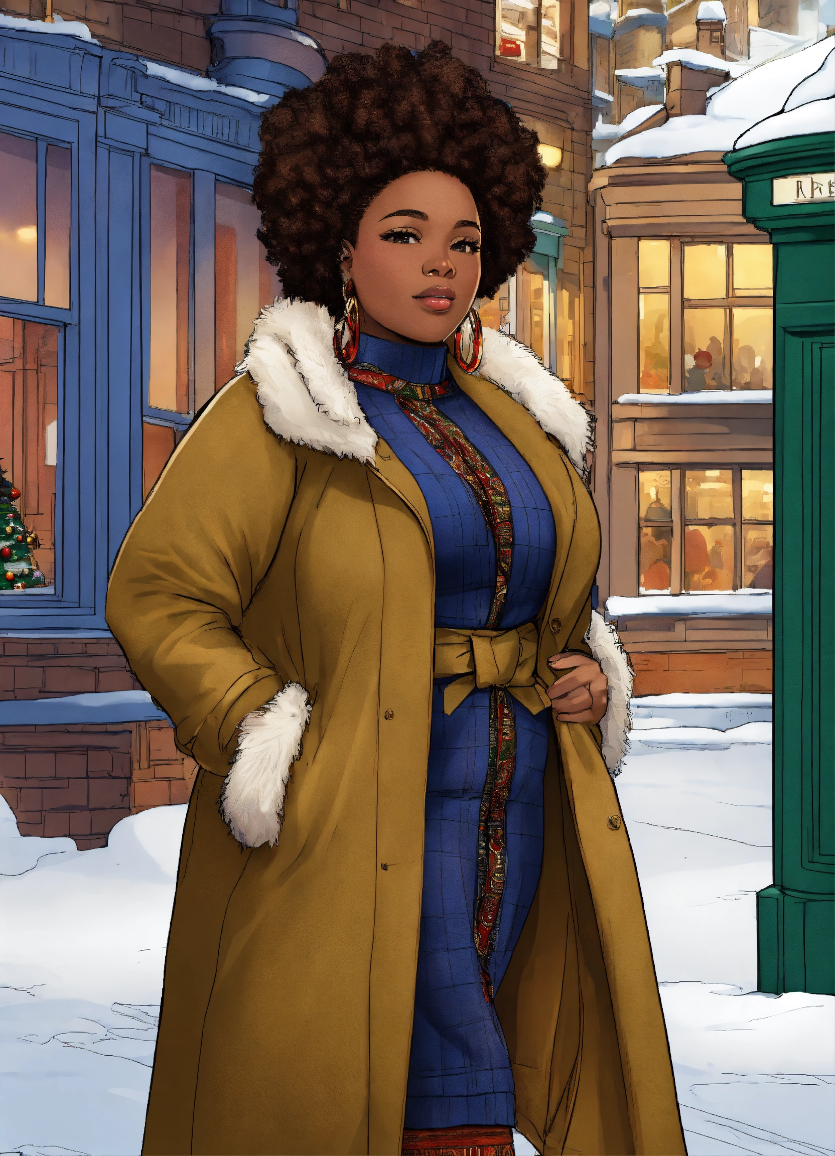 African american west african features fully clothed well proportioned full figured woman, realistic healthy glossy well defined loc’d hair texture, full body shot, london piccadilly winter christmas scene theme rule of thirds centered subject placement, storybook, cartoon, intricate detail line drawing, coloring book style