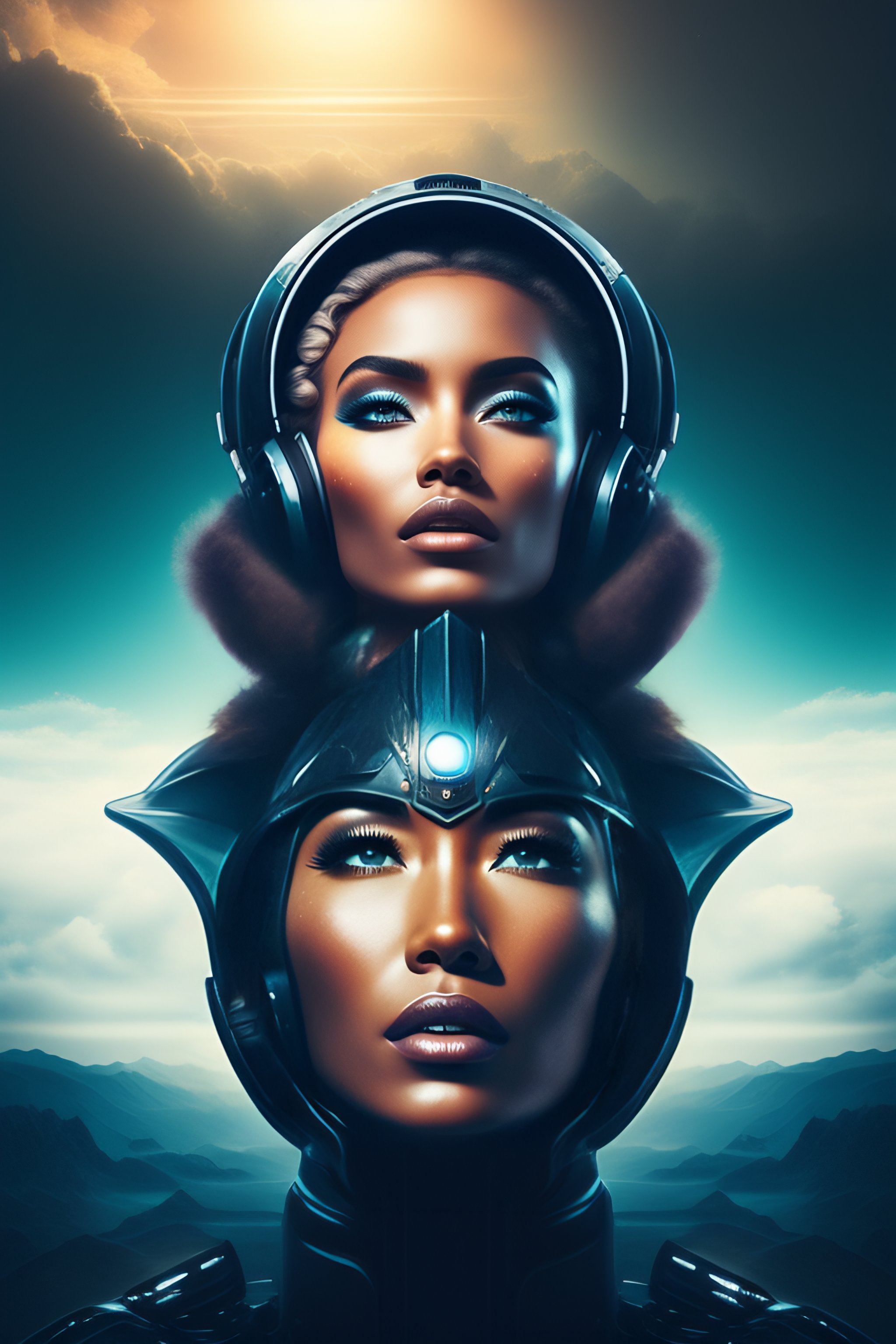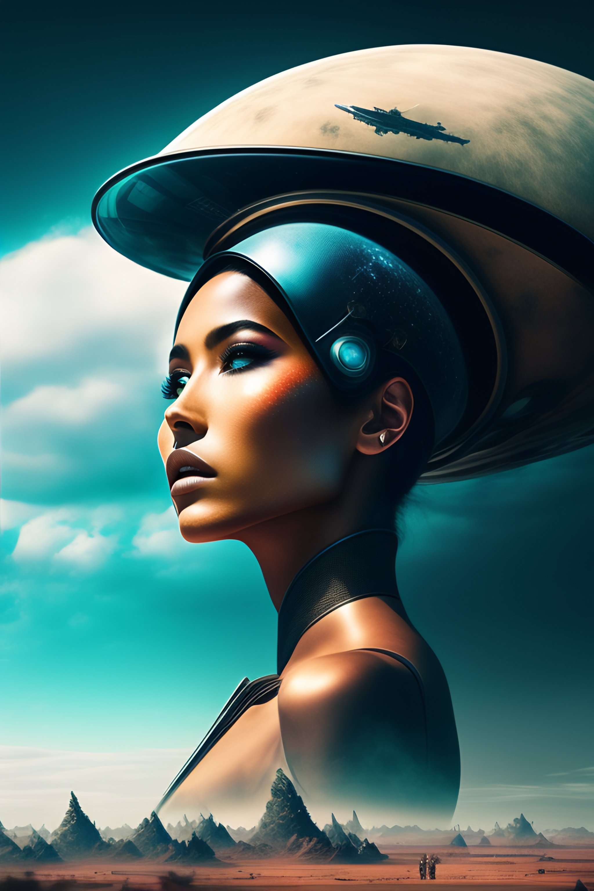Distopic future, alien space ship above the sky, earth as a pos-apocalyptic paradise, a half human half vulcan girl at the center o the image looking at the sky, cinematic