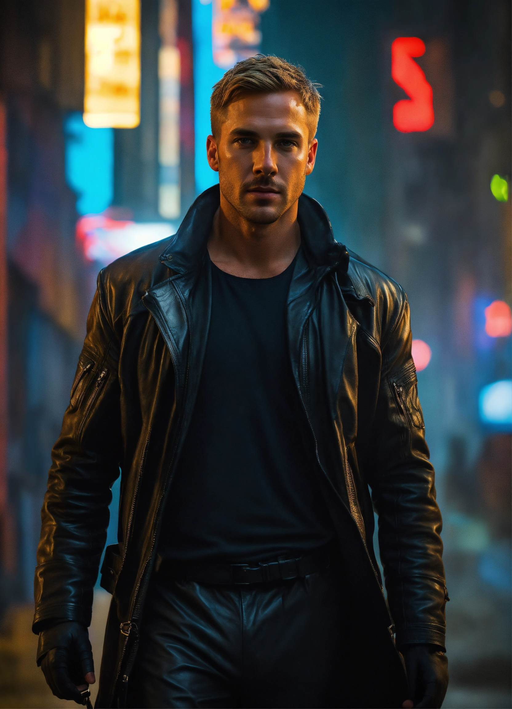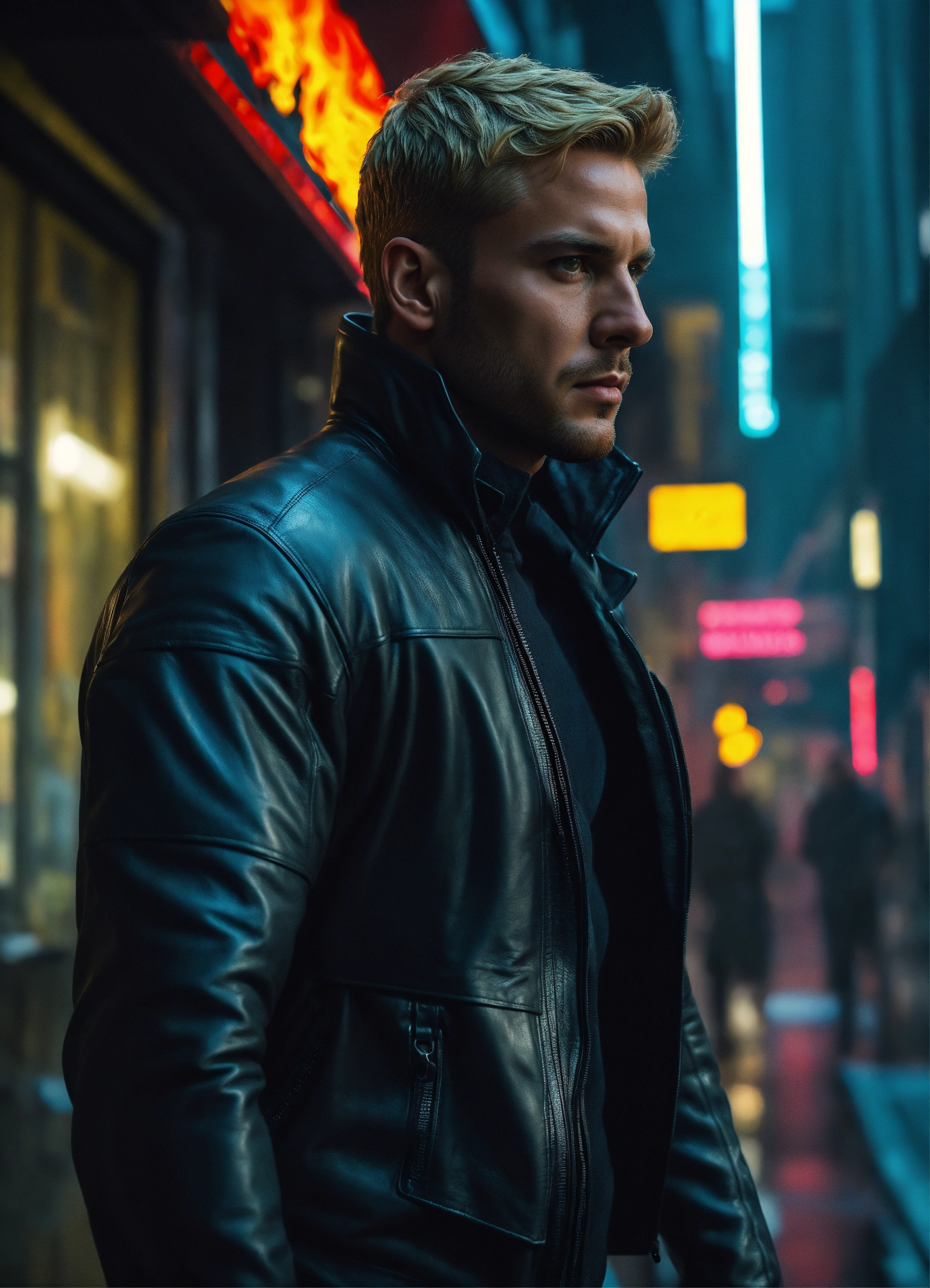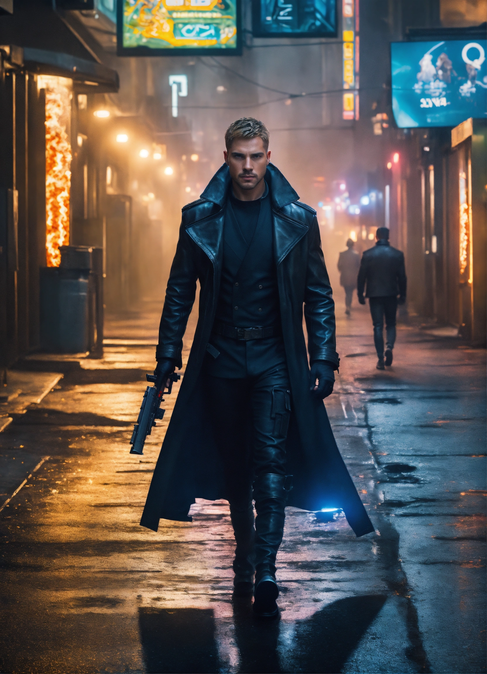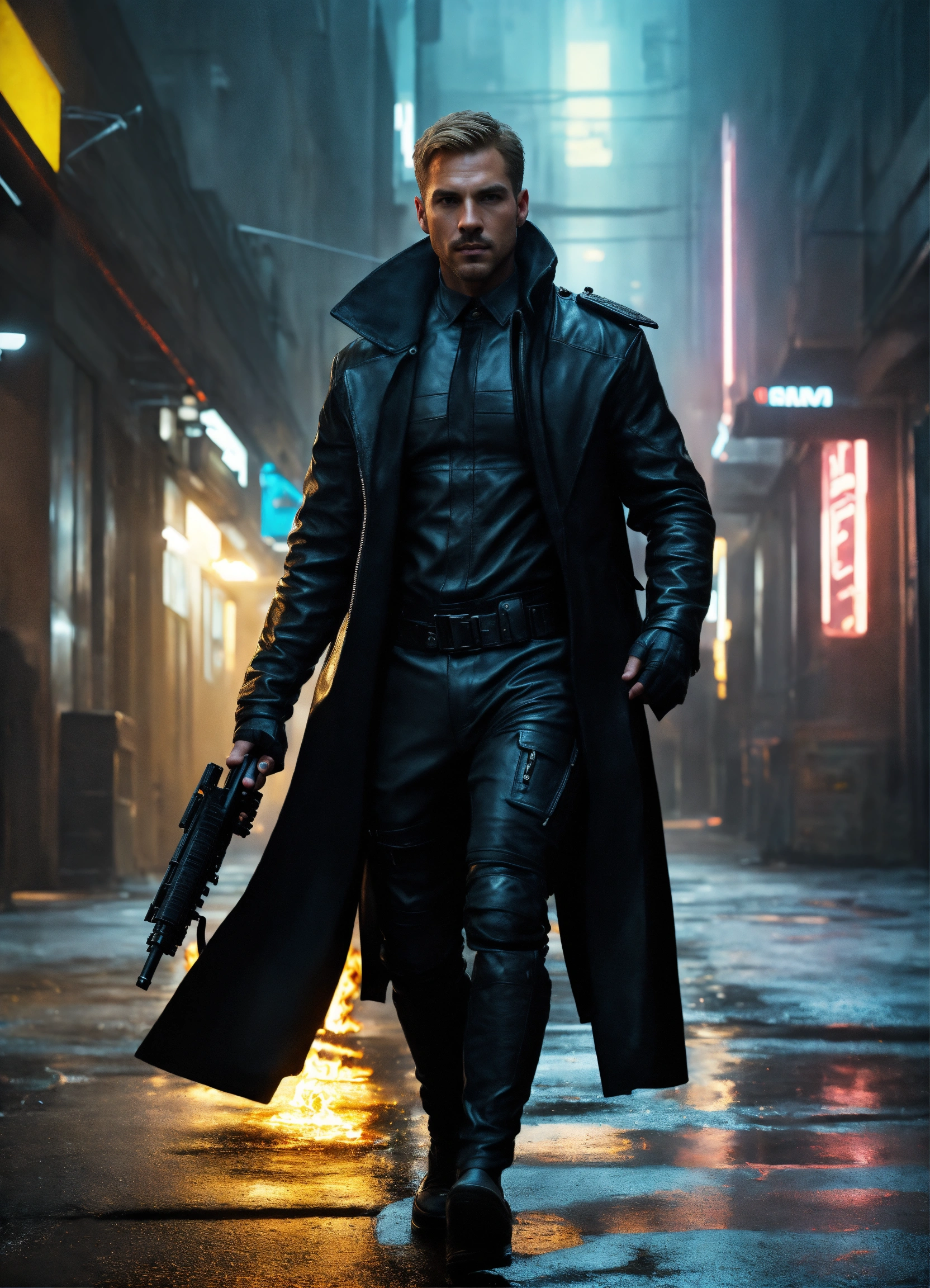 A handsome, athletic white male detective with short blonde hair and perfect action hero stubble, a sarcastic monster hunter, handsome face, a athletic man, wearing a long black leather jacket and black and a black super spy stealth suit, walking in a dark alley of a futurist blade runner 2049 city, fully covered, + fire powers, full body shot editorial + photorealistic oil painting + photorealism + 4k, 8k, hdr, hr --v 4