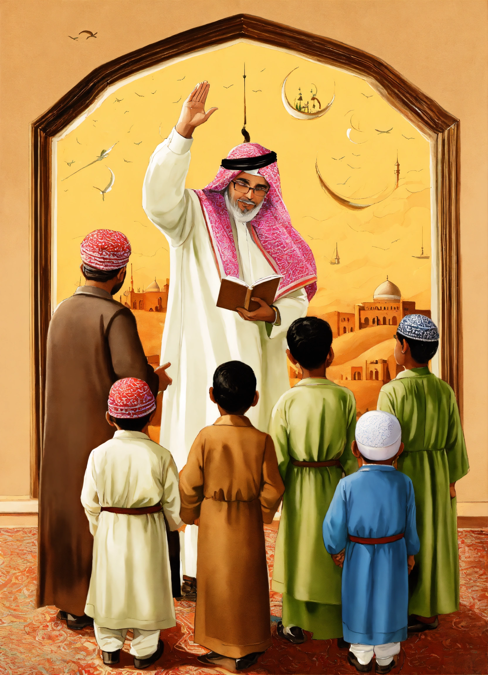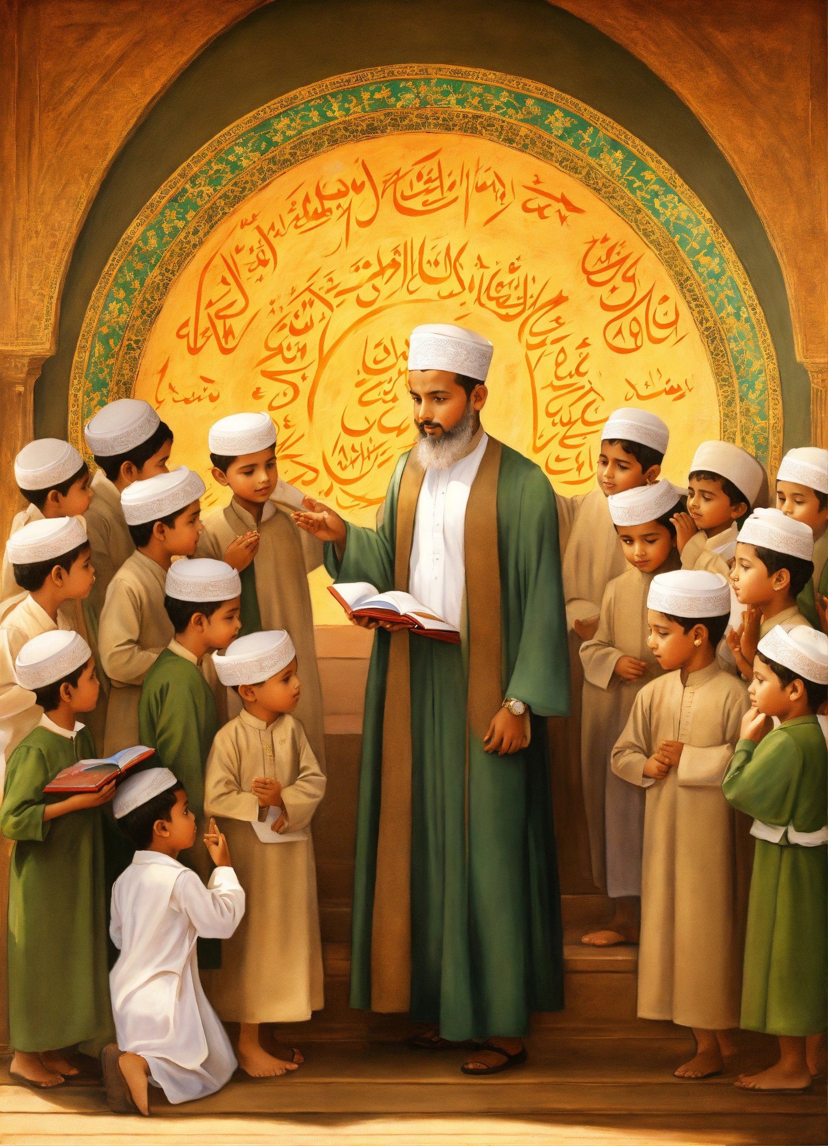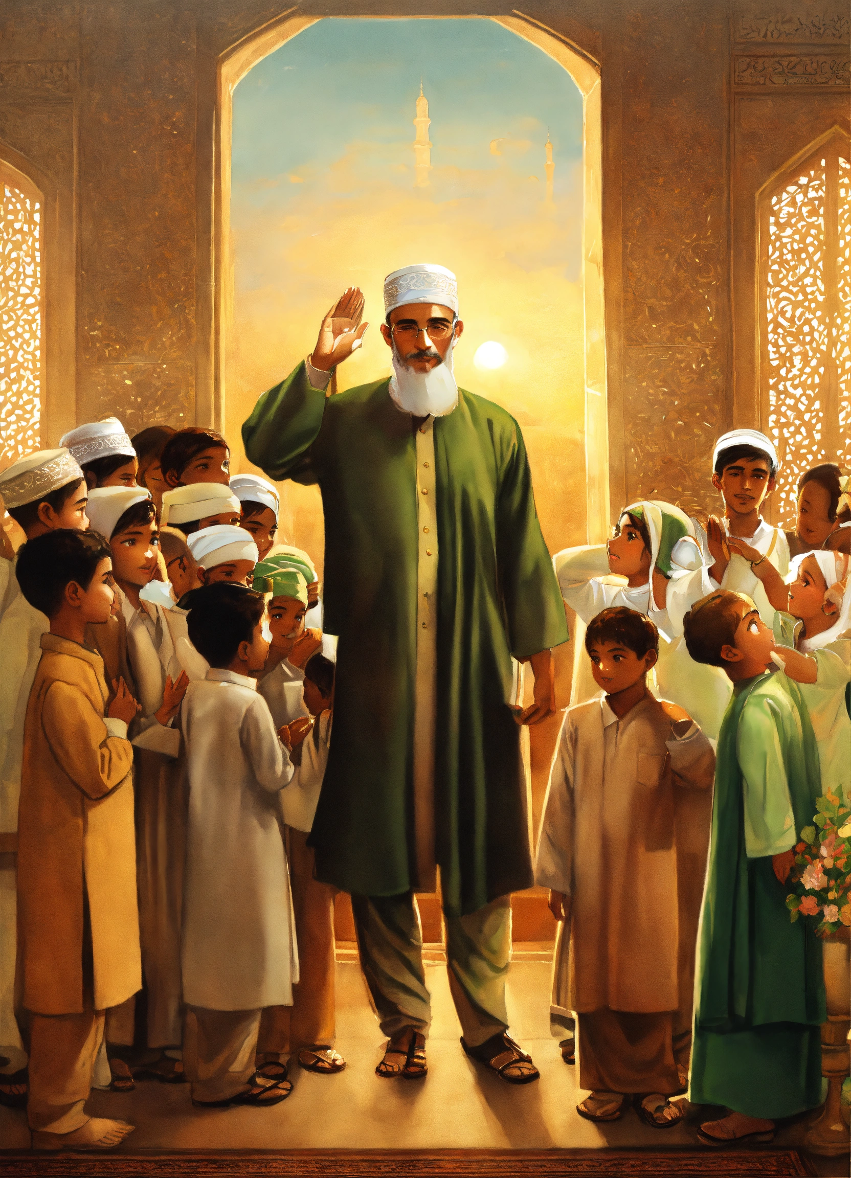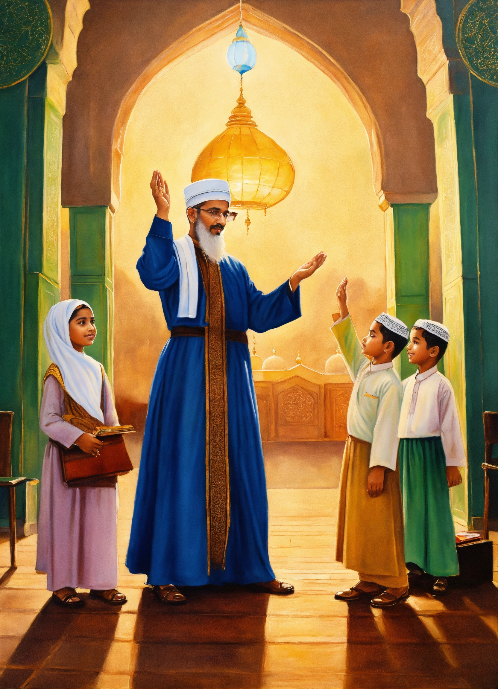 A painting depicting a great muslim teacher and children saluting on teacher's day