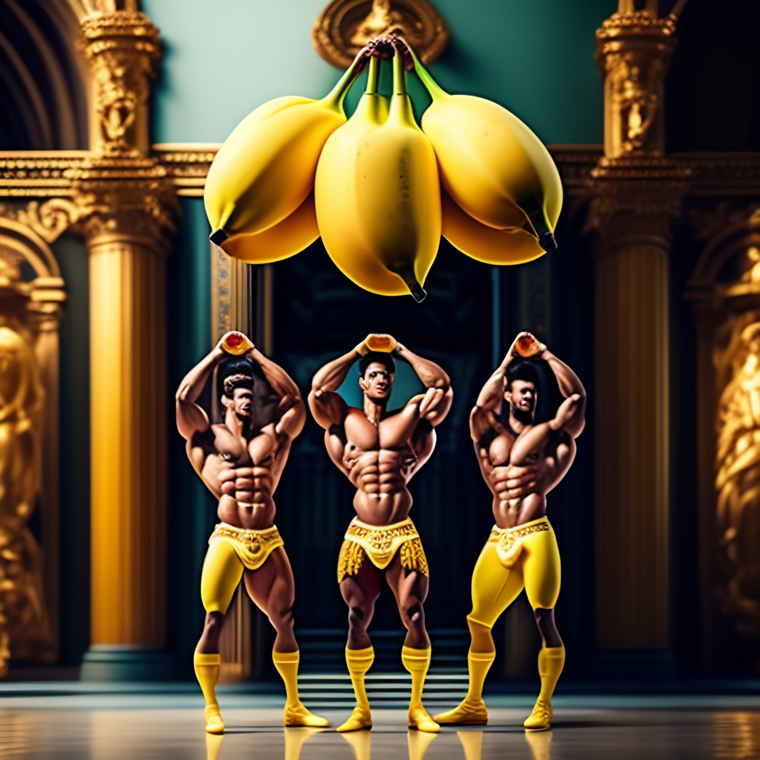 Muscular men dressed as bananas sitting in a splendid cathedral dedicated to the worship of bananas