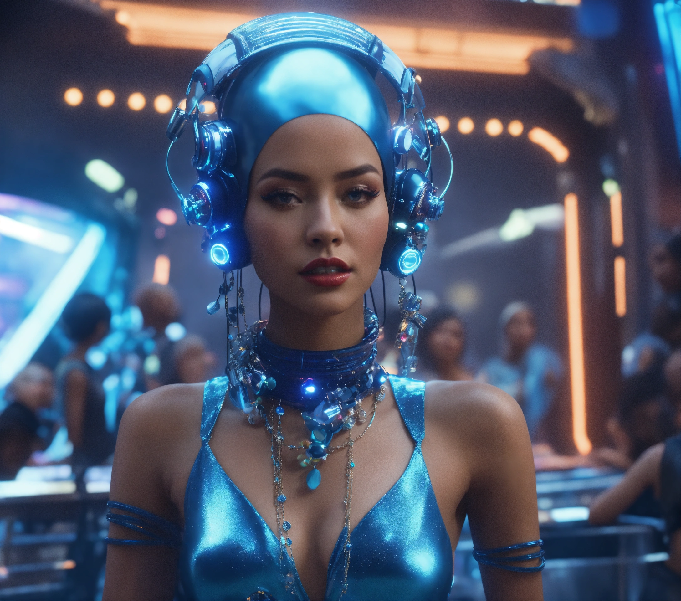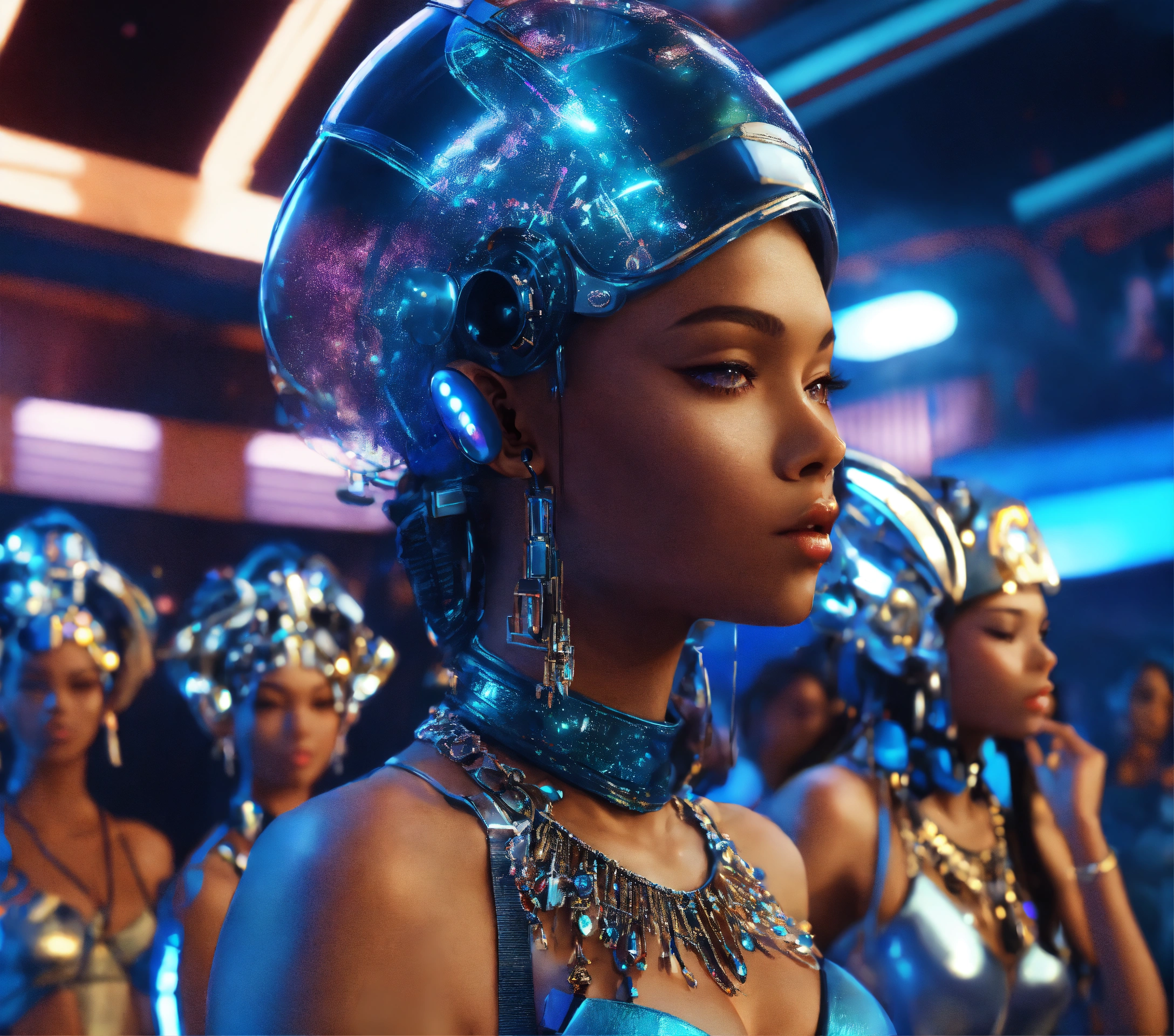 Zoom out from a beautiful enchanting charismatic blue alien girls wearing space fashion with alot of jewelry with beautiful women in funky futuristic royal attire dance and socialize at a packed jazz concert on a spaceport, realistic, futuristic, sci fi, 8k, unreal engine, pixar