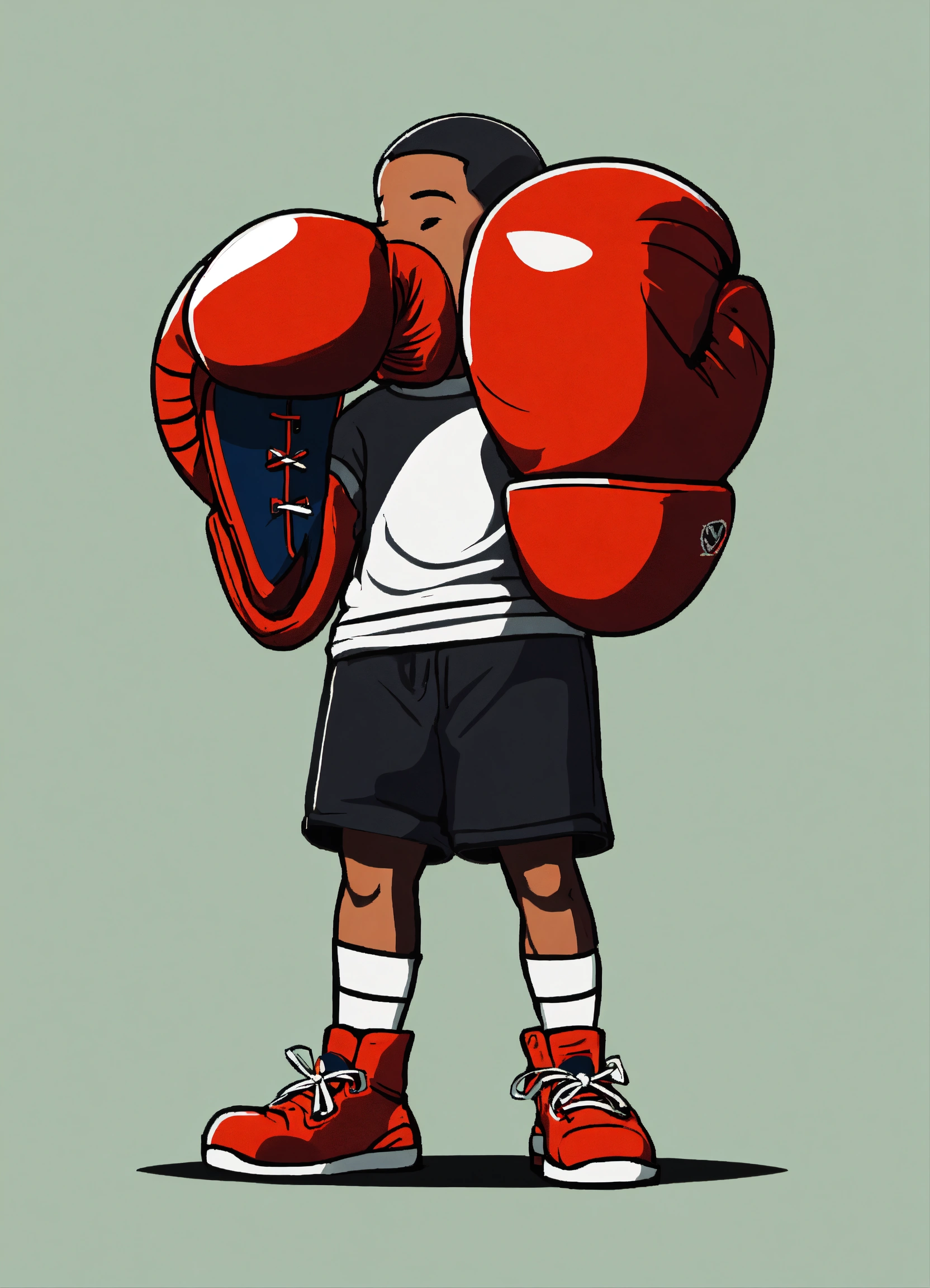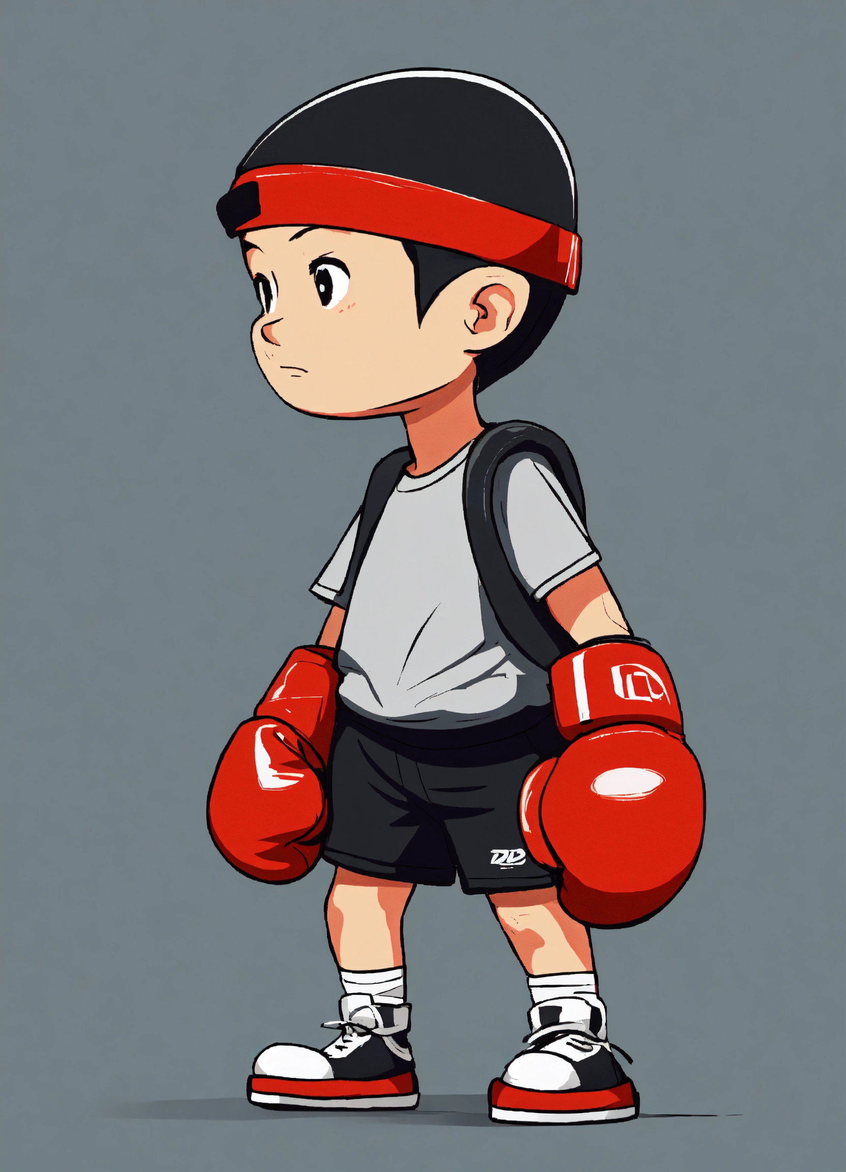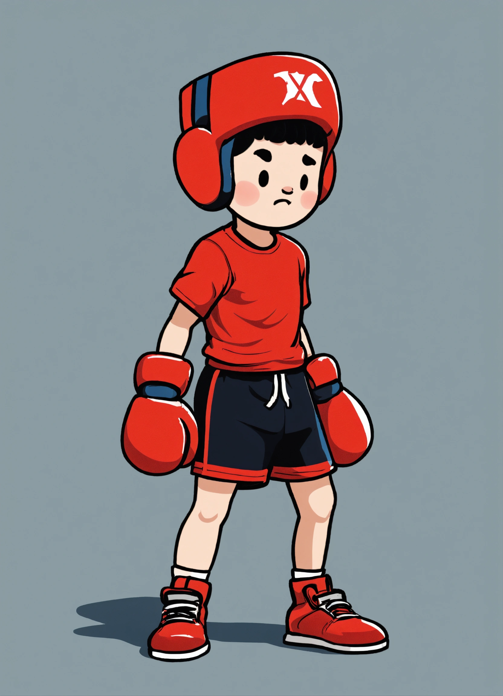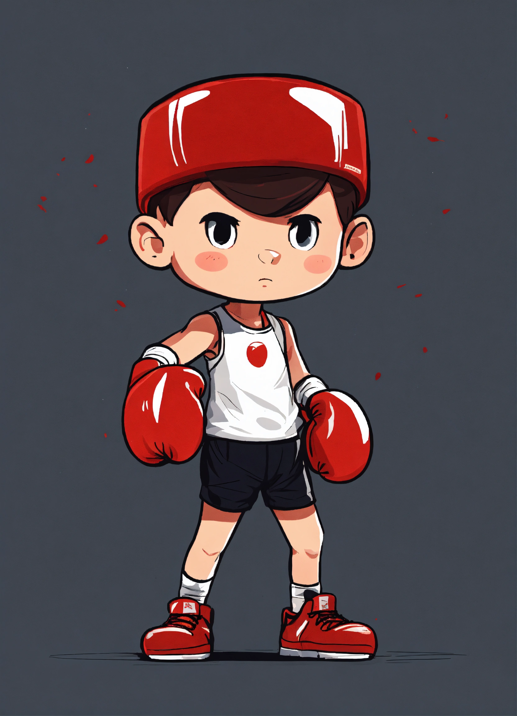 Short cartoon kid wearing red shoes, logo, minimalistic, simple, with boxing gloves on, 2d, looking forward, hands down on his side, black shorts, no background