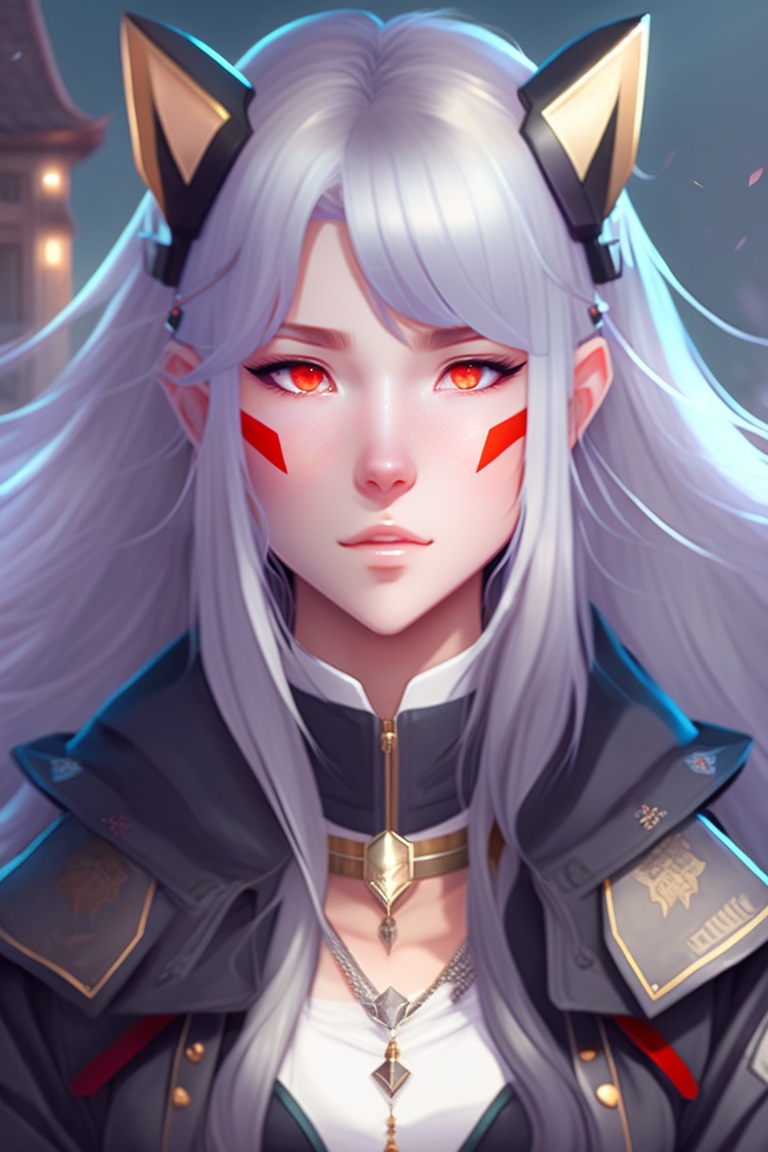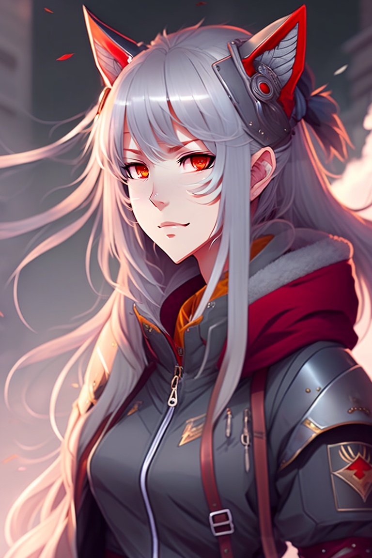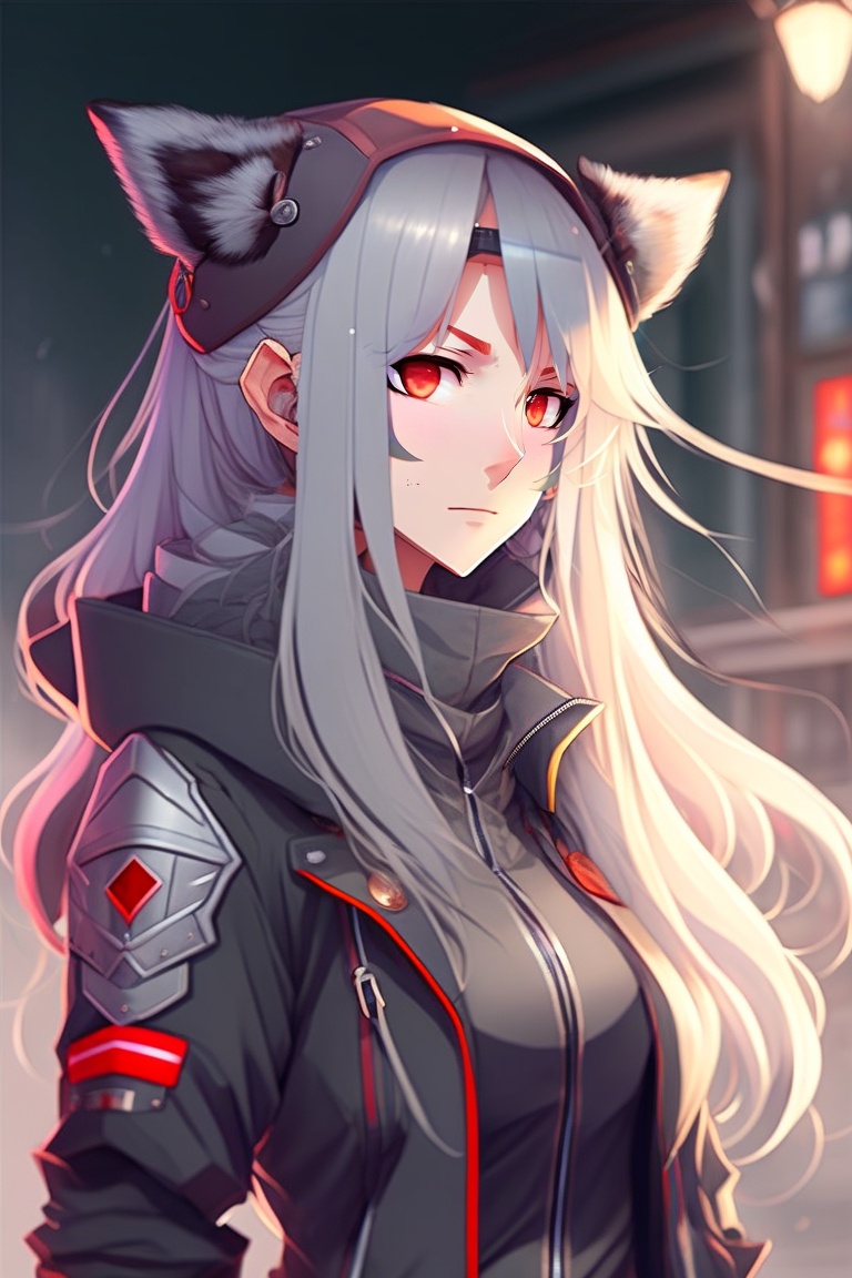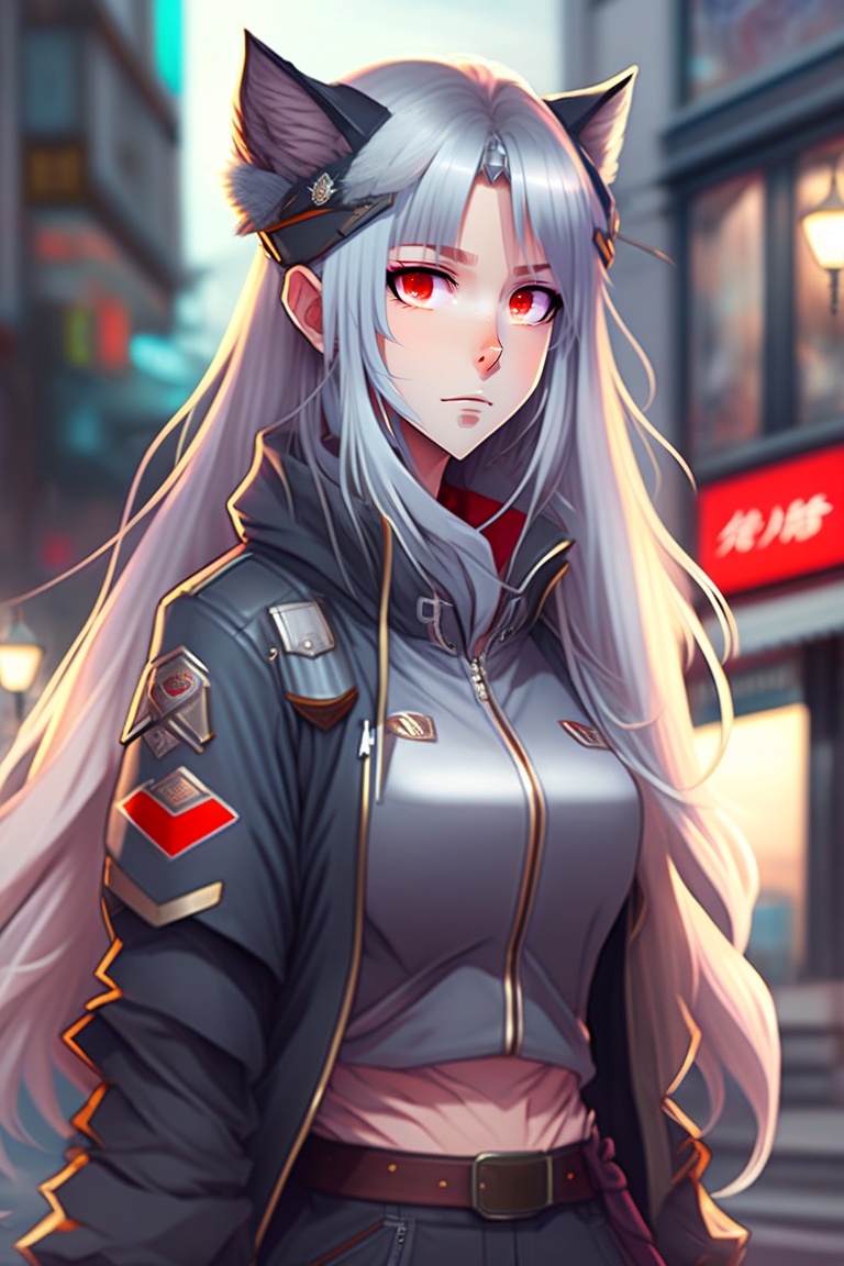 Anime, a girl with red eyes and long grey hair, red lips, dressed in casual street clothes, looking serious, wolf ears, ninja tools