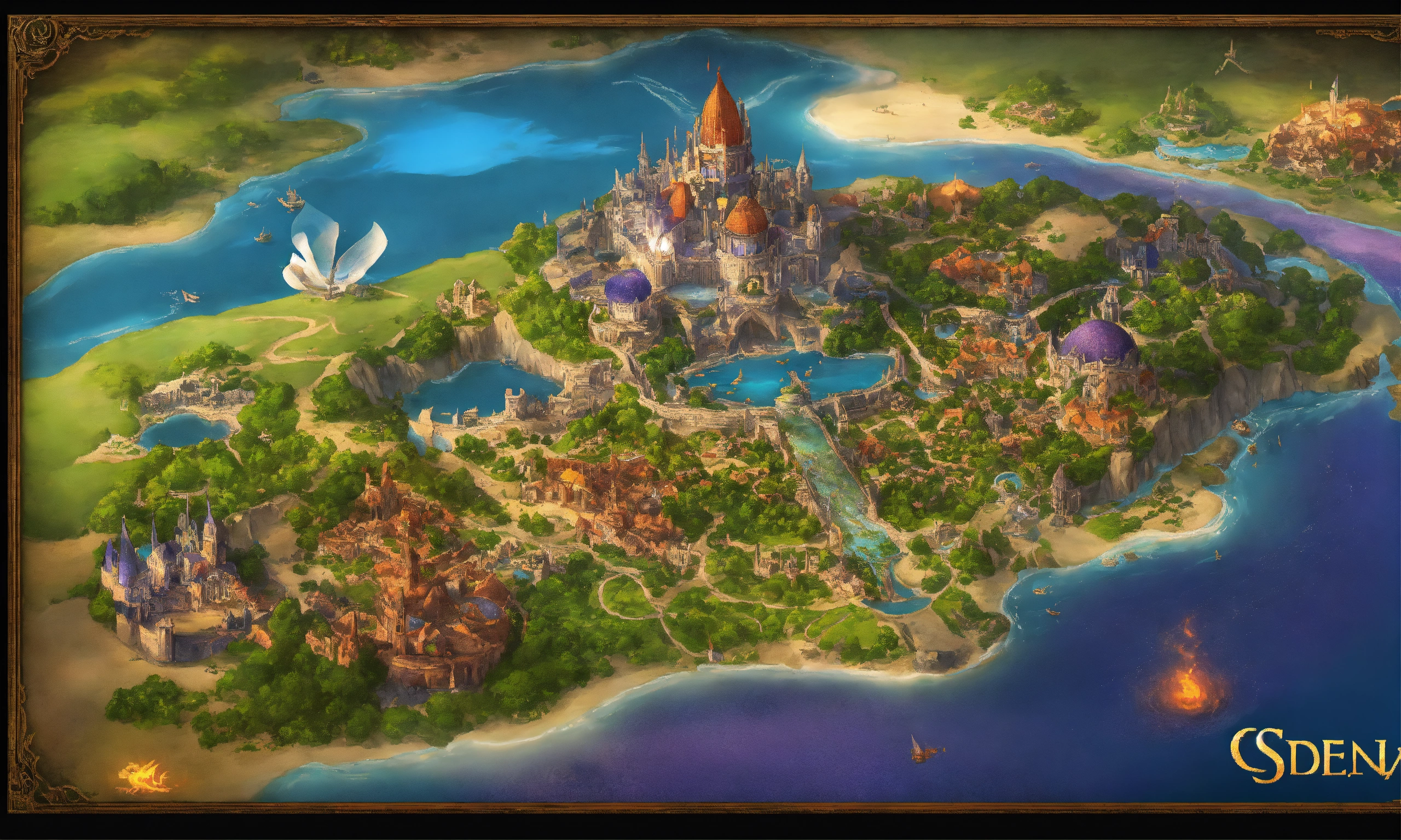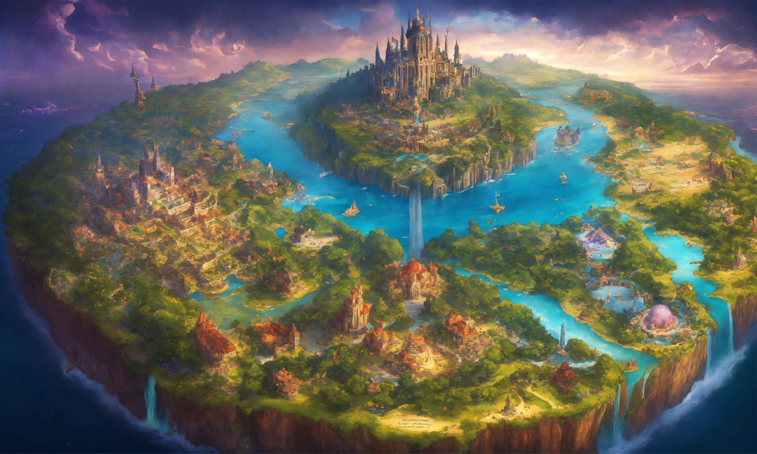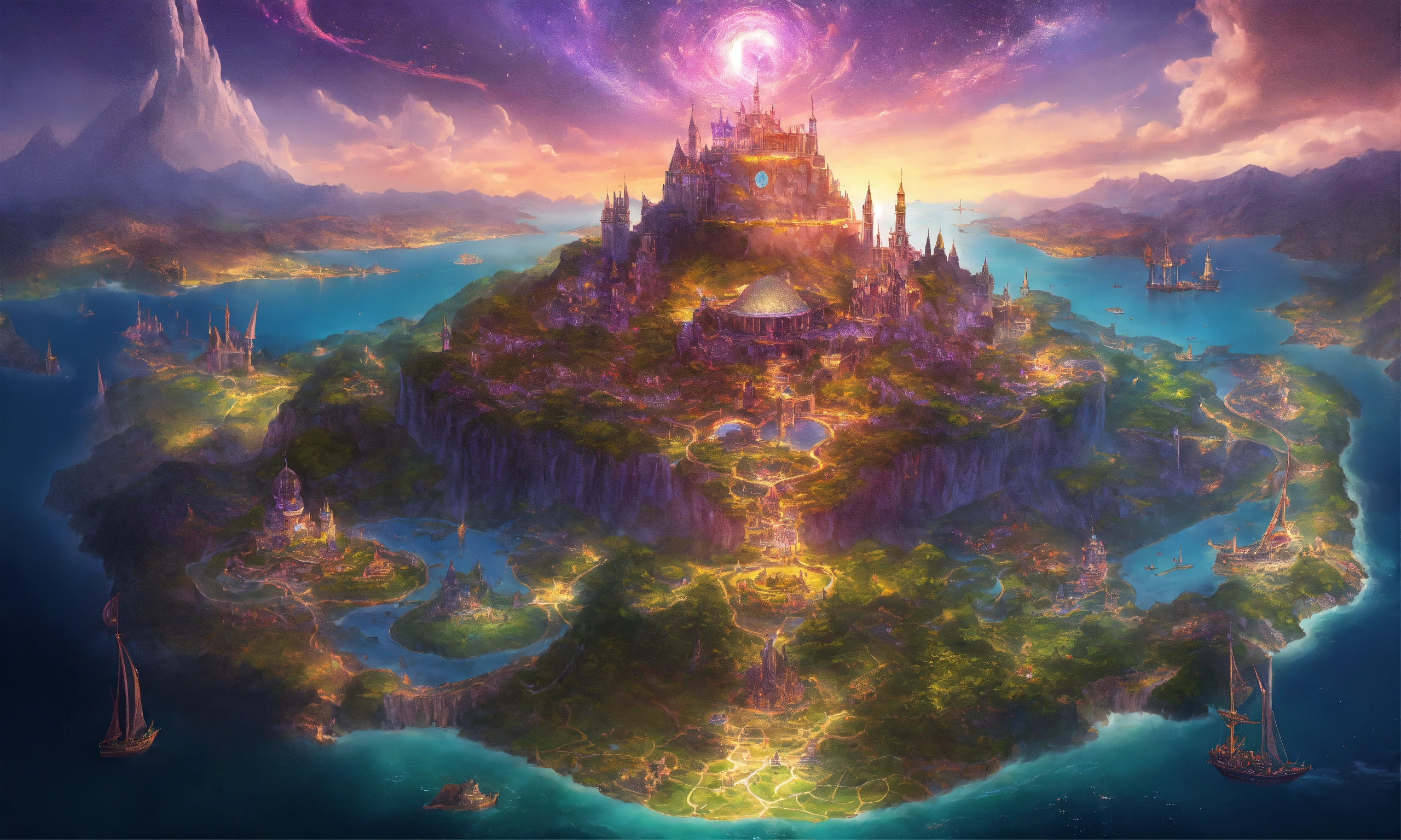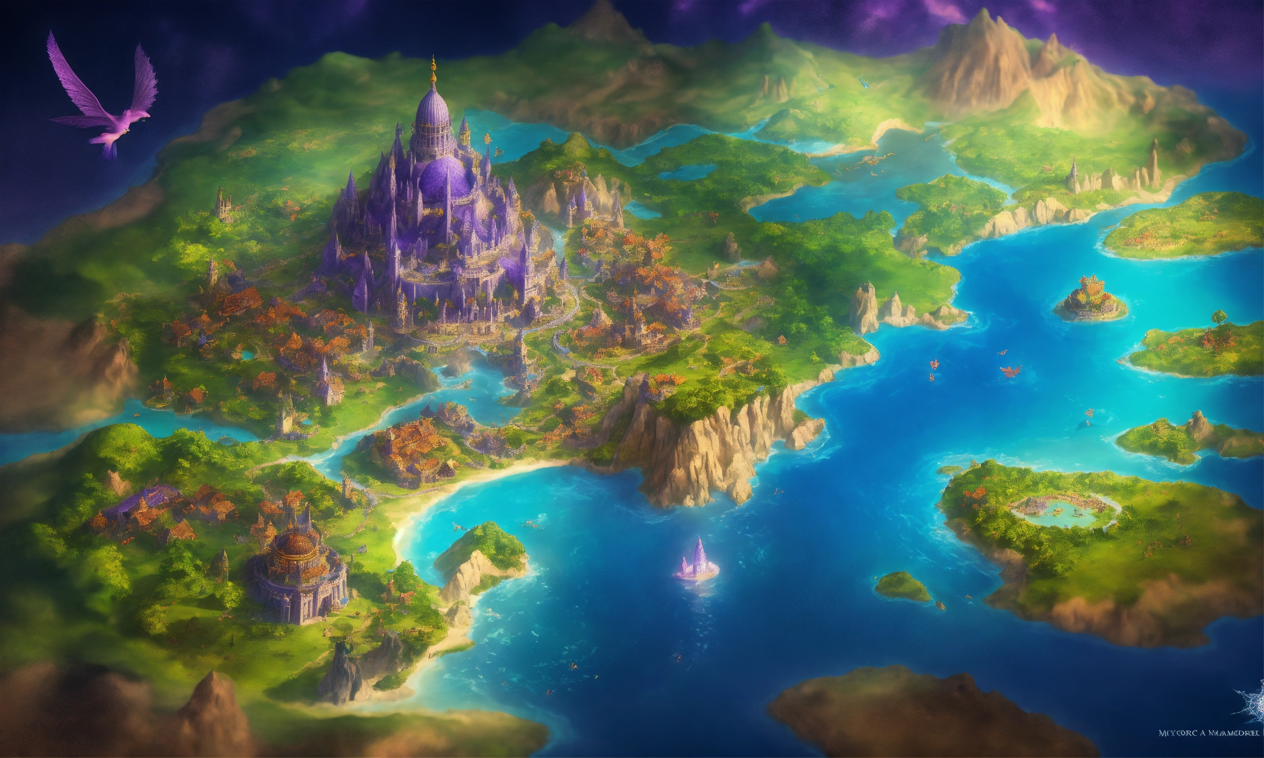 Fantasy map of a magical world called eden, with 9 kingdoms, with one kingdom called rosalithia being in the middle of a large body of water on a large island as the capitol of the entire realm. with a fairy kingdom called solaria, a mermaid underwater kingdom called atlantis, a kingdom called lemuria, a kingdom called camelot, a kingdom called auros, a kingdom called mythondew, and the kingdom of demons and shadows the undermoore. purple oceans, important landmarks, very detailed