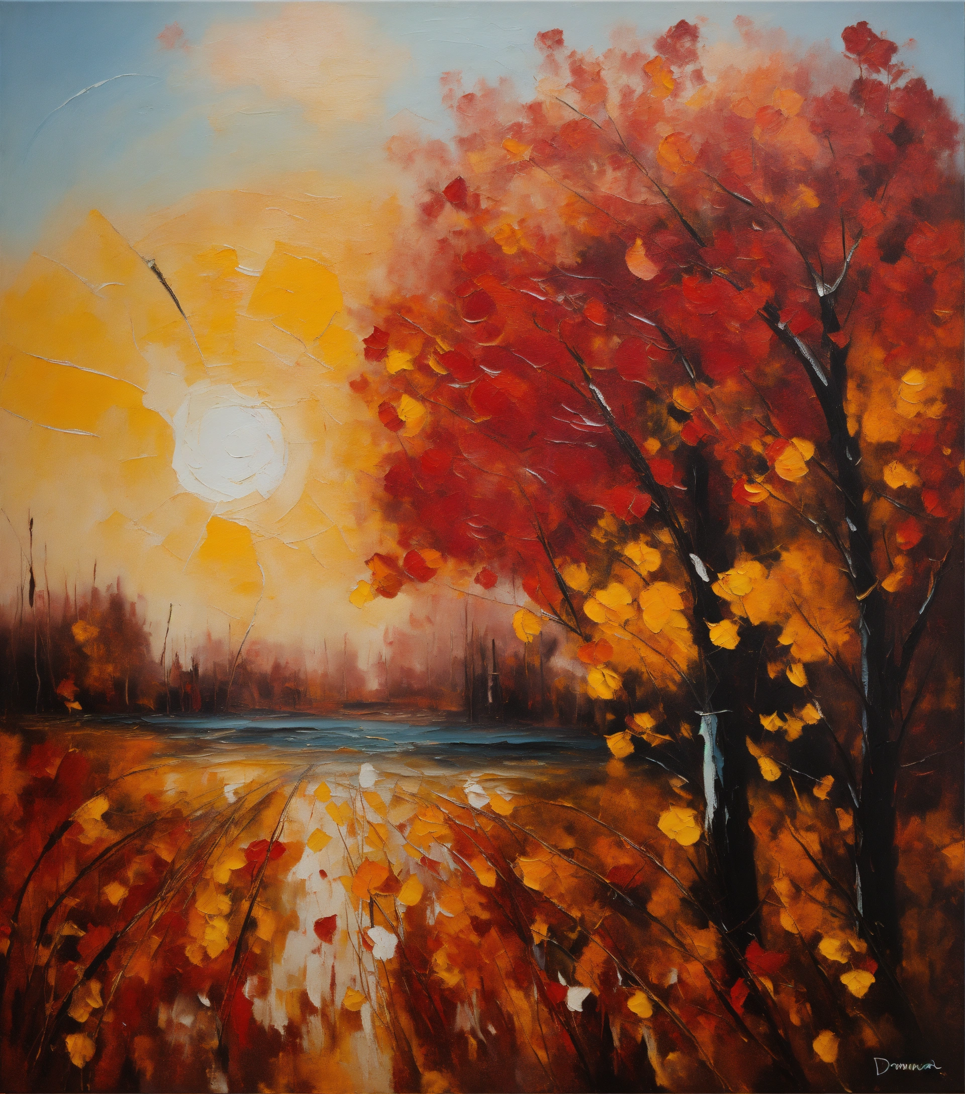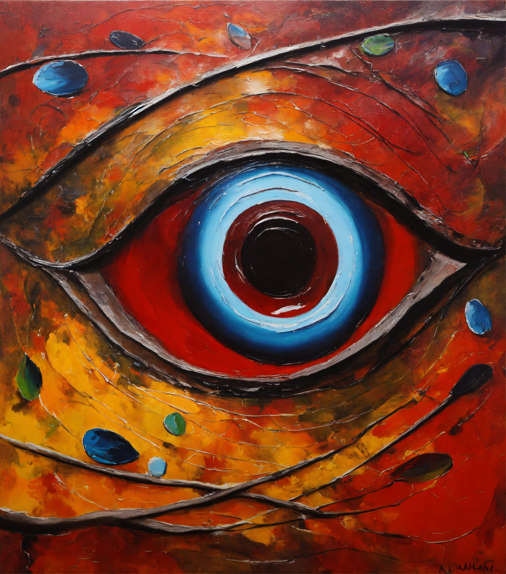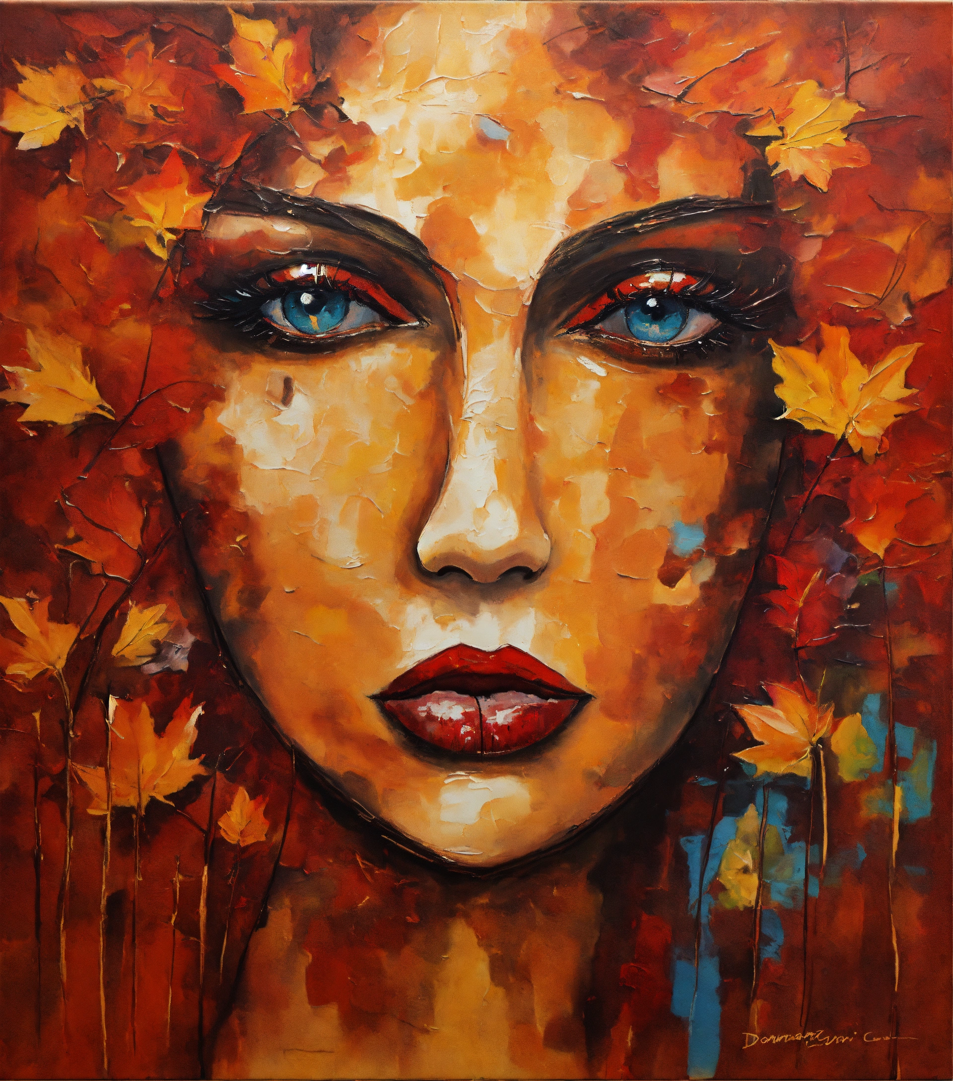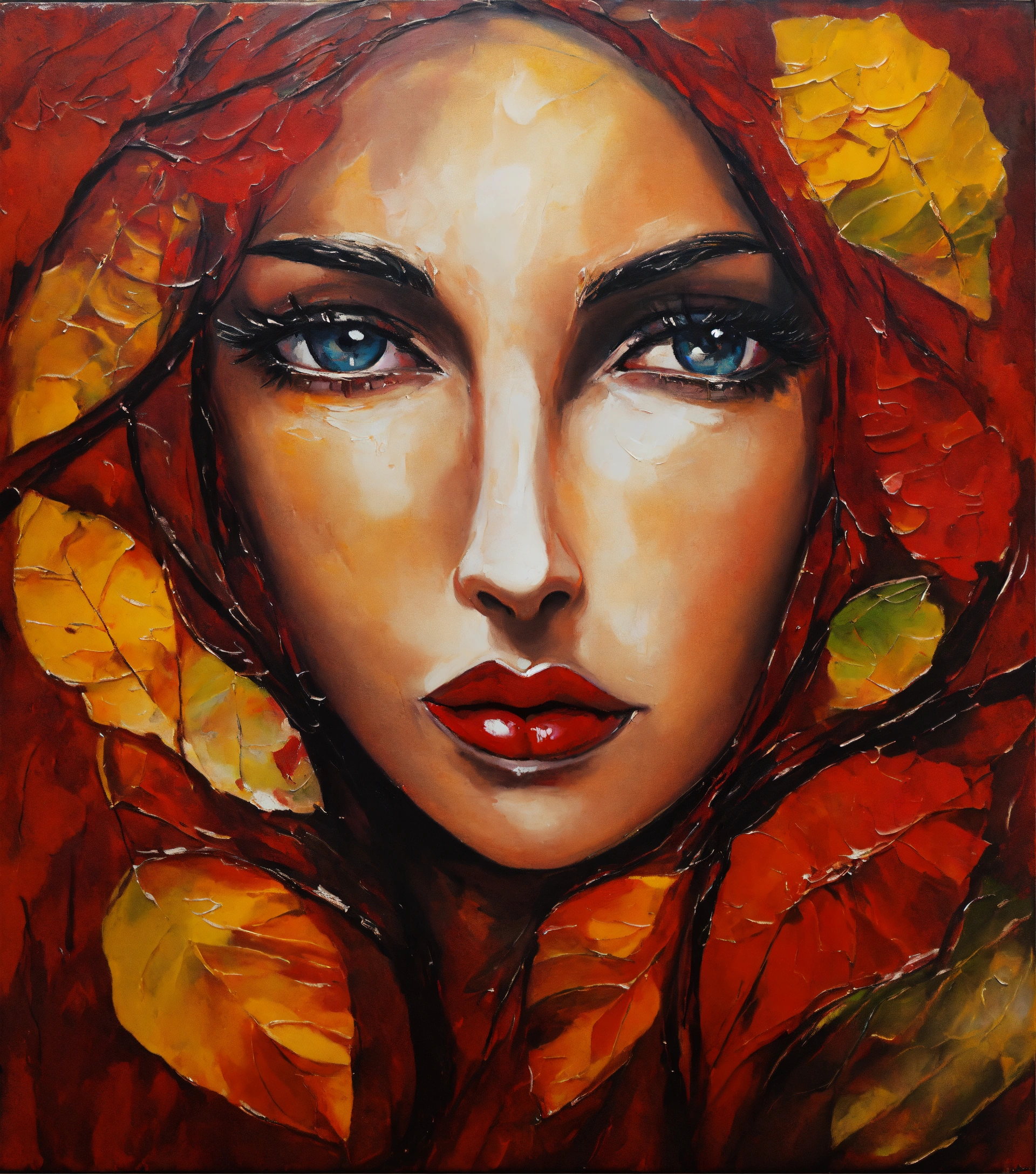 Abstract oil painting donna matura con grandi occhi neri in autunno rosso