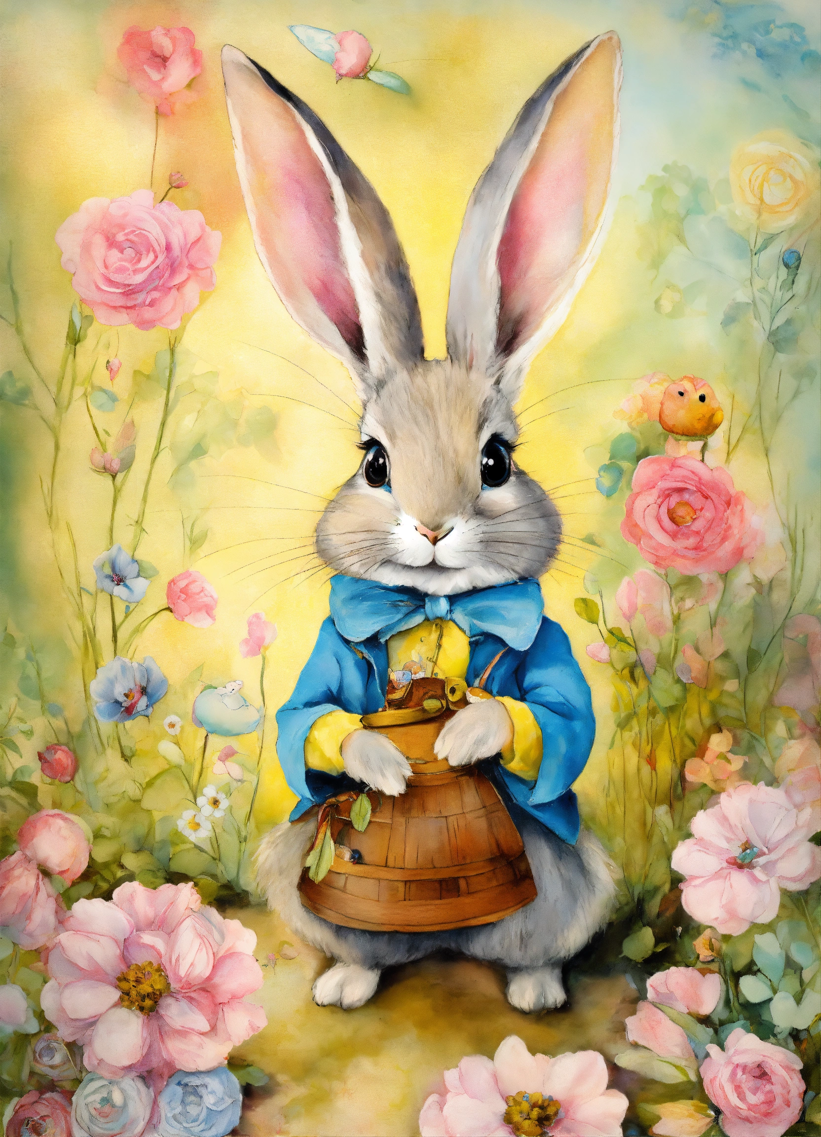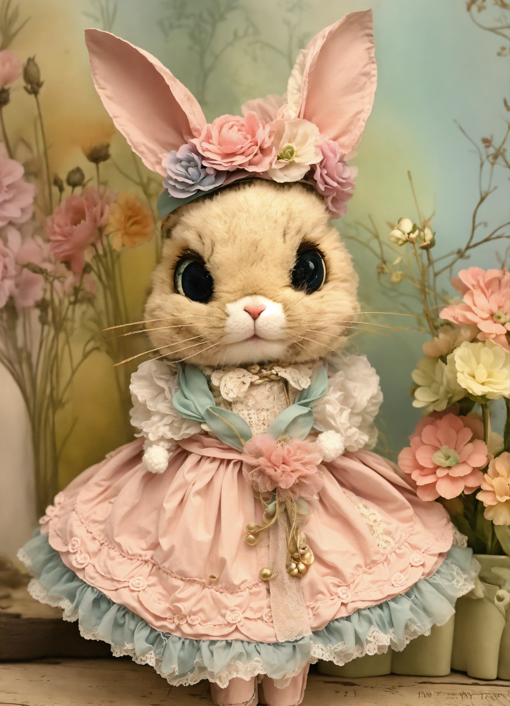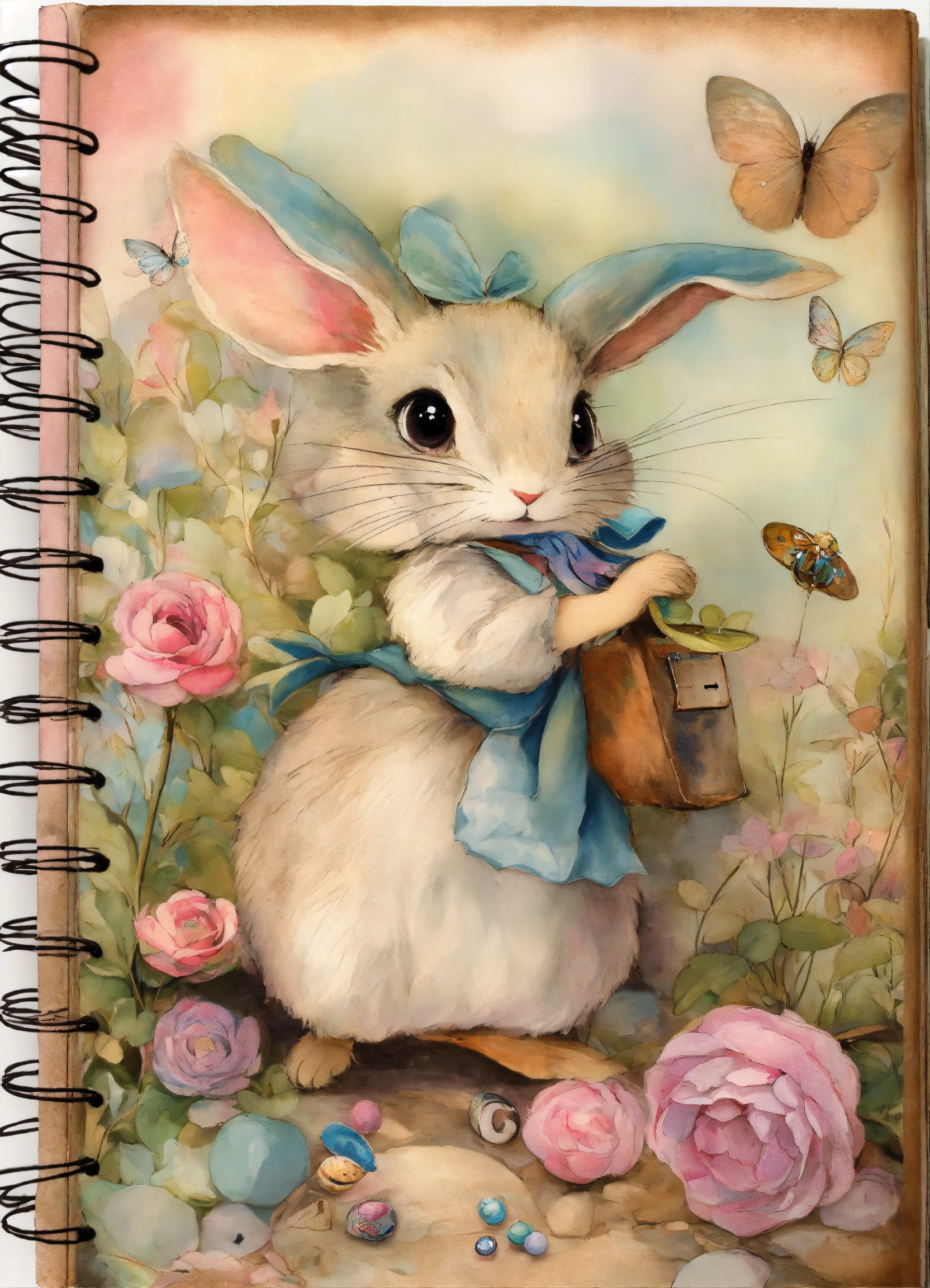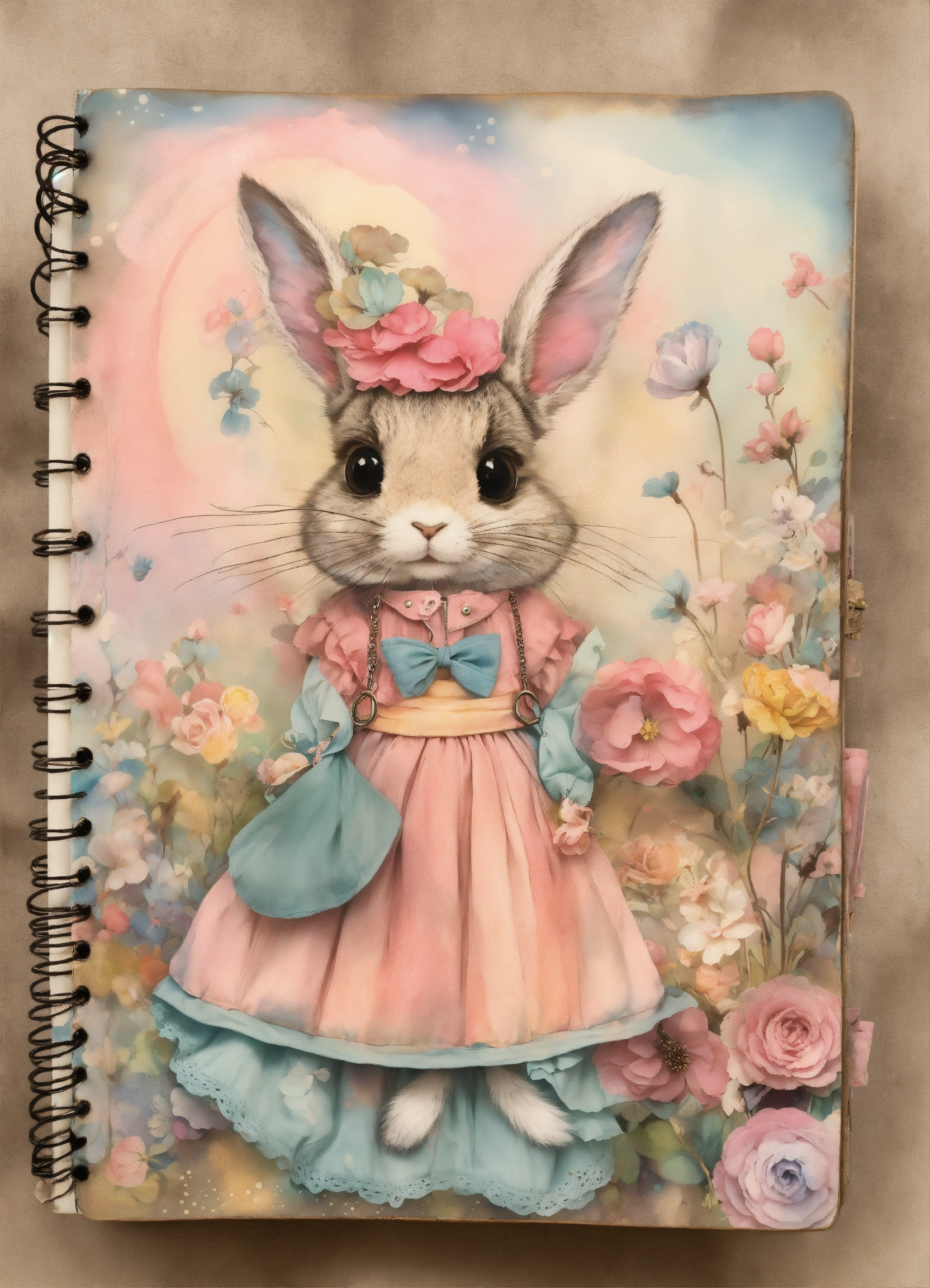 Shabby chic dreamy mist pastel junk journals whimsical cute quirky beatrix potter style "cotton-tail" with big eyes in odd clothings, tamara laporte style, swirling magical fairytale abstract art style