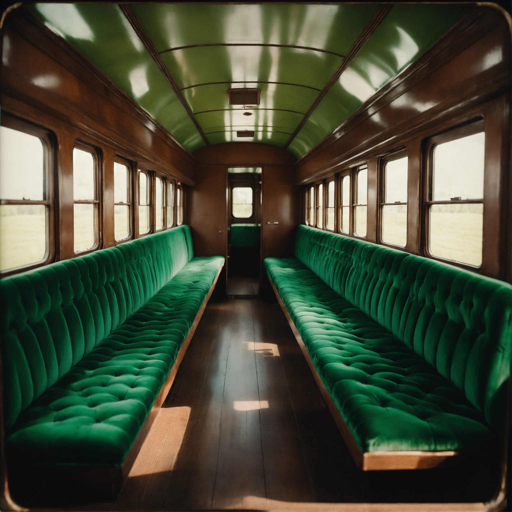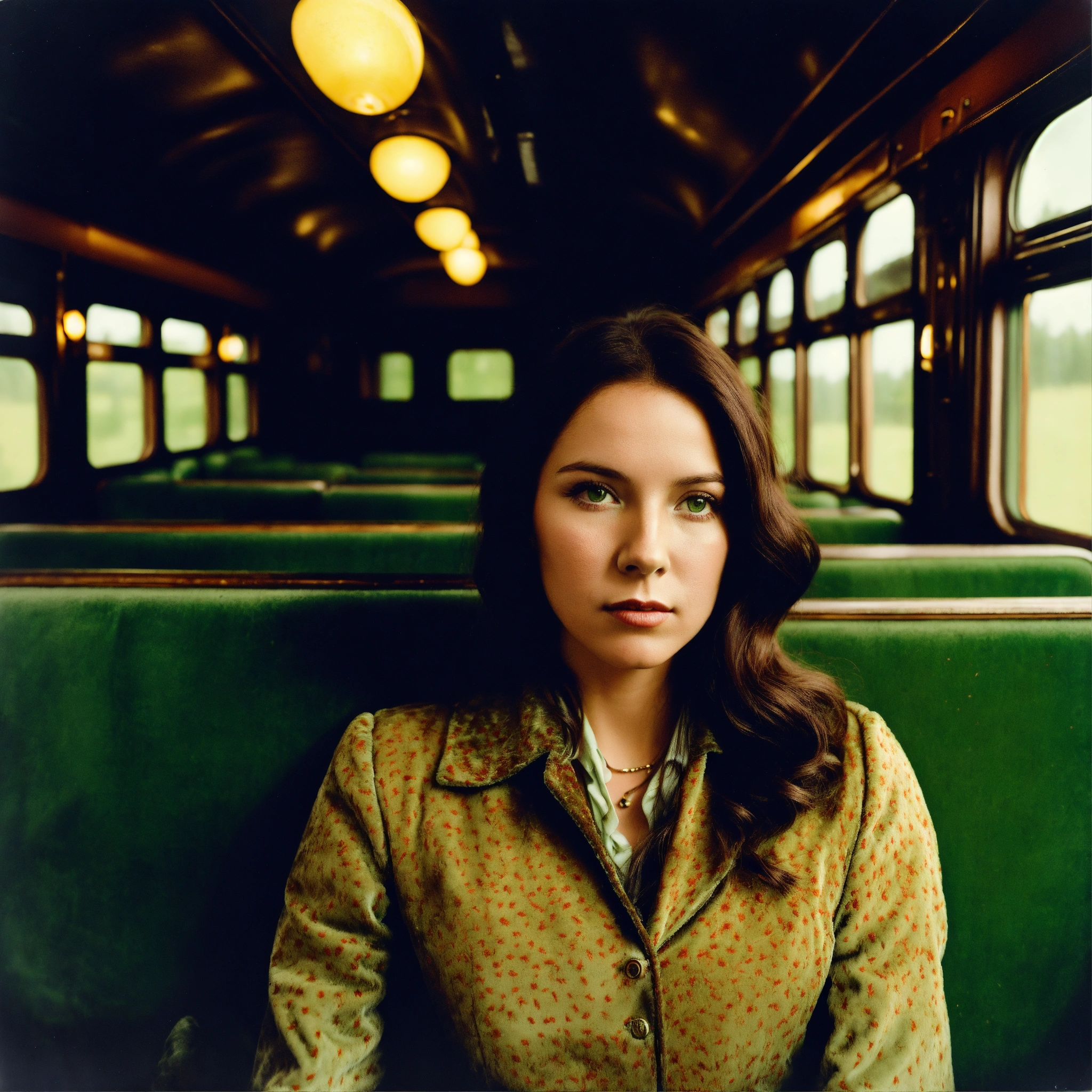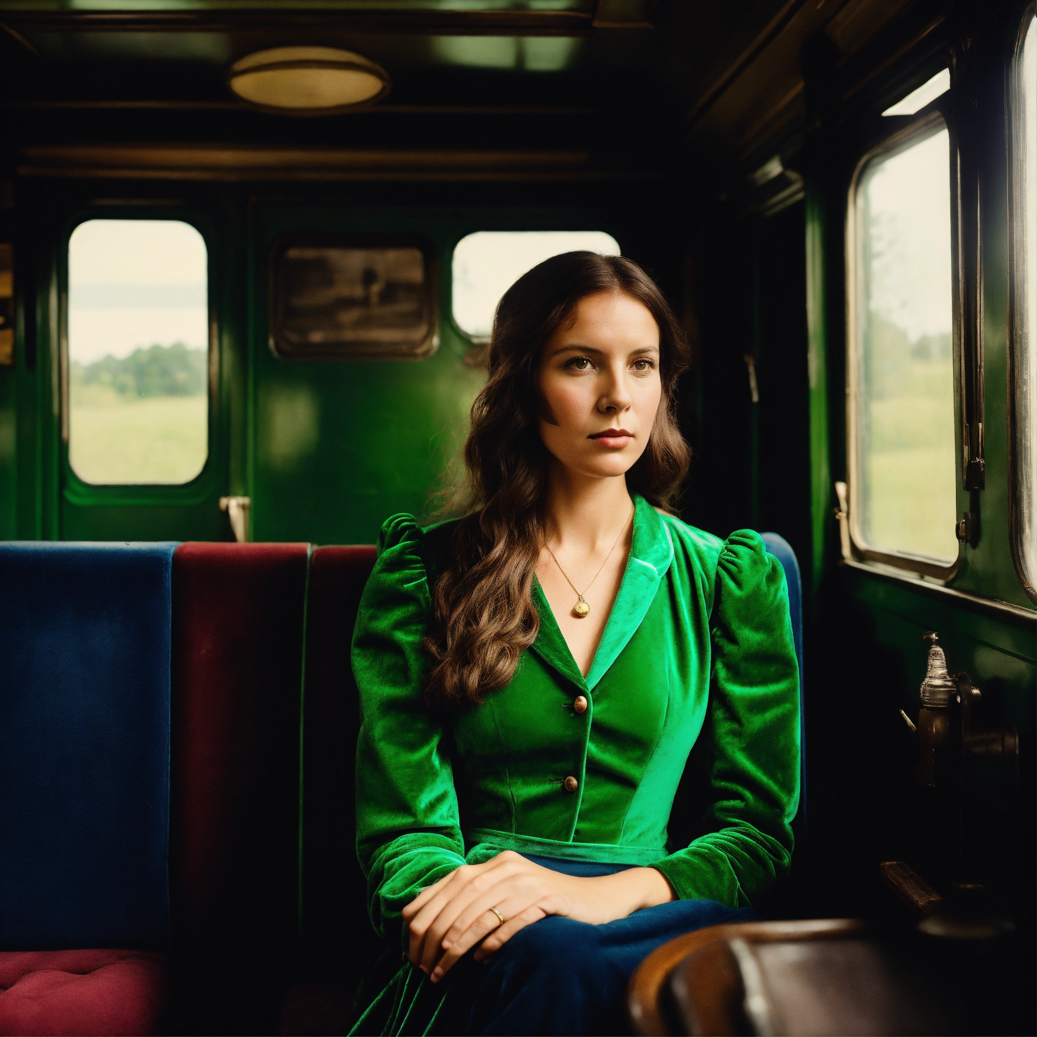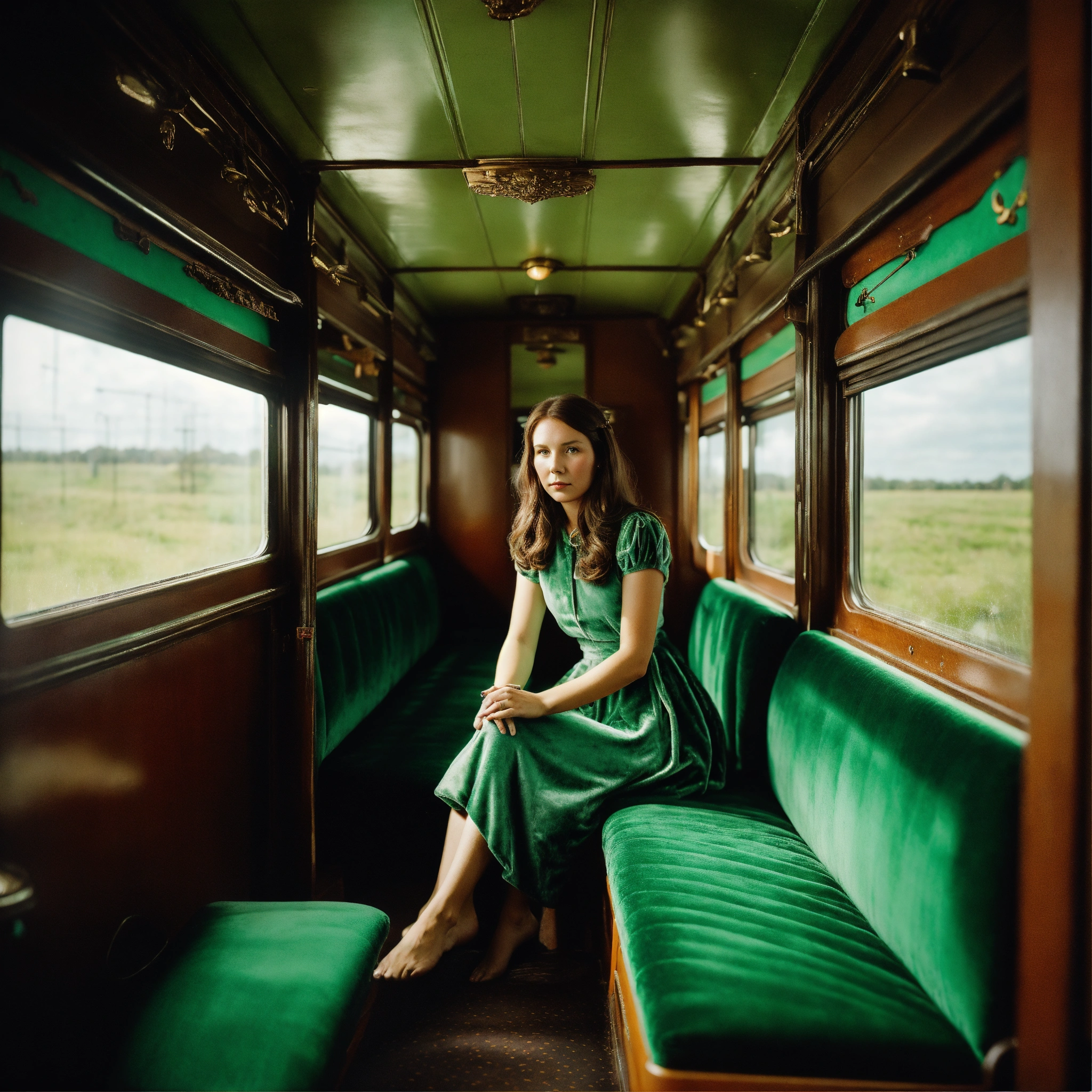 A tintype photograph of a woman with long brown hair sitting in a vintage train carriage with green velvet seats on either side of the window, wes anderson colour grading