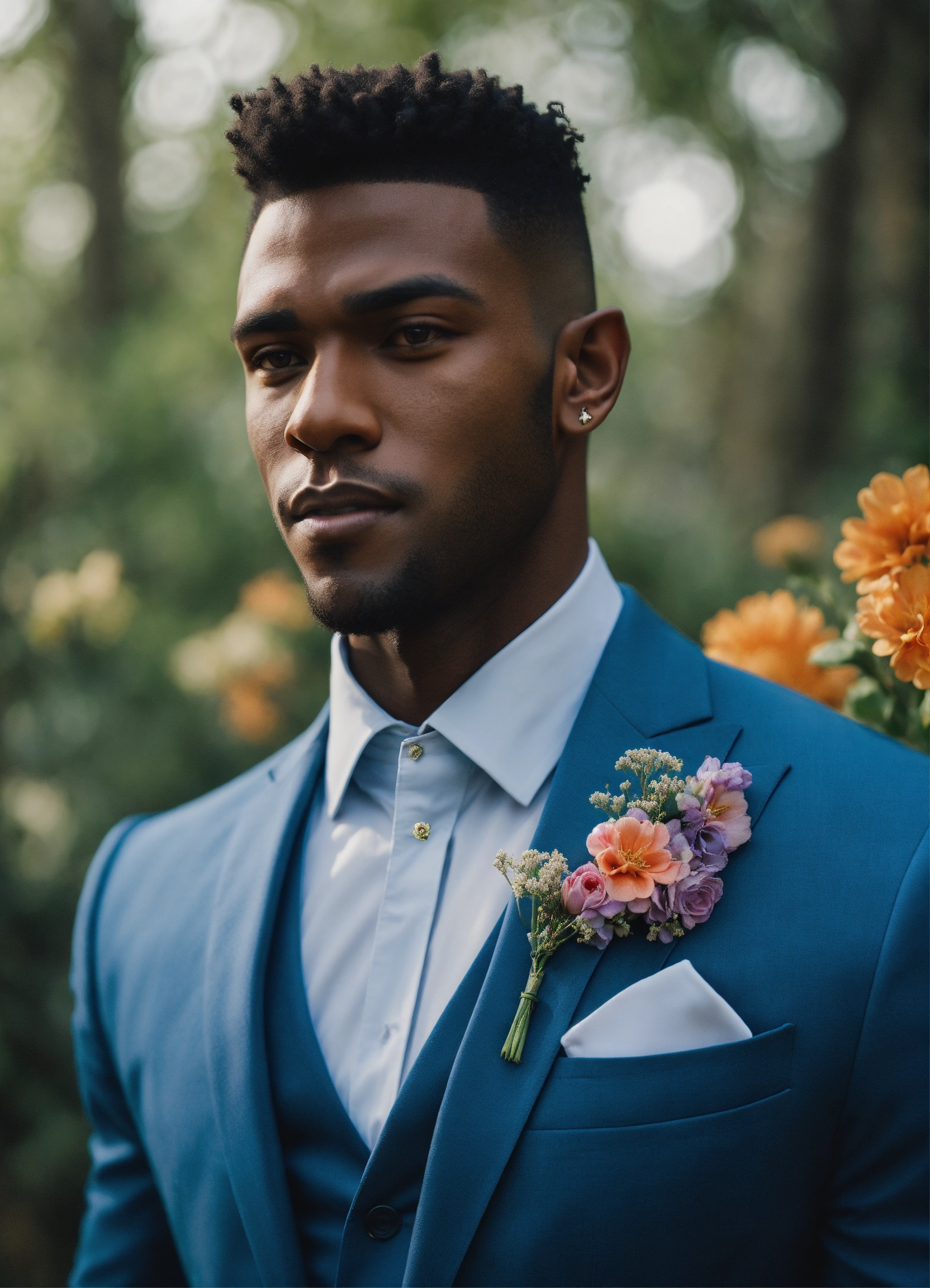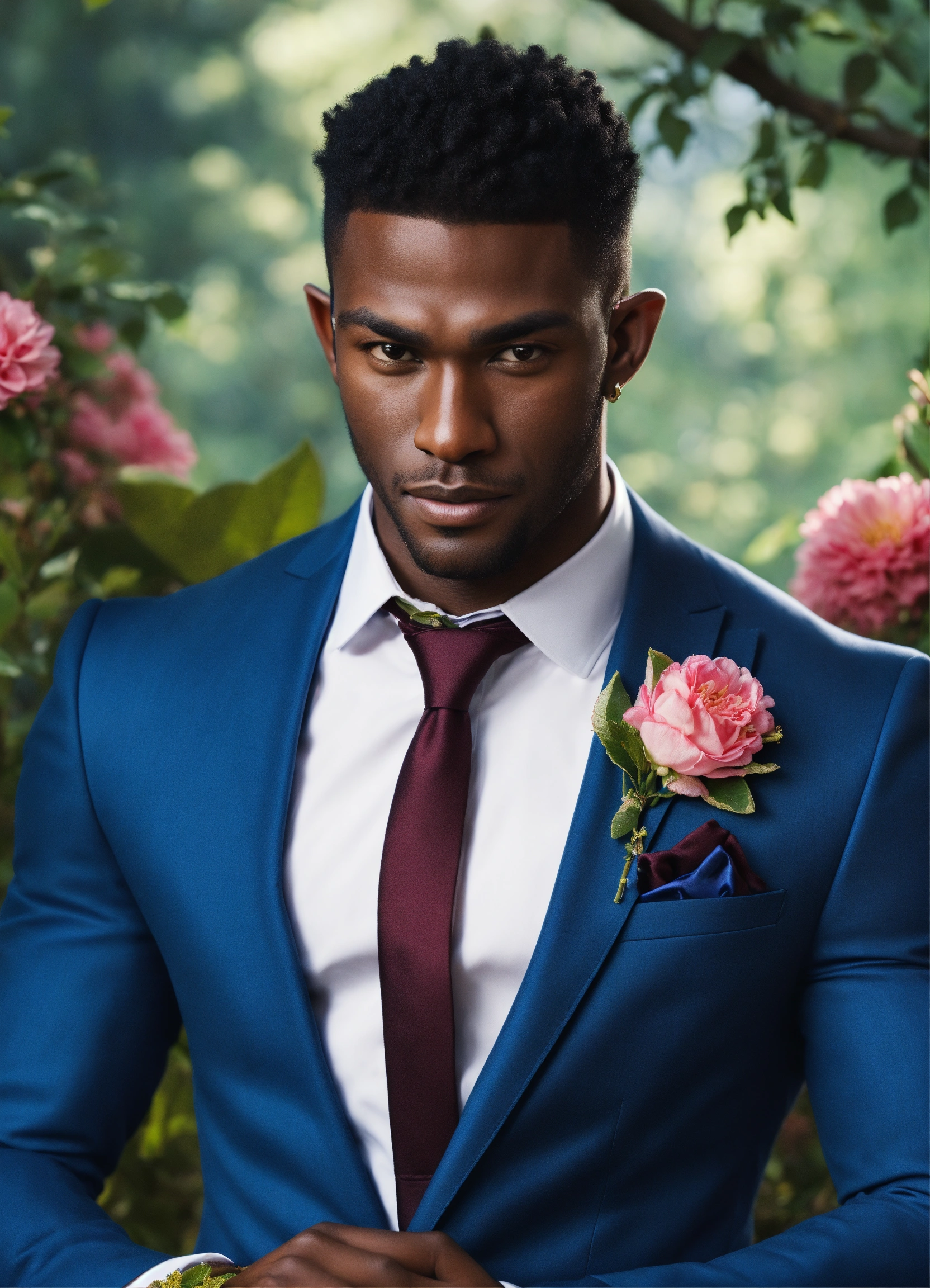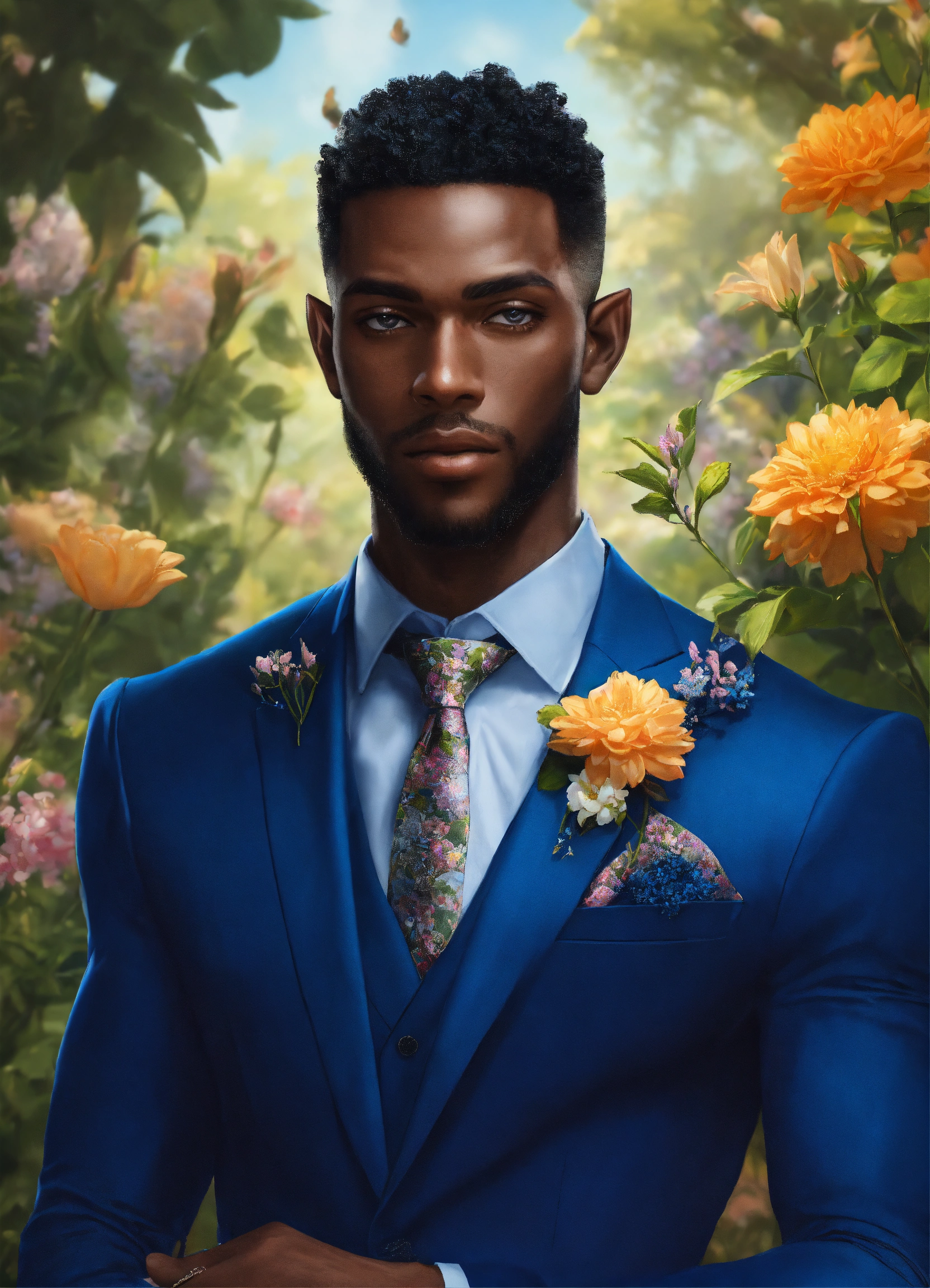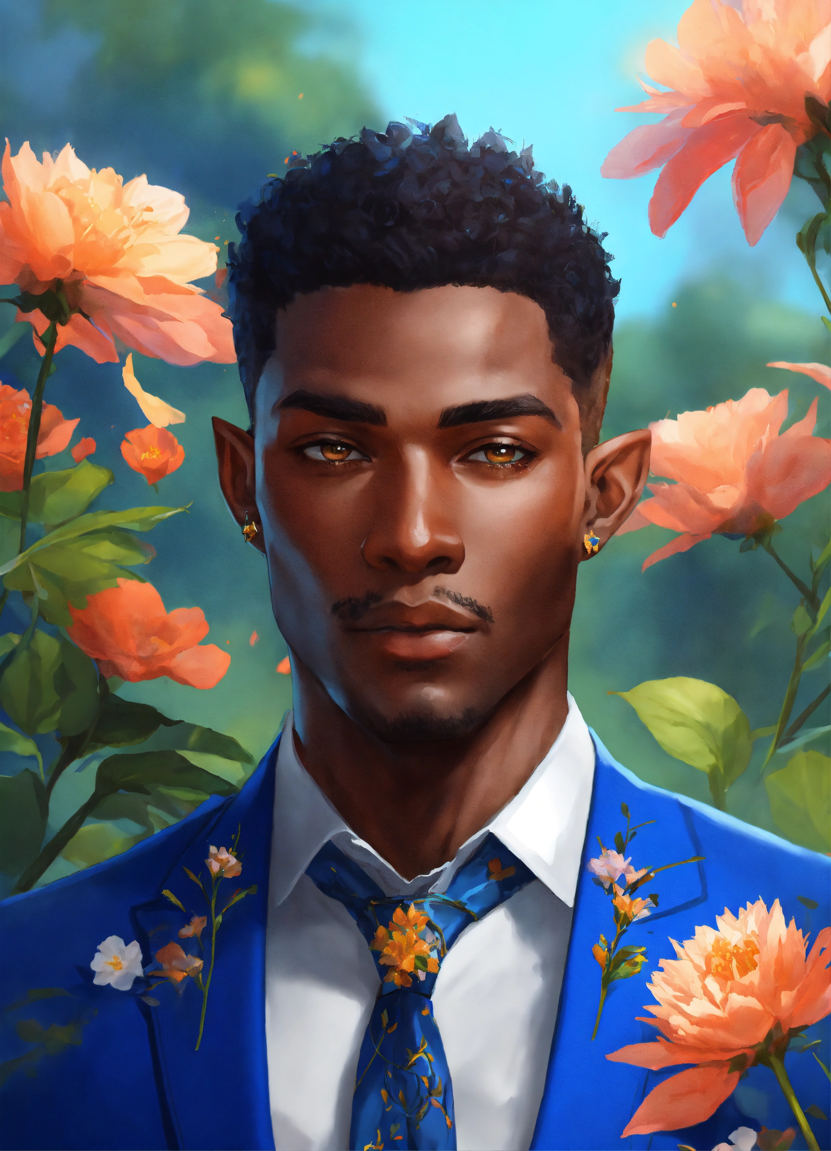 A strong handsome black elf man with pointy ears with short hair dressed in a blue suit with beautiful flowers and nature around him