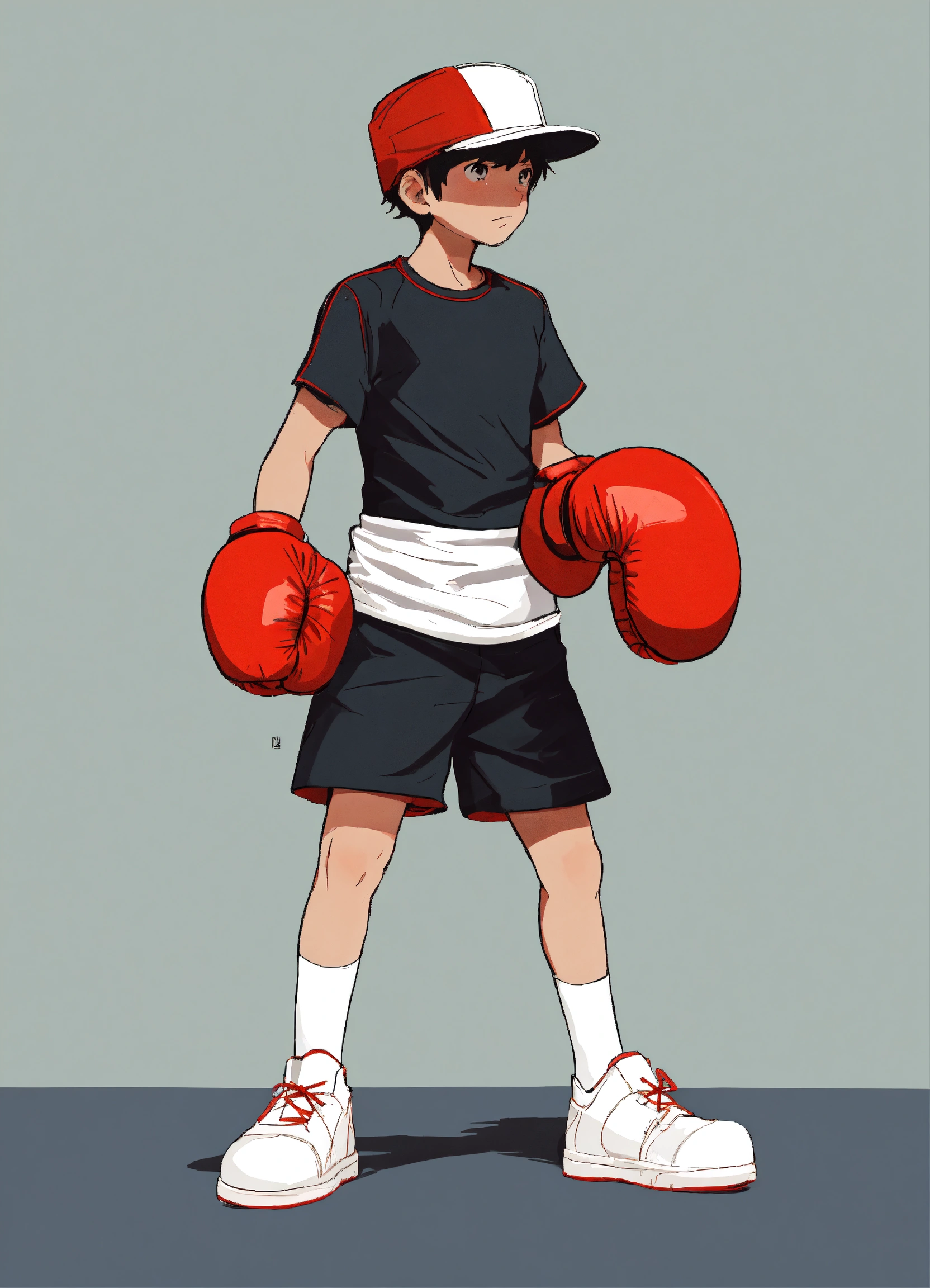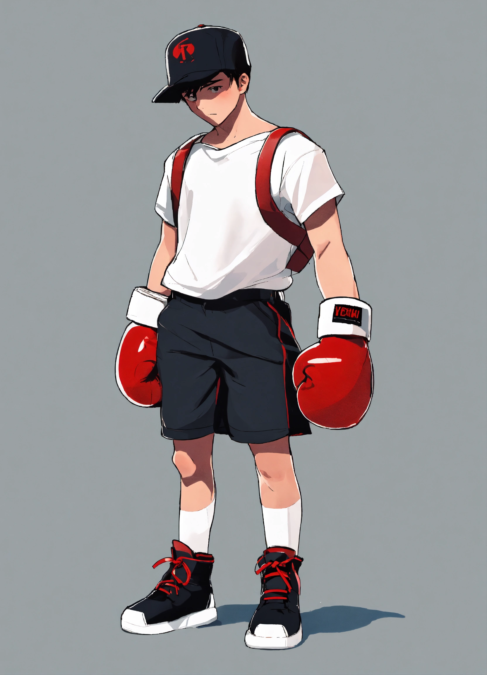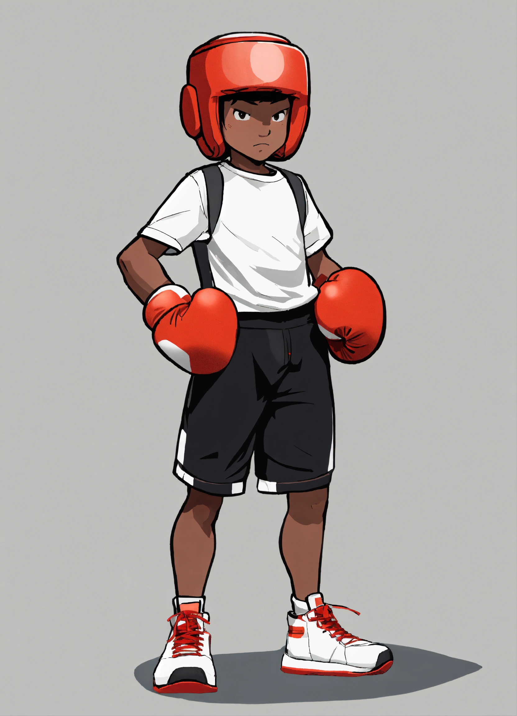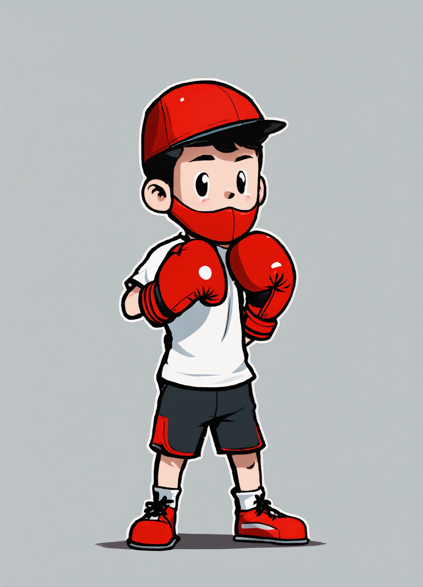 Young cartoon boy, logo, minimalistic, with red boxing gloves, 2d, looking forward, hands down on his side, black shorts, no background, no helmet, blank face, white shoes, white shirt, no head wear