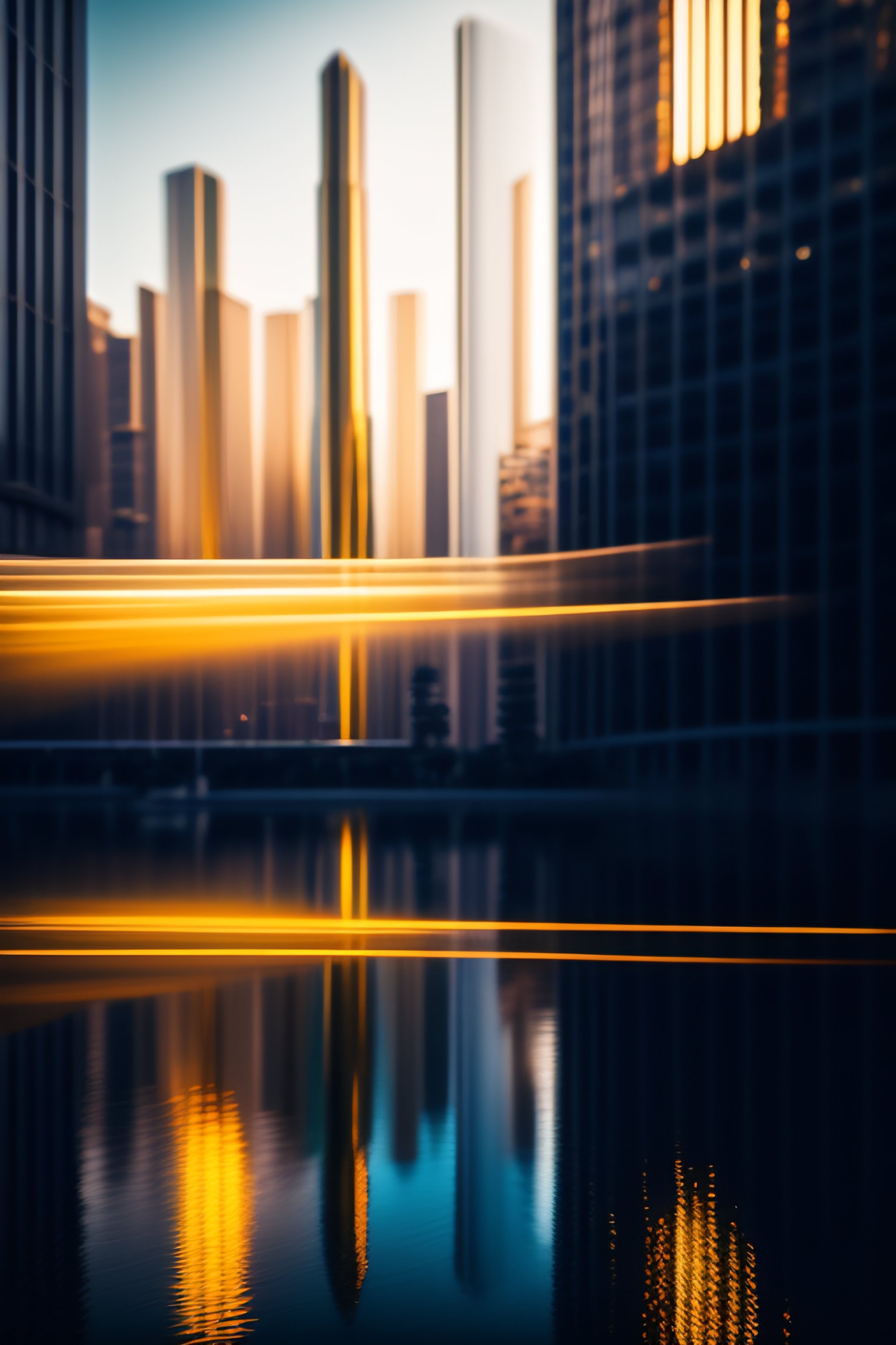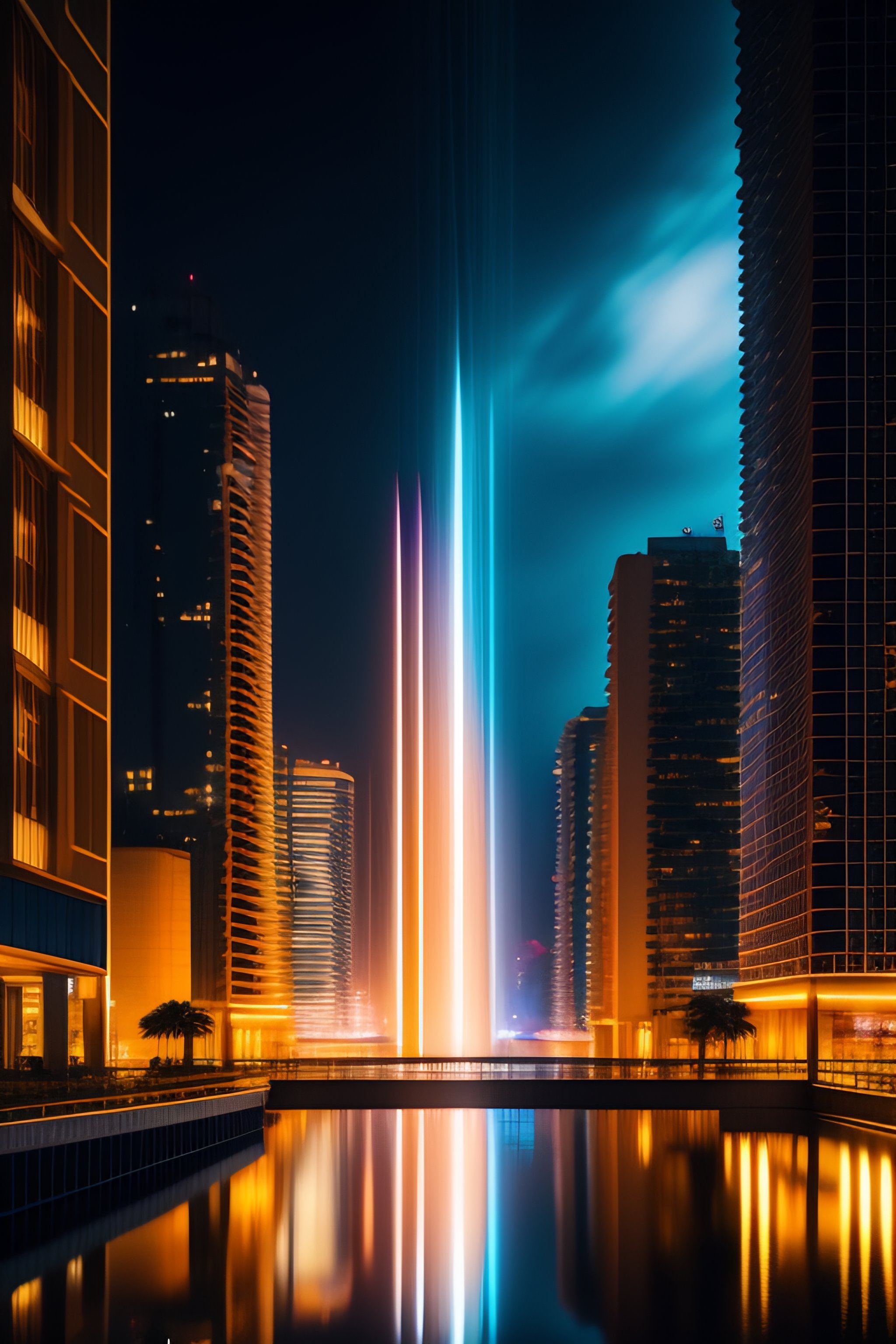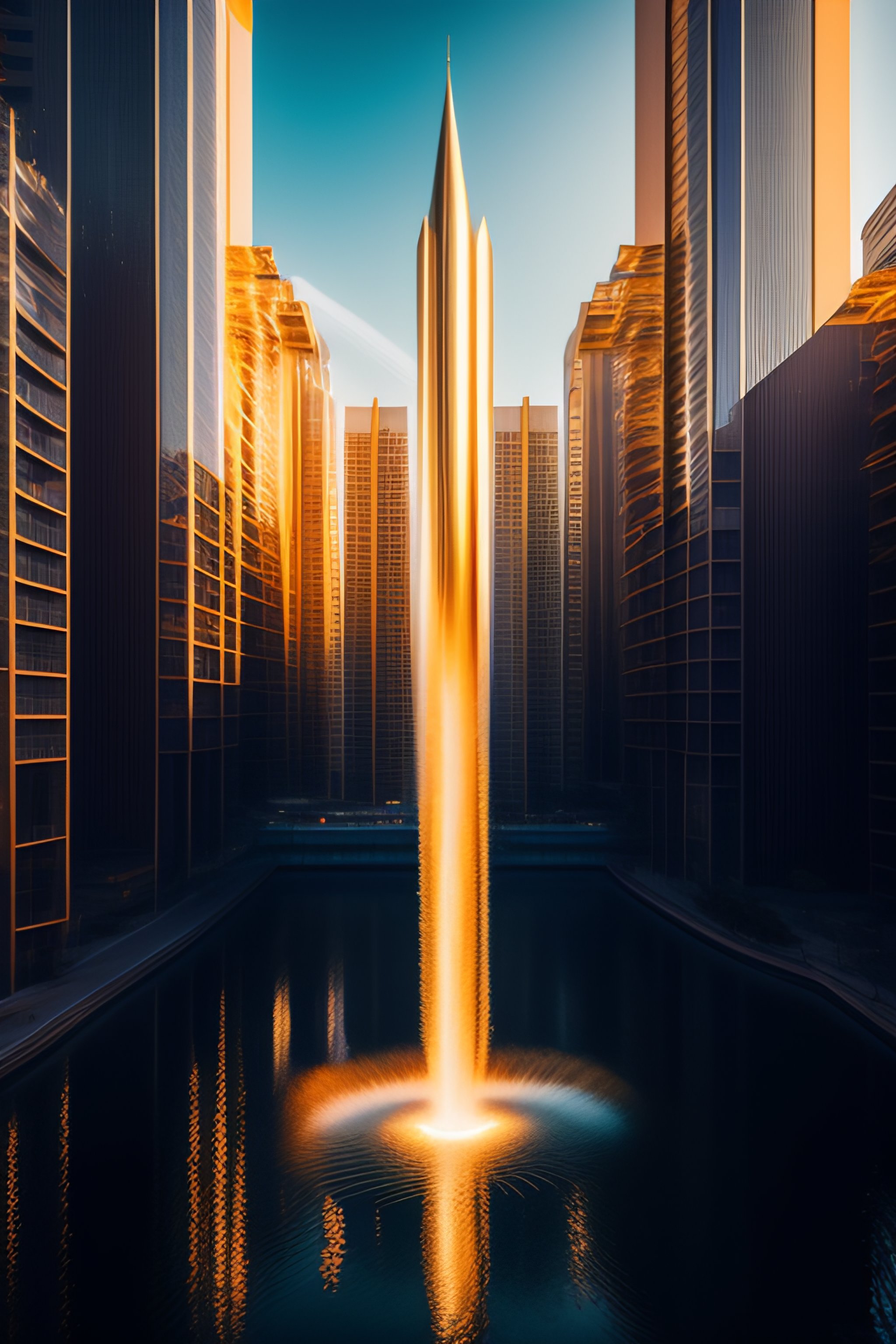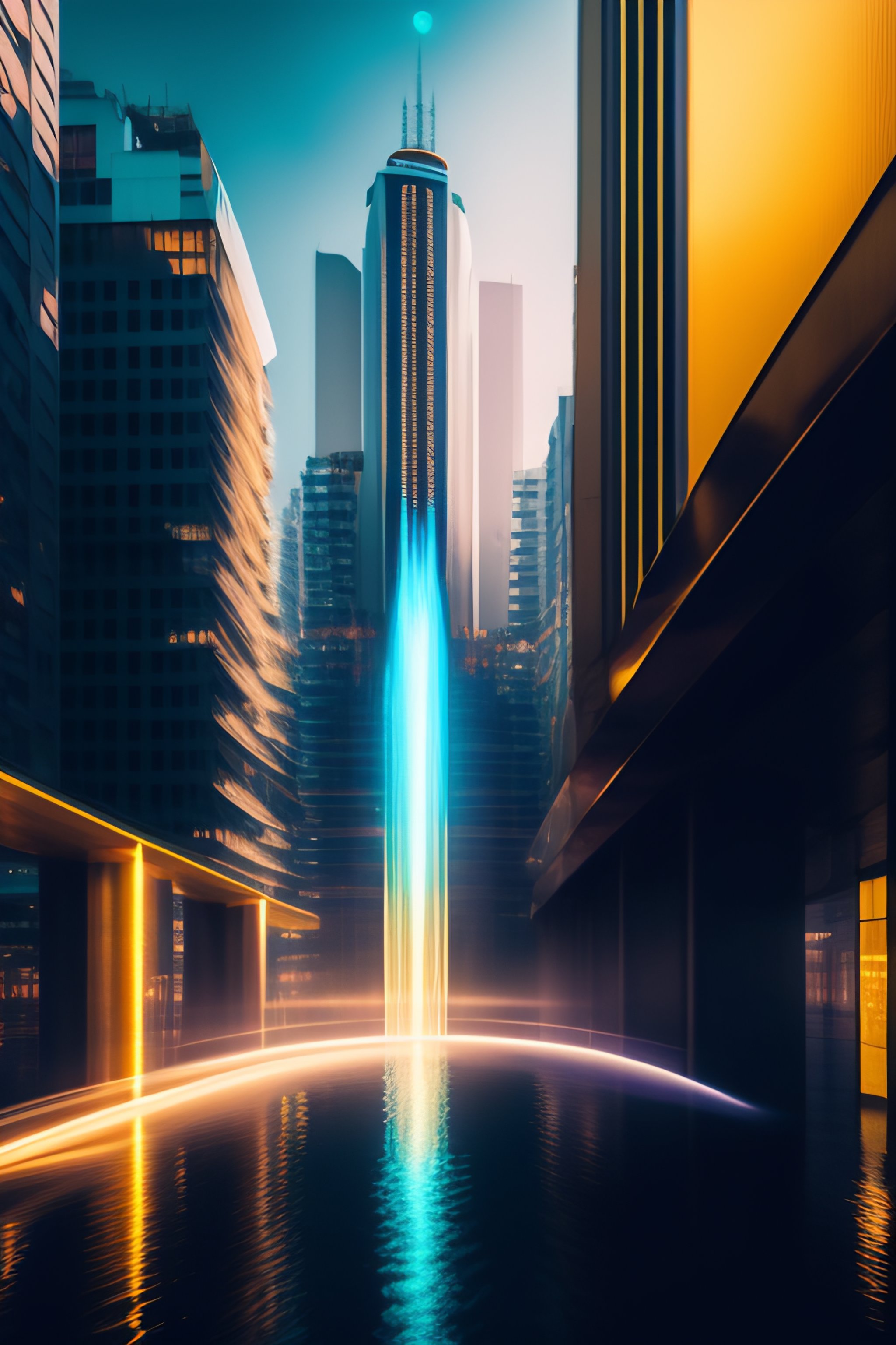 Slow shutter speed photo of a cyberpunk city from afar, water falling, gold, aeroplane, glovo aeroestatico, by jonathan solte and zac retz