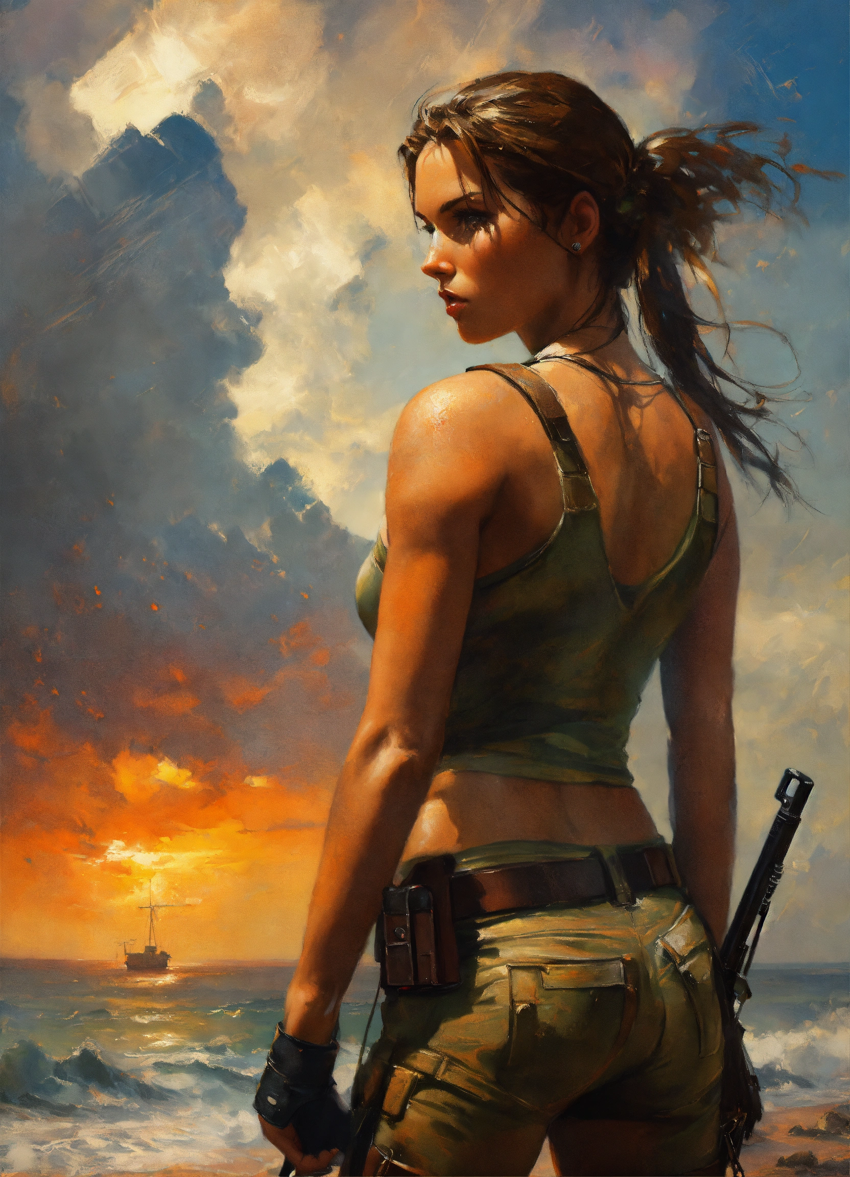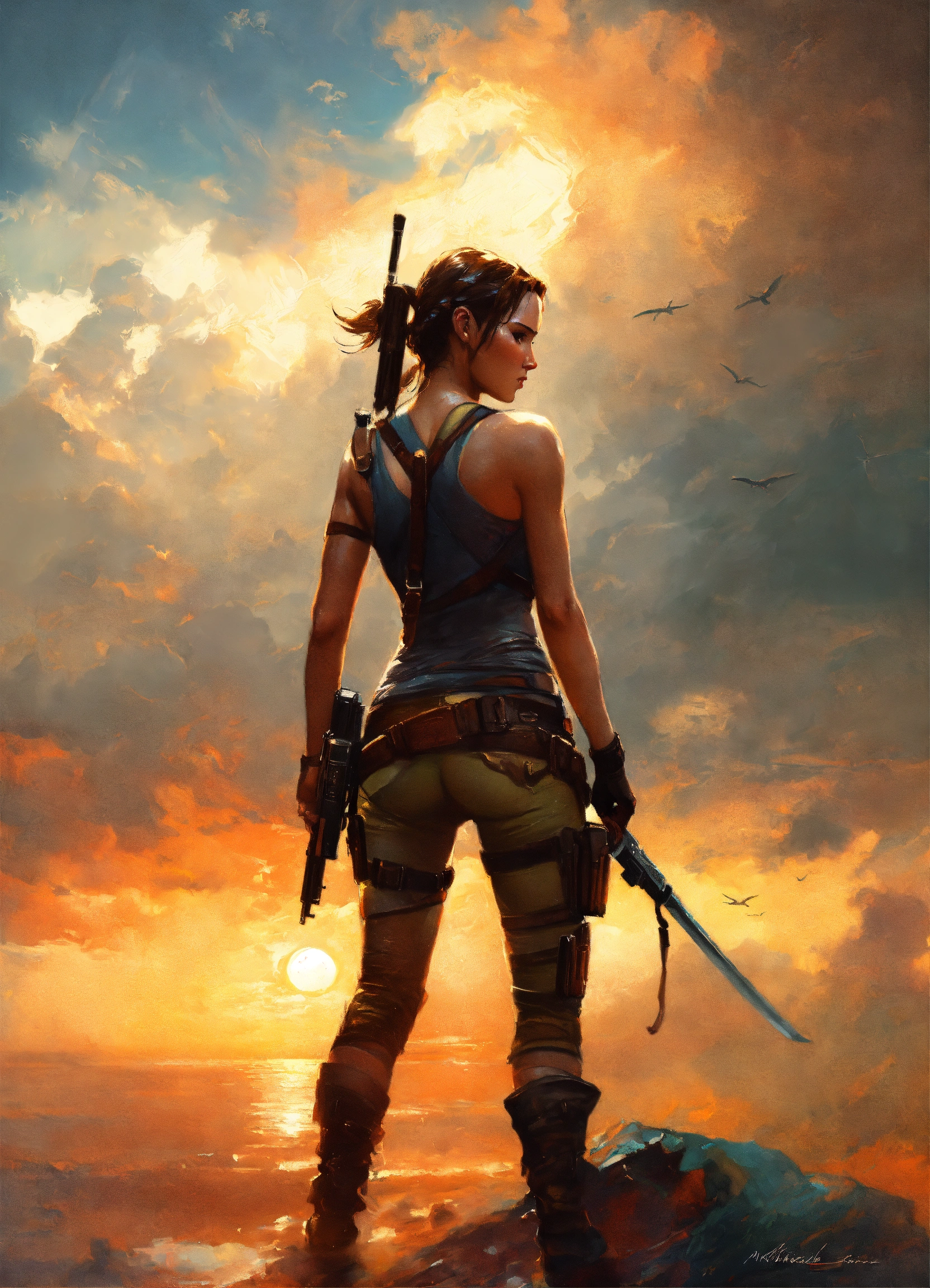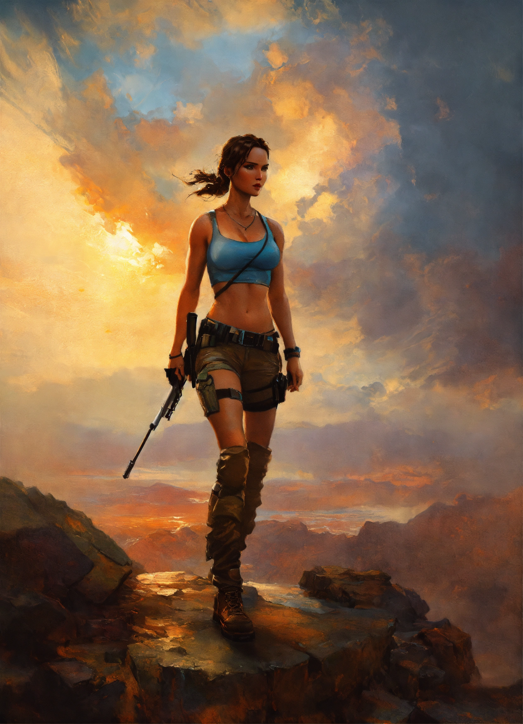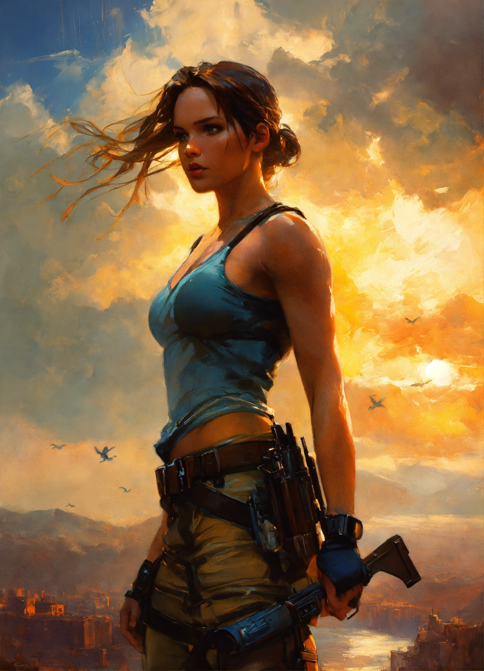 Lara croft, photo, detailed, dramatic sky, atmospheric, cinematic, art by michael garmash and antonio j manzanedo and oleg oprisco