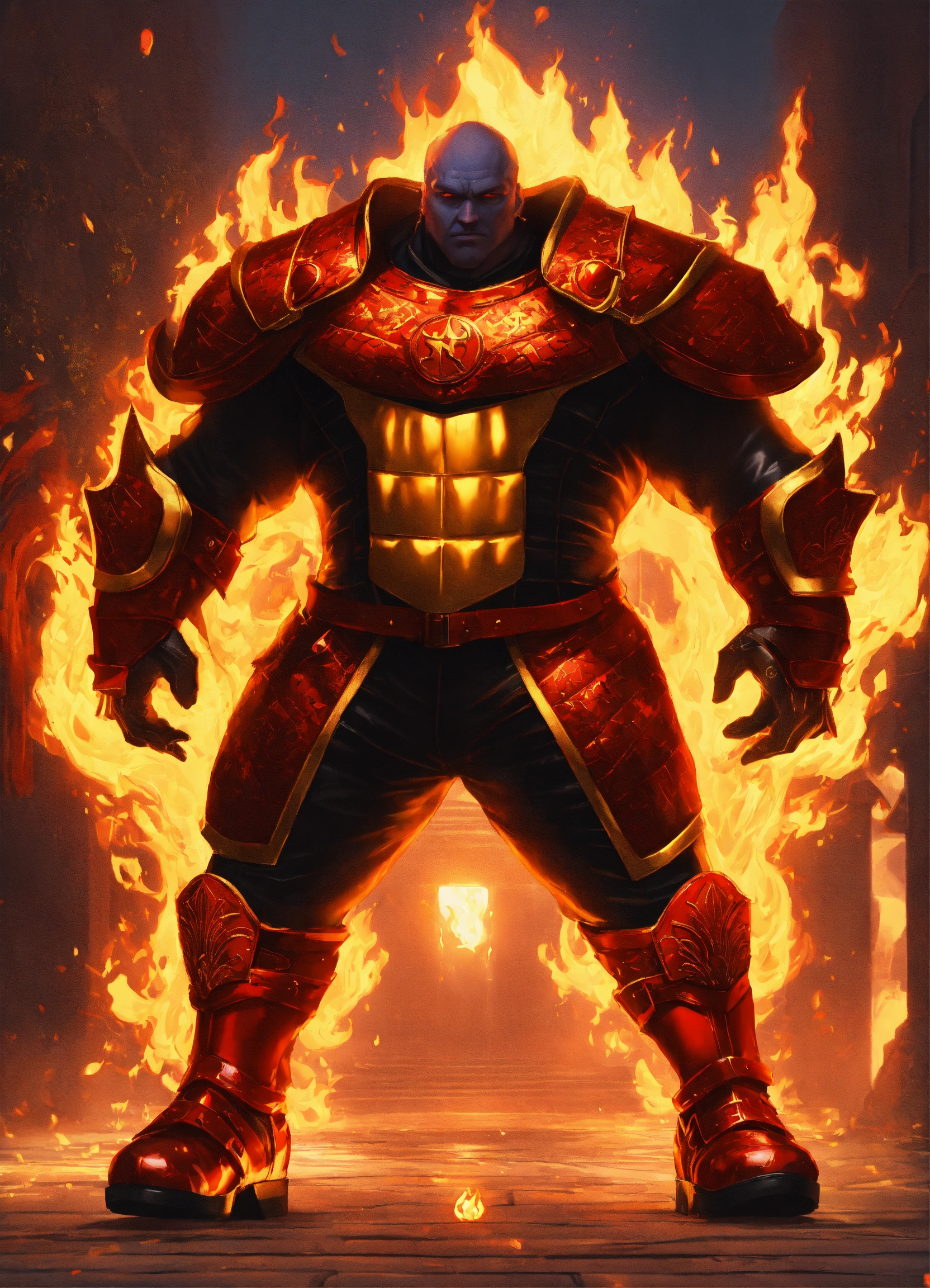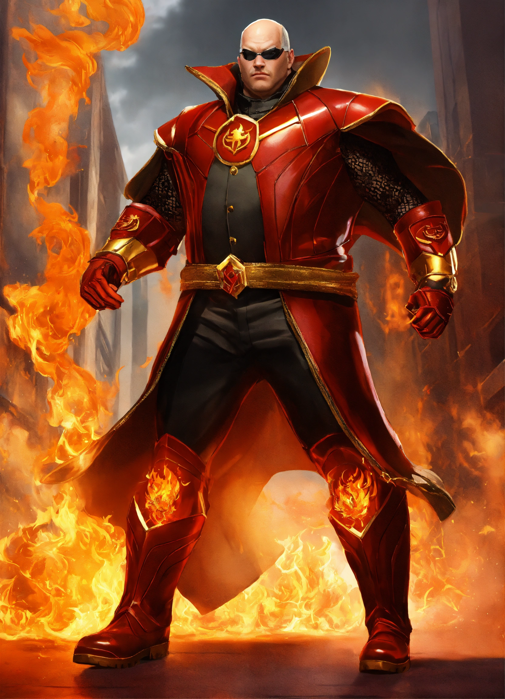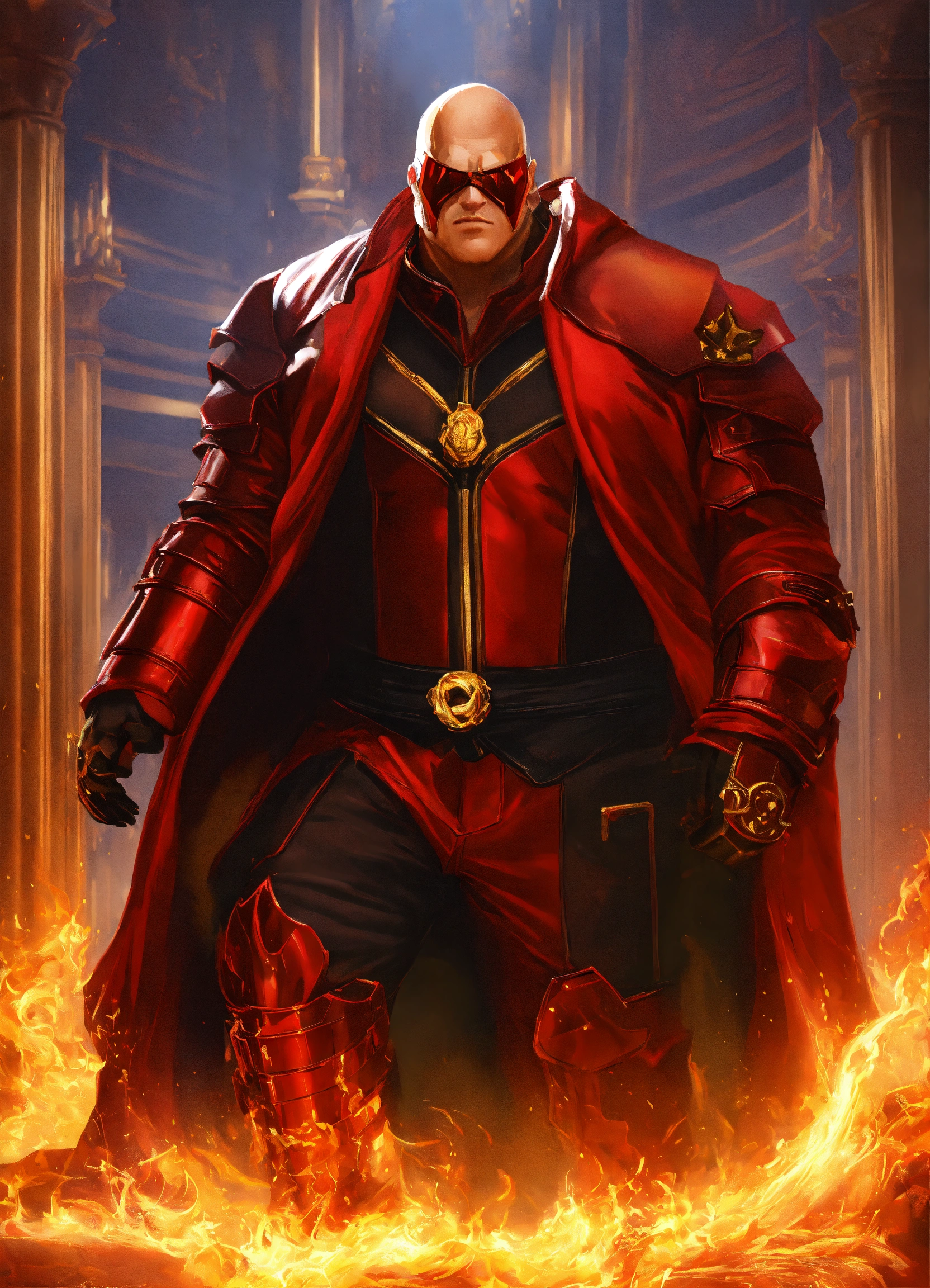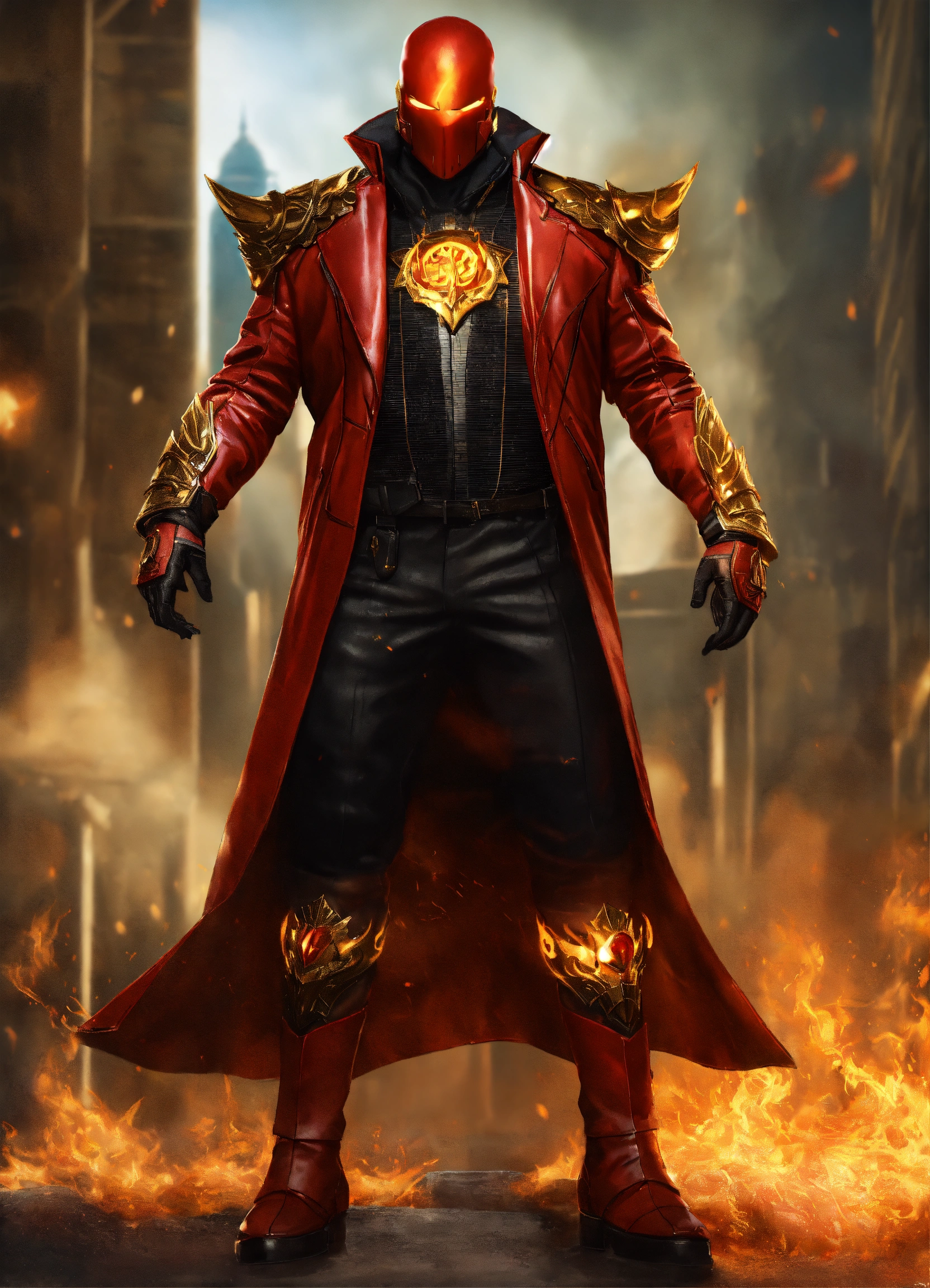 Realistic, digital illustration art, inferno kingpin, his costume is a combination of deep red, black, and gold leather. it includes a flame-resistant suit with reinforced armor, as well as a stylized mask that conceals his identity while evoking a fiery crown. inferno kingpin's gloves and boots are equipped with special flame-resistant materials. --ar 43 --v5.2 --seed 7779311