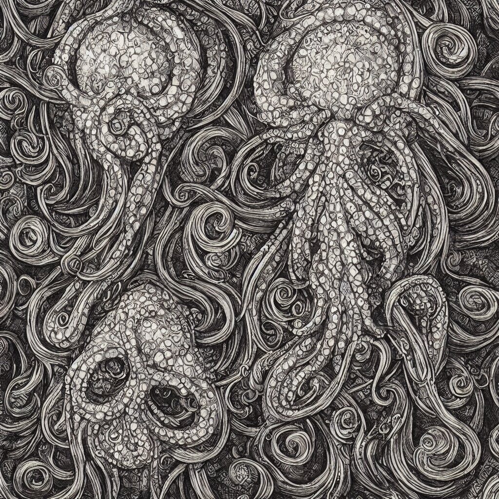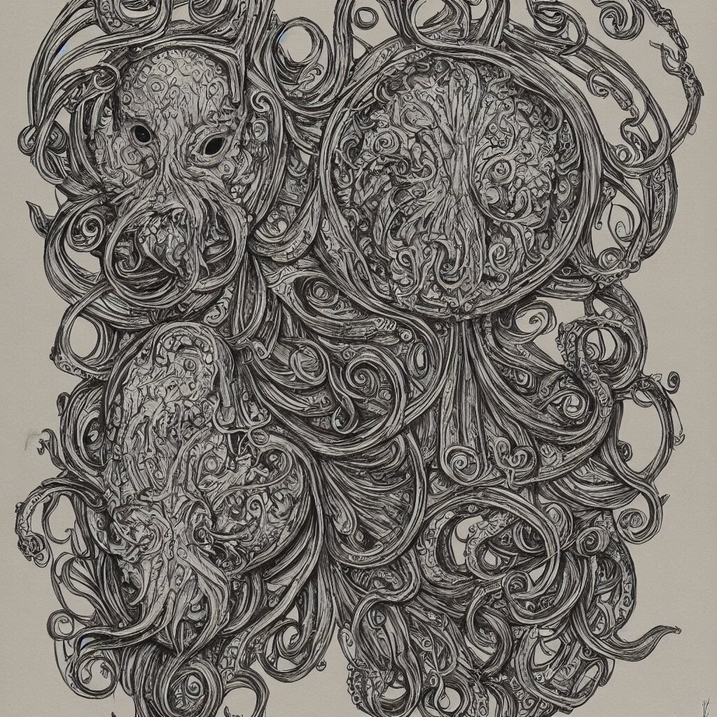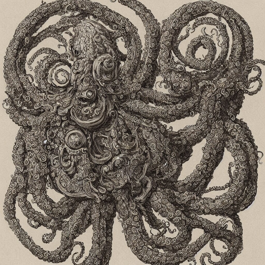 Beautiful ceremonial bilaterally symmetrical octopus mask, classical ornamental design, fibonacci flow, acroteria, encarpus, shield emblem, large medium and small elements, by russ abbott, albrecht durer, artgerm, rutkowski