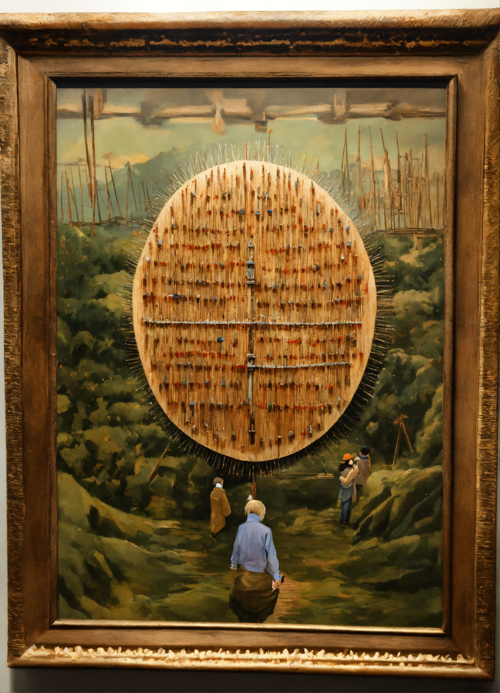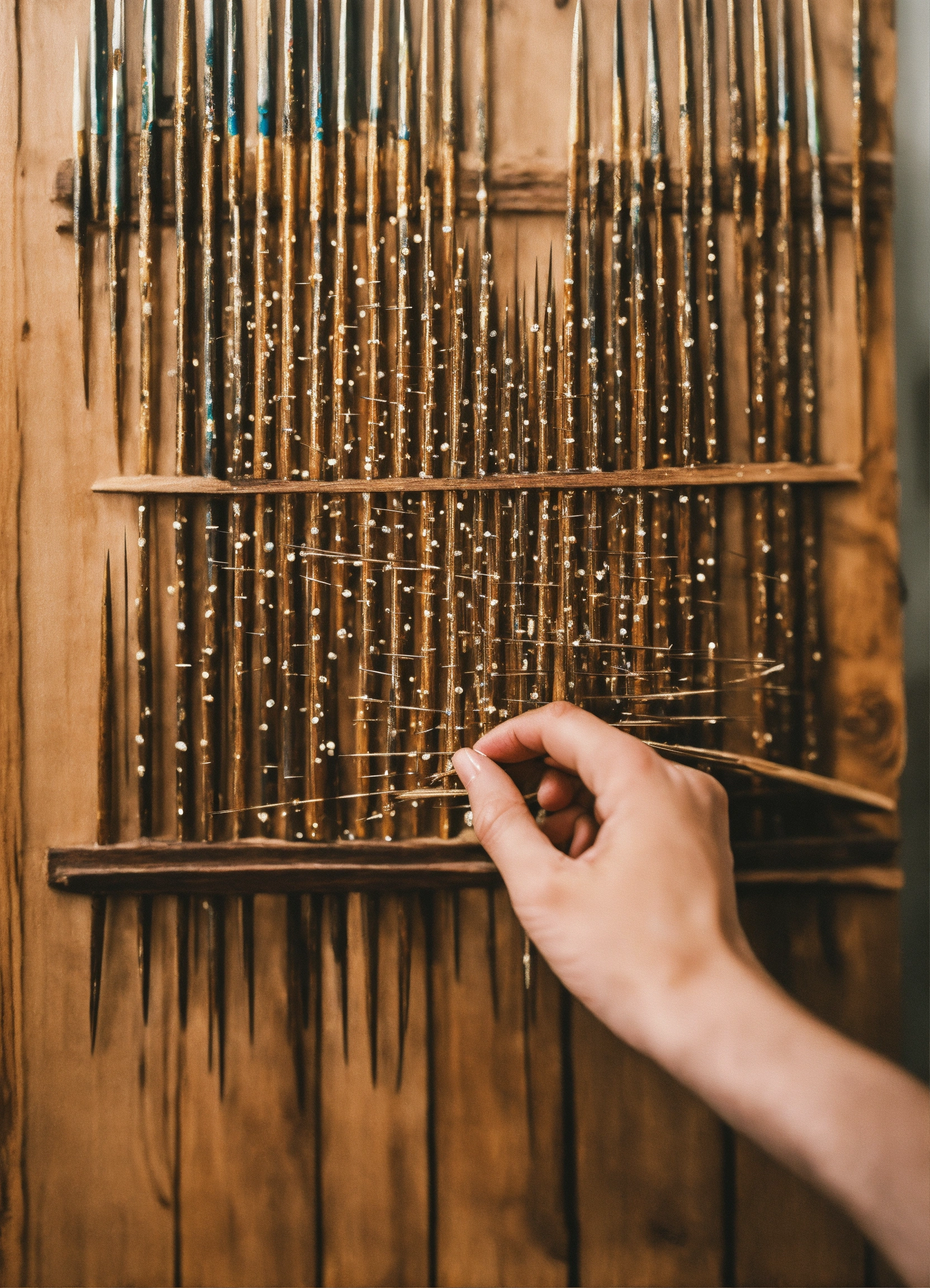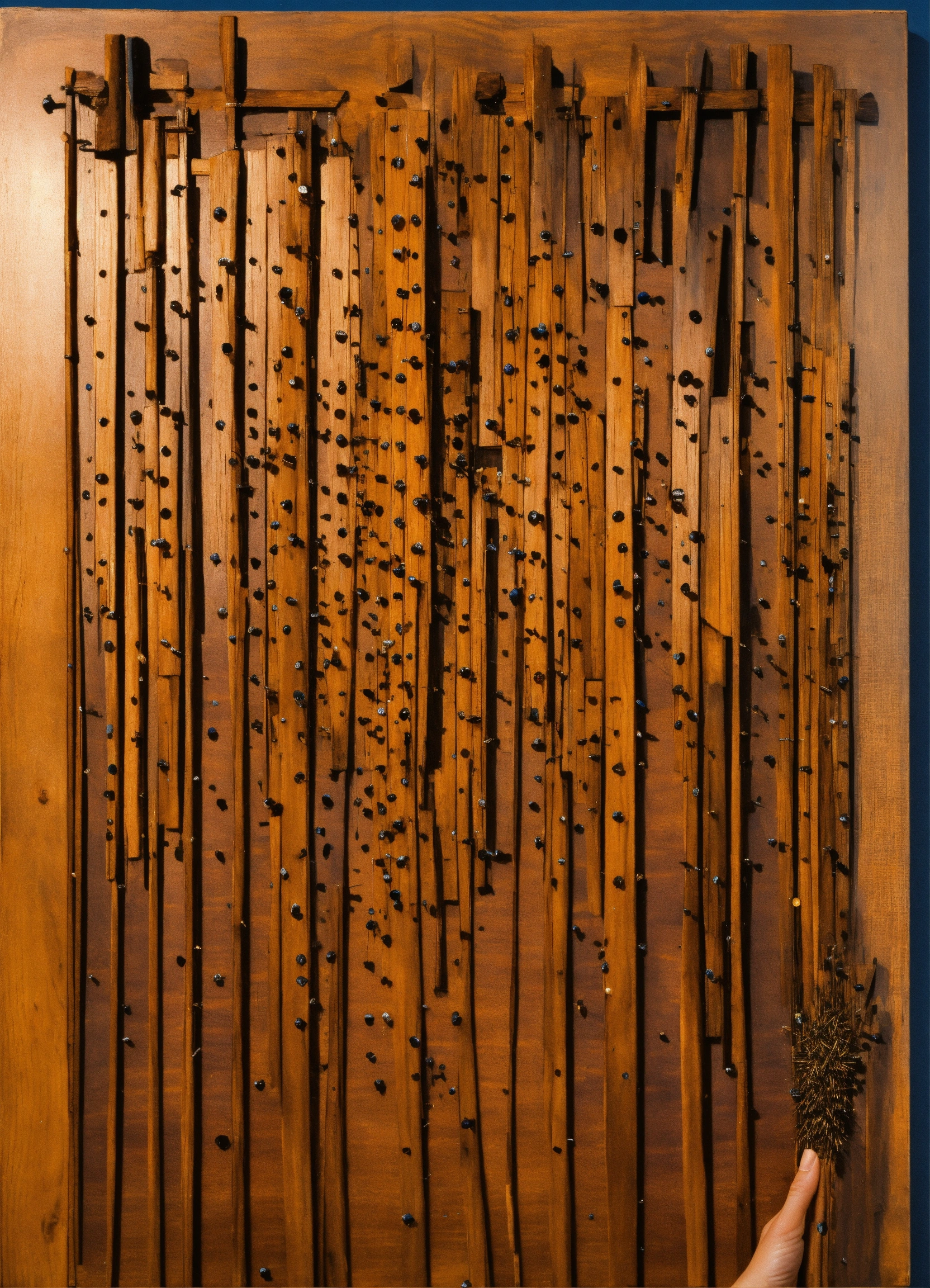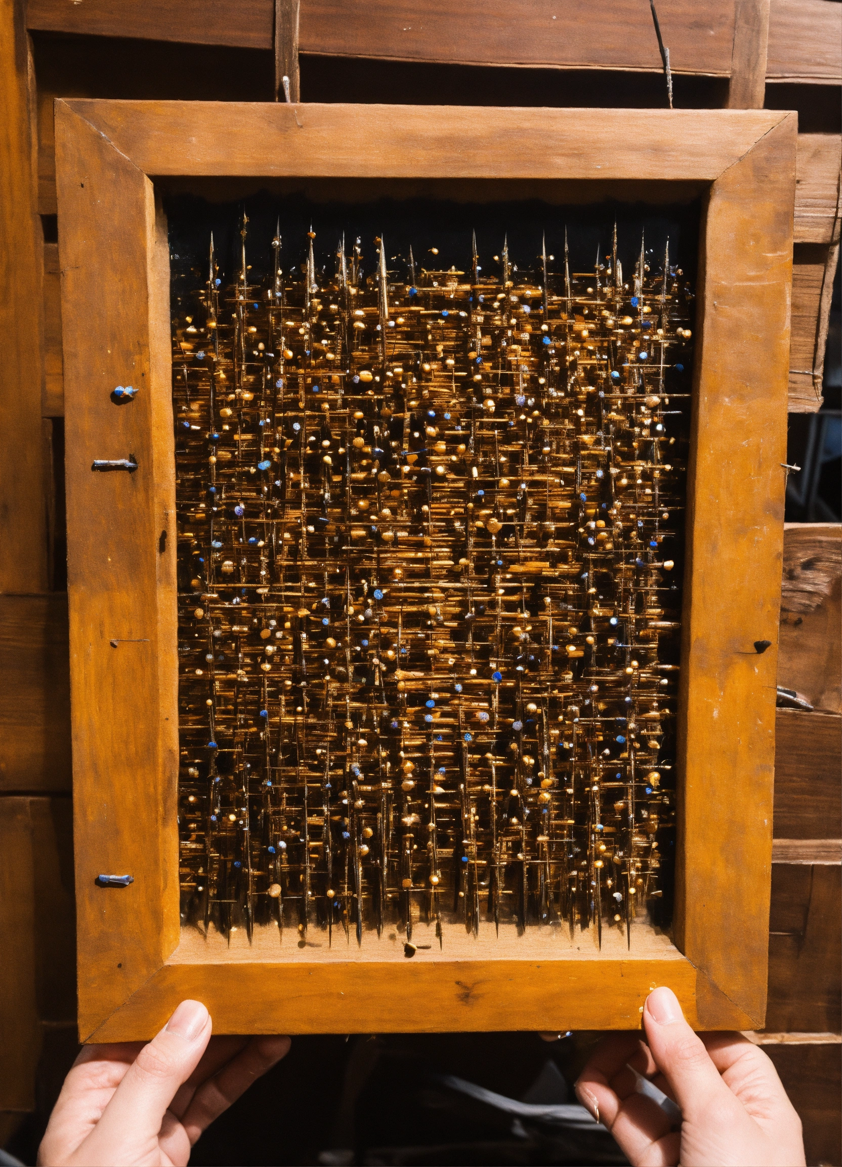 A hand holding a wooden painting with a lot of nails in it