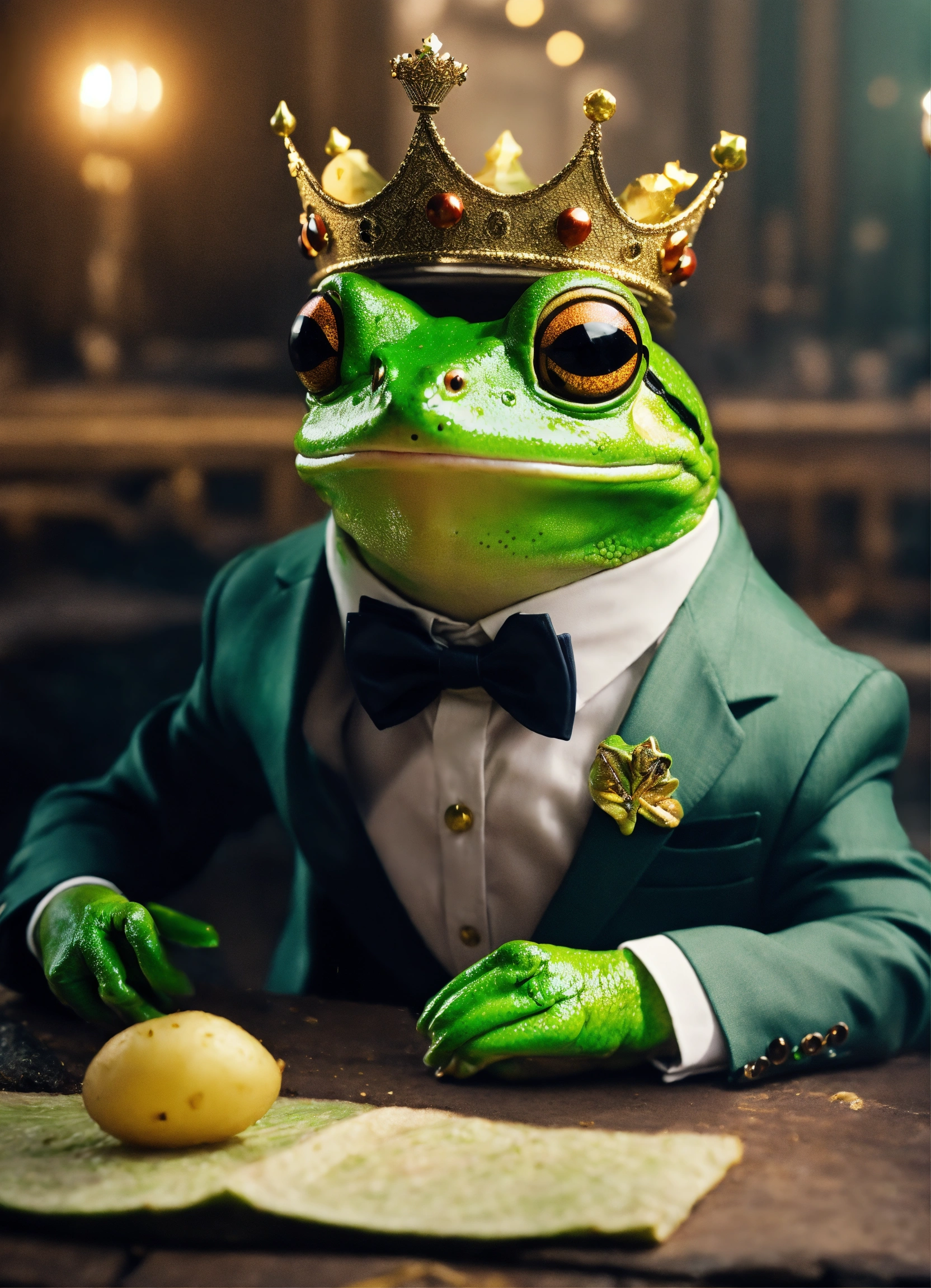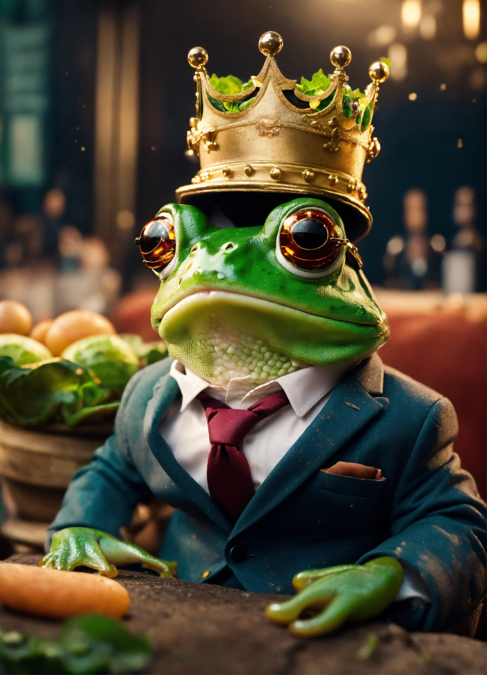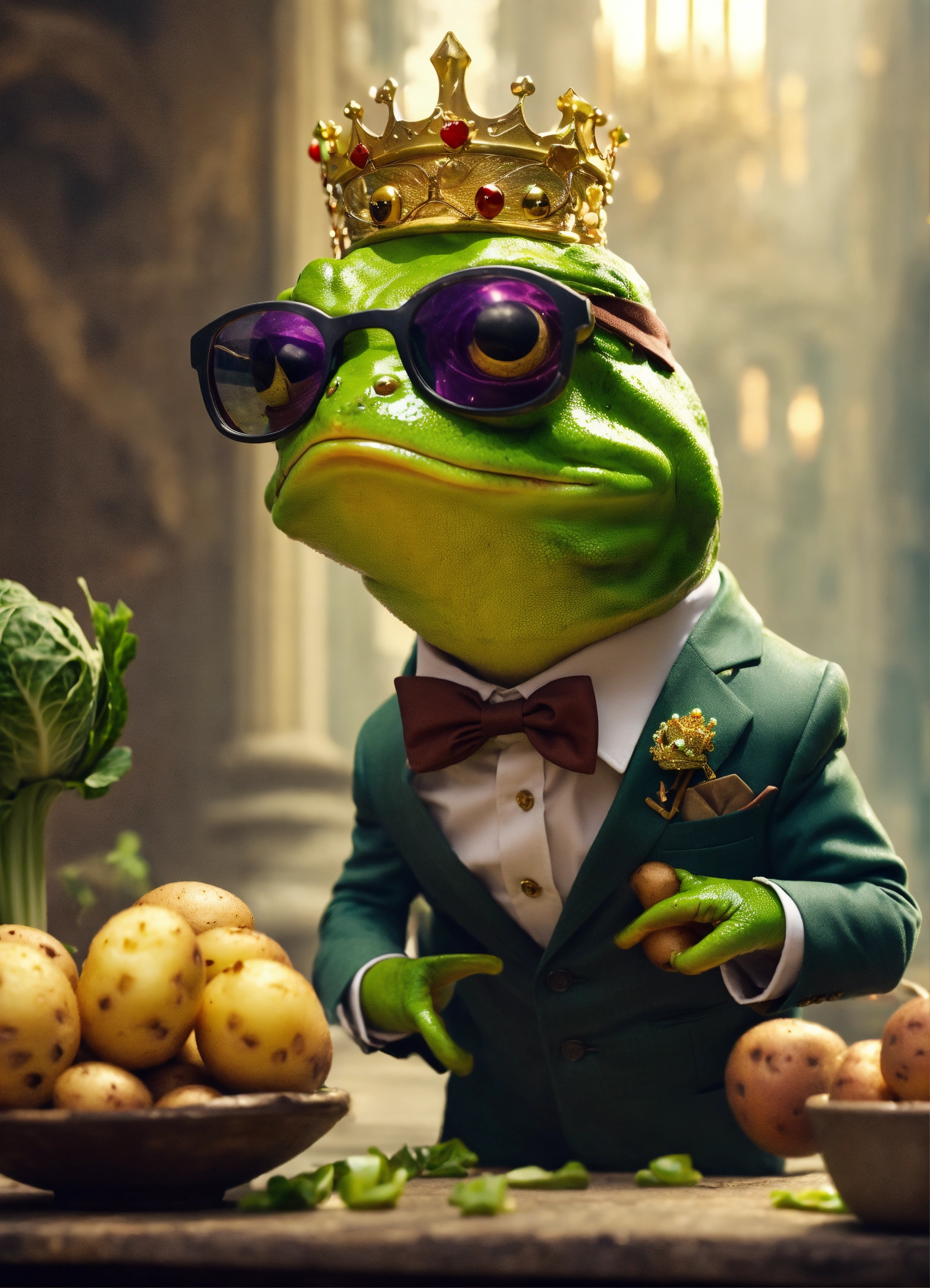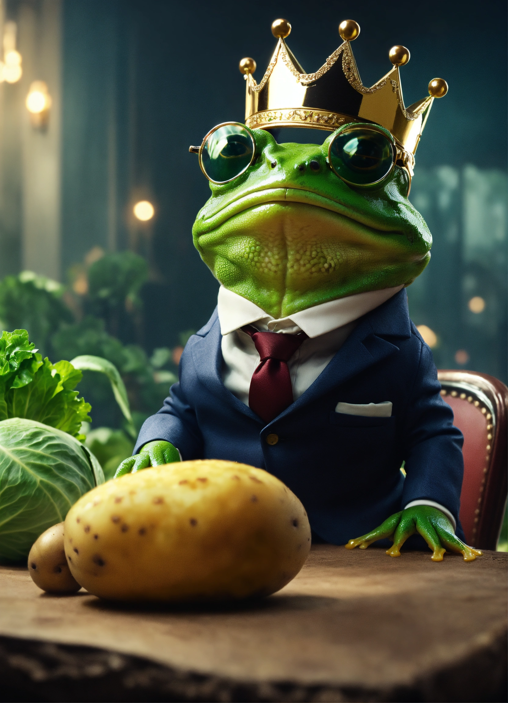 Cute frog in suit and glasses and crown in cinematic environment arguing with potato and cabbage unfortunate events