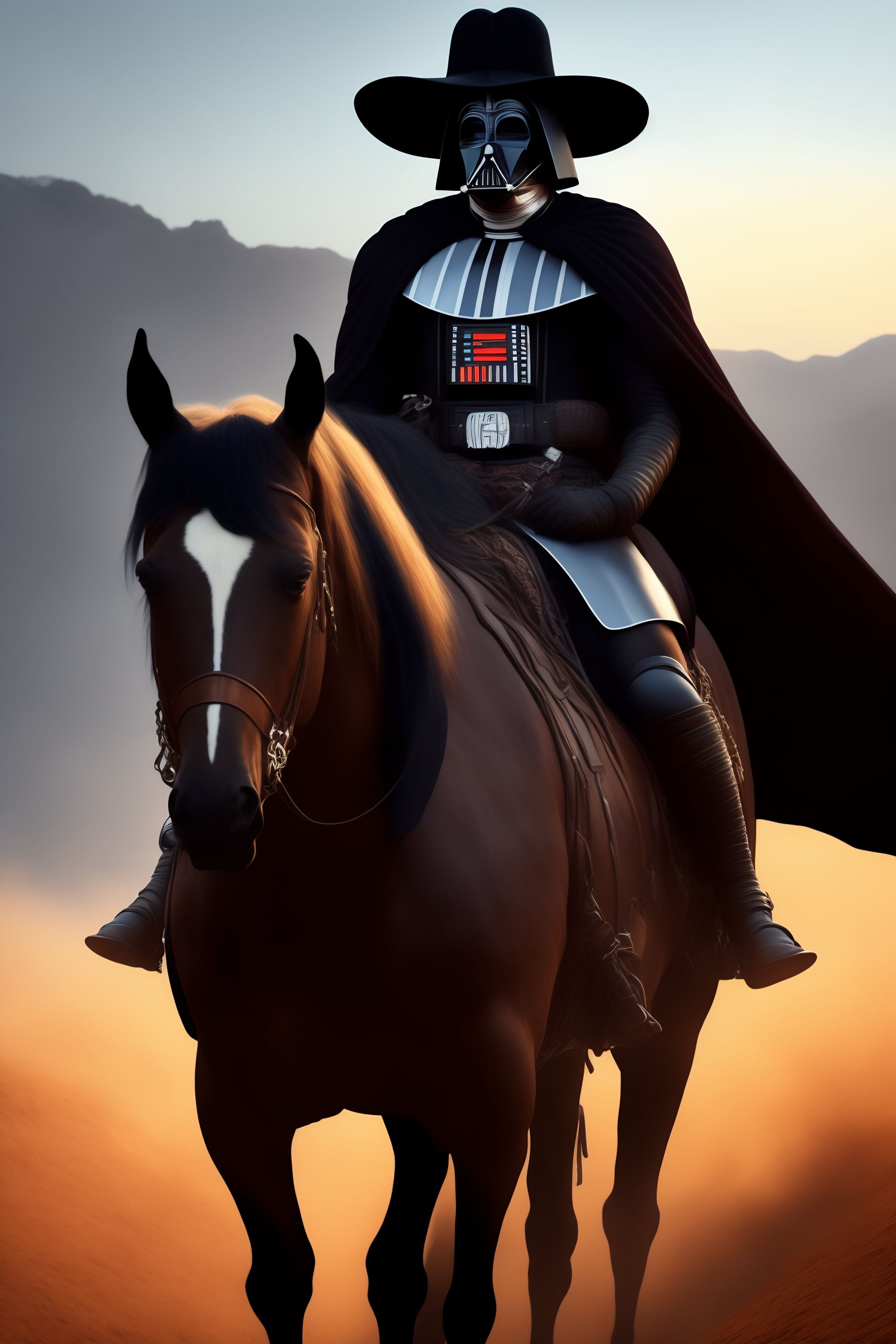 Portrait of darth vader as a cowboy holding a lightsaber while riding a horse without his helmet