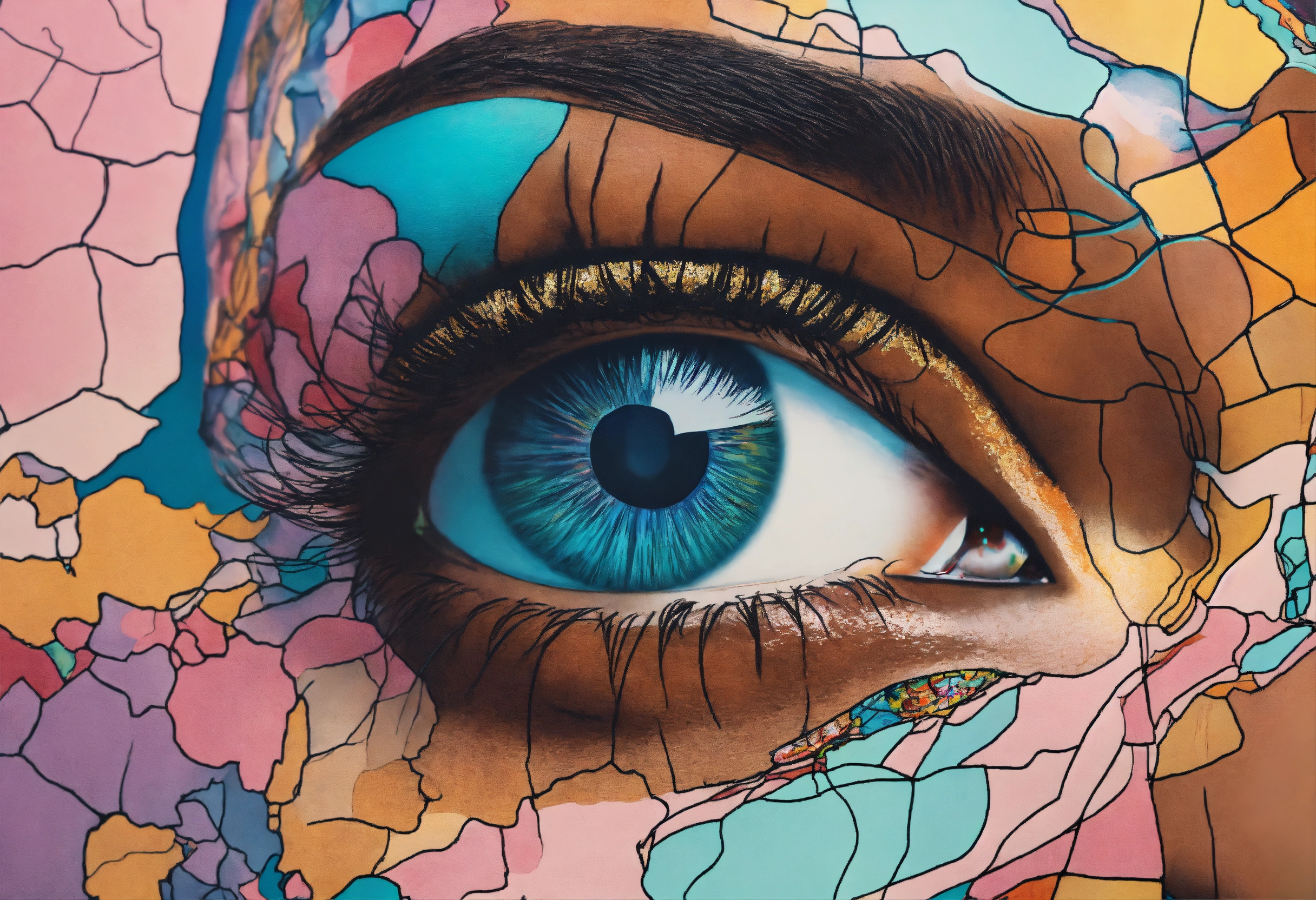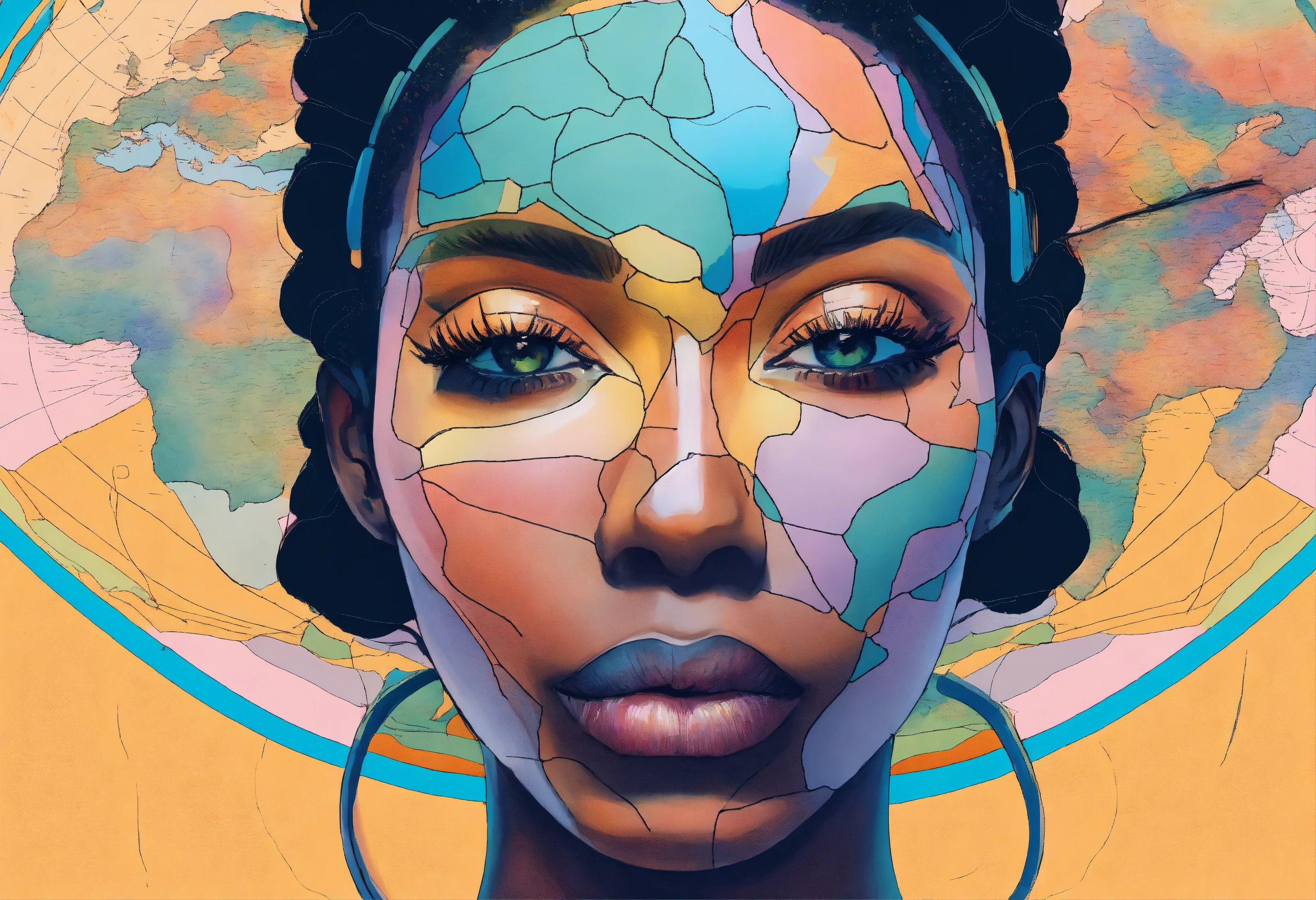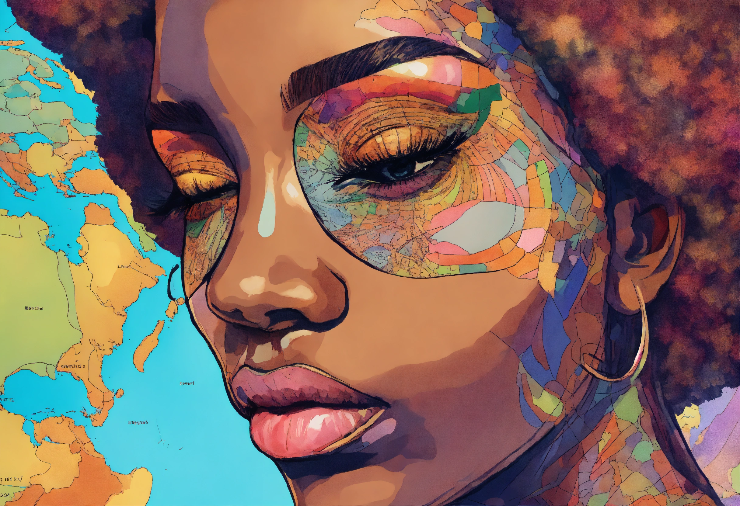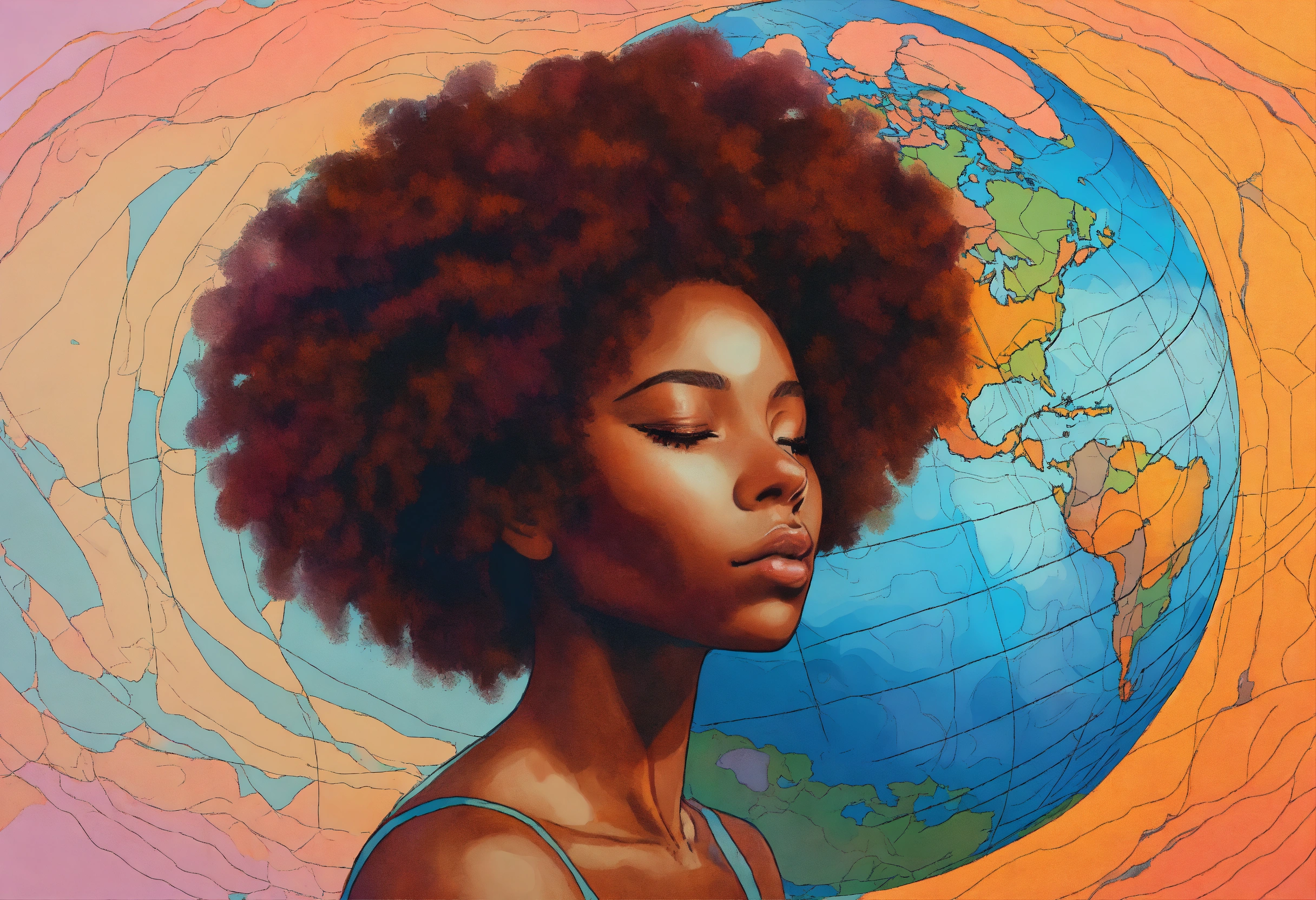 Afrocentric woman one eye closed and one eye closed serene calm facial features colorful pastels, globe reflection in the open enlarged eye, line drawing of a distorted map of the world background, evoked emotions that she sees outside the world without being seen