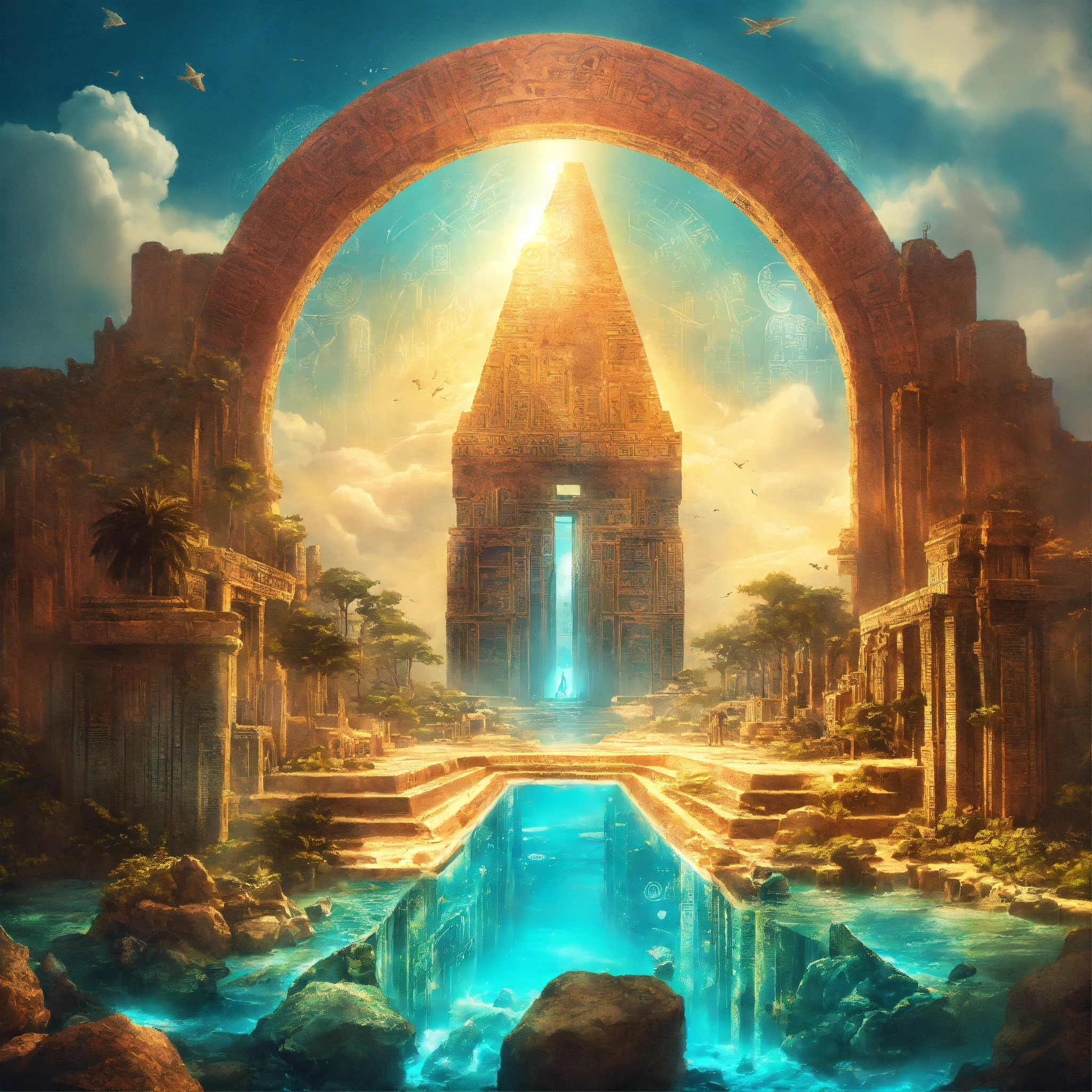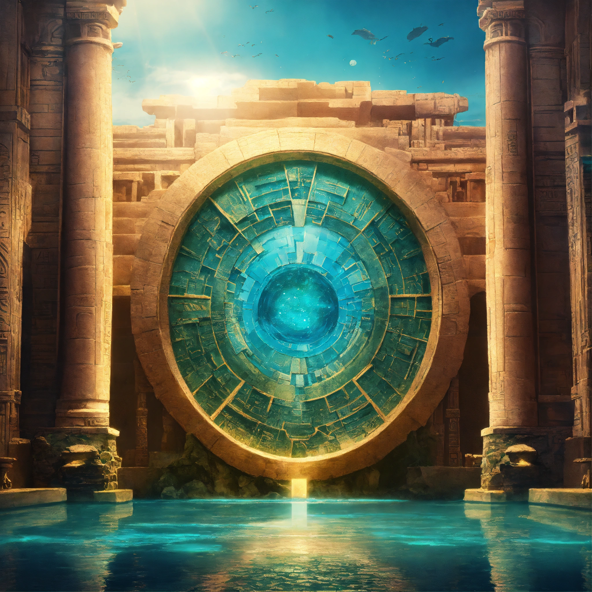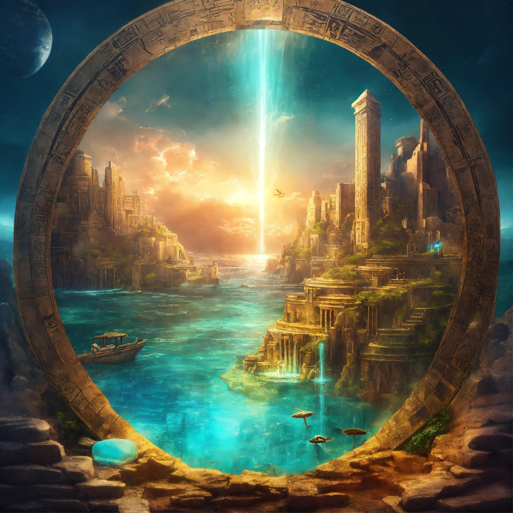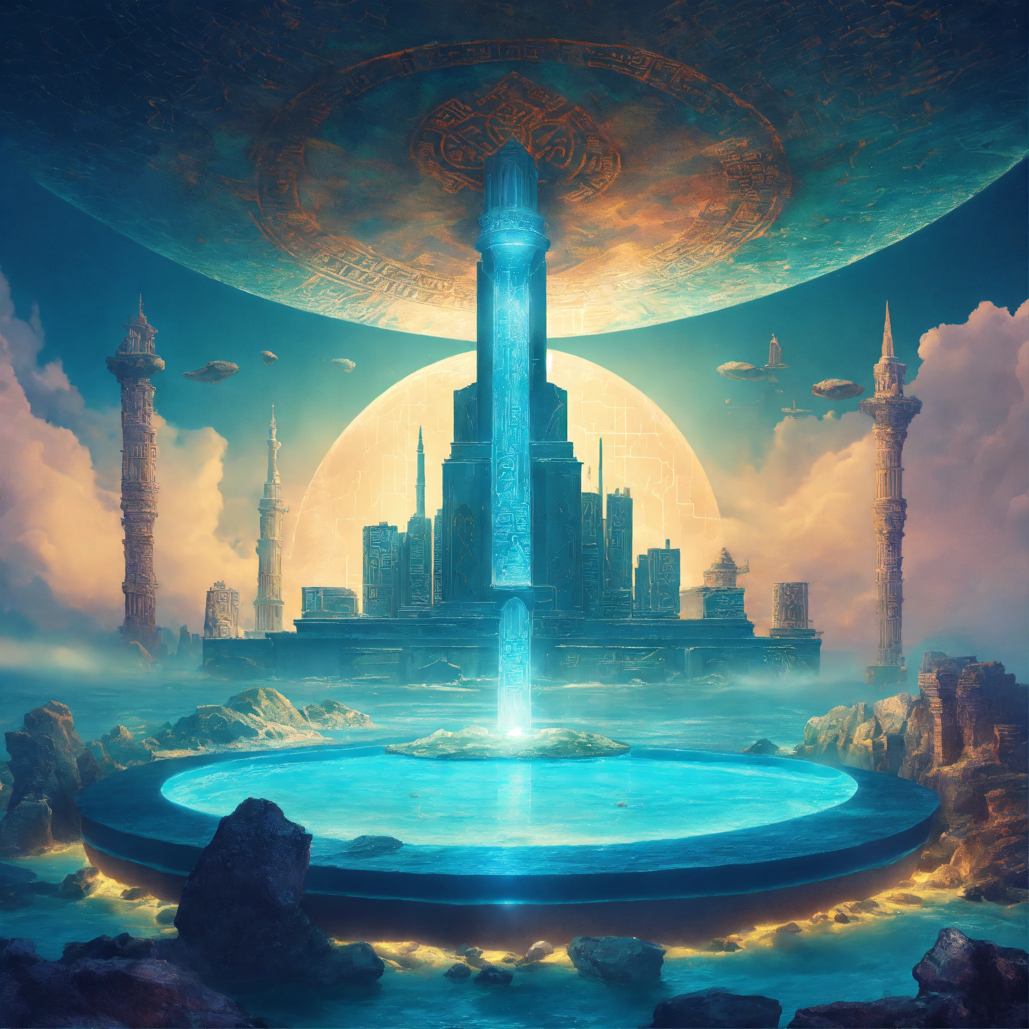 The city of atlantis views a little bit far with a radiant stone in the middle giving his power in surreal abstract style more cool tones and with a layer of ancient hieroglyphs radiating power
