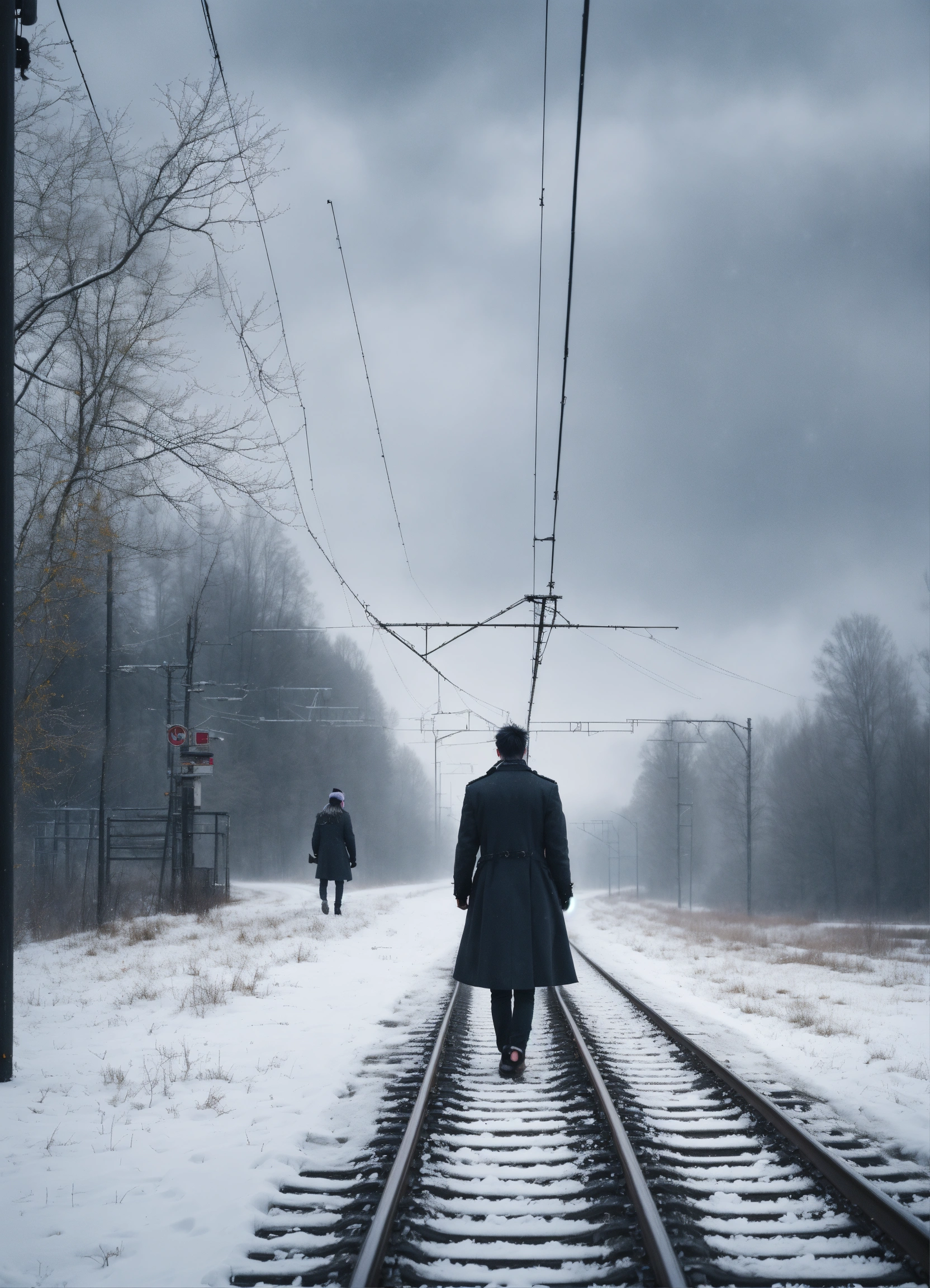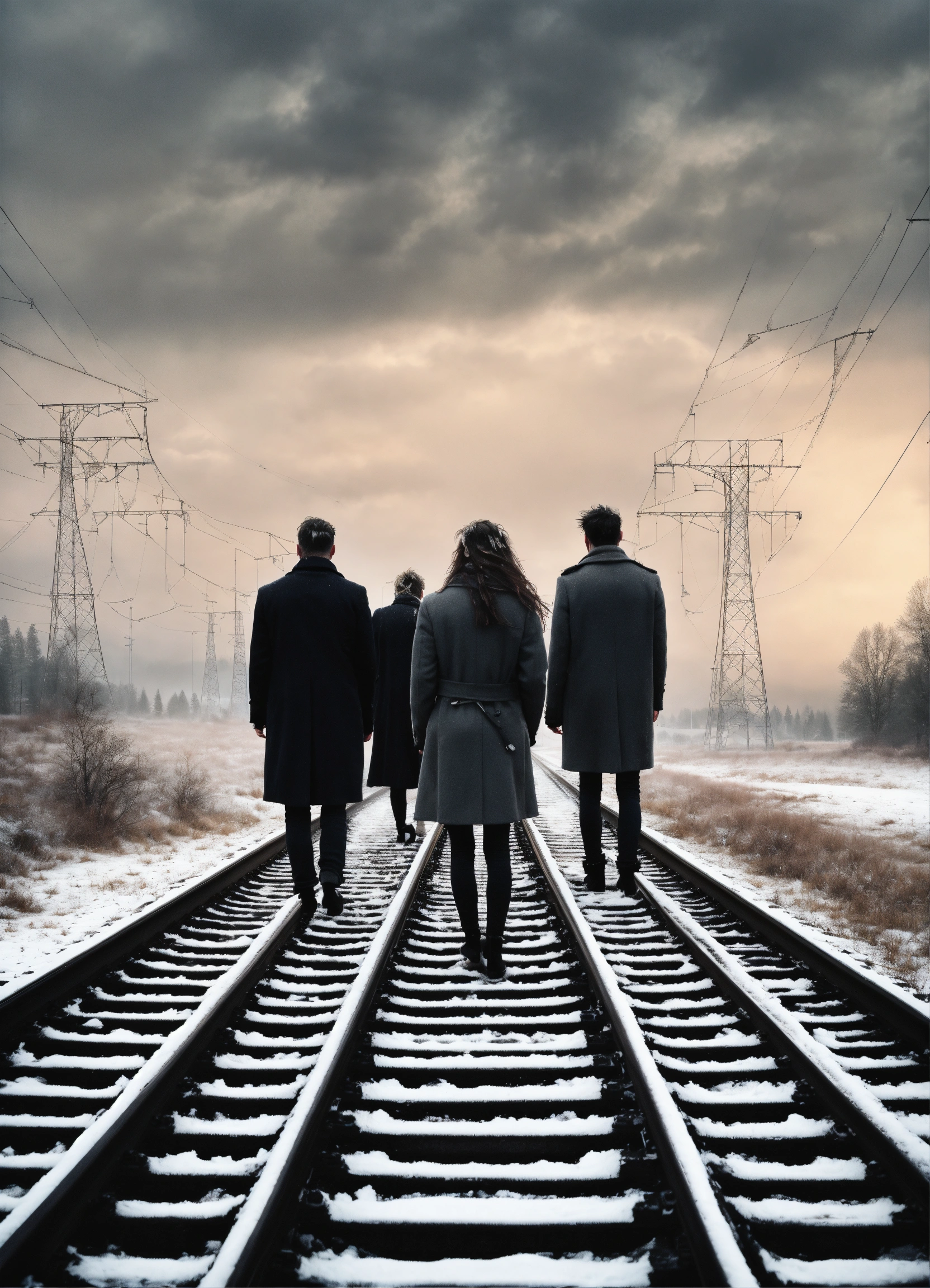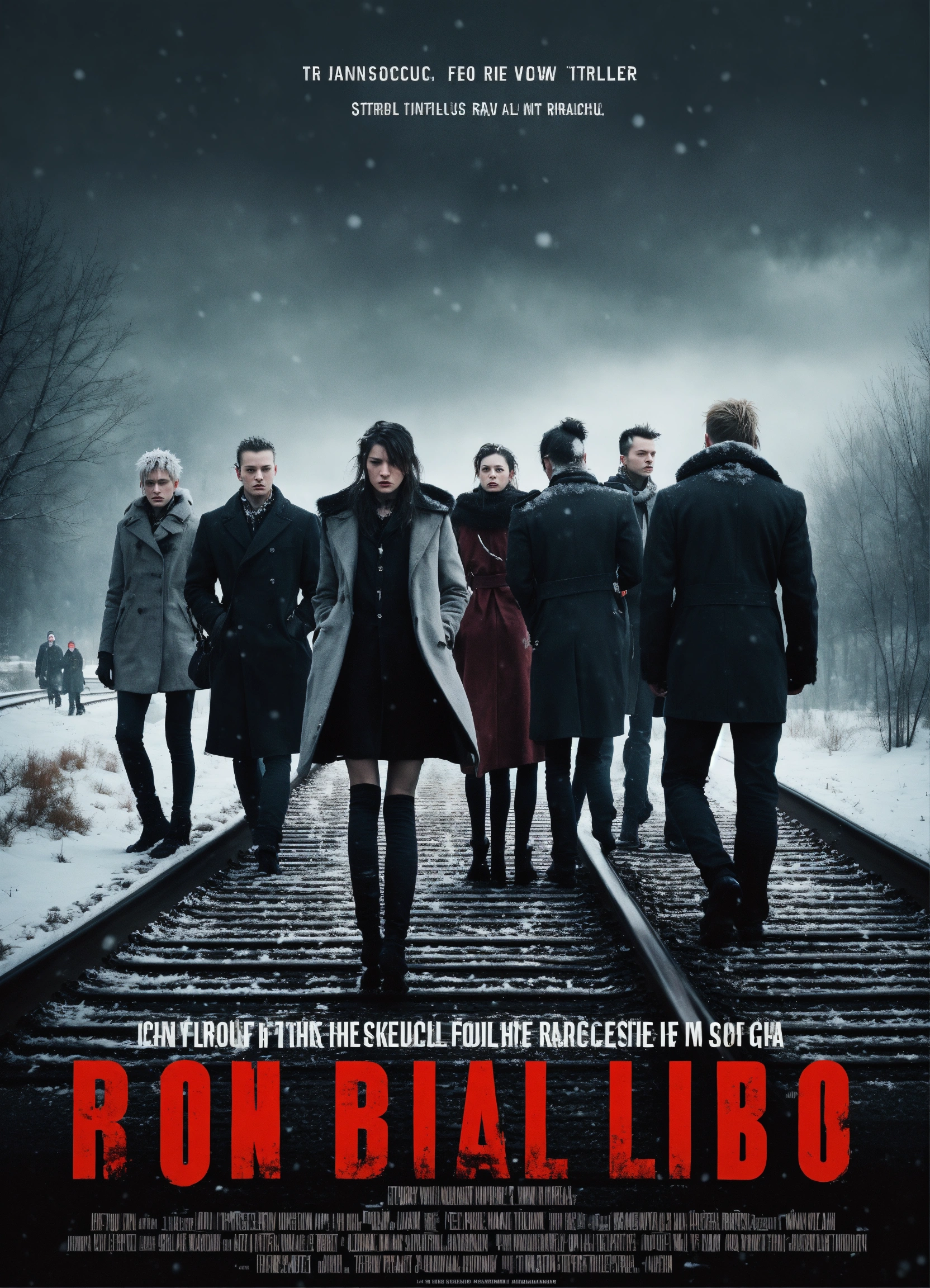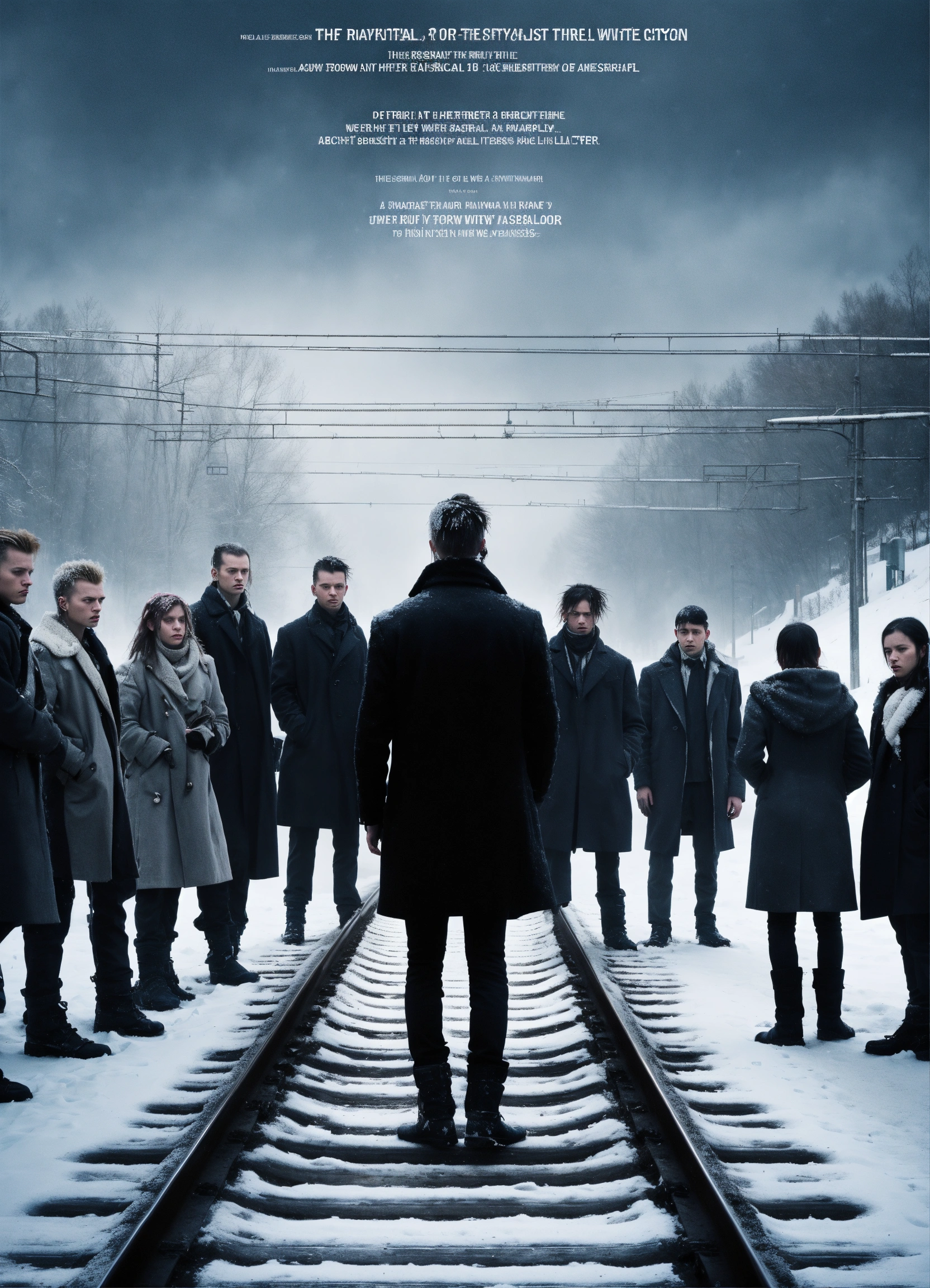 Beautiful psychological thriller movie poster. on the railway tracks stretching into the distance, a group of 10 men and women stand with their backs to us. they are barefoot, dressed in punk rock attire. no faces. winter background. a lot of snow. the color scheme is gray, in scandinavian tones. noir.
