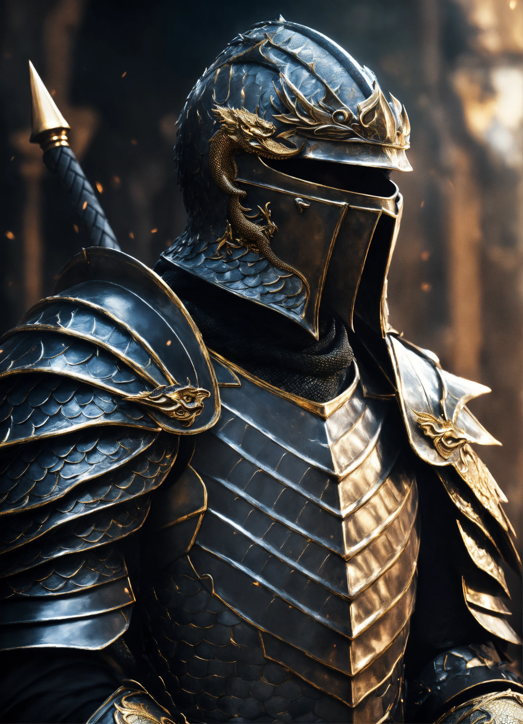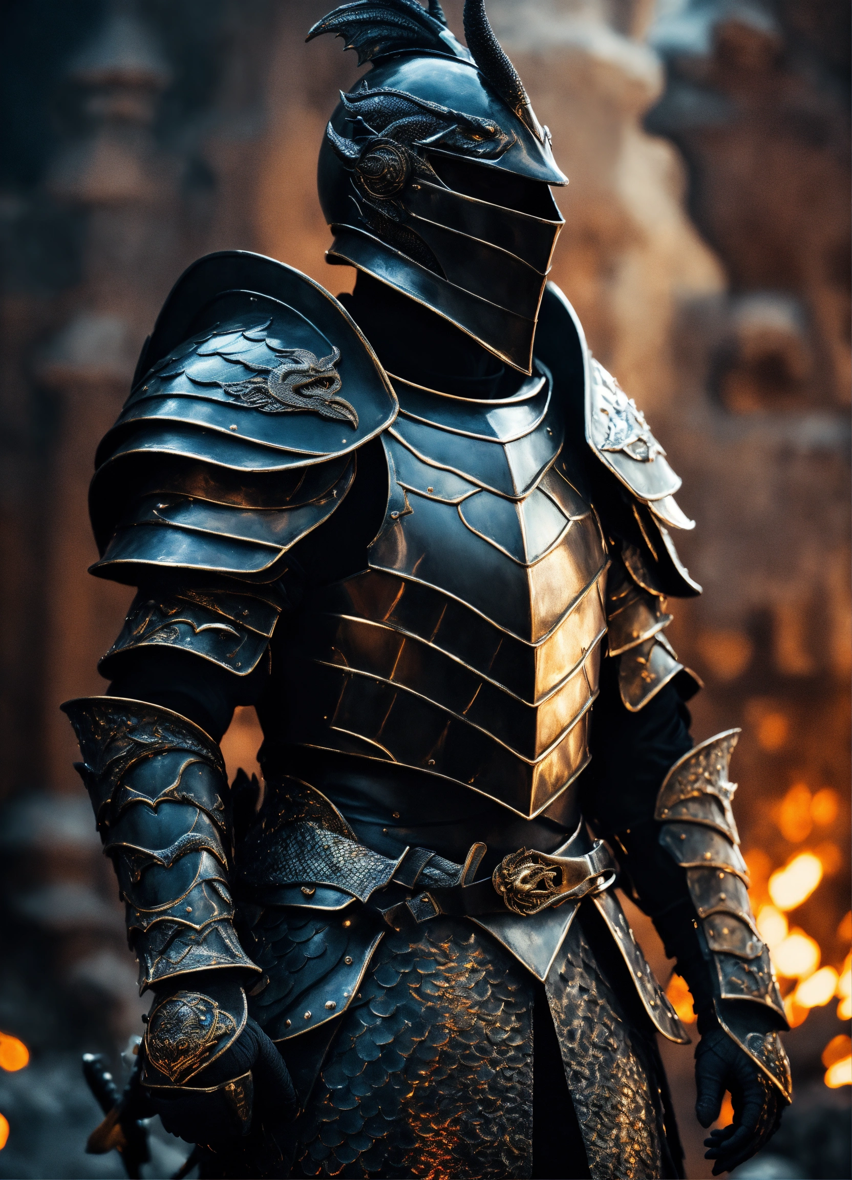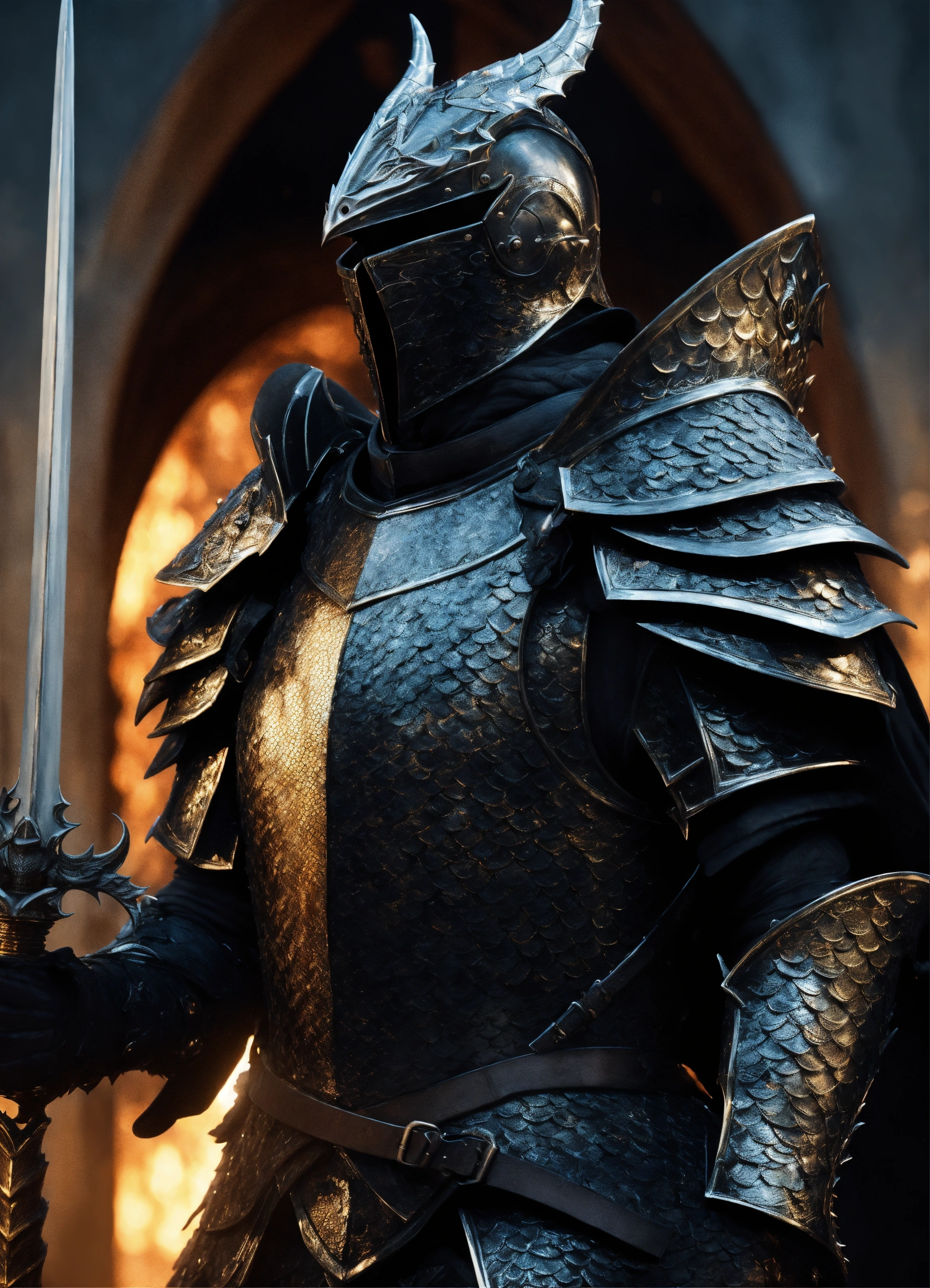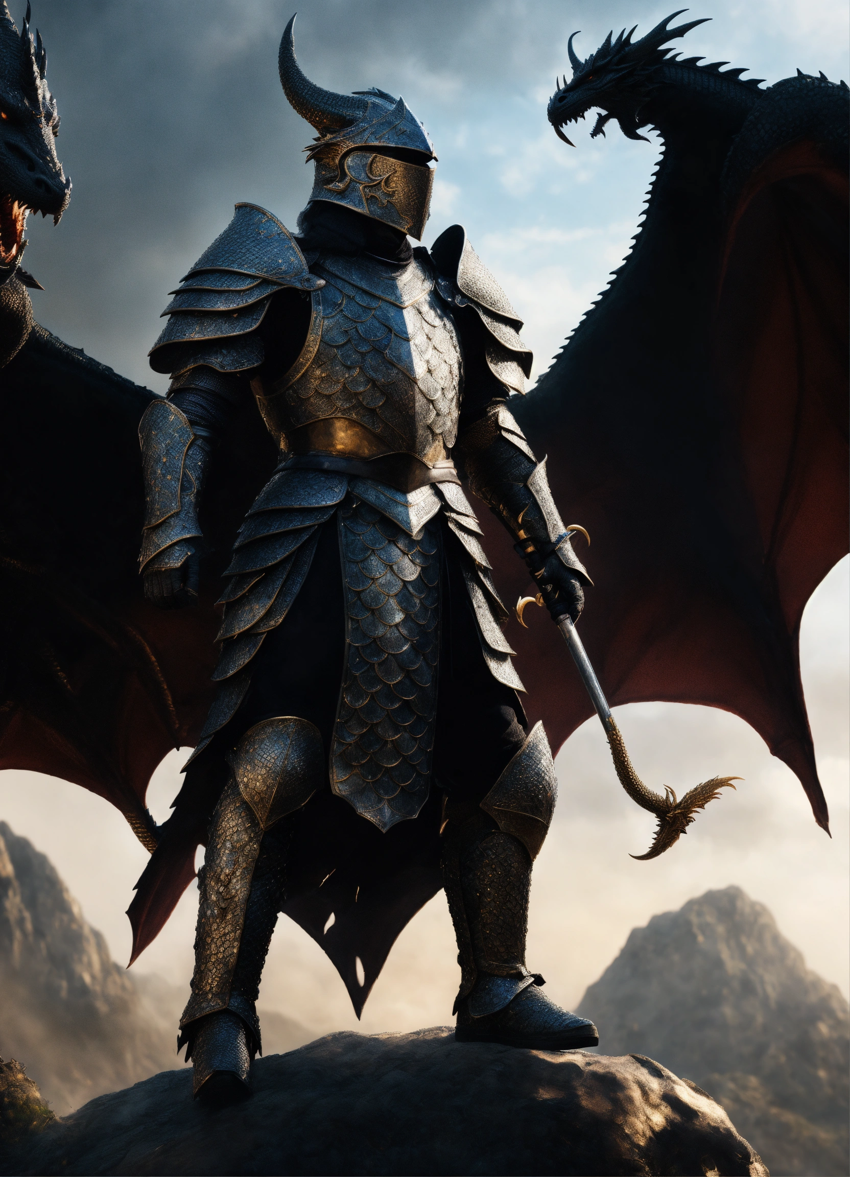 Knight with a black armor, adorned with dragon scales behind the dragon, fantasy, high detail, realistic photo, high detail, digital painting, cinematic, stunning, hyperrealistic, sharp focus, high resolution 8k, insanely detailed
