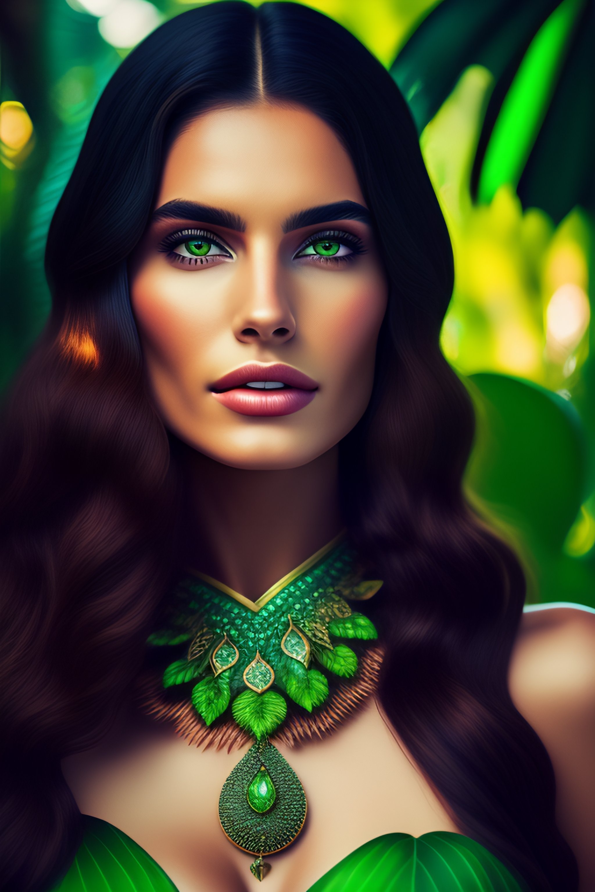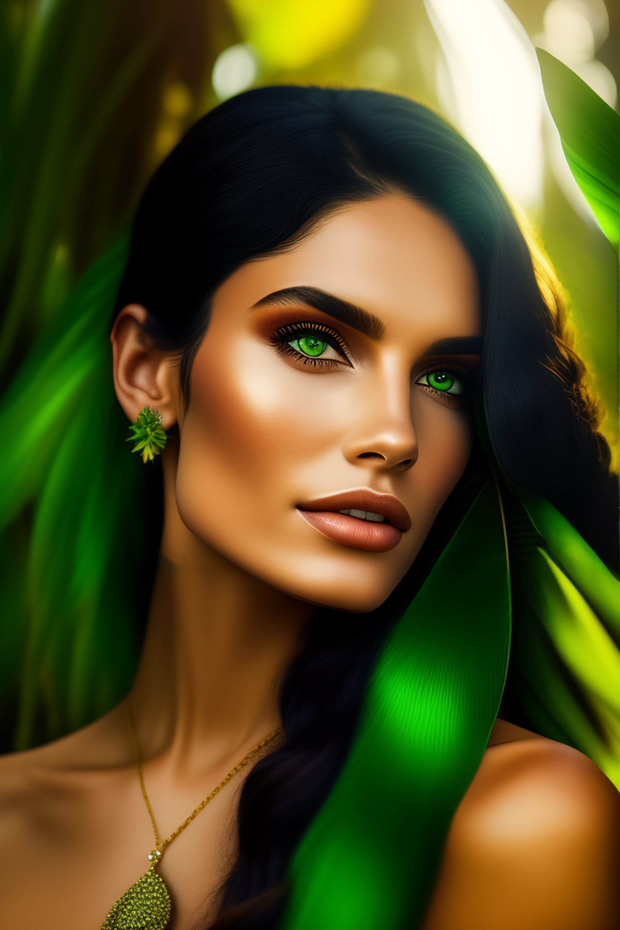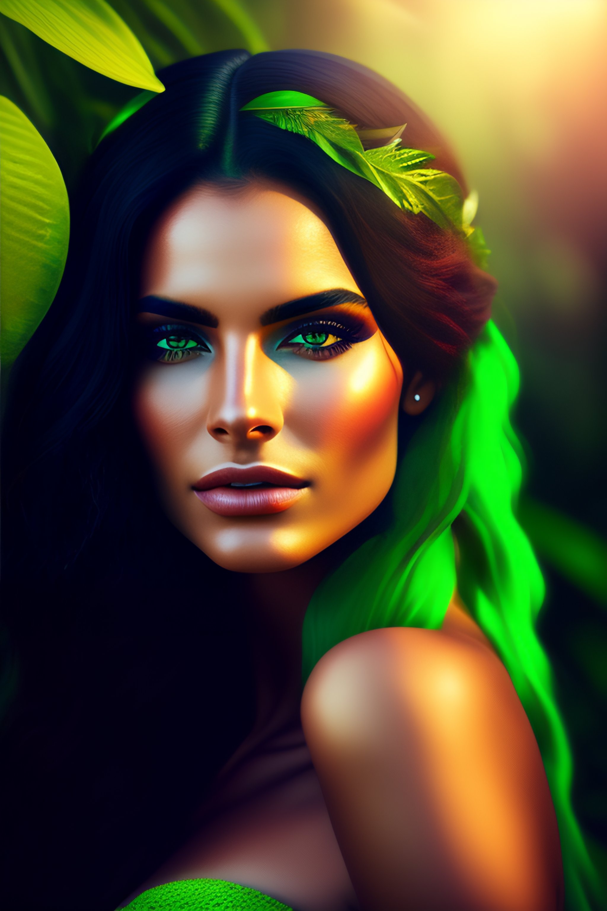 Portrait of a beautiful nature goddess gorgeous brunette brazilian model by flora borsi, ((green dyed hair, flirty green eyes, pointed ear)), soft light, ((ornamented flowers jewelry)), tropical forest, roots, grott, ((flora borsi)), sharp ultra hd