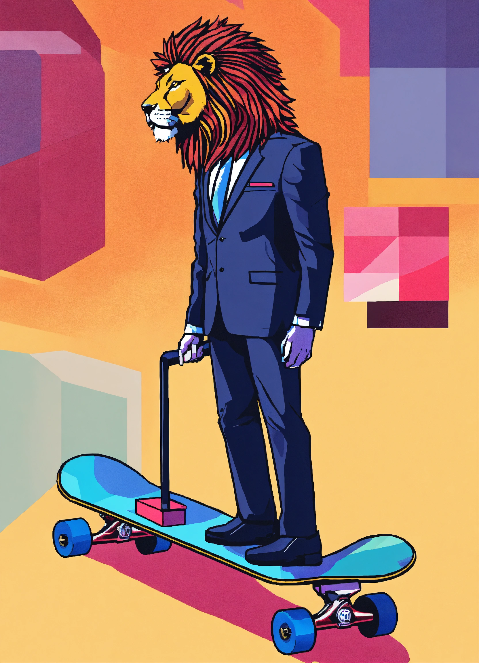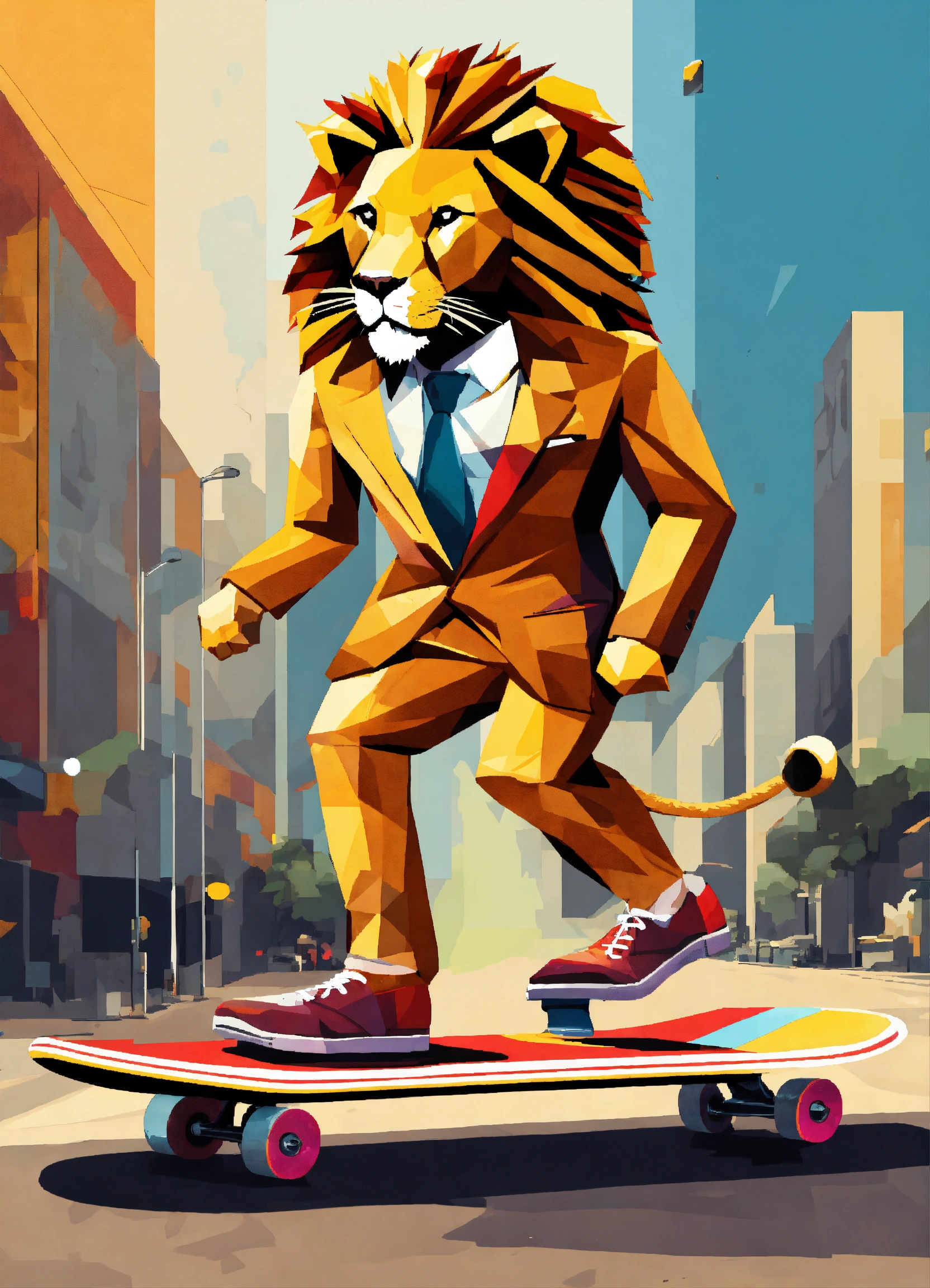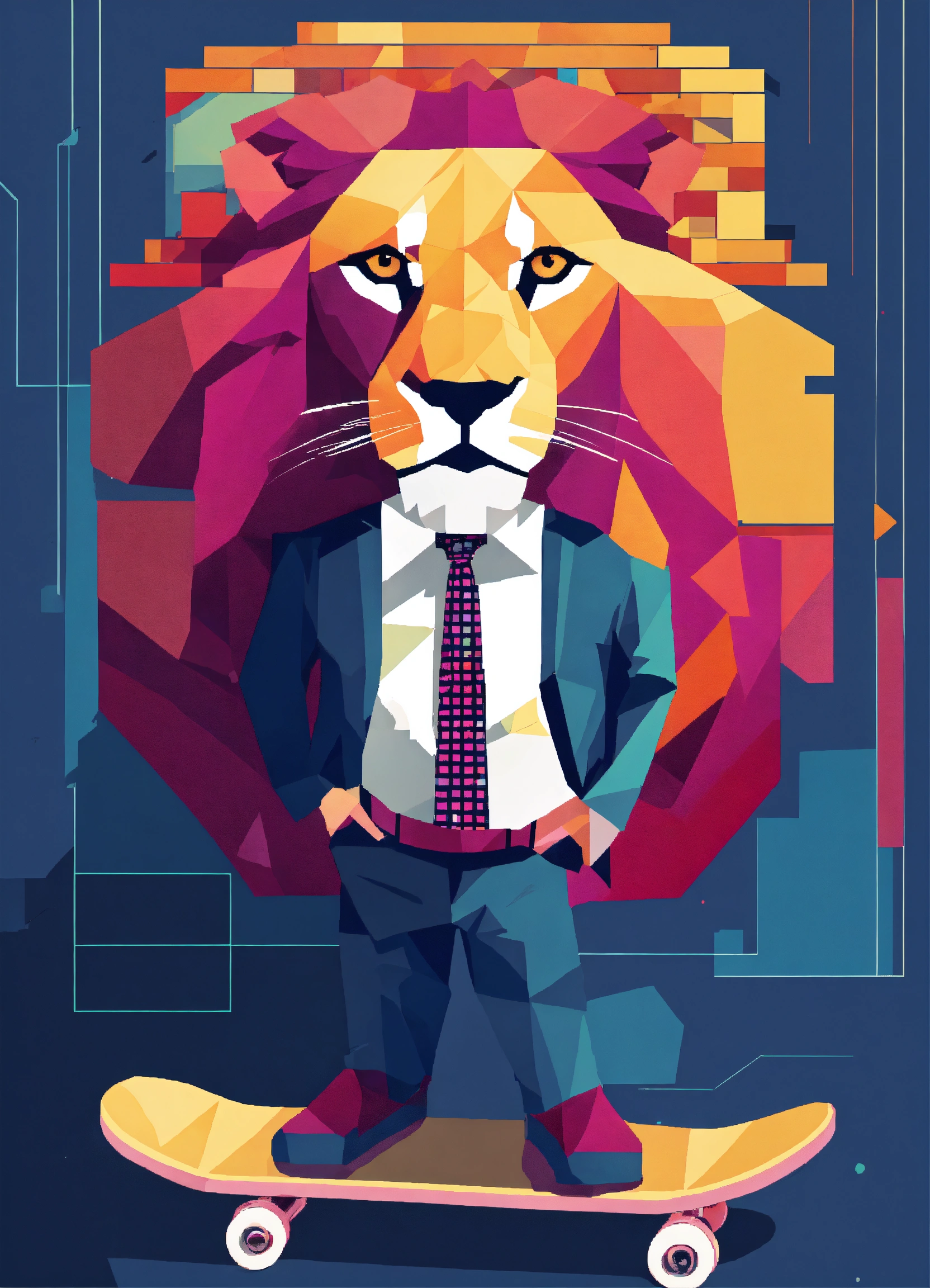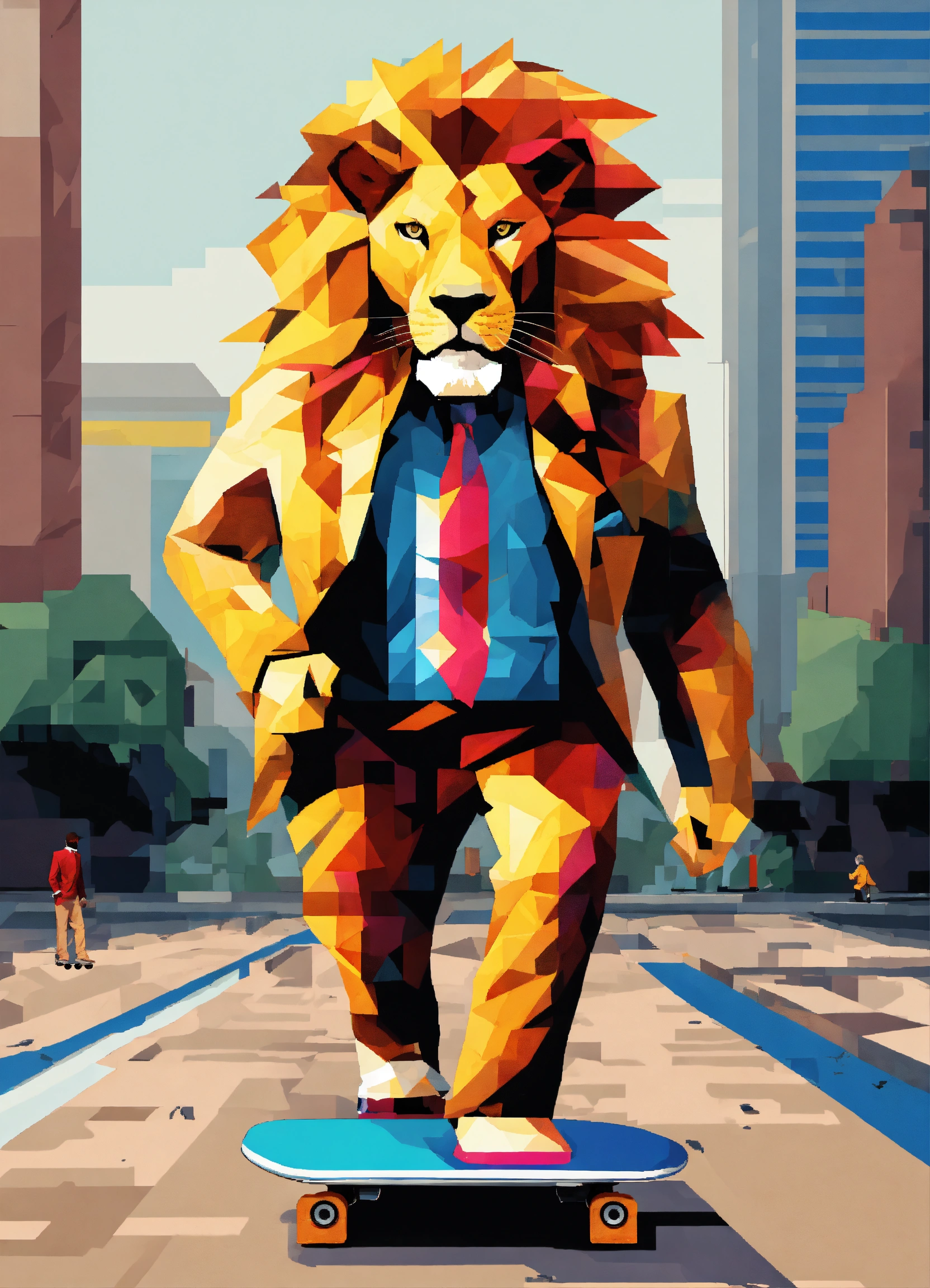 Lion with human body and business suit on skateboard abstract in pixel head on