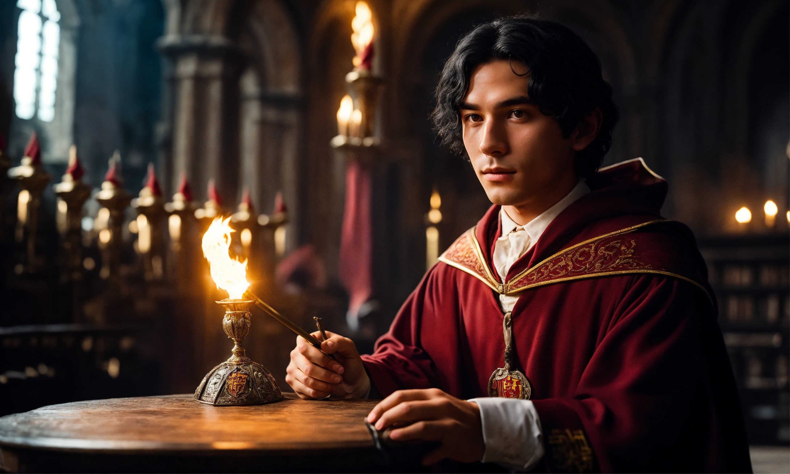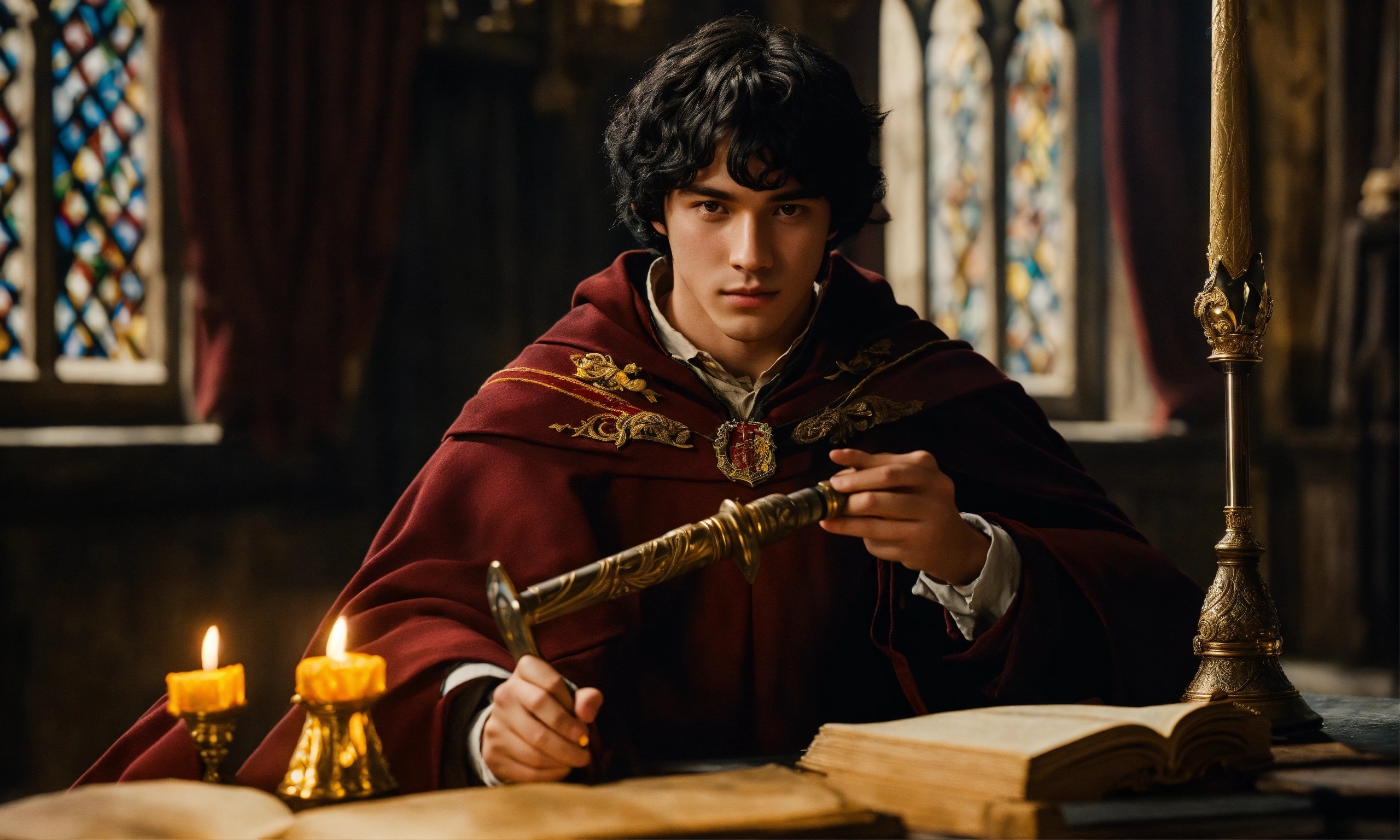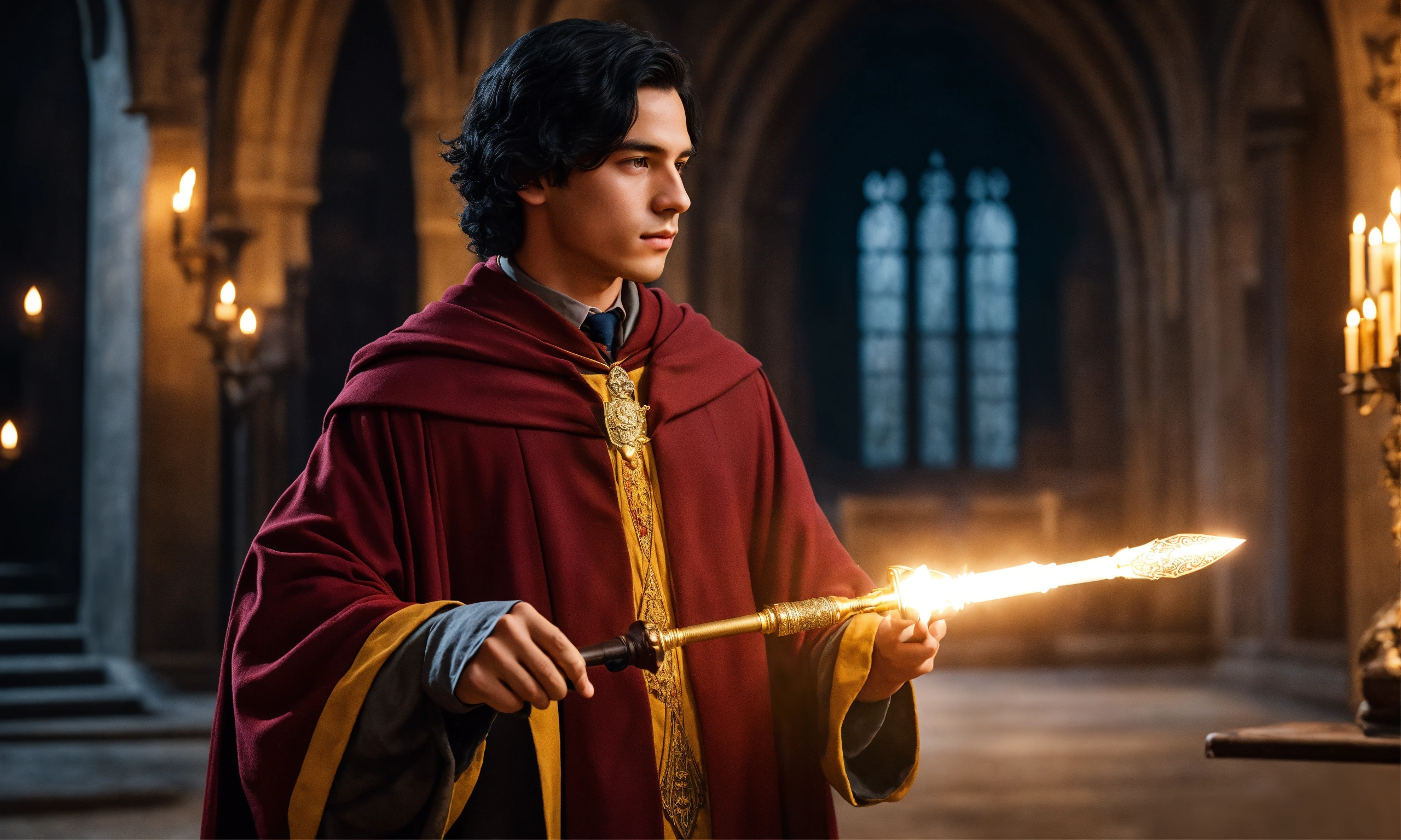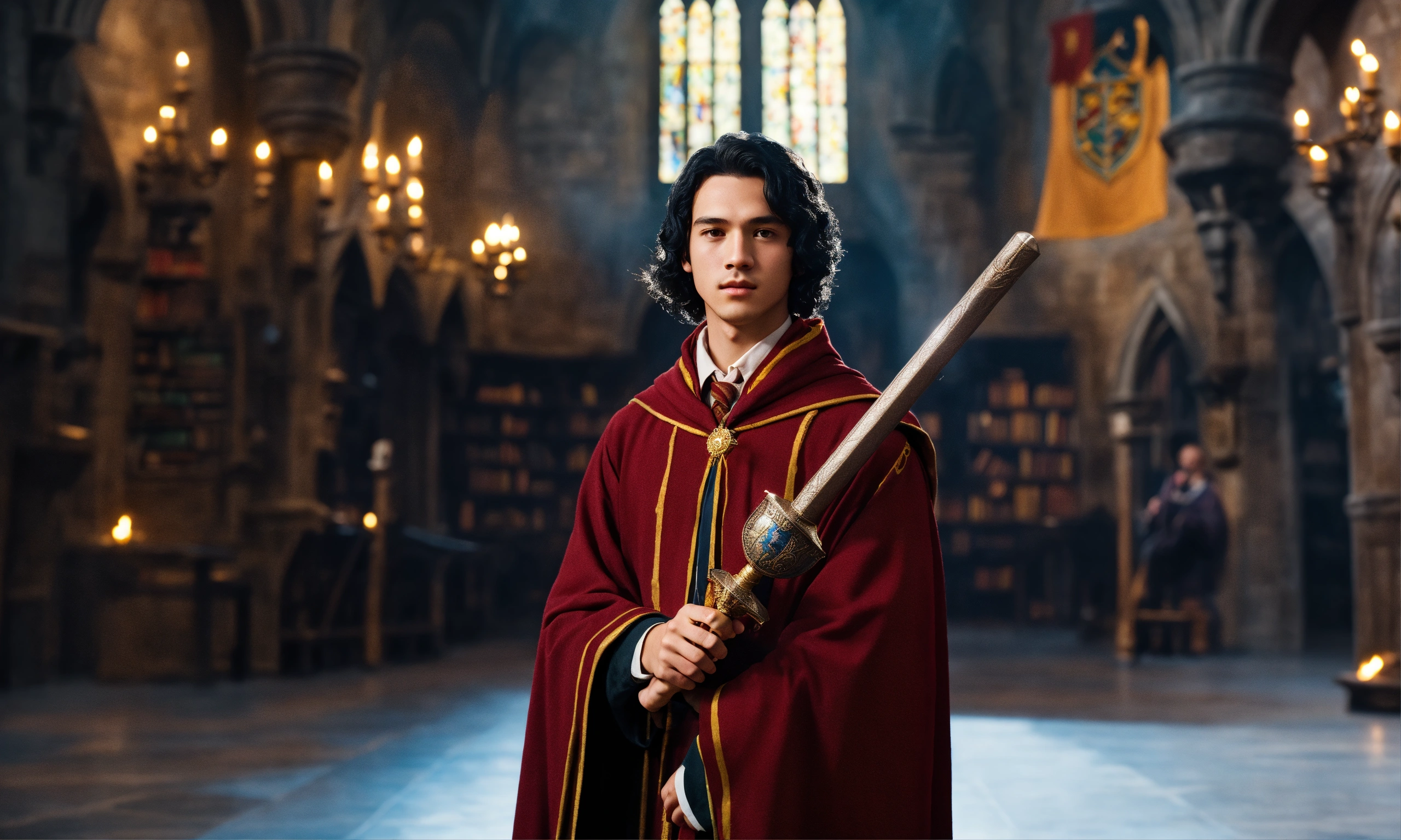 Man young wizard, inside hogwarts with a mystical scepter in his hand 2023 year, gryffindor, without fingers without showing them, black hair
