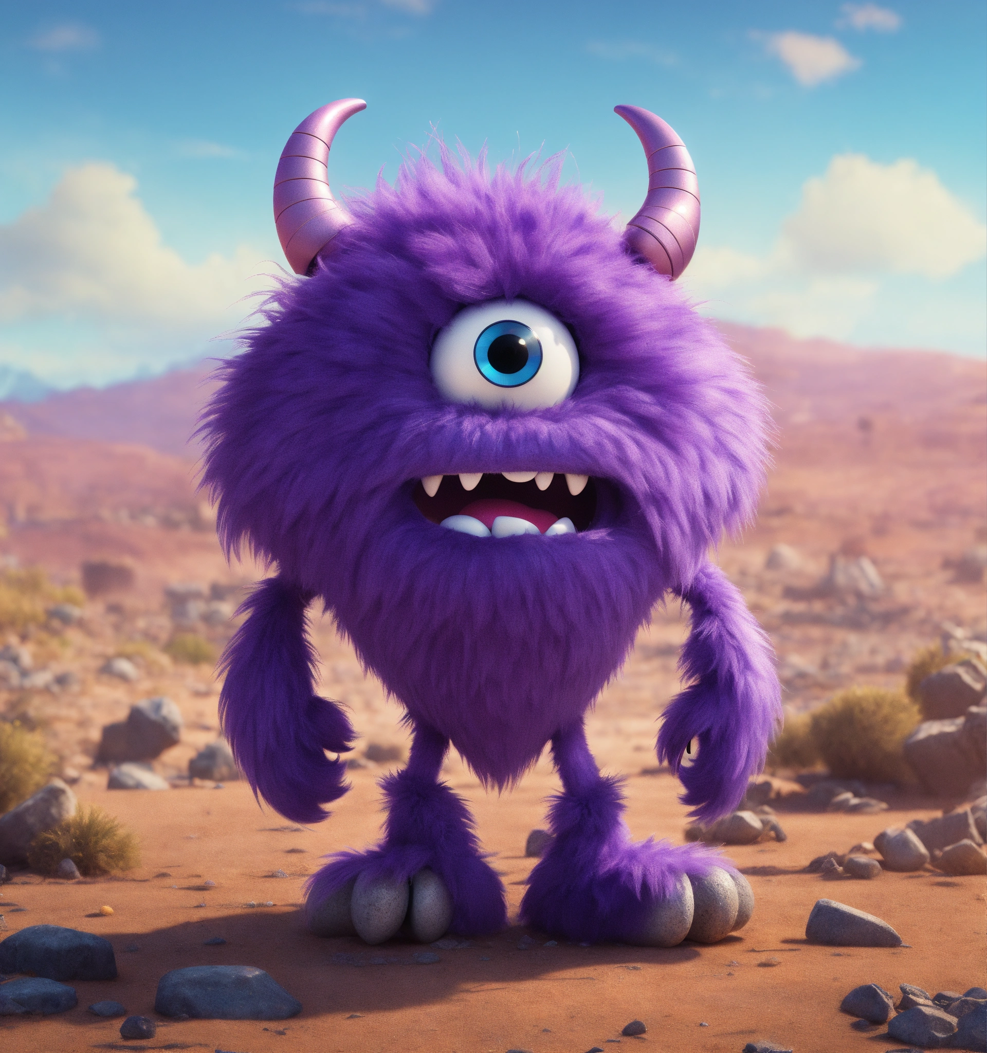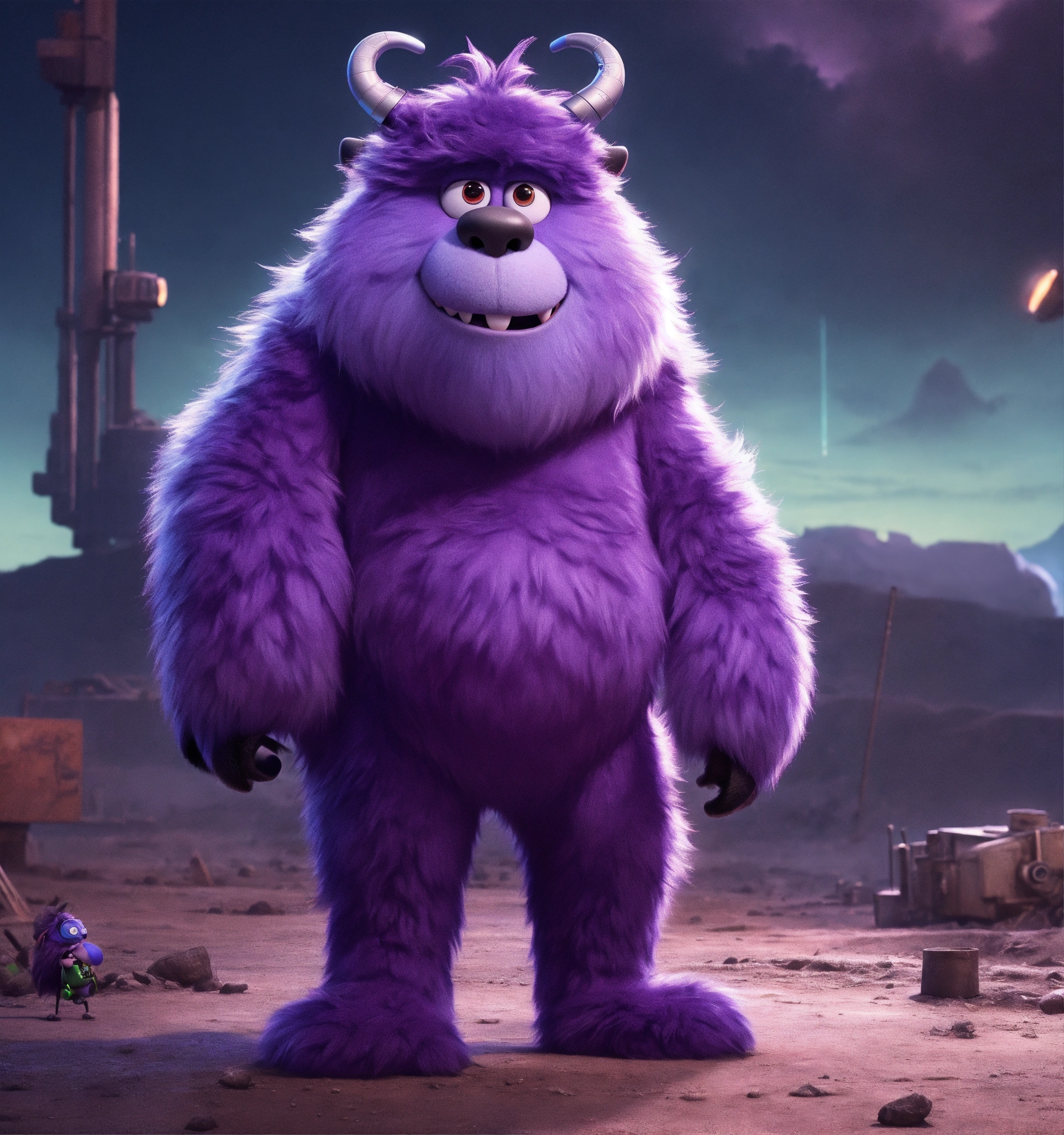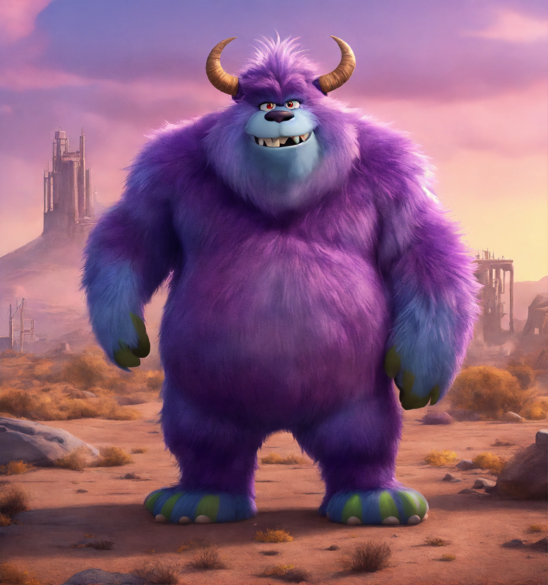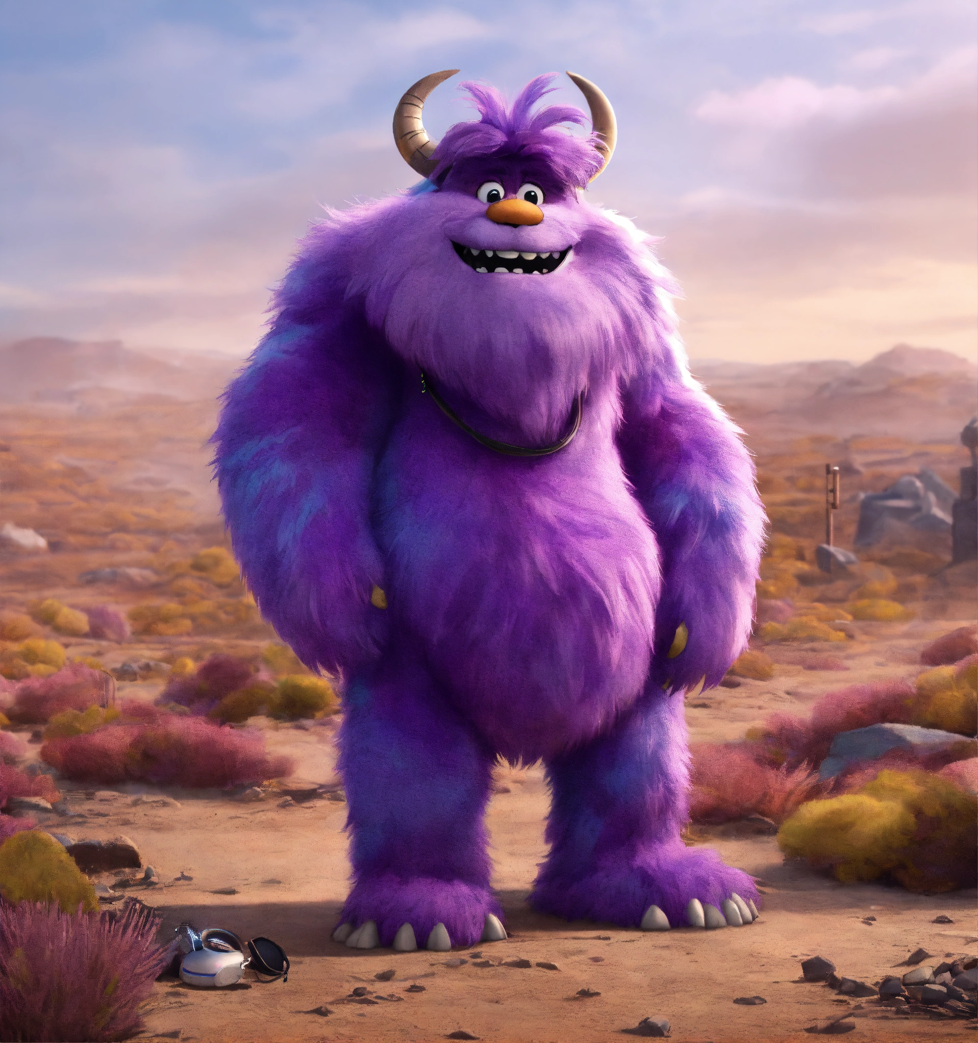 Zoom out on the full body of a big, fun loving, hairy, tall, violet fur, monster cartoon character wearing hi tech earphones, standing in a desolate wasteland, pixar, disney