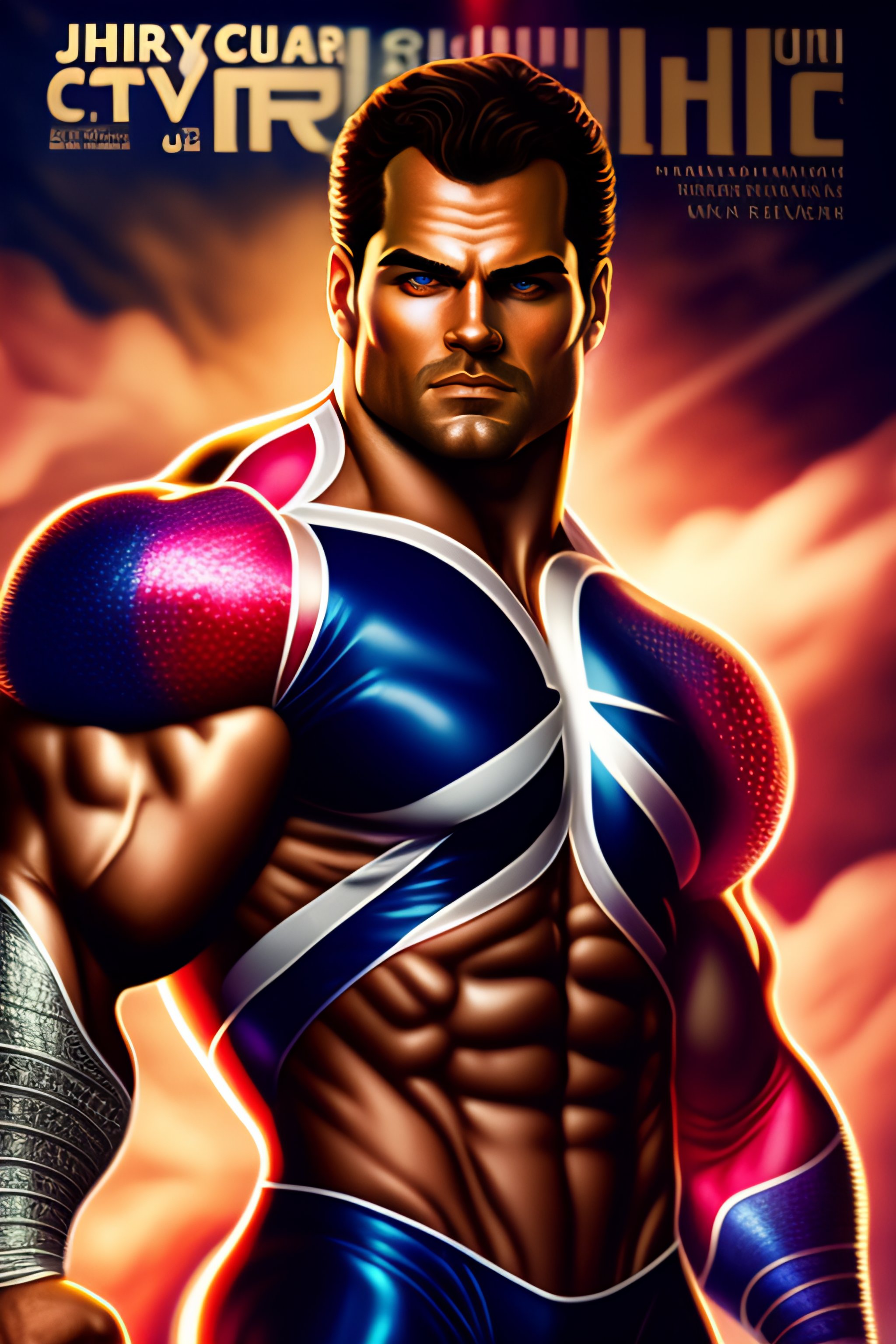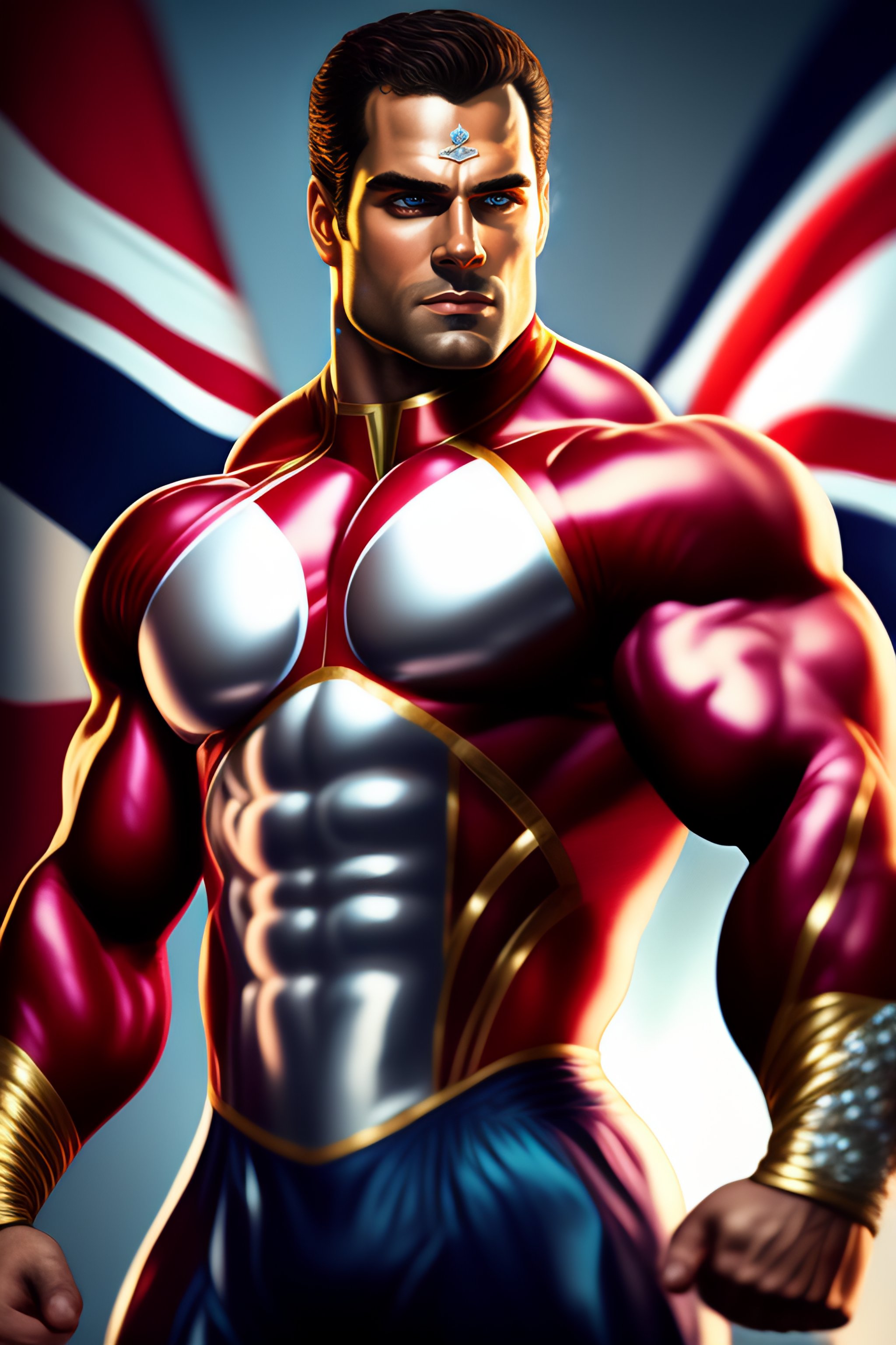 Epic comic book cover, accurate hyper realistic henry cavill as muscular bodybuilder superhero captain britain posing in a dramatic fighting stance, wearing an glossy metallic intricate patriotic british superhero costume with short sleeves codpiece and union jack chest logo, slight smile, cleft chin, dark hair, british iconography and heraldry, london city in the background, insane detail, intricate, 8k, sharp focus, cinematic, artstation, dlsr photography, photo by bruce weber photography