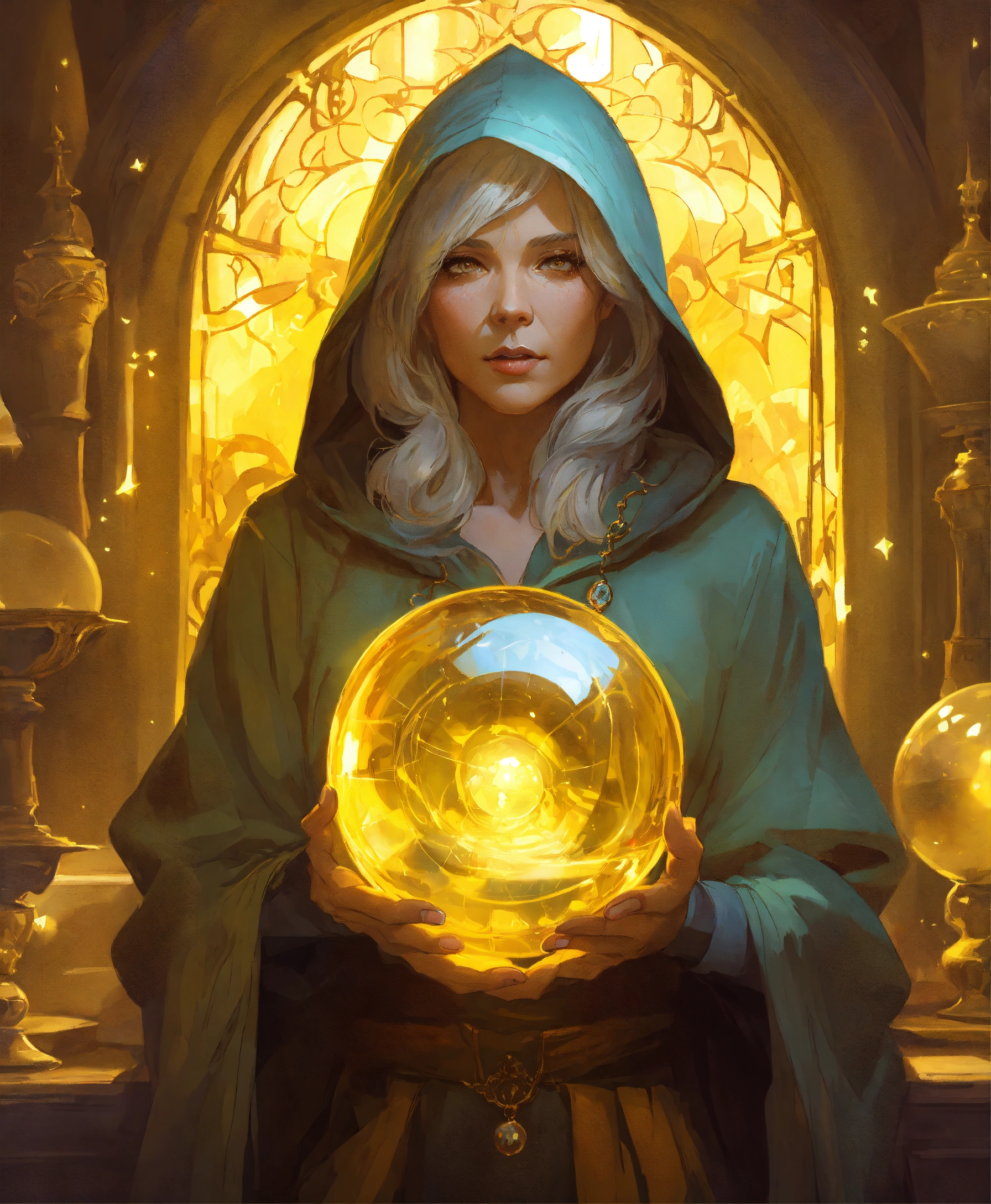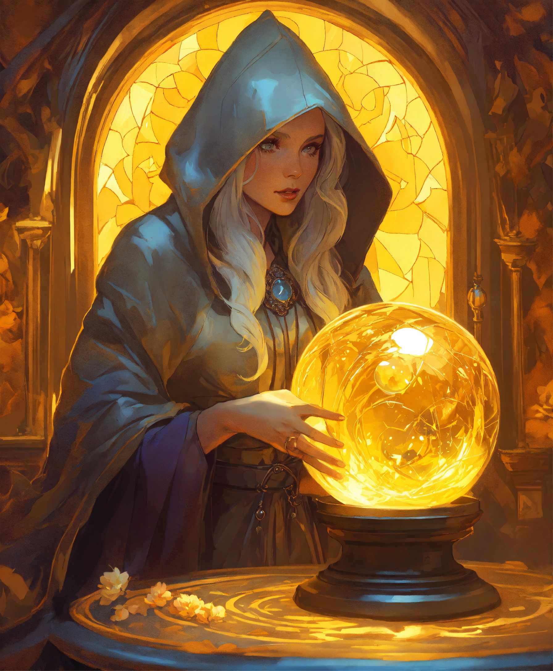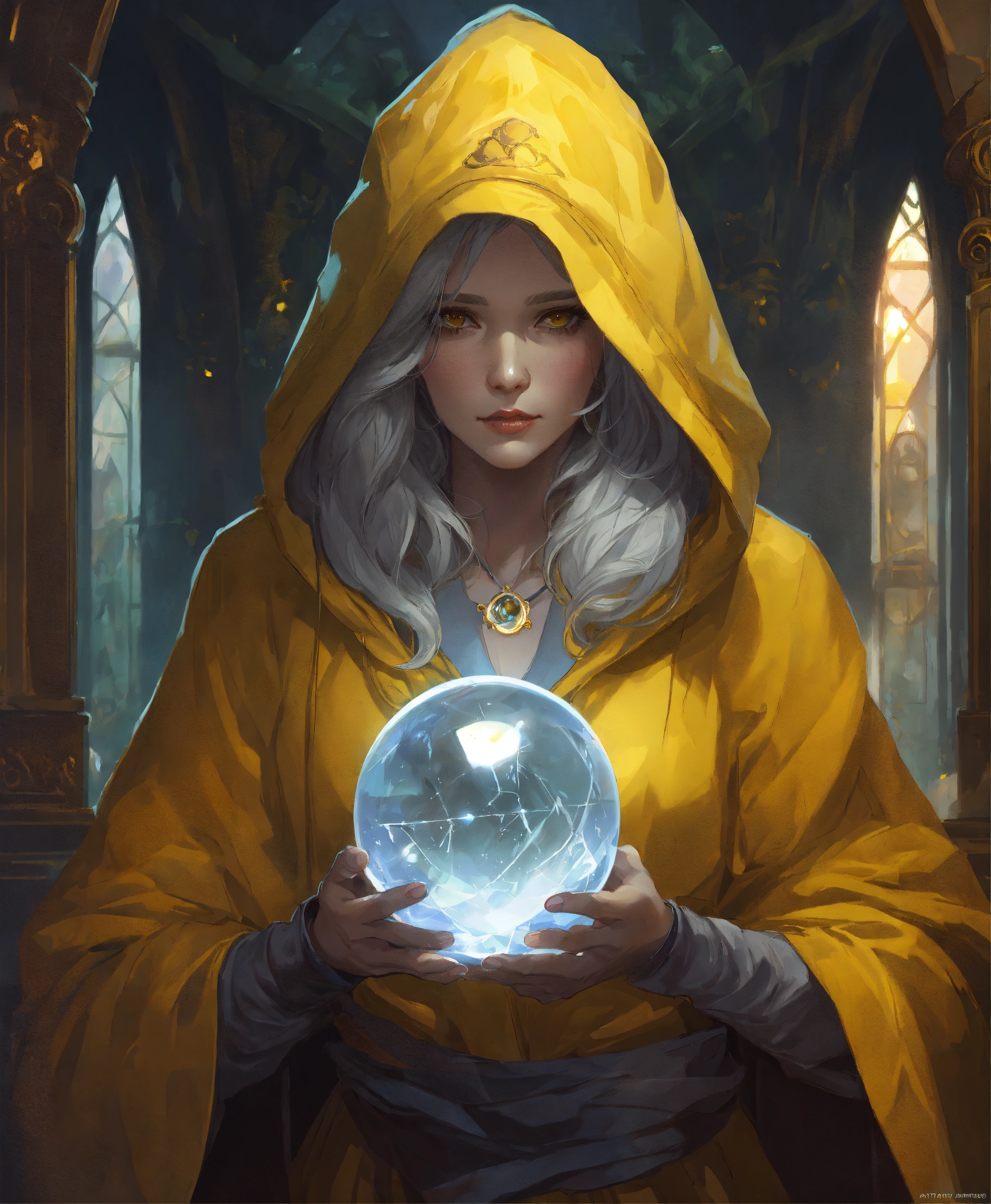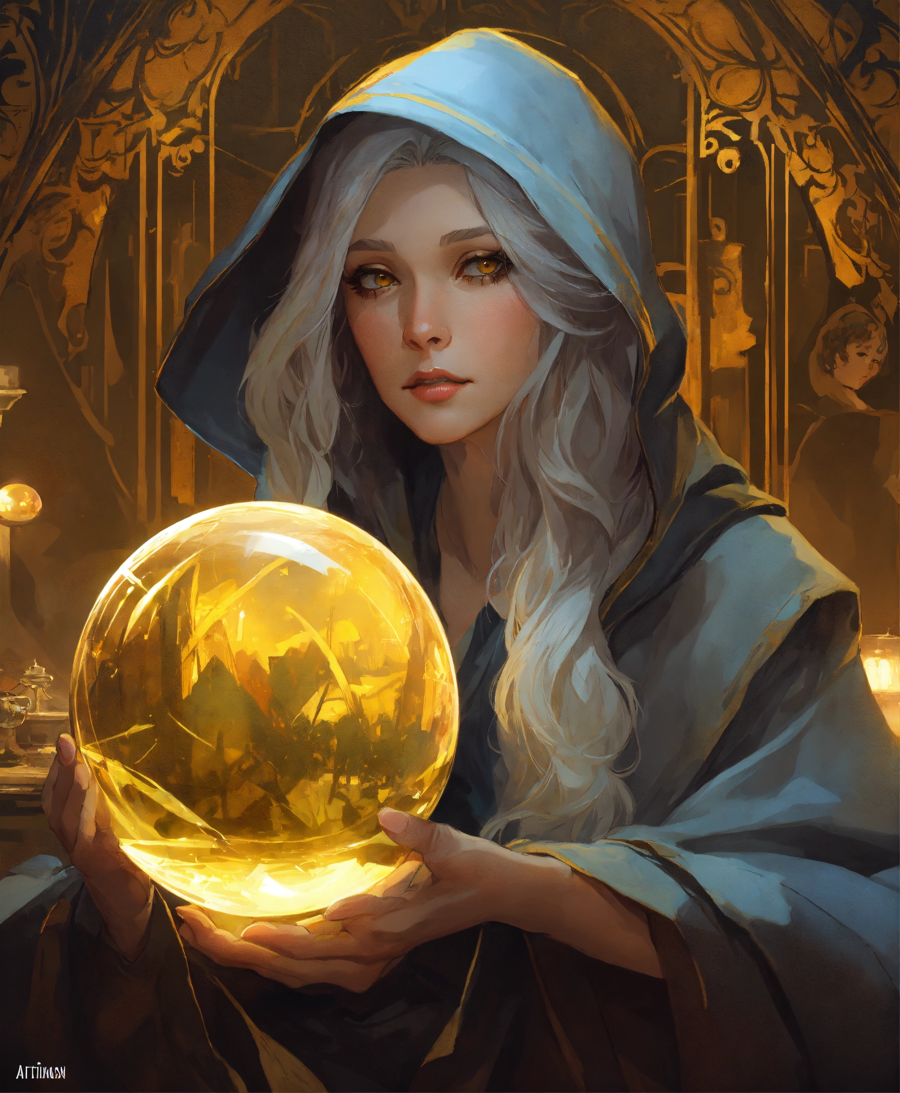 Hooded old aged wrinkled medium witch future seer witch adivination room crystal ball, dark yellow clothes, gray hair, old aged, art by artgerm and greg rutkowski and alphonse mucha and loish and wlop, artstation, illustration