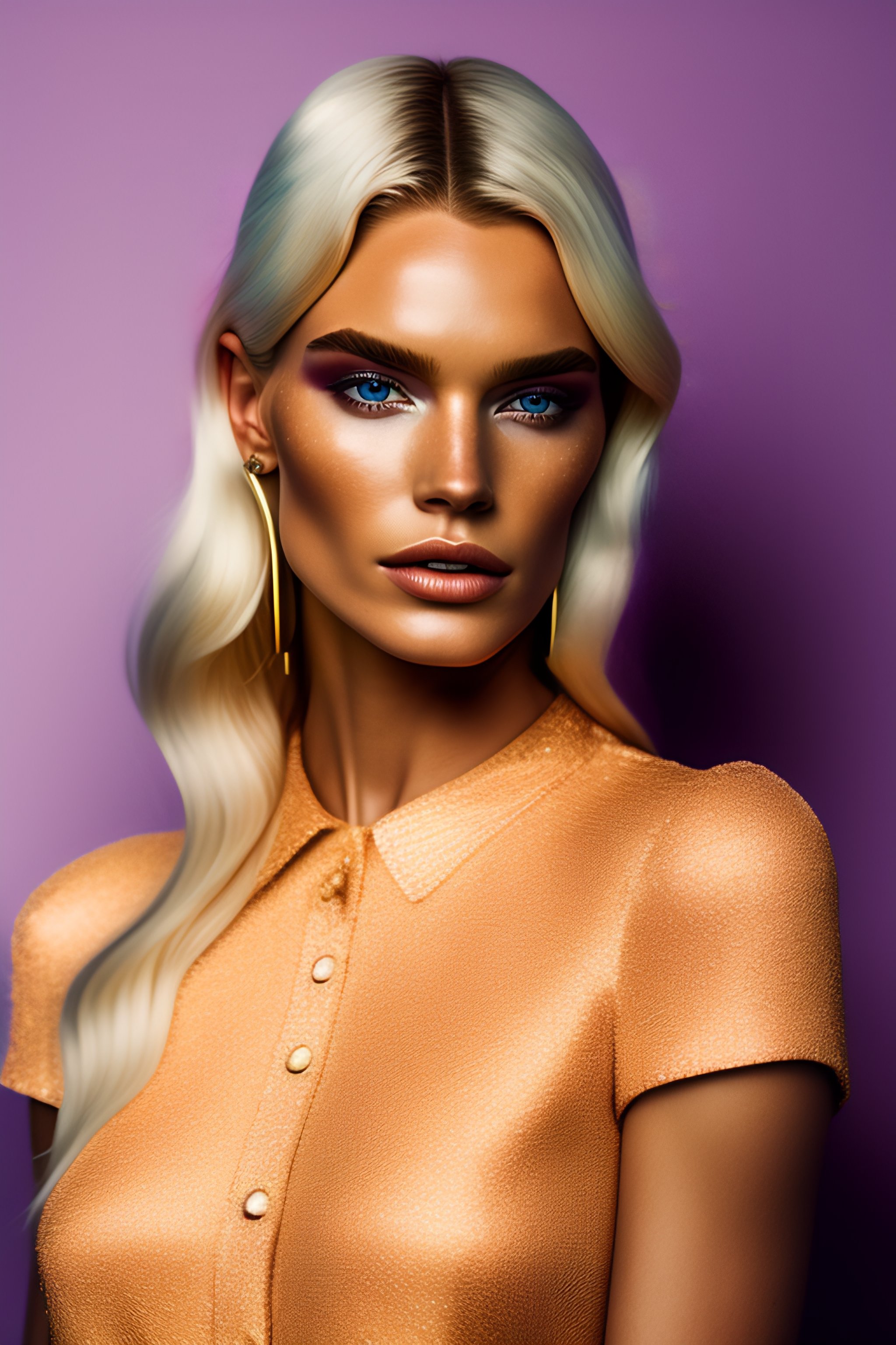 A photo full body of a beautiful blonde woman with freckles, fashion editorial, studio photography, magazine photography, pointed nose, blurry background