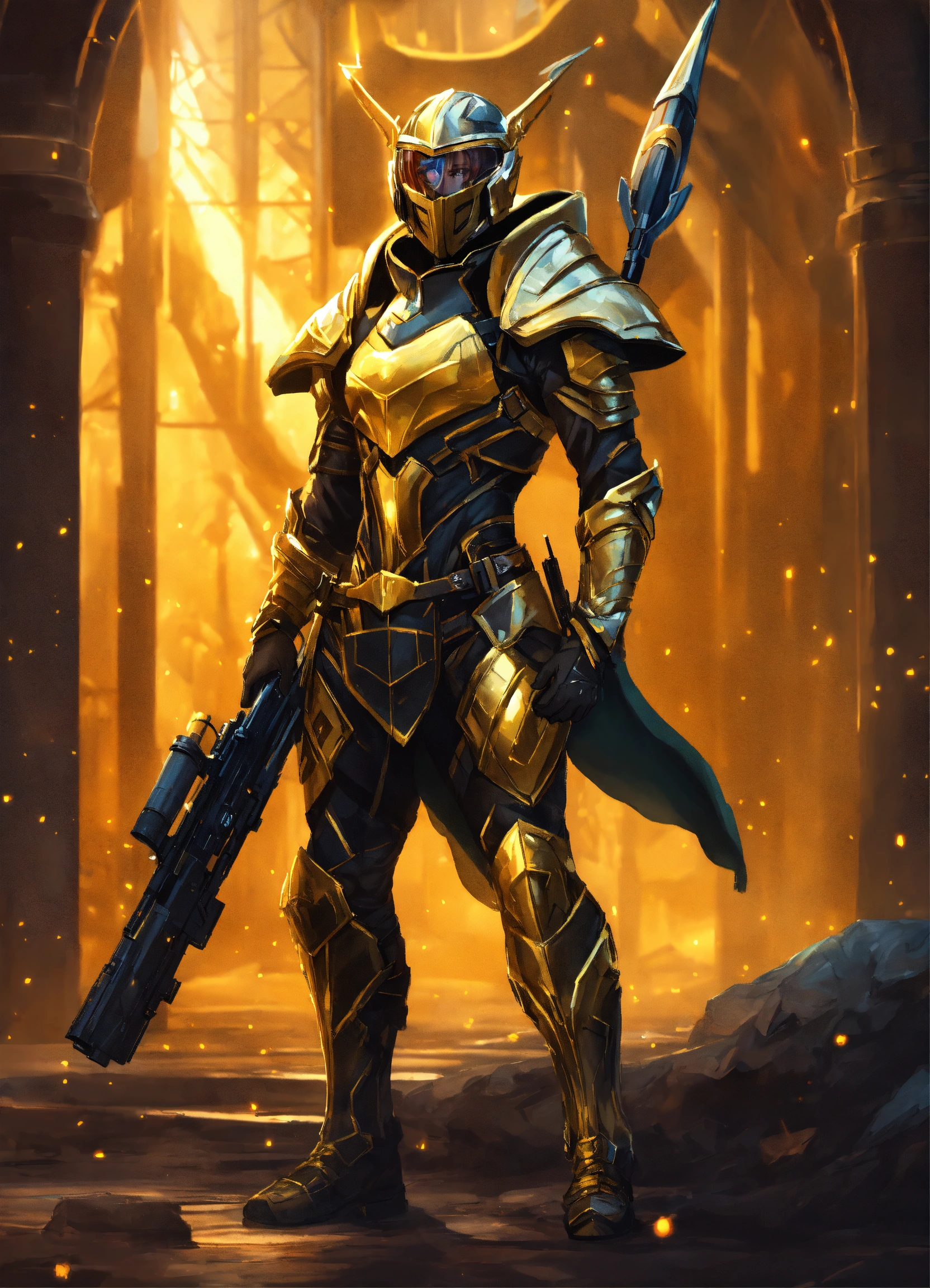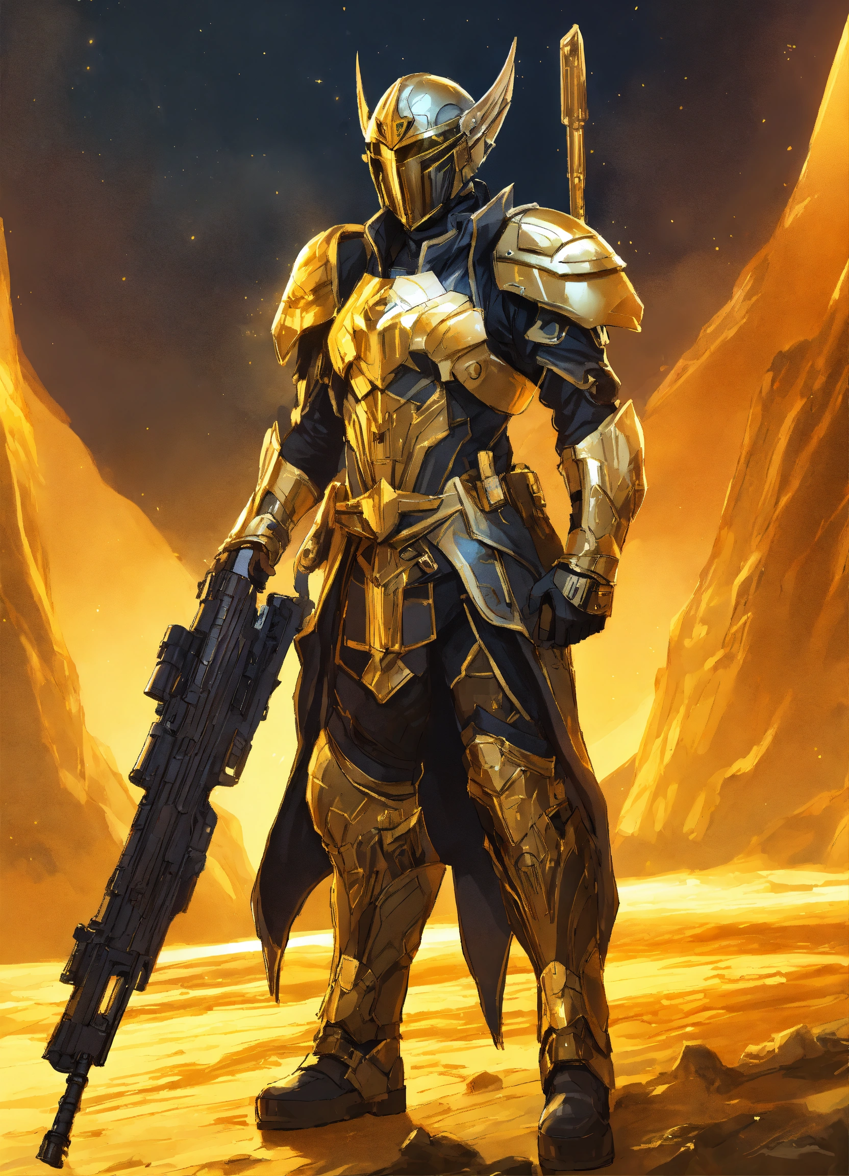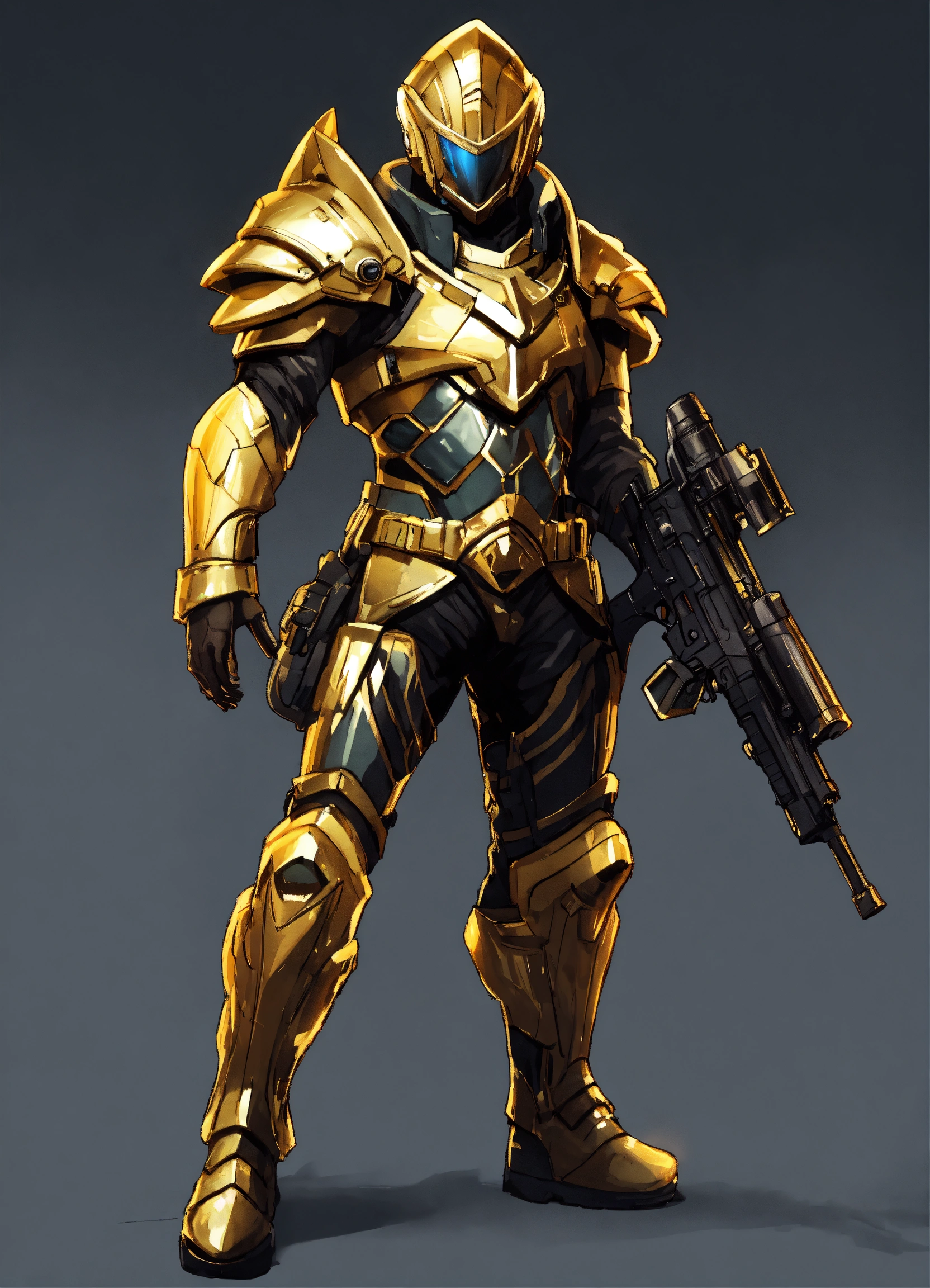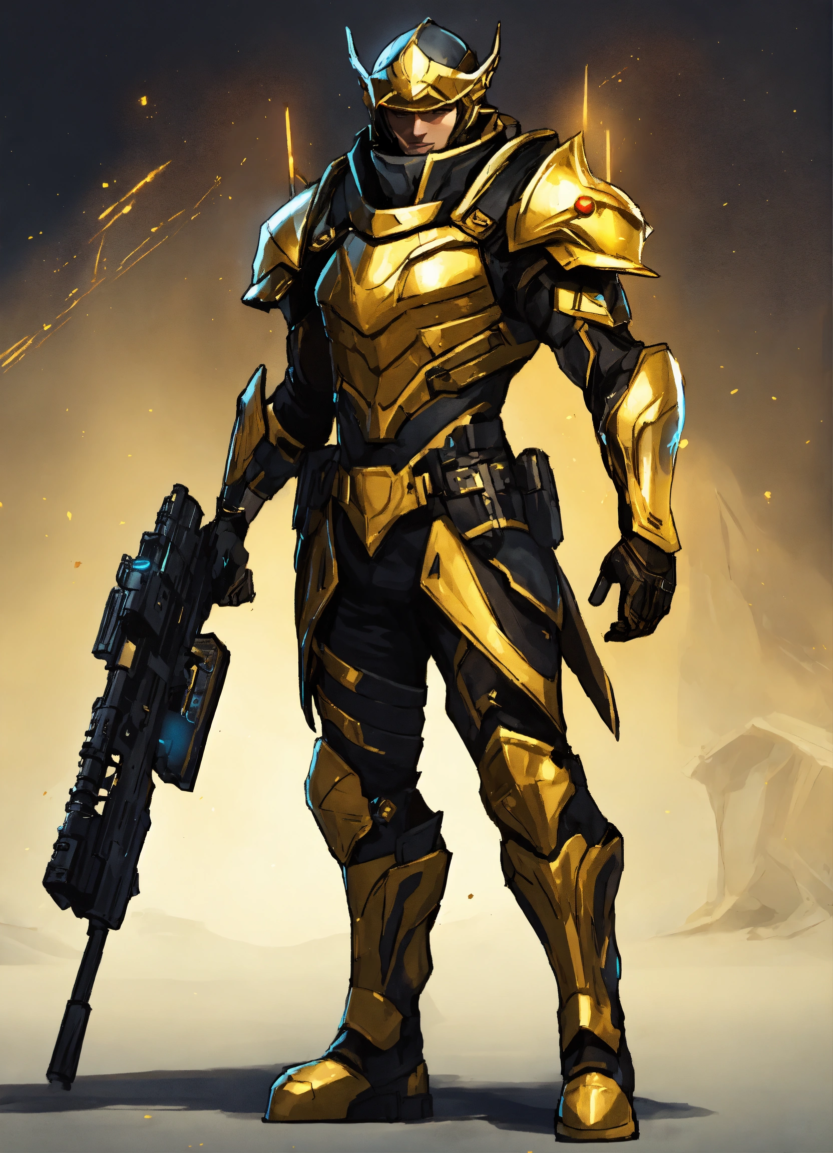 Full body cartoon art of a high elf sci fi soldier wearing heavy sci fi elven armor, black and gold armor and helmet, visor, boots, male, holding a light machine gun, full body, hd