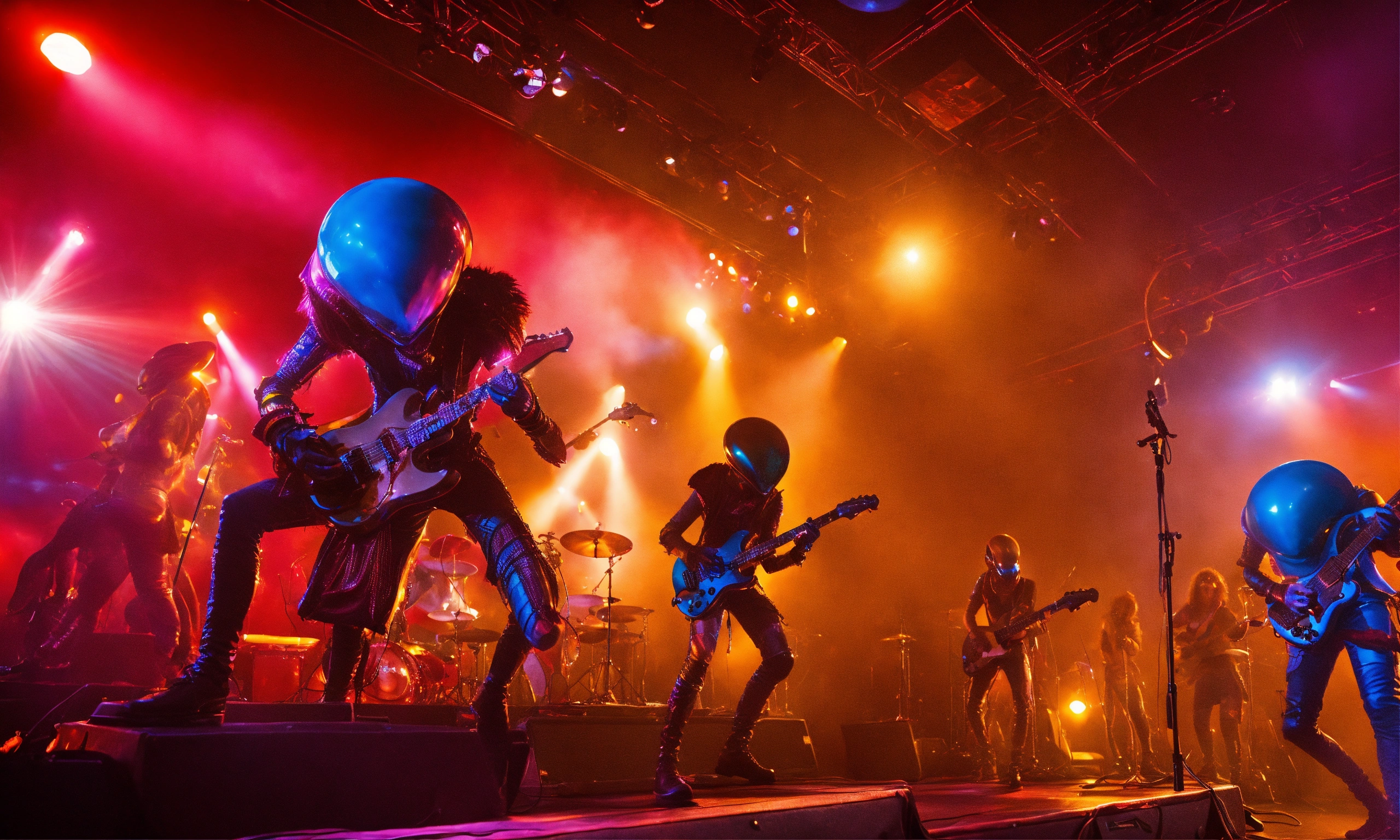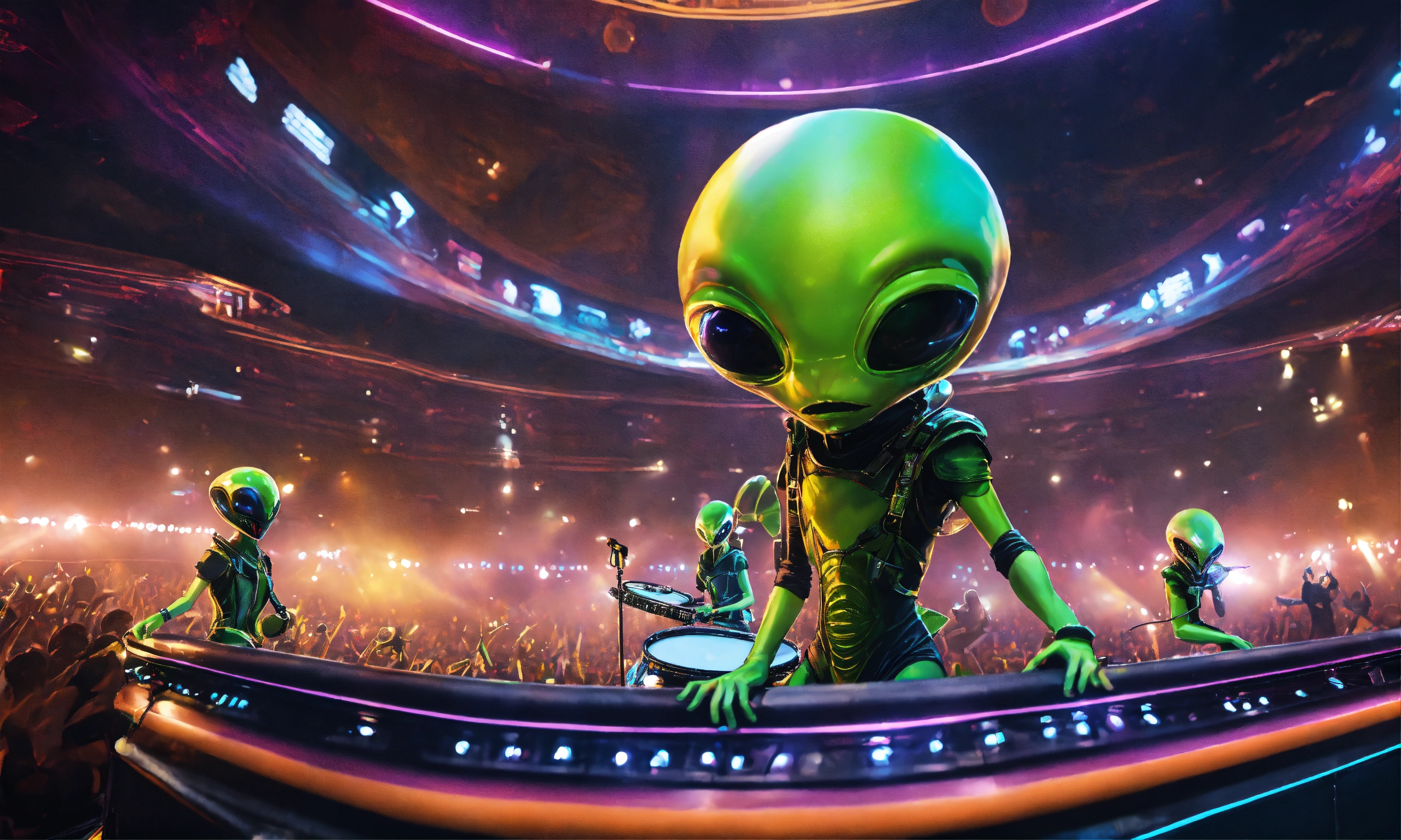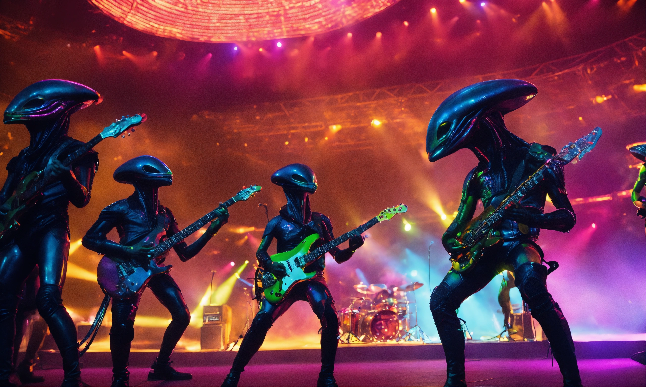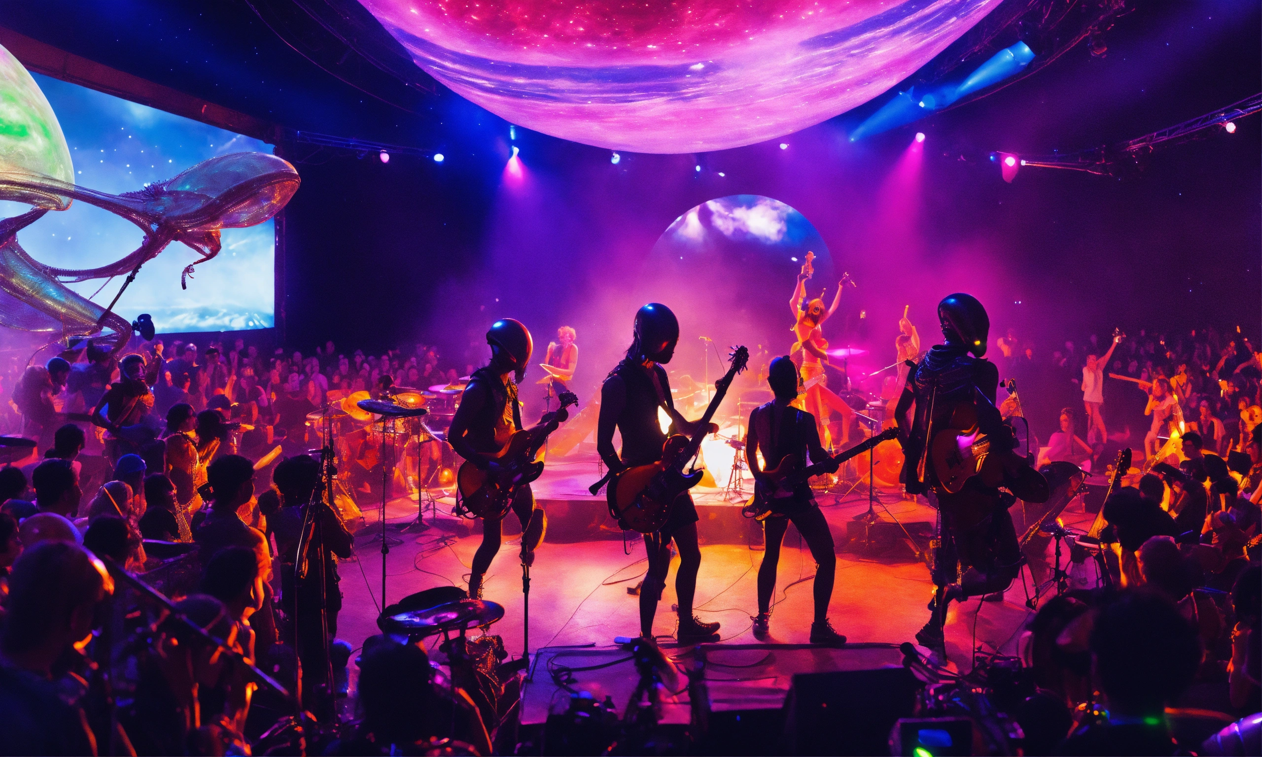 Close up on alien band playing on stage at a concert on venus, its like a rave with all types of humanoids and alien creatures dancing and enjoying the music