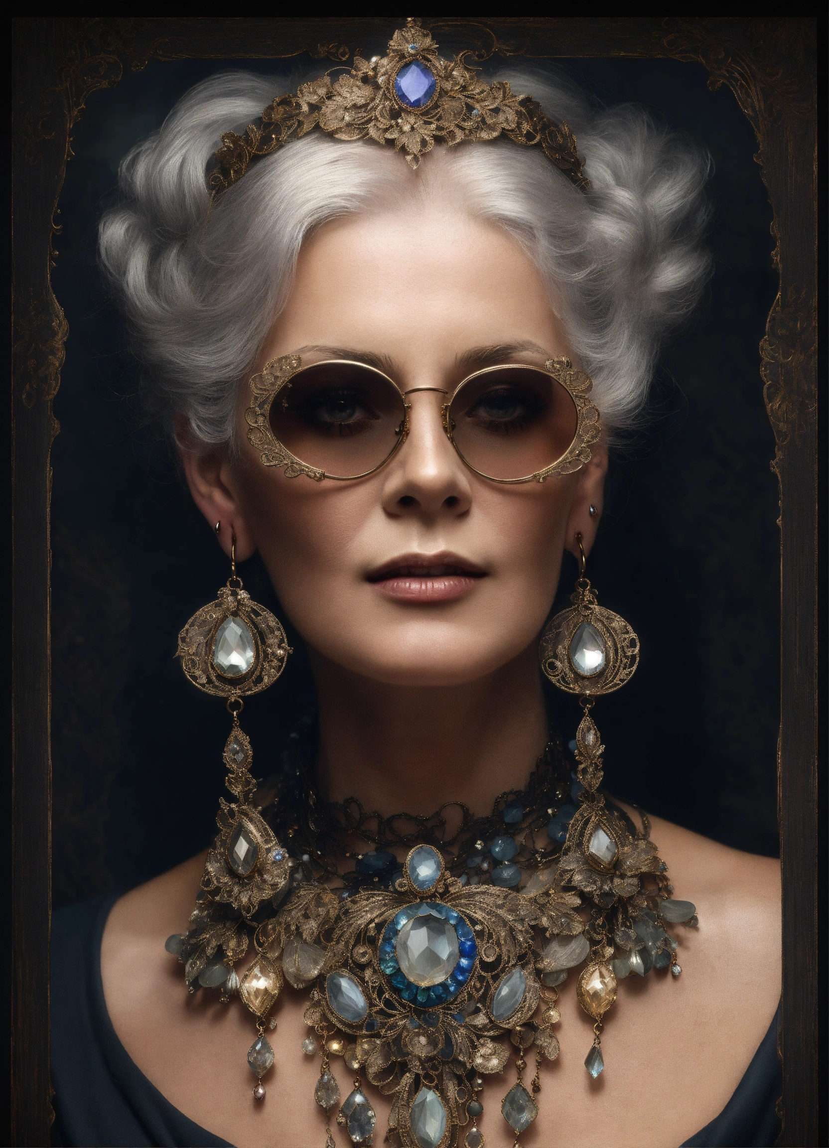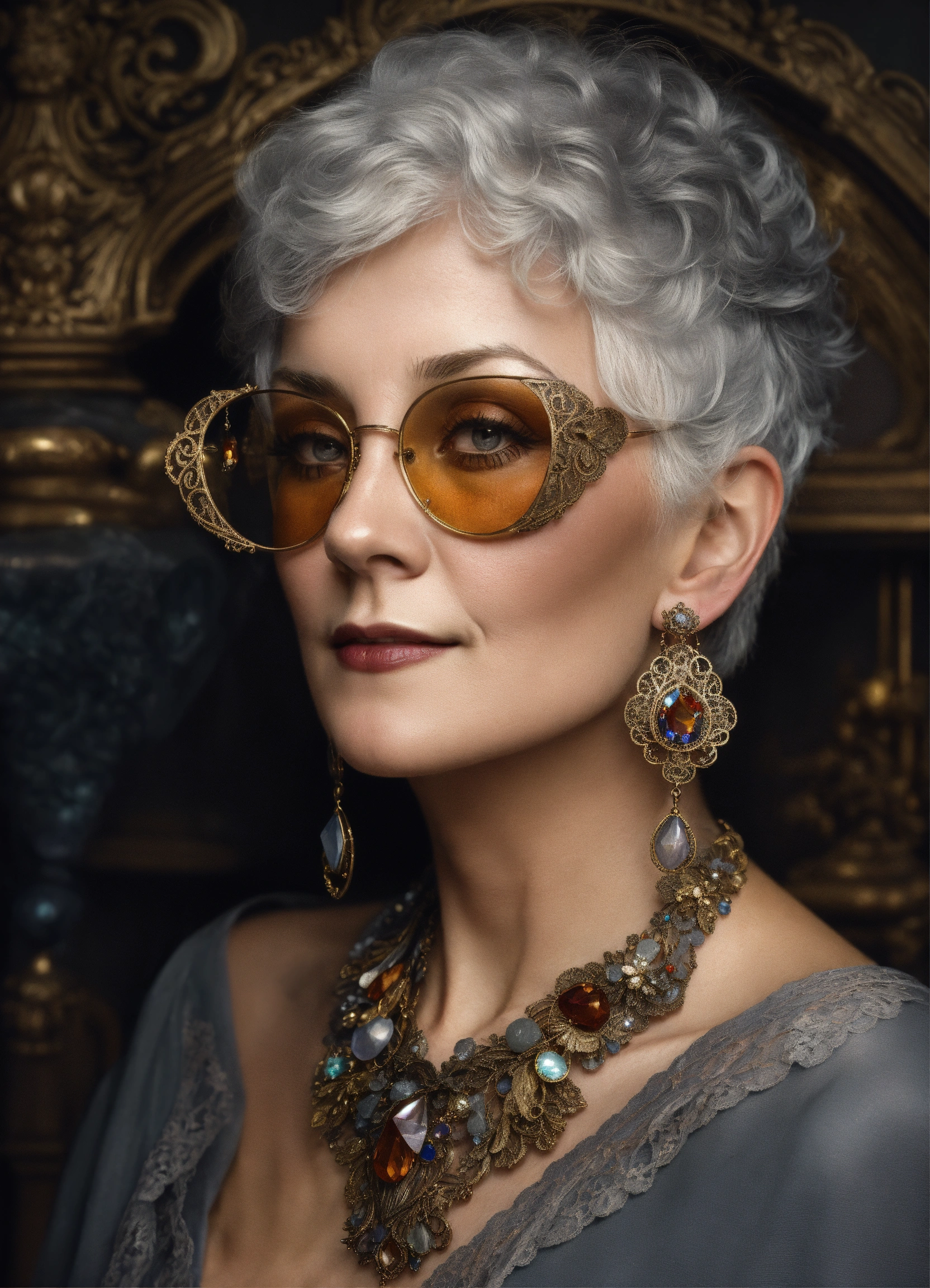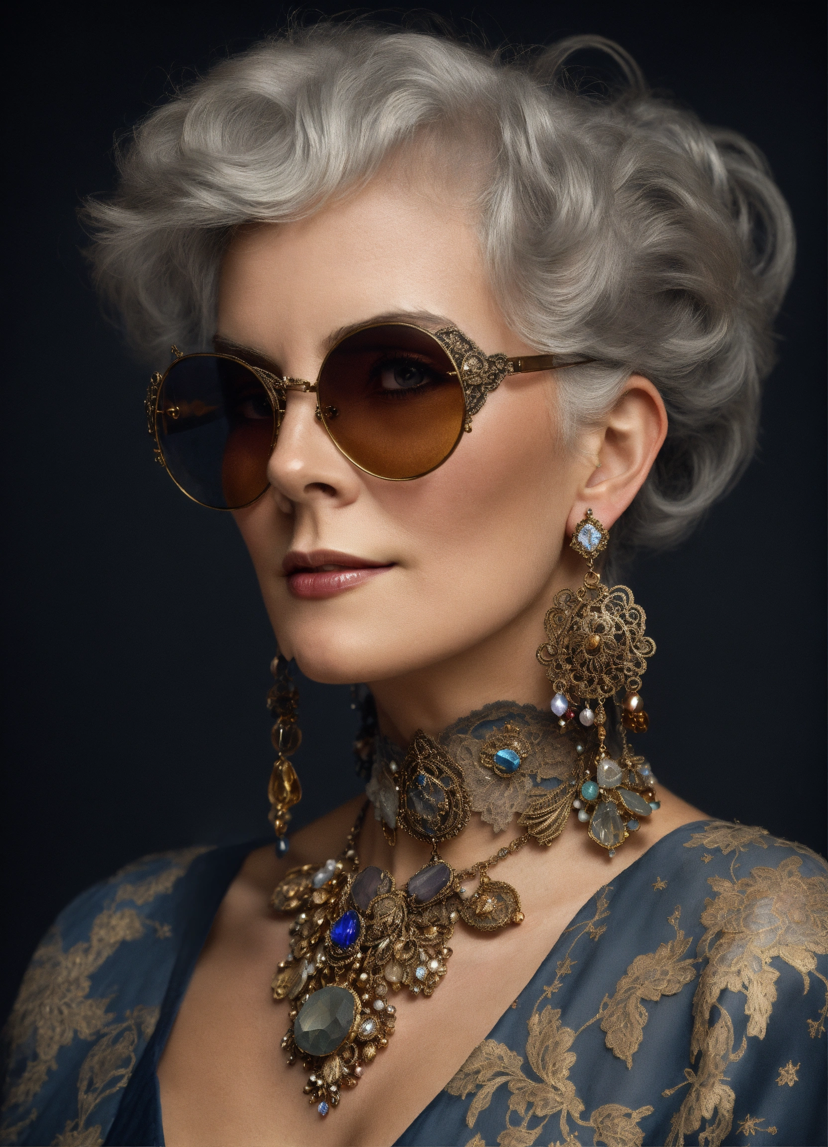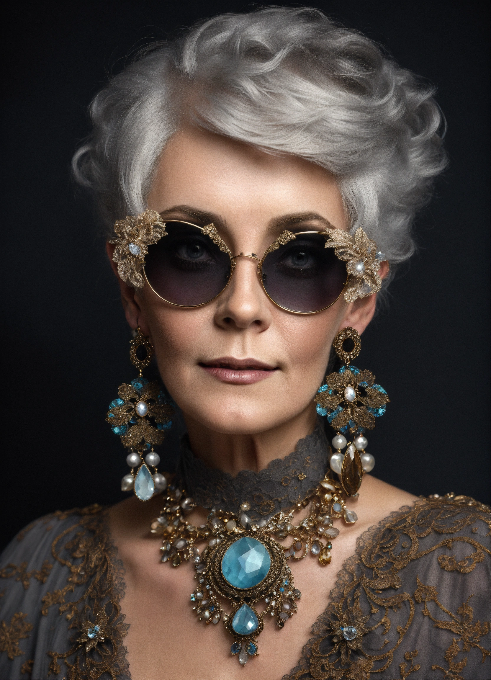 A fashion victorian style elderly gray-haired but very beautiful woman wearing luxurious detailed shades of silver and antic bronze tatted lace earrings decorated with precious stones and crystals in the style of liam sharp, dutch tradition, webcam, gail simone, mark seliger, alfons mucha inspired 8k, high resolution, dark background